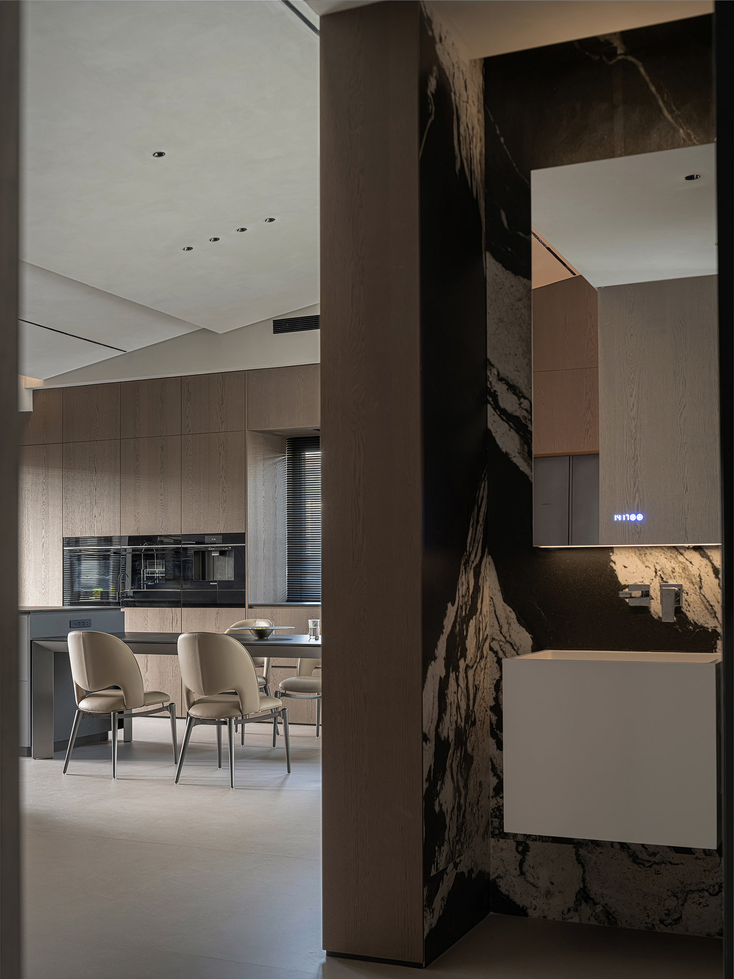 屋主的生活习惯在家做饭很少,提出设置餐厨一体的开放式厨房,把生活阳台视野纳入客餐厅。