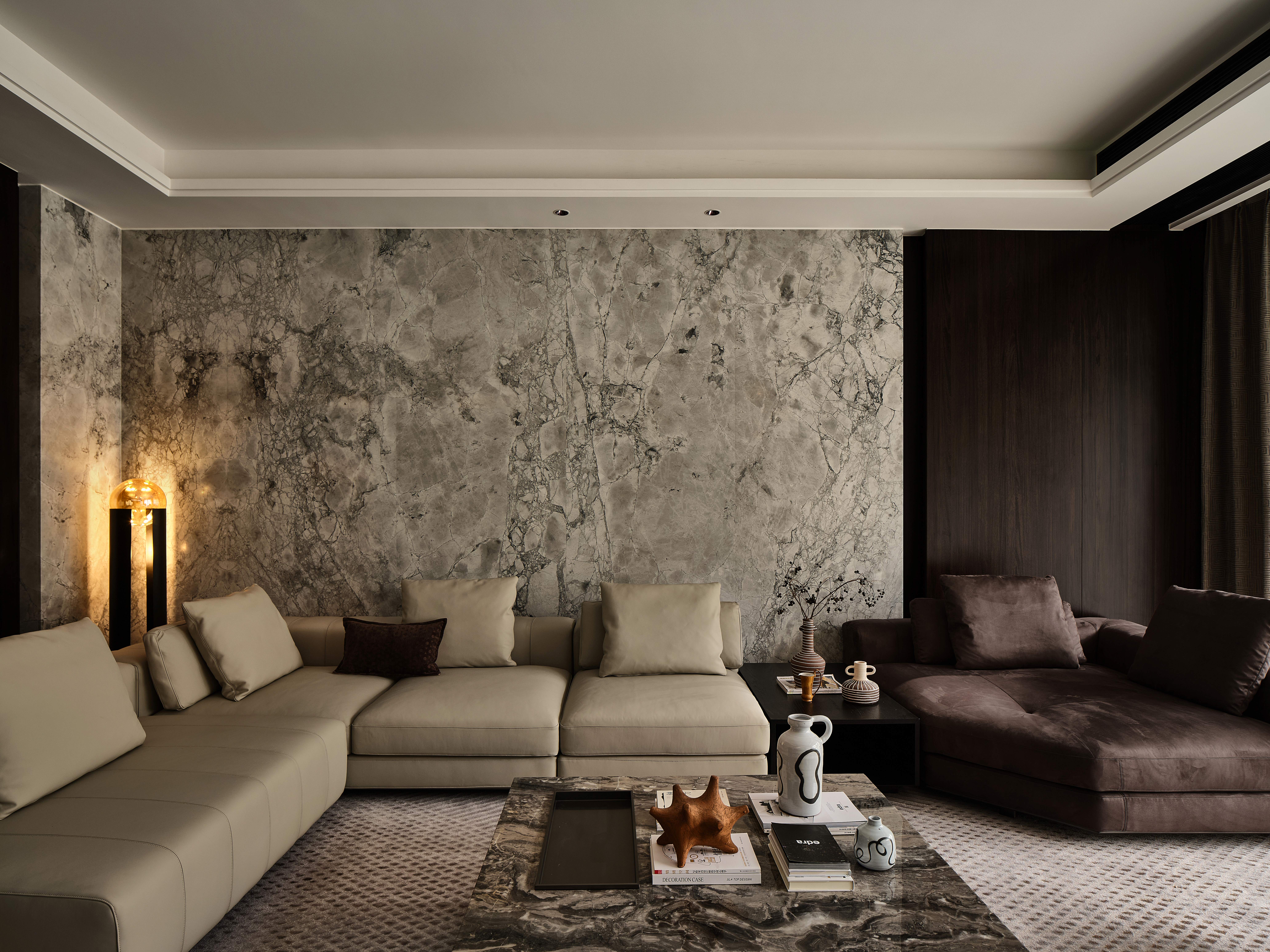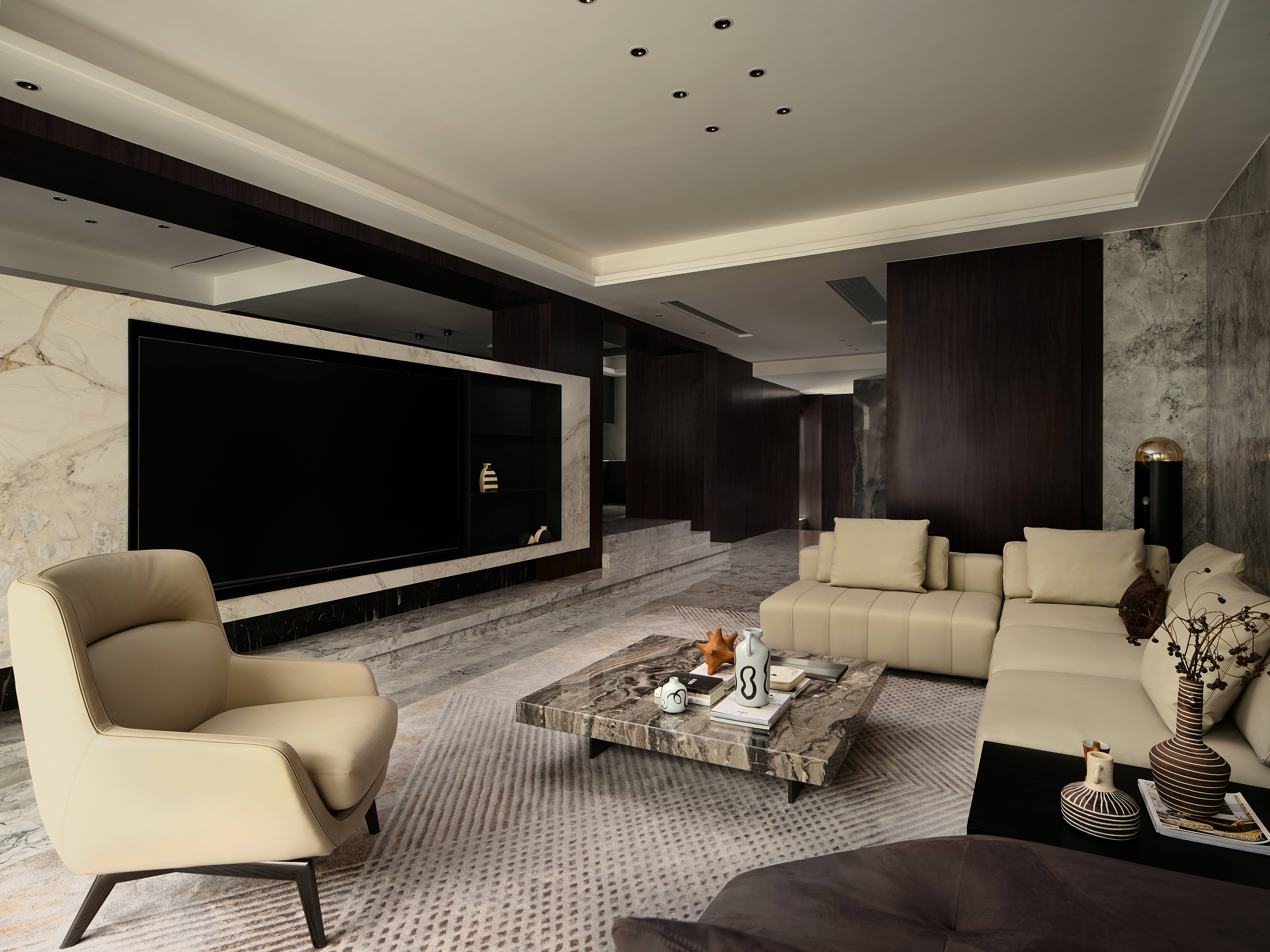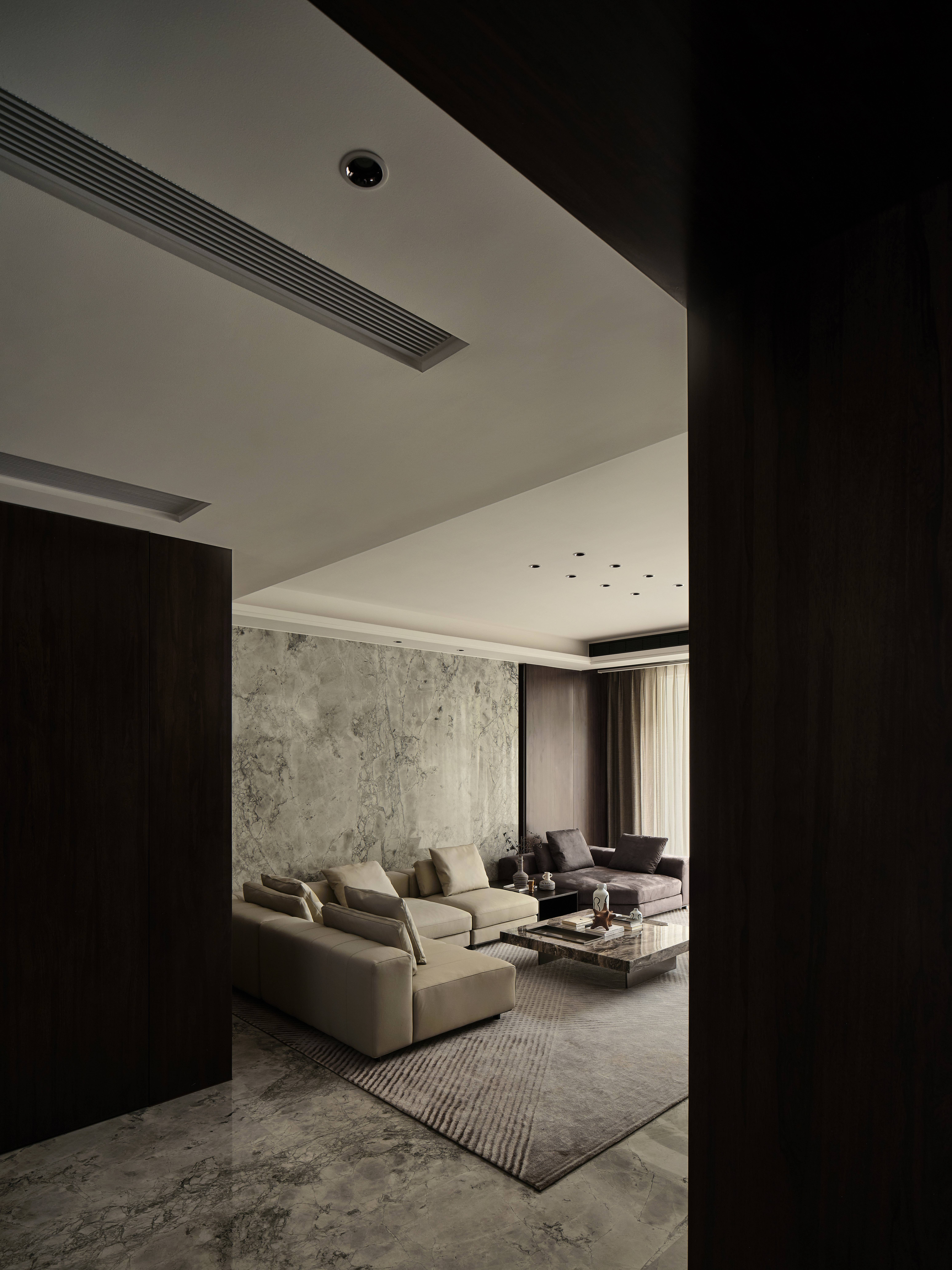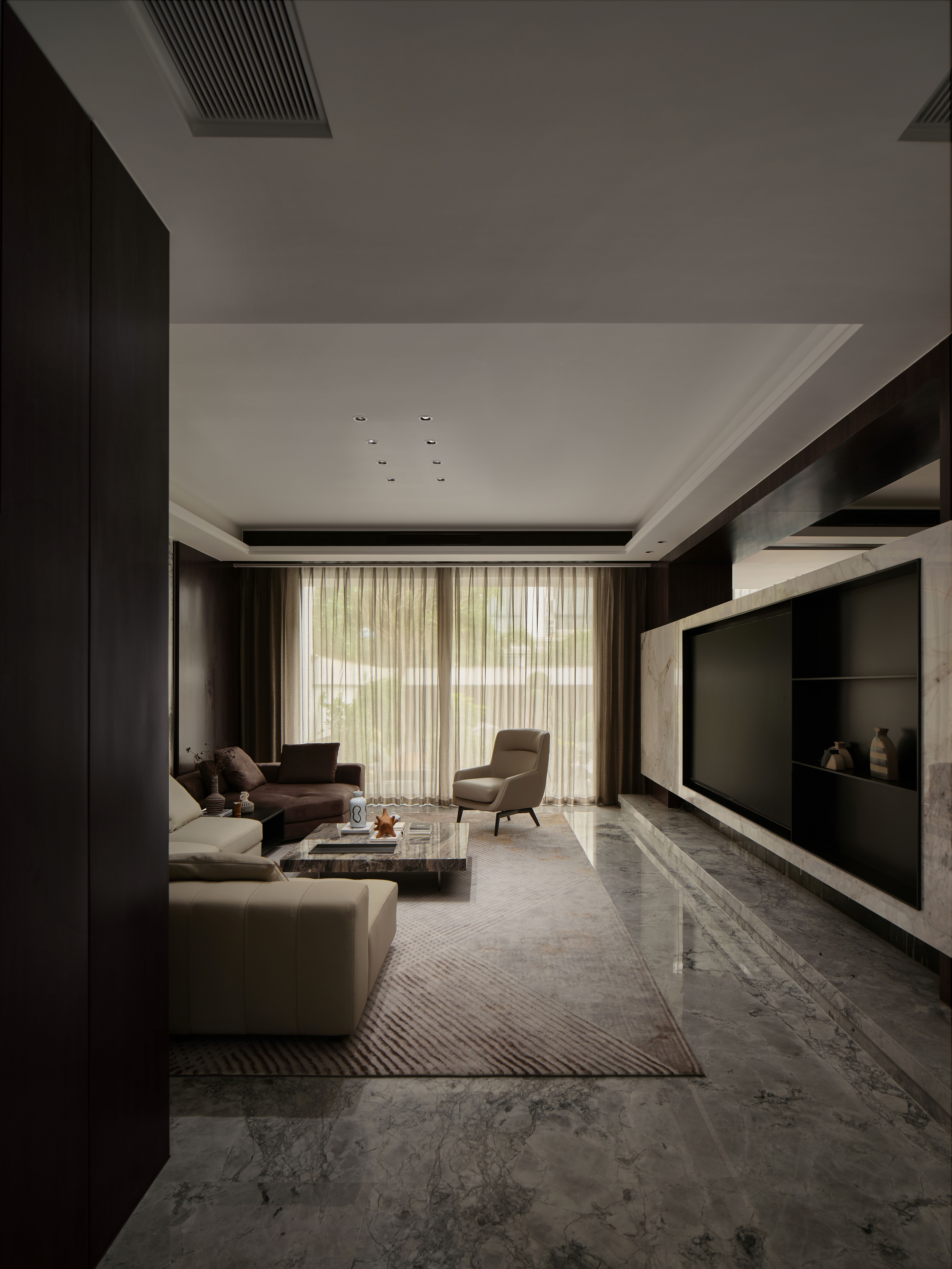项目定位:东方美学,繁华千年的文化自信,时至今日中式审美依然璀璨,但本案是复式别墅设计落地,在用材和色彩上大量使用古朴温润胡桃实木和天然纹理石材,营造出庄高贵典雅的居住氛围,装饰造型粗狂大气,风格是现代简约,暗合中国汉代简约质朴的美学,现代装饰艺术的型内涵着东方哲学的意,表现当下国人居家中外协调融合的审美情趣。