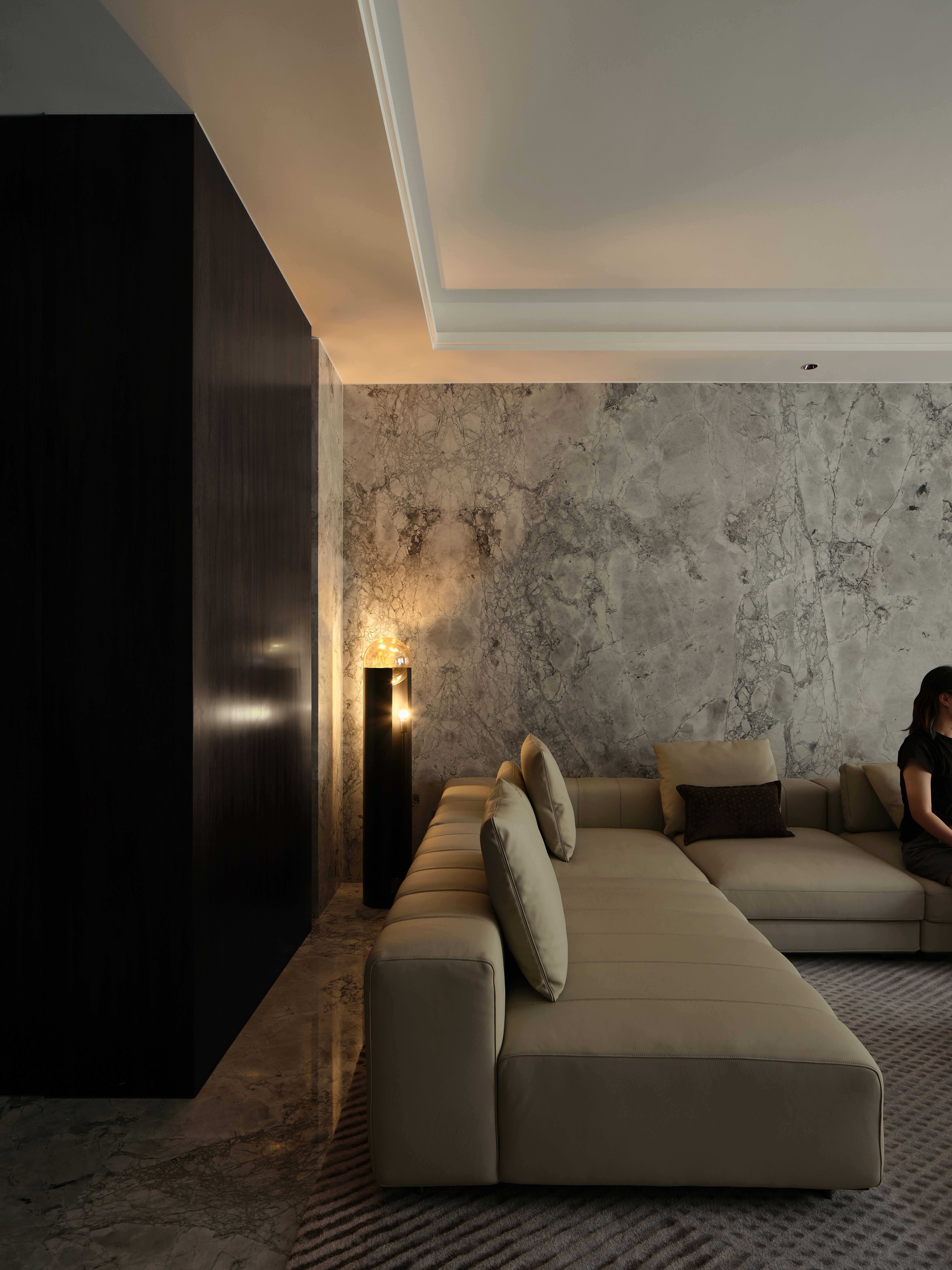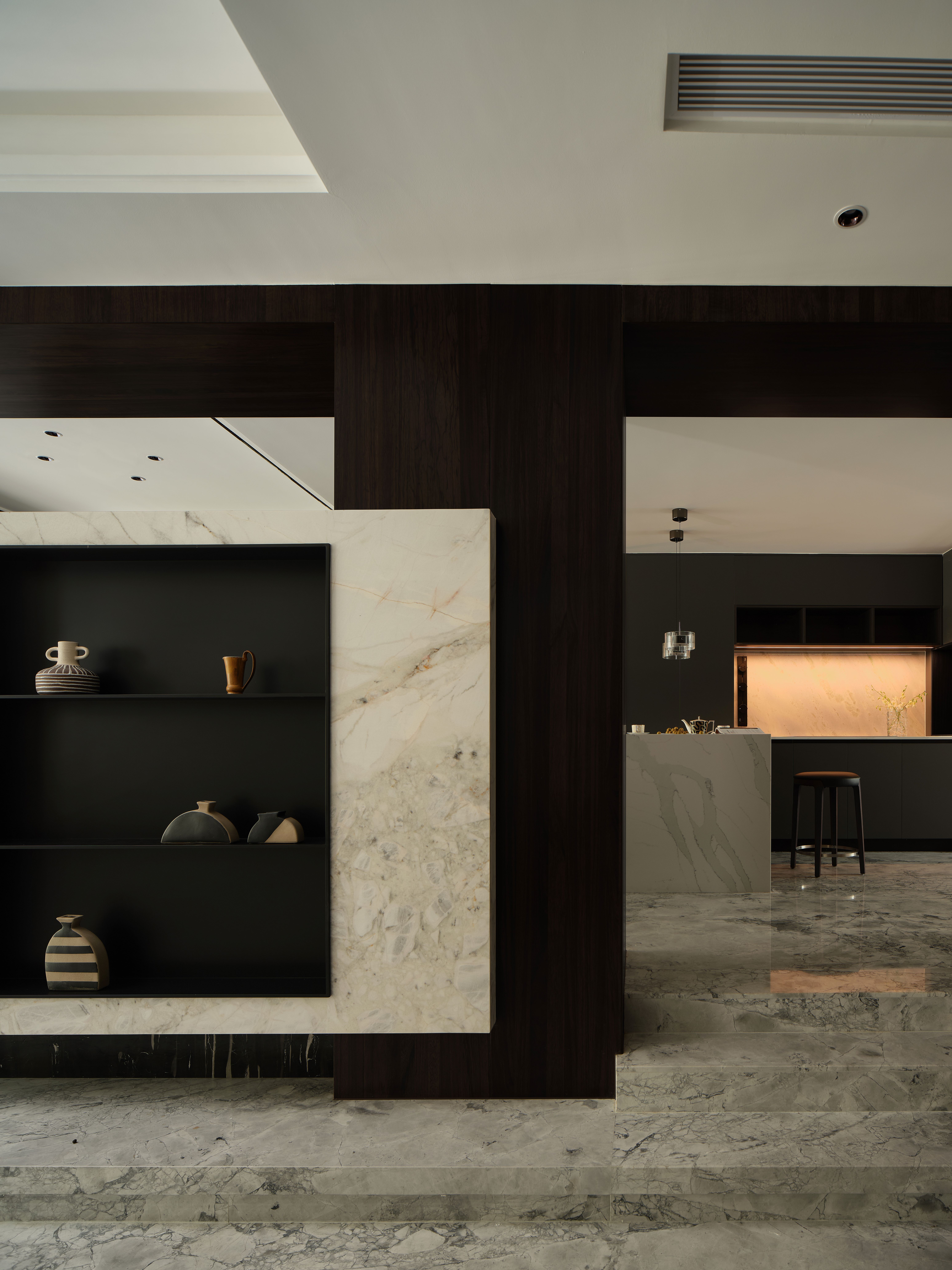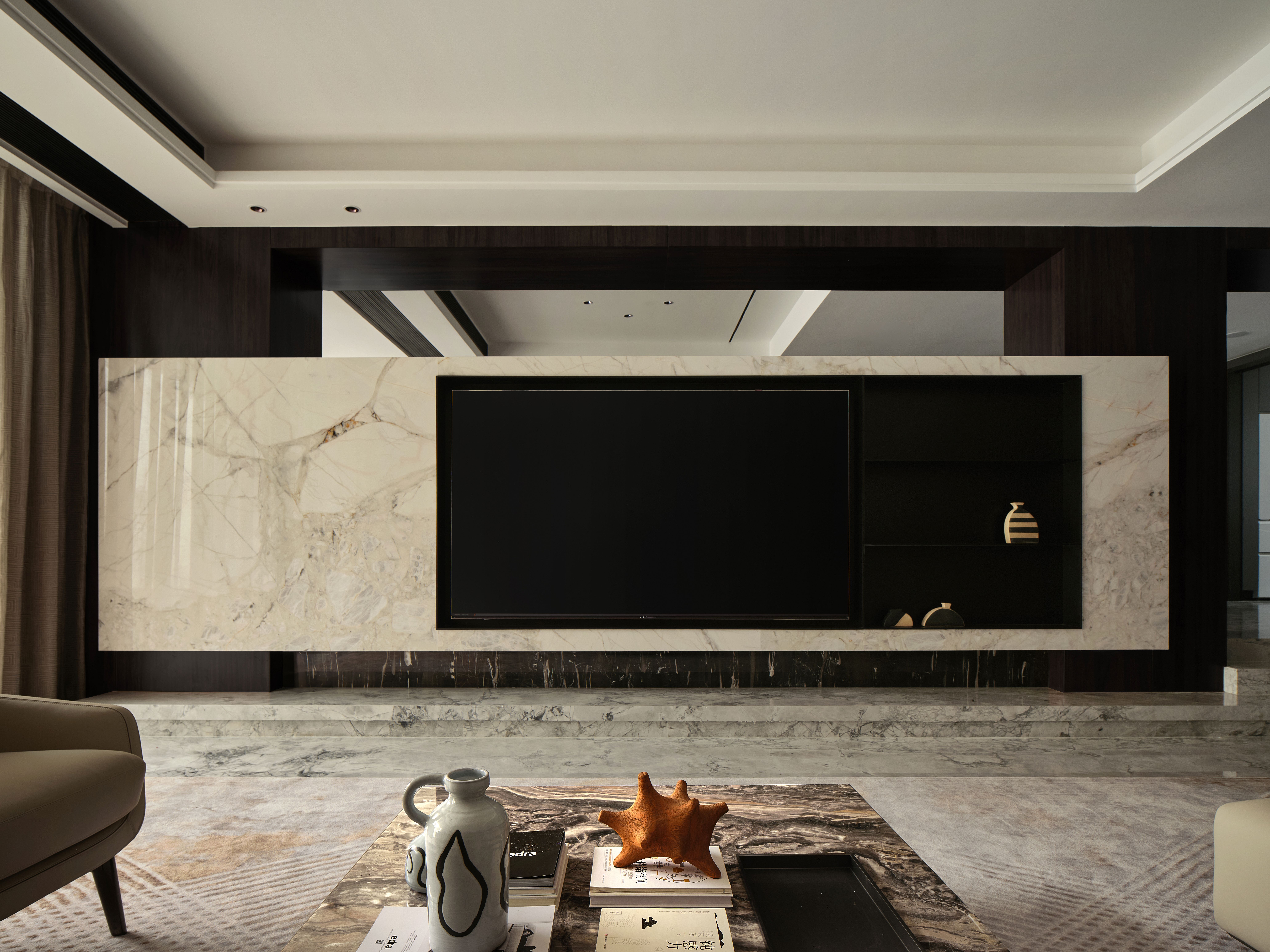项目定位:东方美学,繁华千年的文化自信,时至今日中式审美依然璀璨,但本案是复式别墅设计落地,在用材和色彩上大量使用古朴温润胡桃实木和天然纹理石材,营造出庄高贵典雅的居住氛围,装饰造型粗狂大气,风格是现代简约,暗合中国汉代简约质朴的美学,现代装饰艺术的型内涵着东方哲学的意,表现当下国人居家中外协调融合的审美情趣。