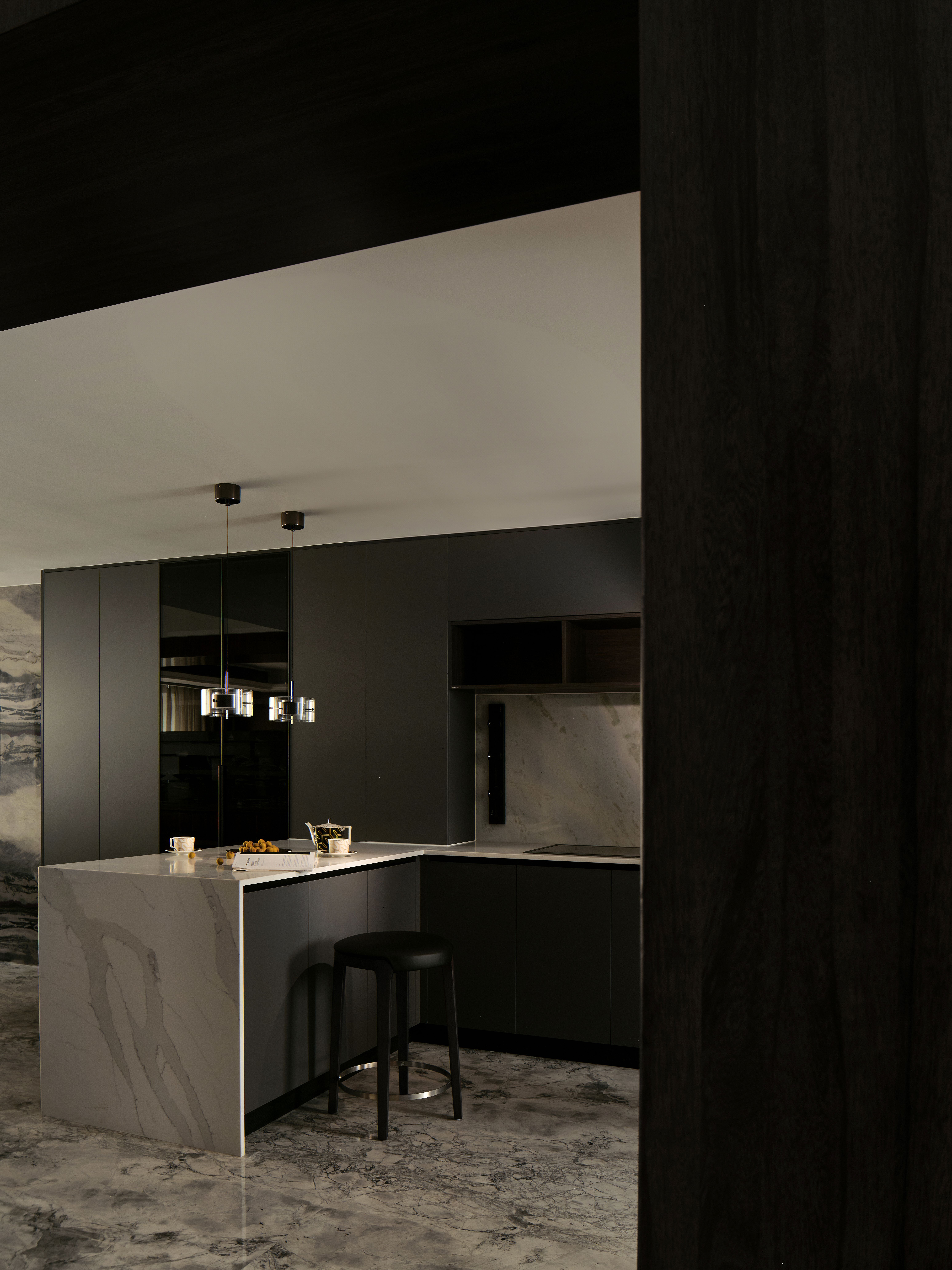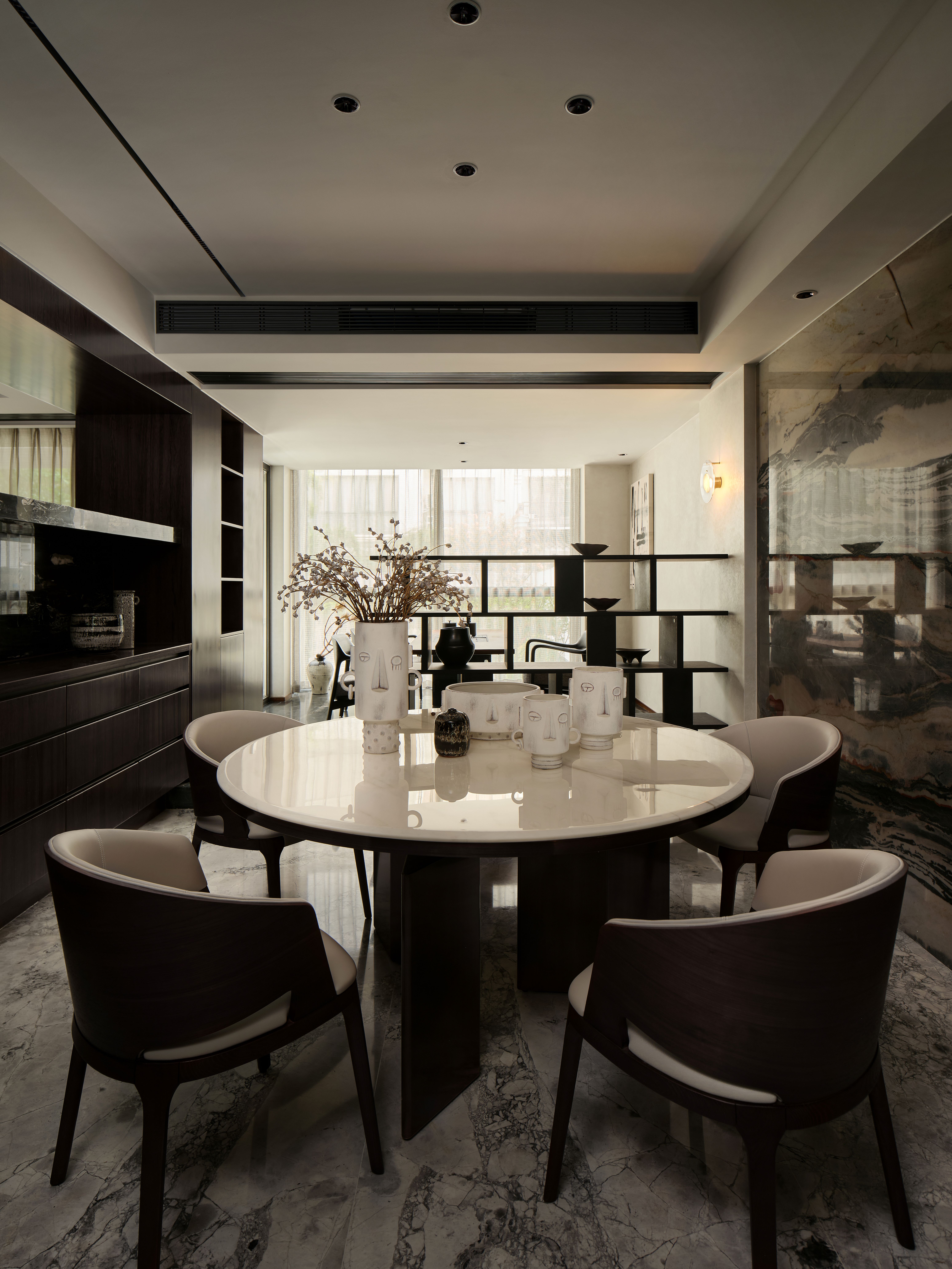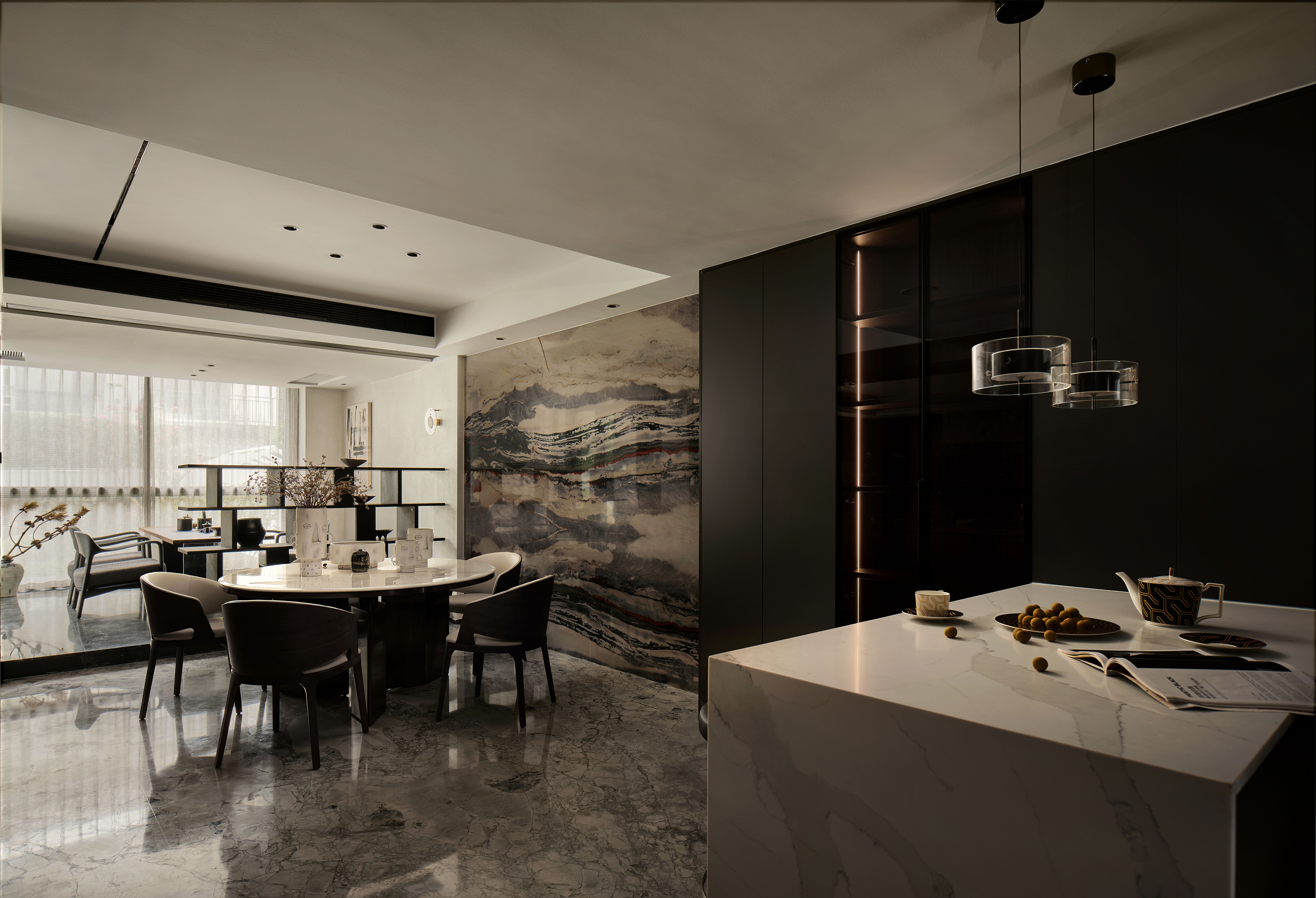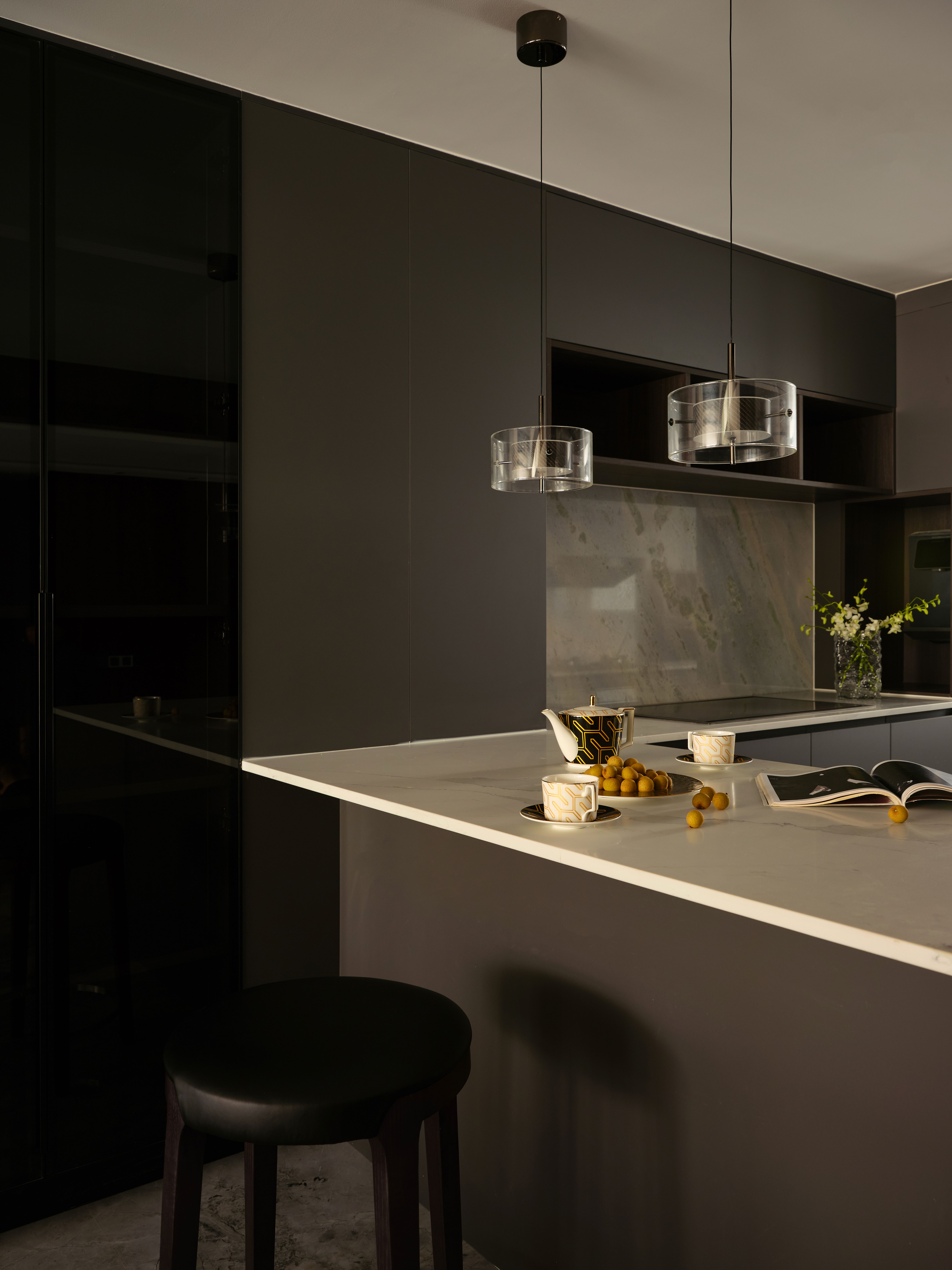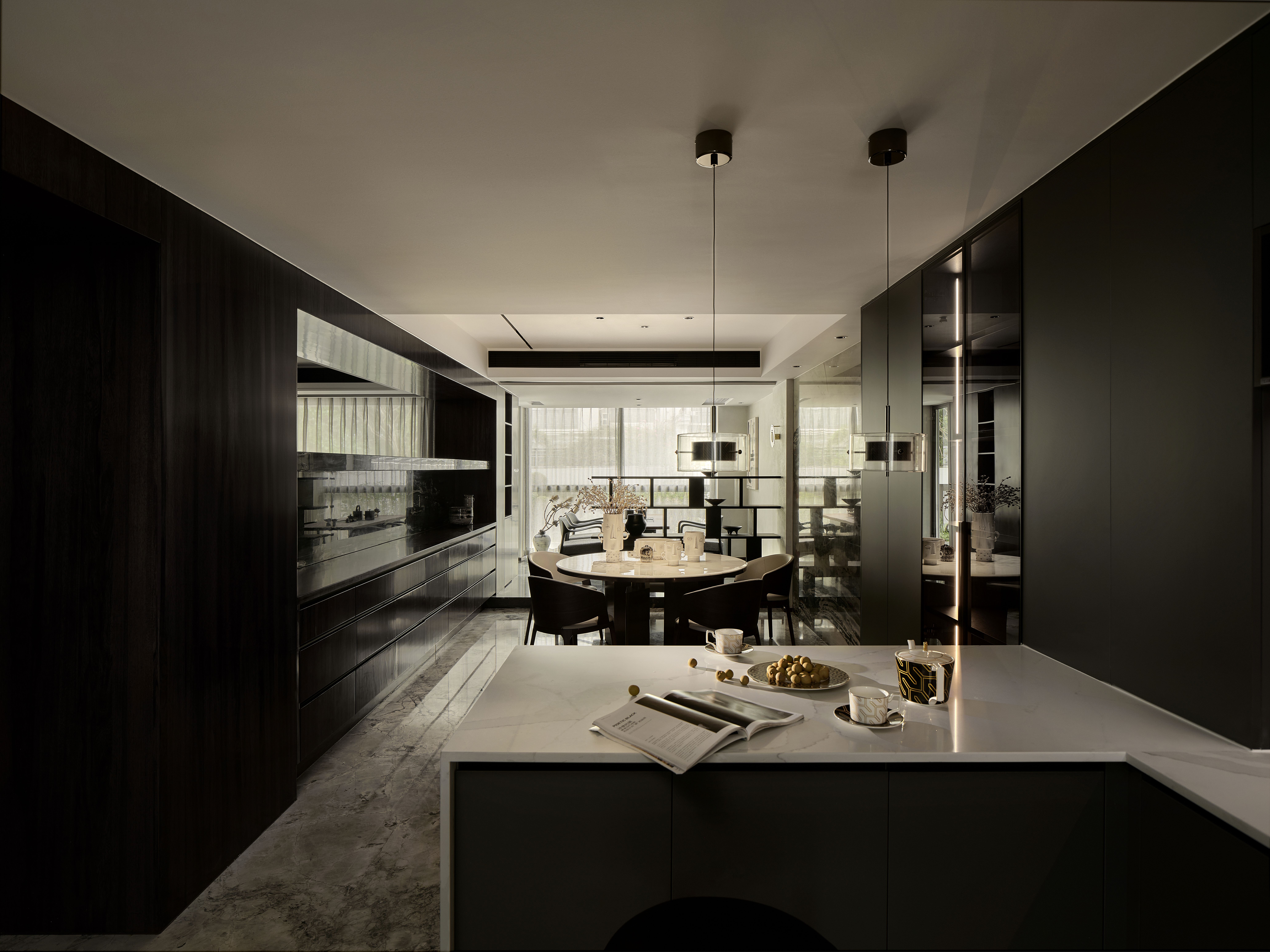 空间布局:客餐厅作为全家人活动的广场,最大亮点在于用装置艺术的电视墙隔断,将客厅一分为二,结合落地窗外的庭院,一边是慵懒矮沙发组合构成的环抱休闲区,一边是由中式厨房、西式厨房、餐厅区、书桌区一线排开的生活区,如同缓缓展开的家庭生活场景卷轴。