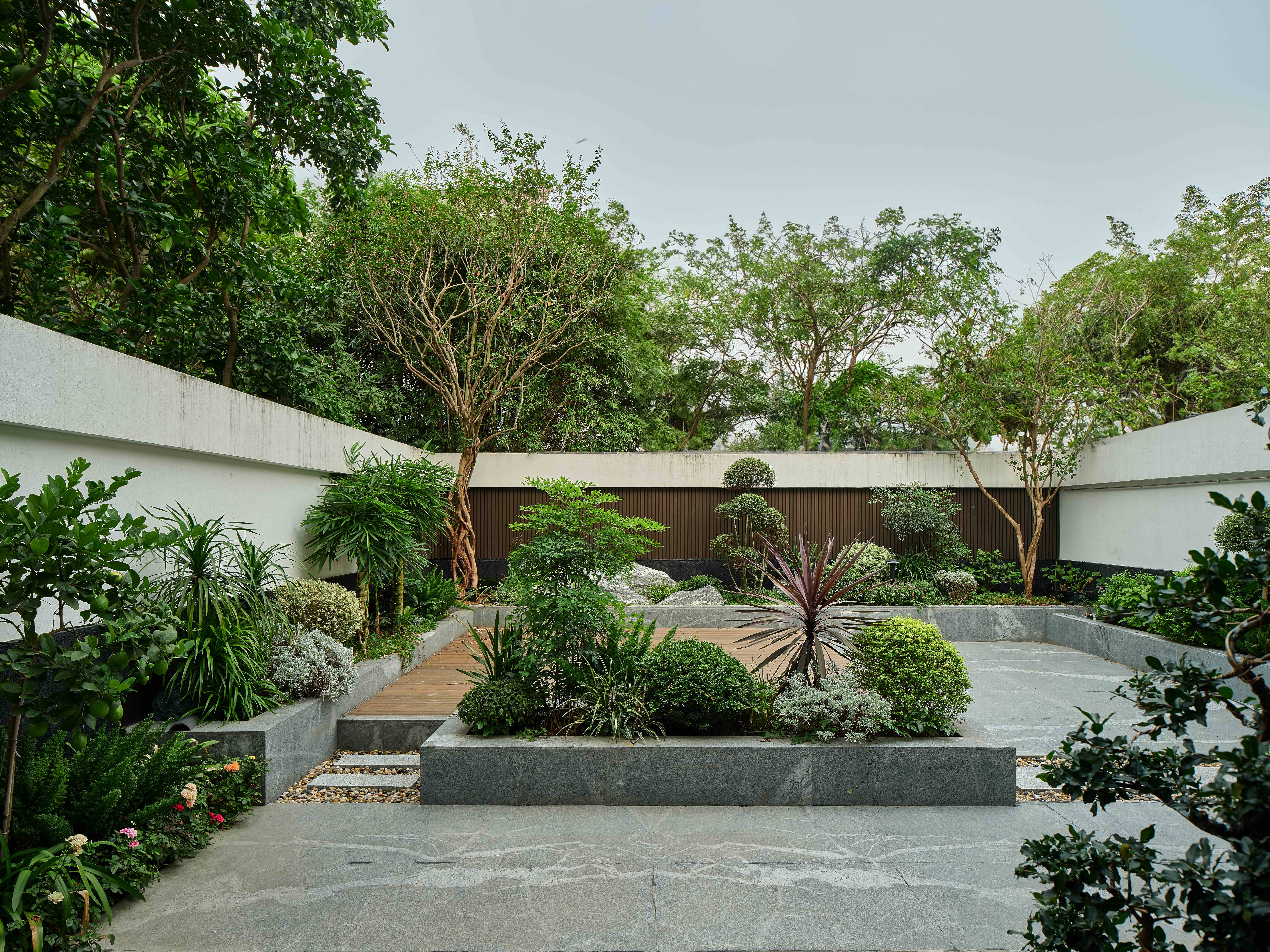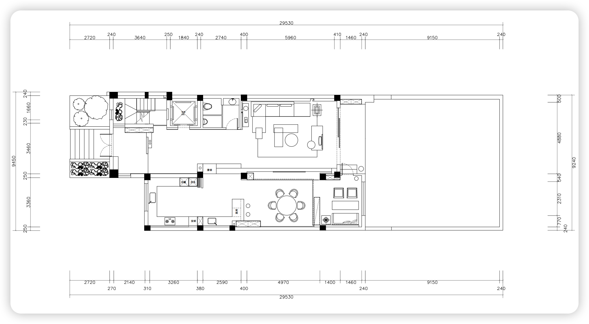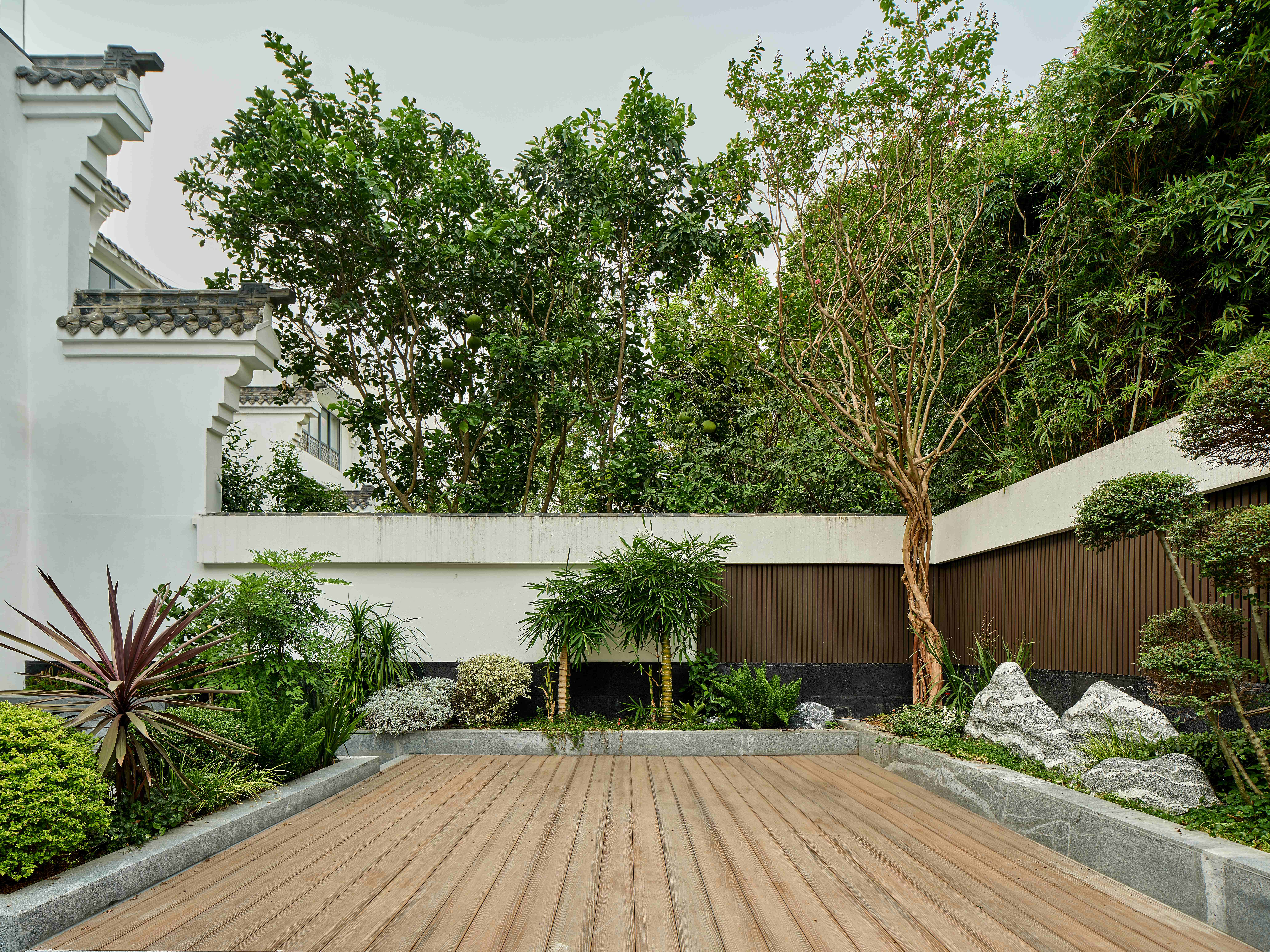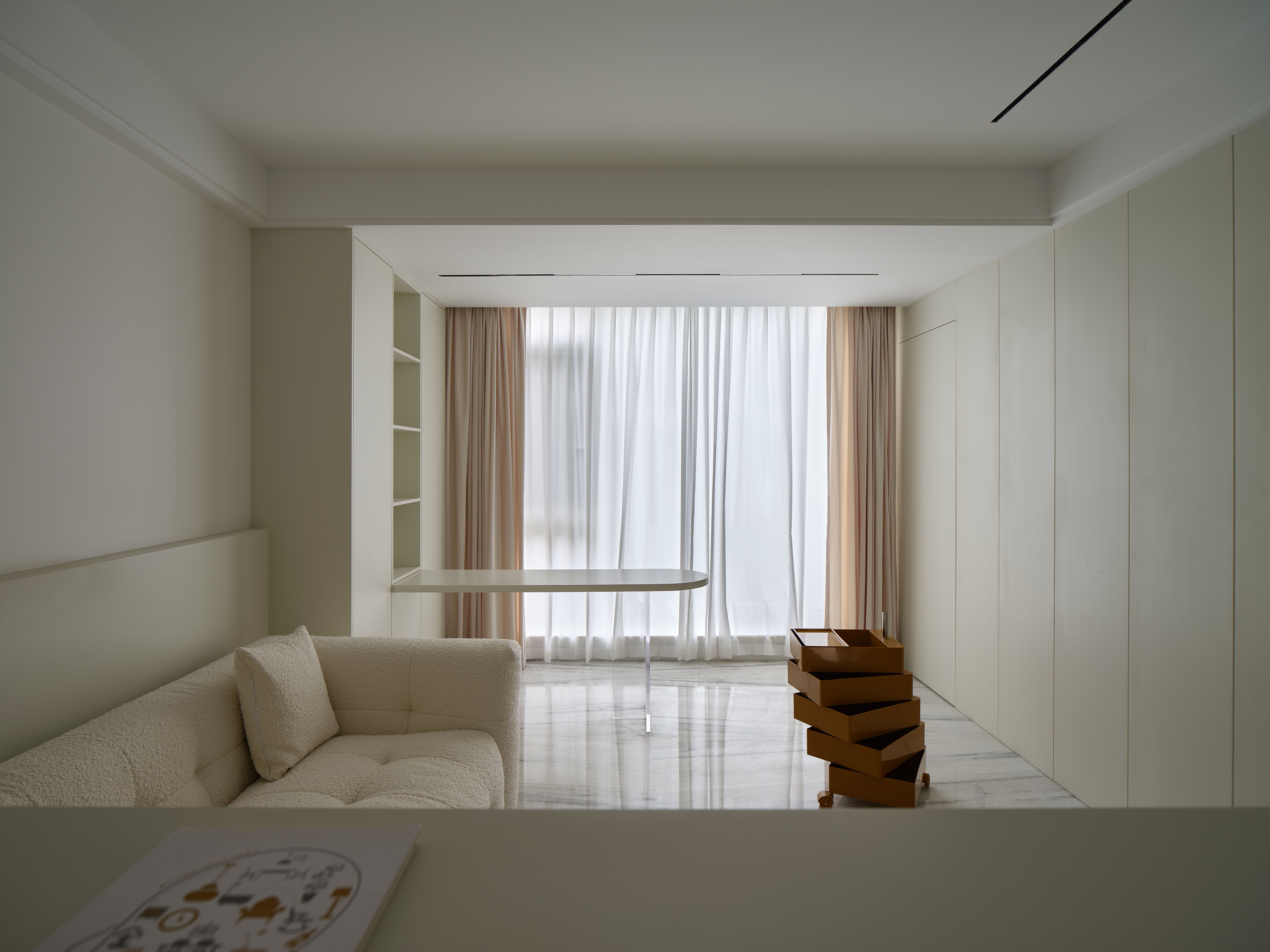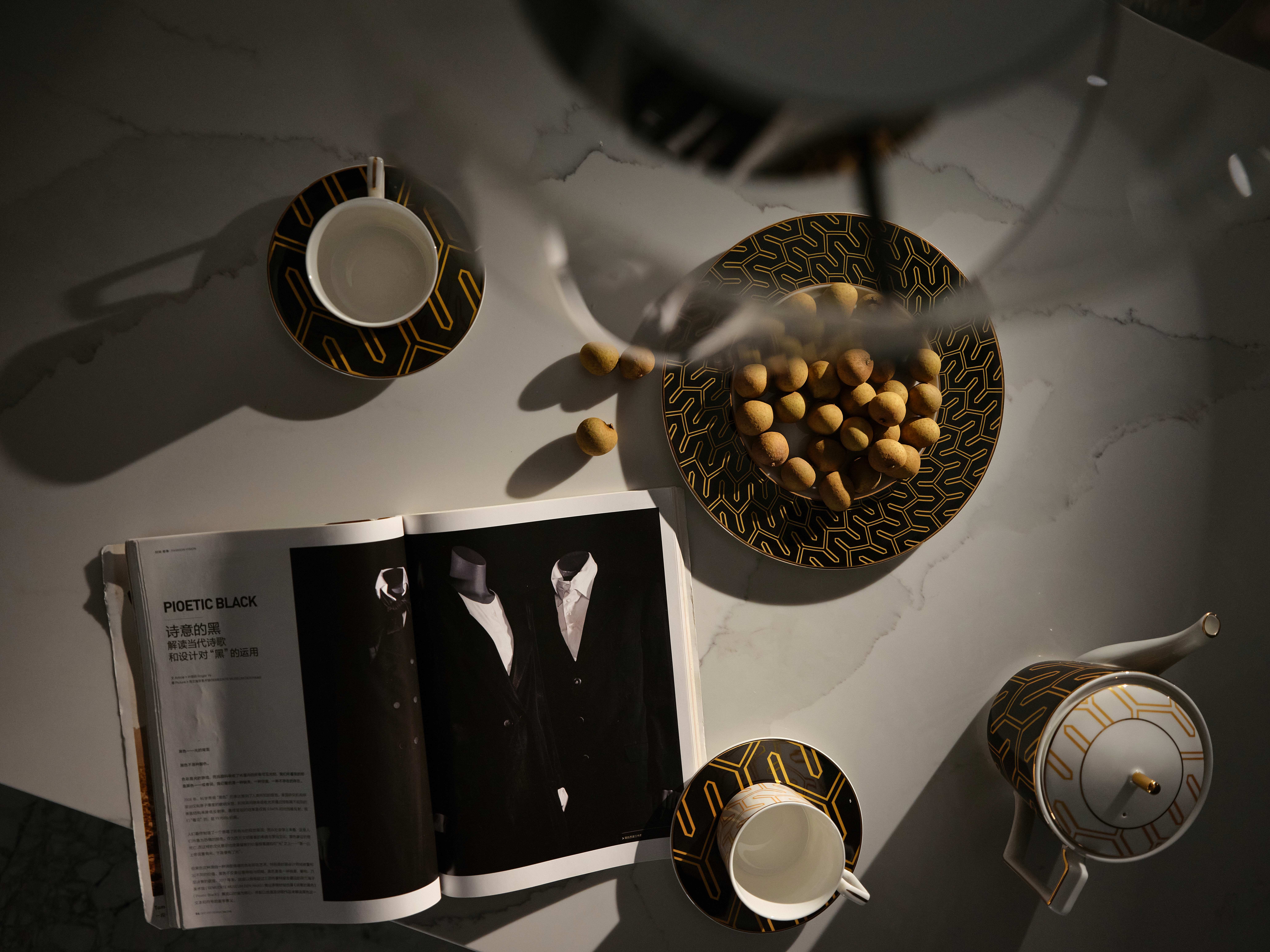 空间布局:客餐厅作为全家人活动的广场,最大亮点在于用装置艺术的电视墙隔断,将客厅一分为二,结合落地窗外的庭院,一边是慵懒矮沙发组合构成的环抱休闲区,一边是由中式厨房、西式厨房、餐厅区、书桌区一线排开的生活区,如同缓缓展开的家庭生活场景卷轴。