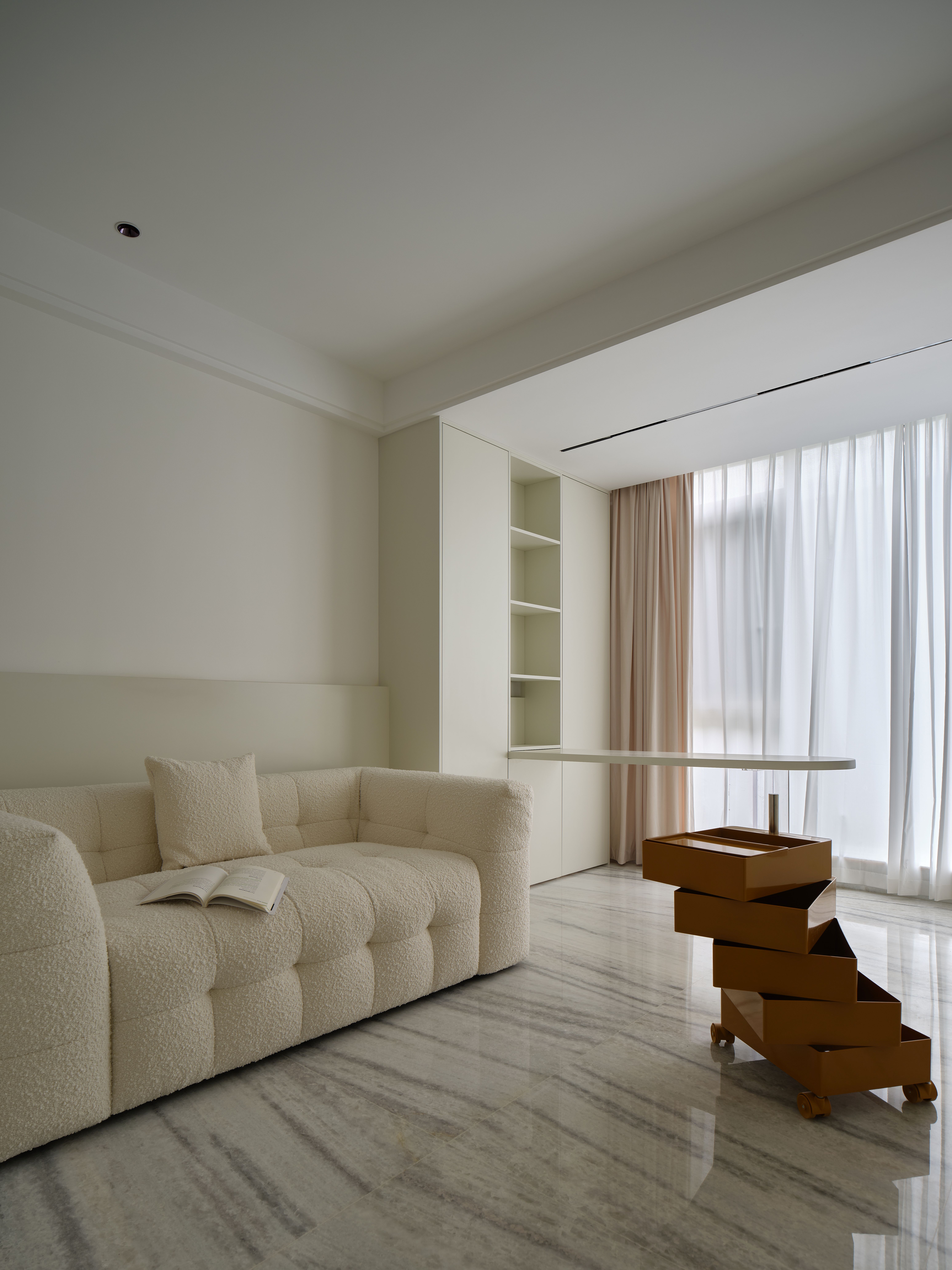 空间意境:客厅的长电视隔断墙是整个客厅的灵魂,采用矩阵装置艺术理念,一面是大理石电视墙一面是巨大收纳空间的粗犷柜体,好像双鱼图的两极,一面代表休闲,一面代表生活。