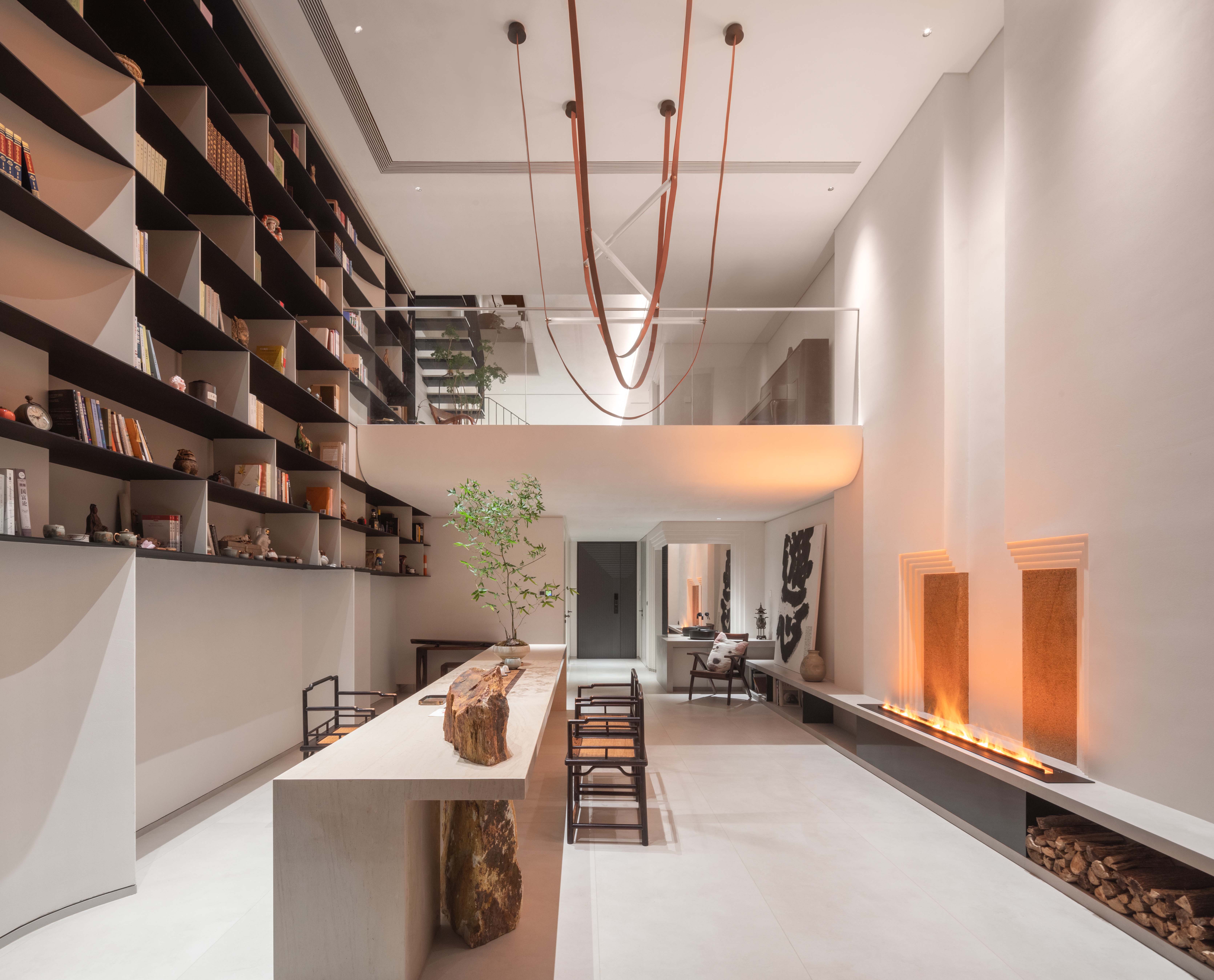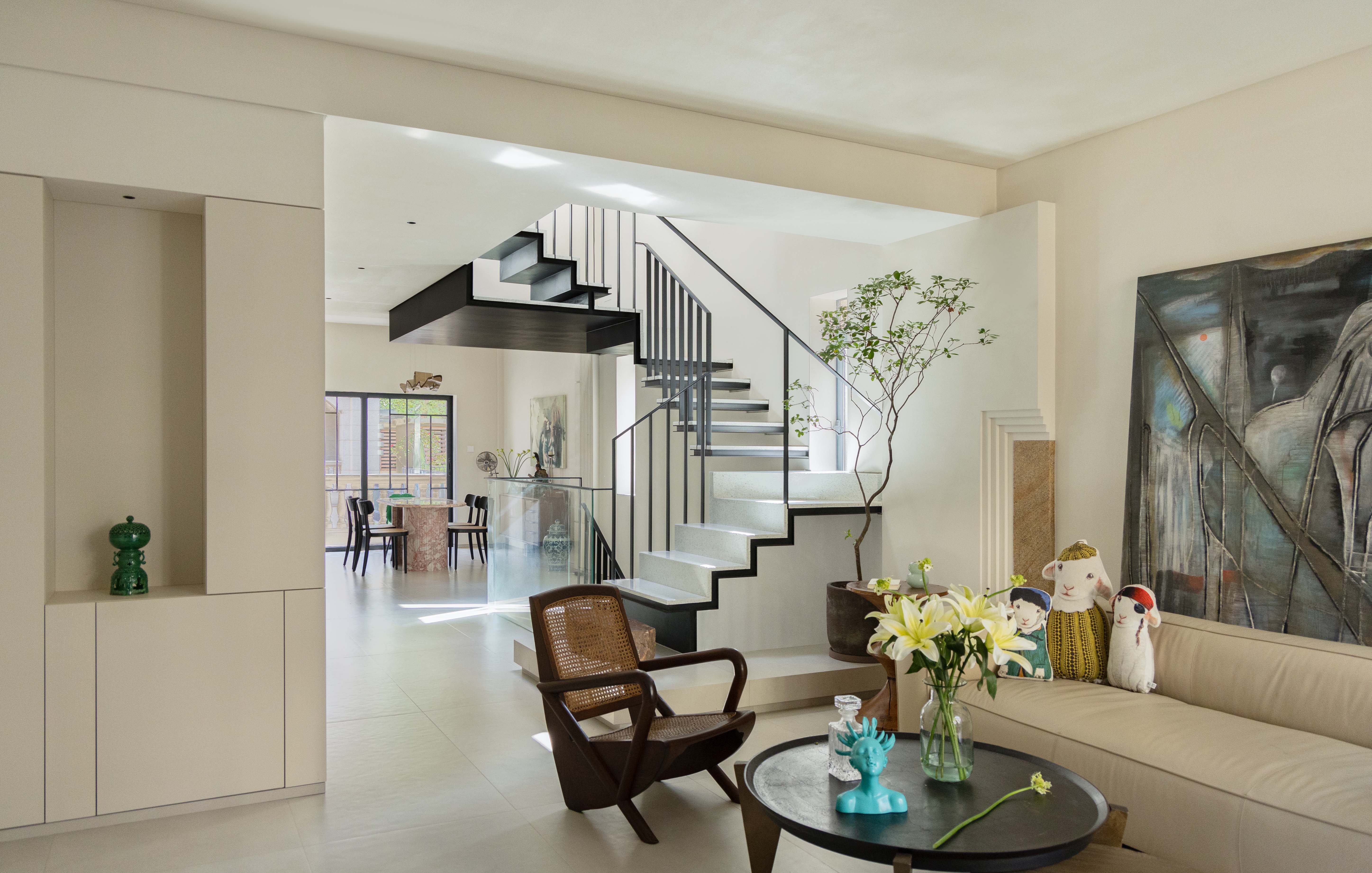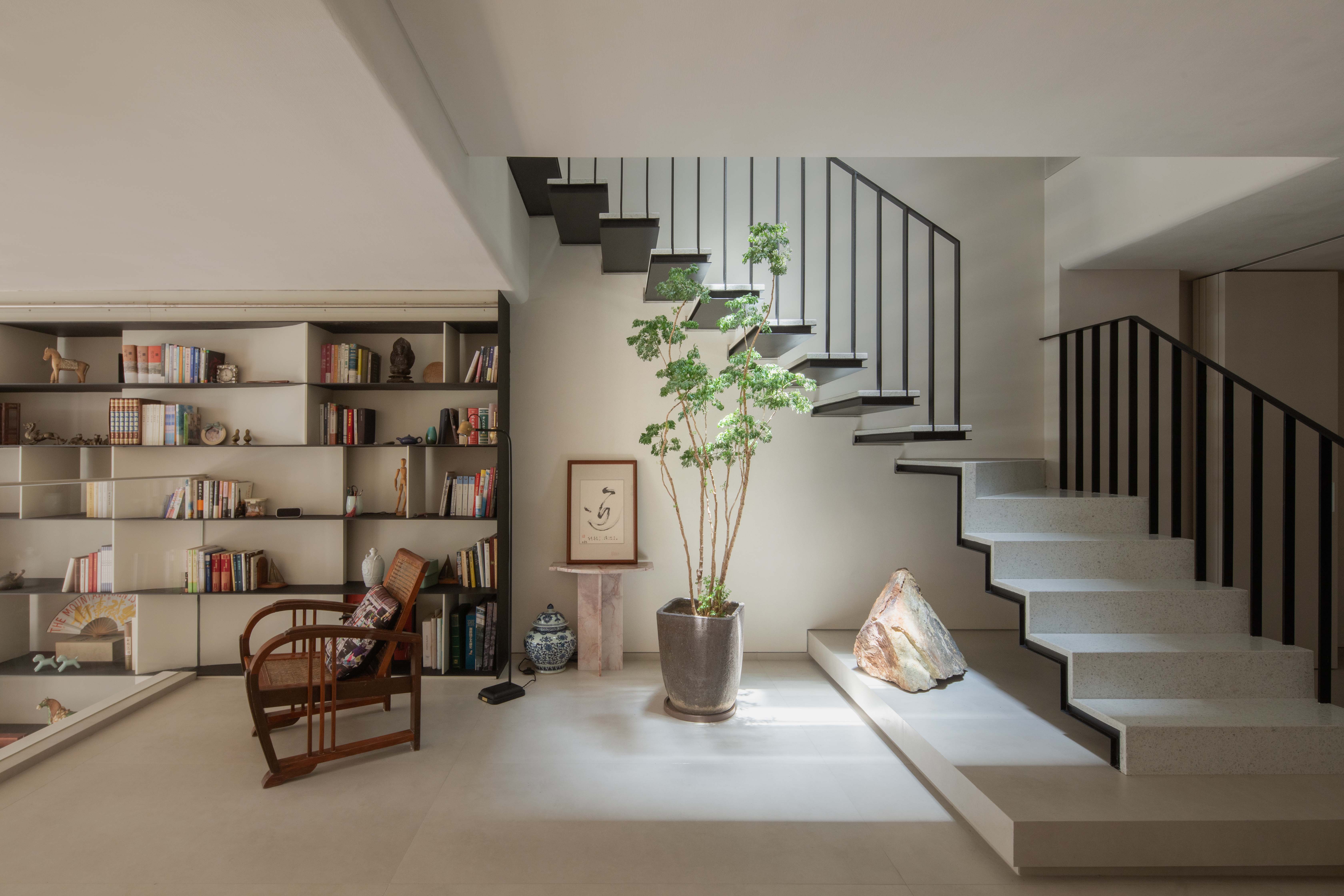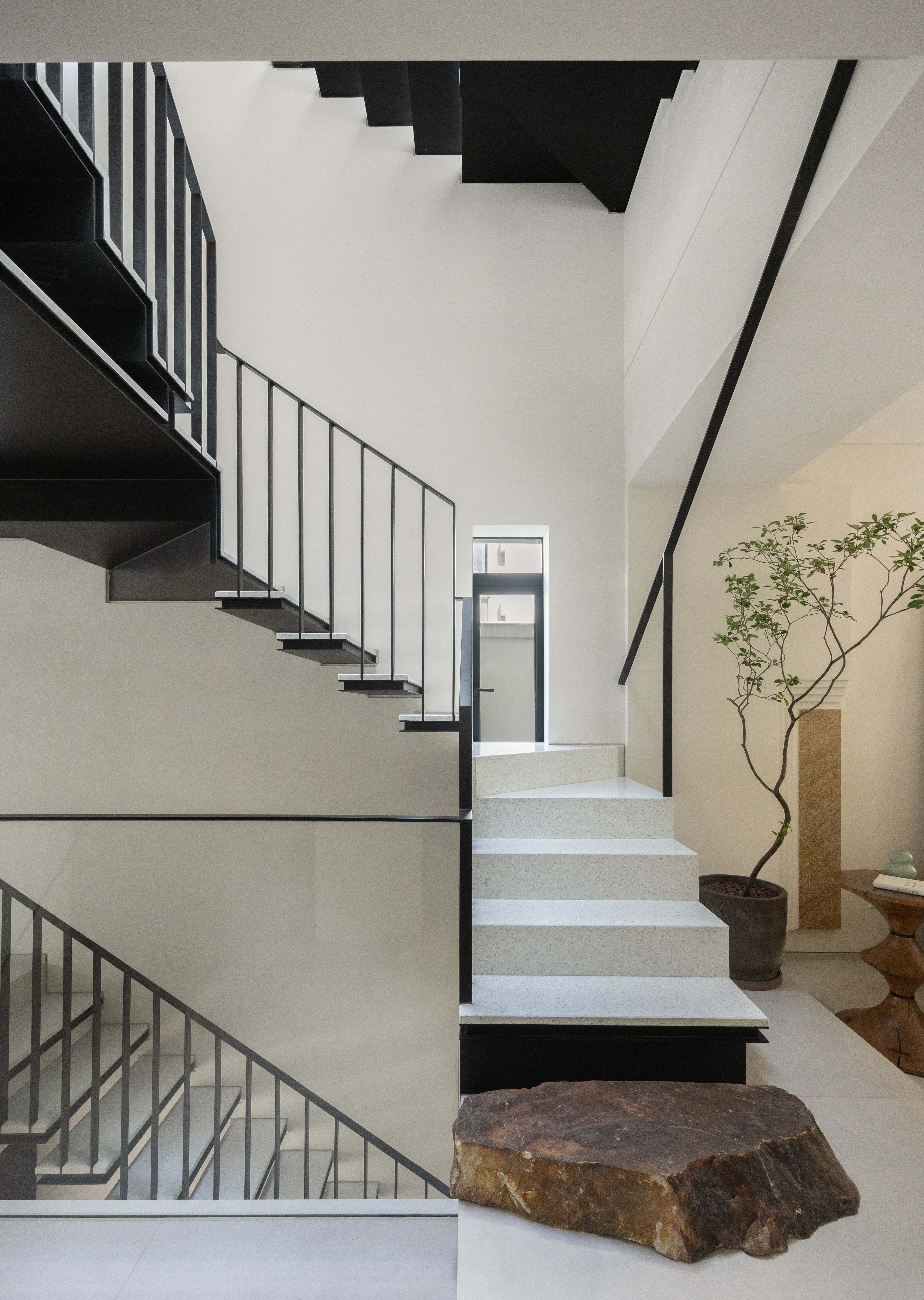 (2)空间是光的容器,本案充分利用了挑空处的层高和天井的自然采光,让人与自然产生“光合作用”,温暖的、质感的生活场景,在空间肆意洄流。