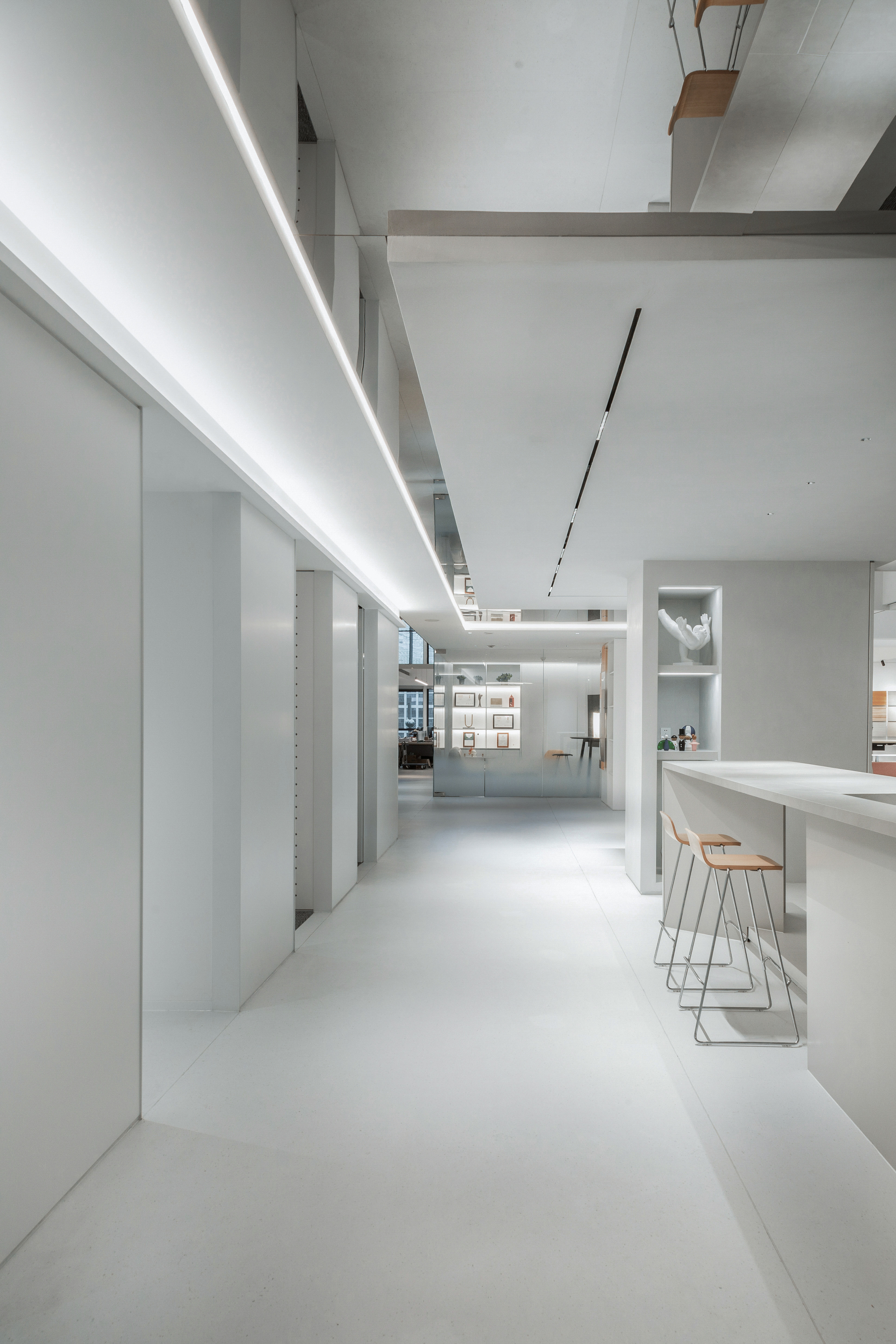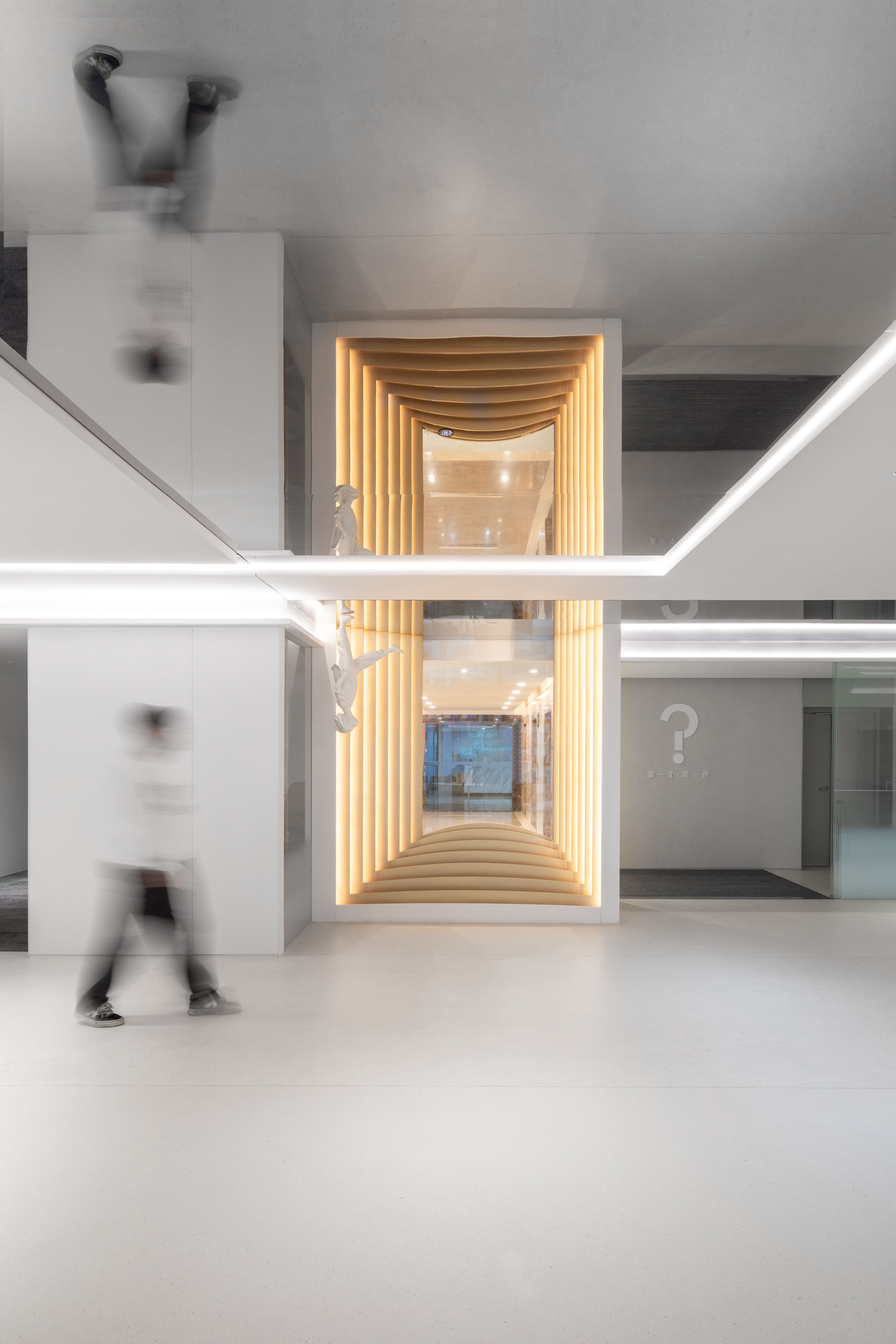 (2)通过包裹天花设施(消防管)“抬高”了视野,获得了更高的空间;顺势而为,包裹的构建也为灯具提供了支架,承载了空间的照明功能。
