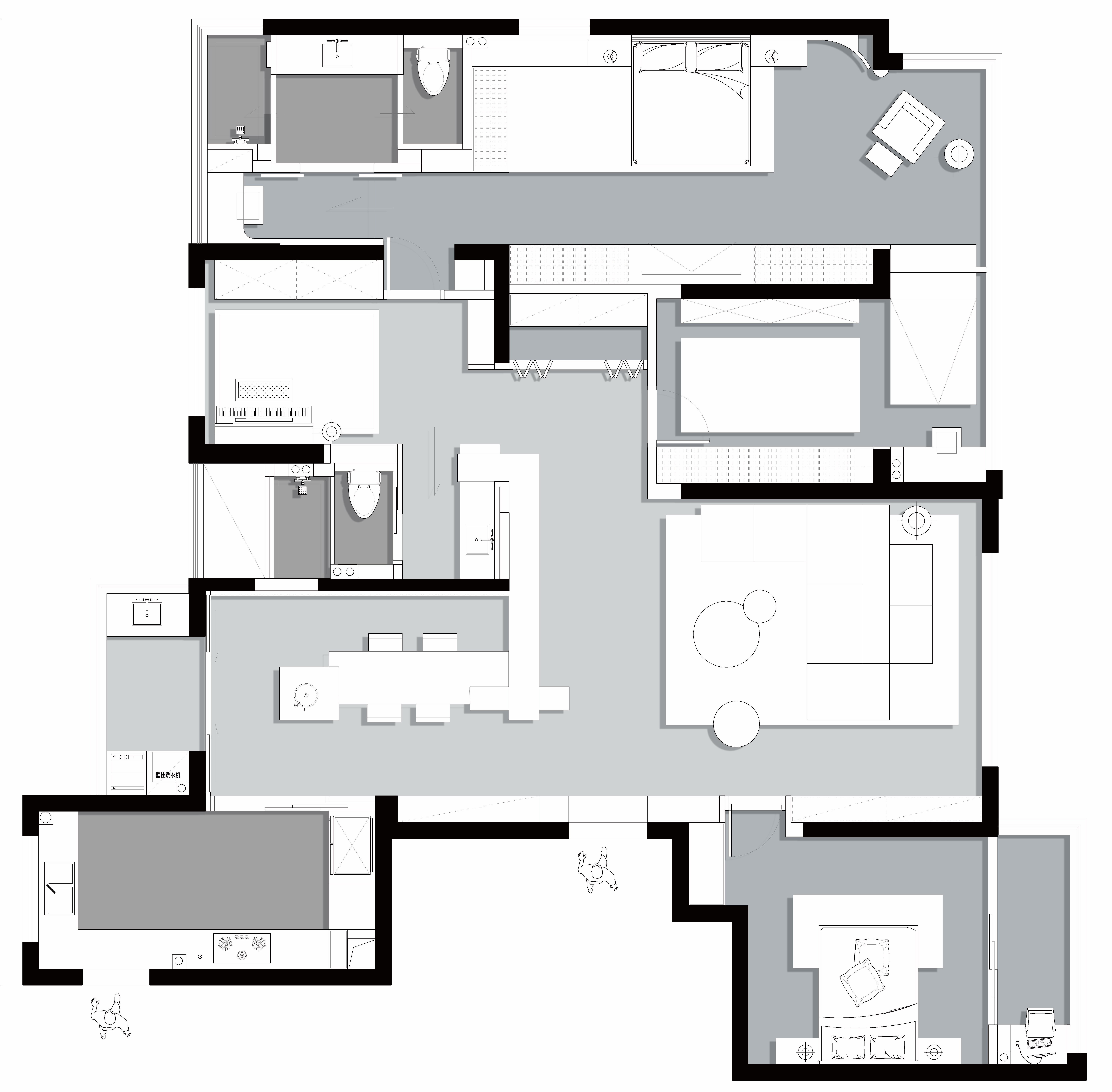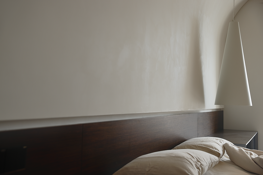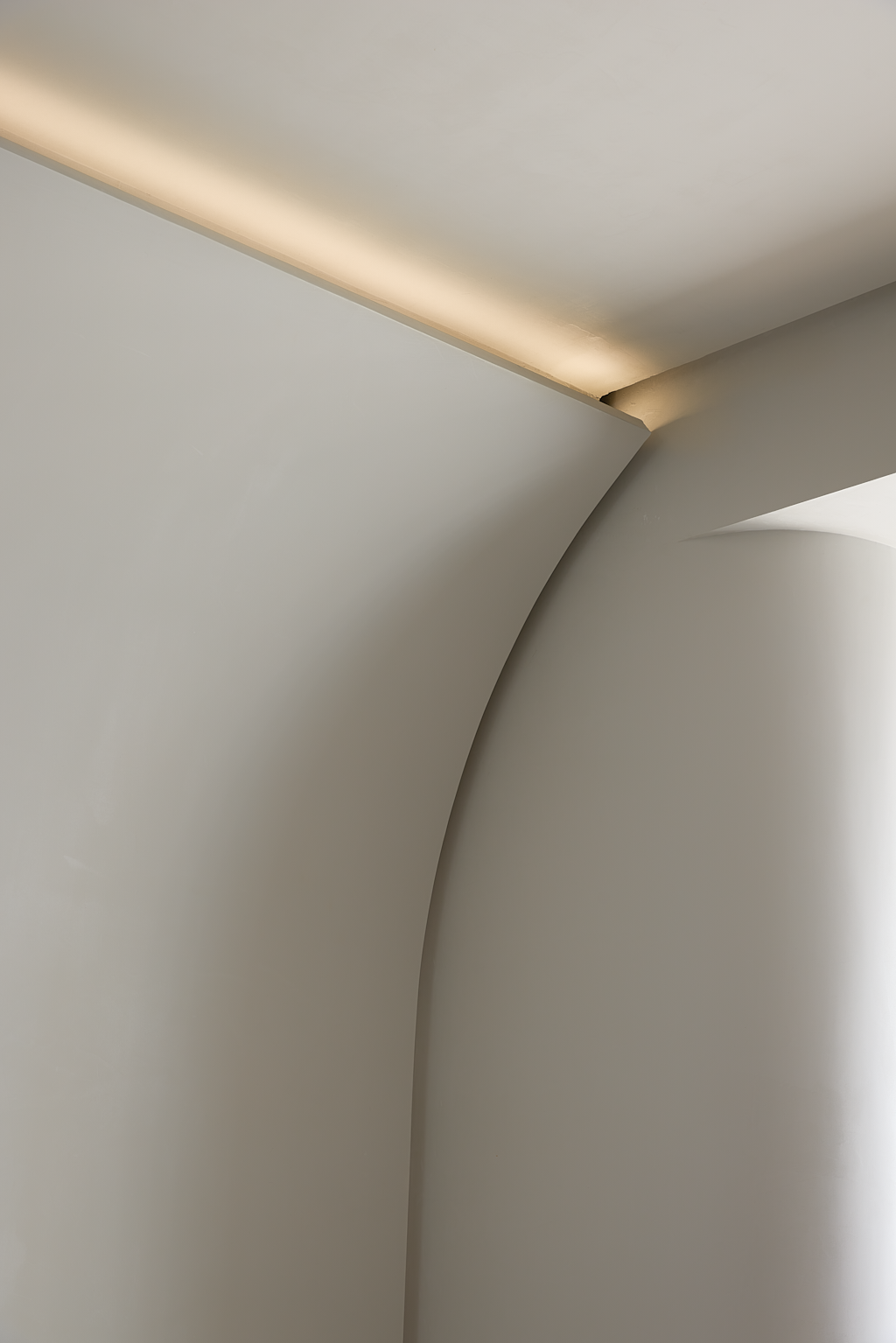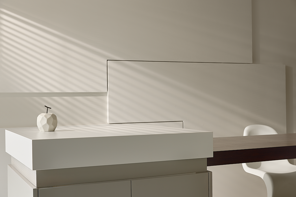 空间意境:本案是极简侘寂风,结合荷兰风格派与现代装饰元素,打造出极具特色的高端精品家庭住宅。以简洁纯净的视觉呈现,达到调节与转换心情的目的,消融掉工作或生活导致的疲惫感。对空间的定位和塑造,对风格的把控与演绎,映射出居住者的卓越品味。色调以米白为主,配以莫兰迪色系50度暖灰色,极具高级感与温暖感。采用微水泥、玻璃砖等当下流行的材质,凸显空间现代、时尚、通透的特性,弧线造型营造出柔美线条,隐喻健康女性的柔美身形和灵动之姿。