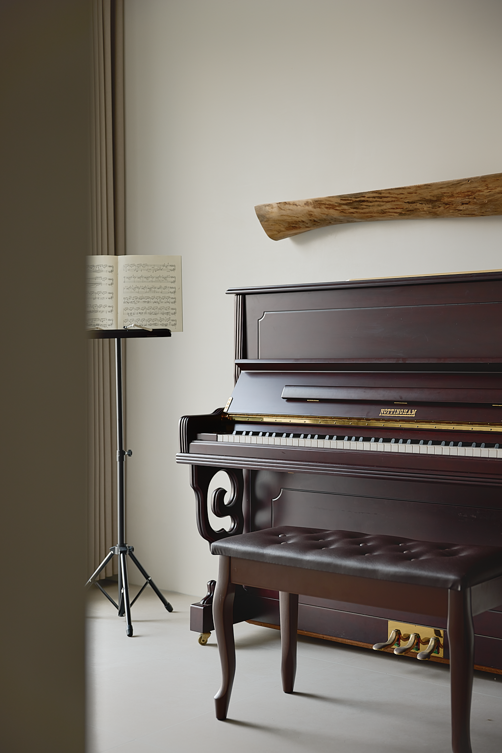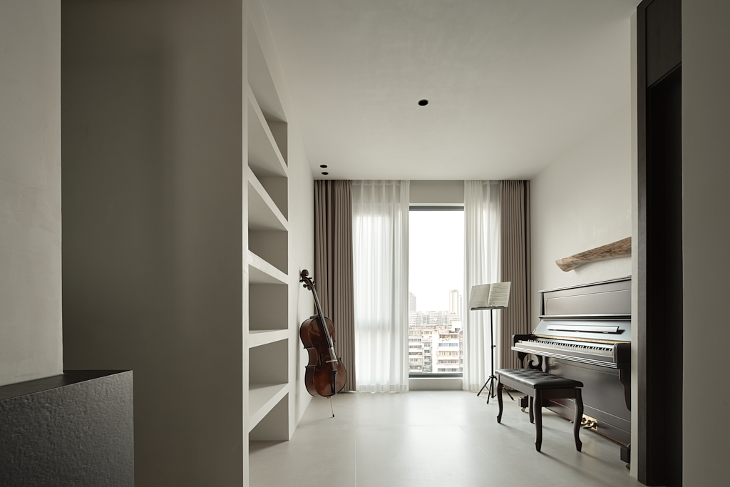 角落的古典钢琴,在不经意间流露出家庭的艺术氛围,为空间标记下深刻的记忆点。温柔的光撩起纱帘落在黑白琴键上,小小的角落便成了油画里如梦似幻的浪漫场景。