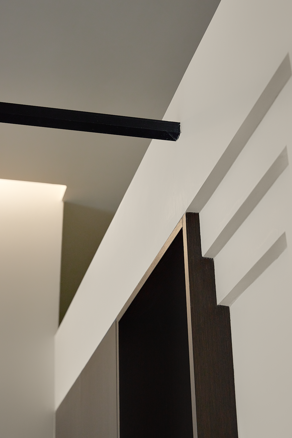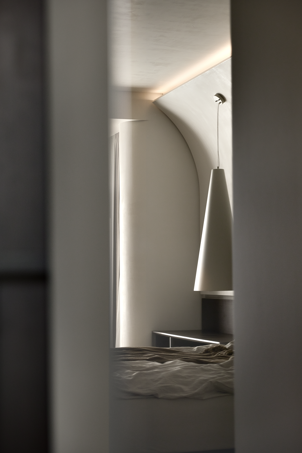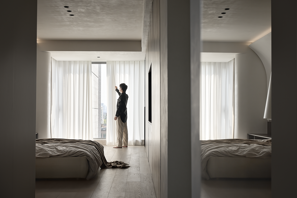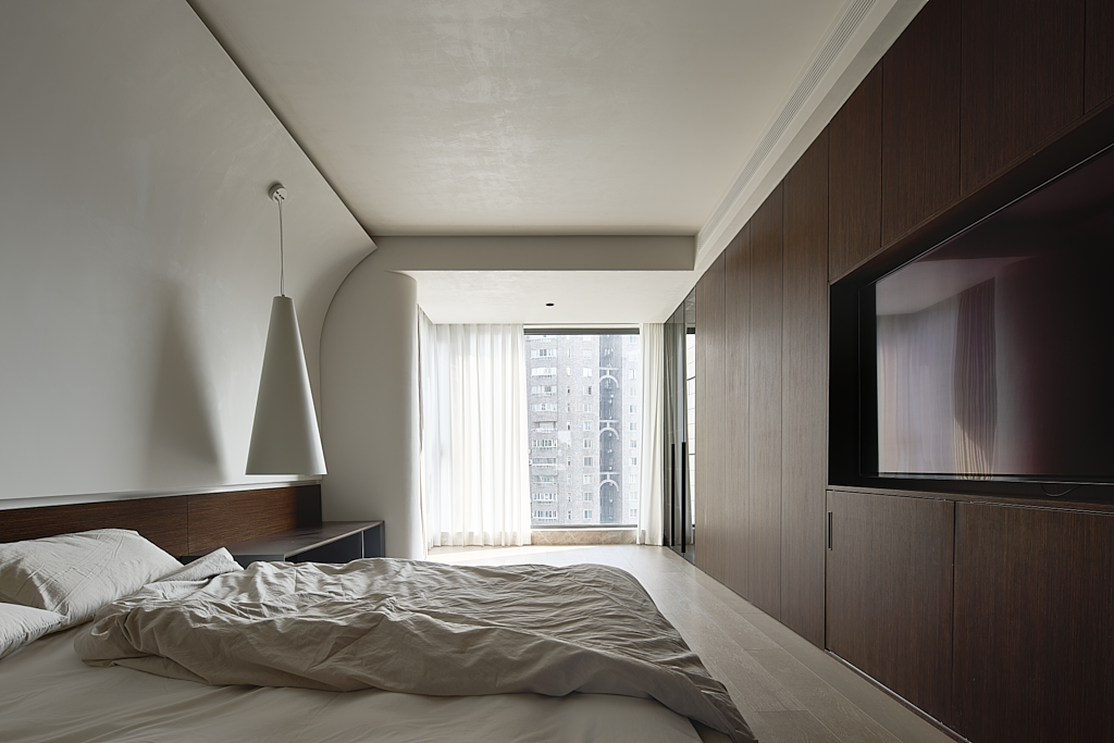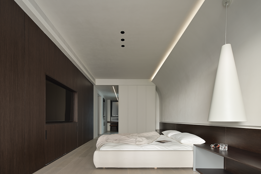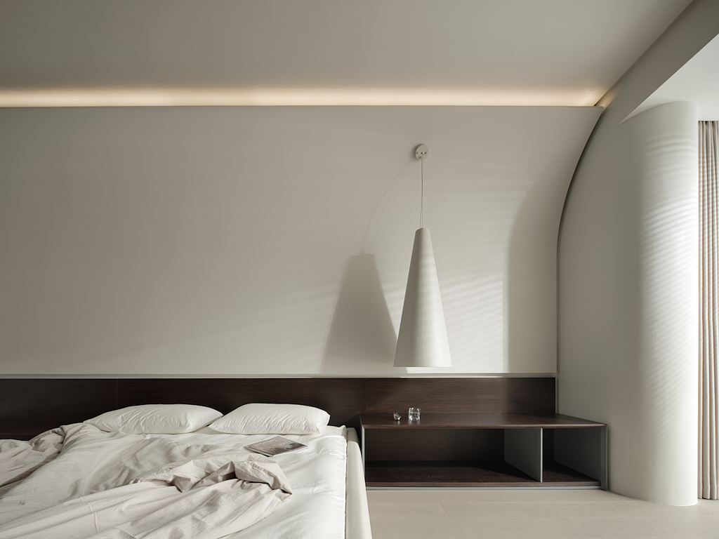 黑白相衬下的卧室更显静谧和温柔,无数条平行的空间线条让空间结构沉稳,气质宁静极简的外表下,蕴藏着低调的轻奢。极富家居感的白,削弱了空间的距离感,这样的环境让人心绪平静,也使得空间的美具有毋庸置疑的辨识度。