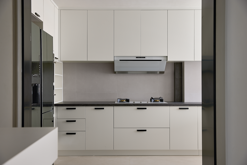 空间布局:客厅为一切的伊始,设计师置入自身建筑型思维,注重细节和建筑构造的美感。从客厅到餐厅的转场并没有刻板印象中的厚墙阻隔,餐厅墙面和电视墙如同两块穿插的积木,于两个区域间创造出独特的联动感。空间的形体被塑造得别具一格,这样打破常规的设计,传递的更是一种不落俗套的生活格调。