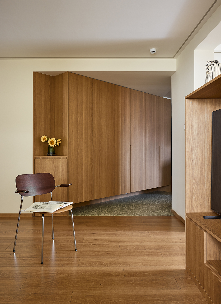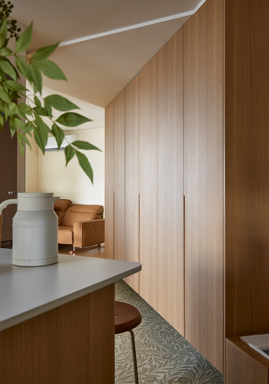 选材上充分体现了低碳与经济性的原则。通过精心挑选实用且环保的材料,不仅满足了居住者的功能需求,还有效降低了改造成本。例如,玄关区域采用了集成玄关柜与次衣柜的设计,选用了环保且耐用的木质材料和五金配件,既节省了空间又提高了收纳效率。厨房则选用了白色岩板搭配木质柜体,不仅美观大方,而且易于清洁维护,降低了日后的维护成本。客厅与餐厅的衔接处采用了半高电视柜设计,既解决了采光问题,又增加了空间的通透感和层次感,同时选用了环保的木地板和家具,确保了居住者的舒适度和健康。此外,在卫生间设计中,采用了干湿分离的理念,并选用了防滑、抗菌且易于清洁的材料,提高了使用体验并降低了维护成本。整体而言,本次改造设计在选材上注重了材料的实用性和耐用性,实现了资源的高效利用和改造成本的降低。