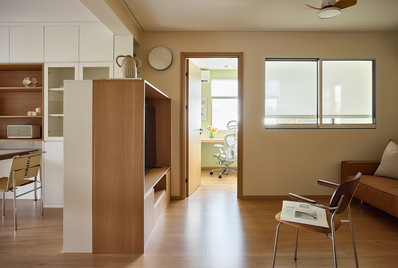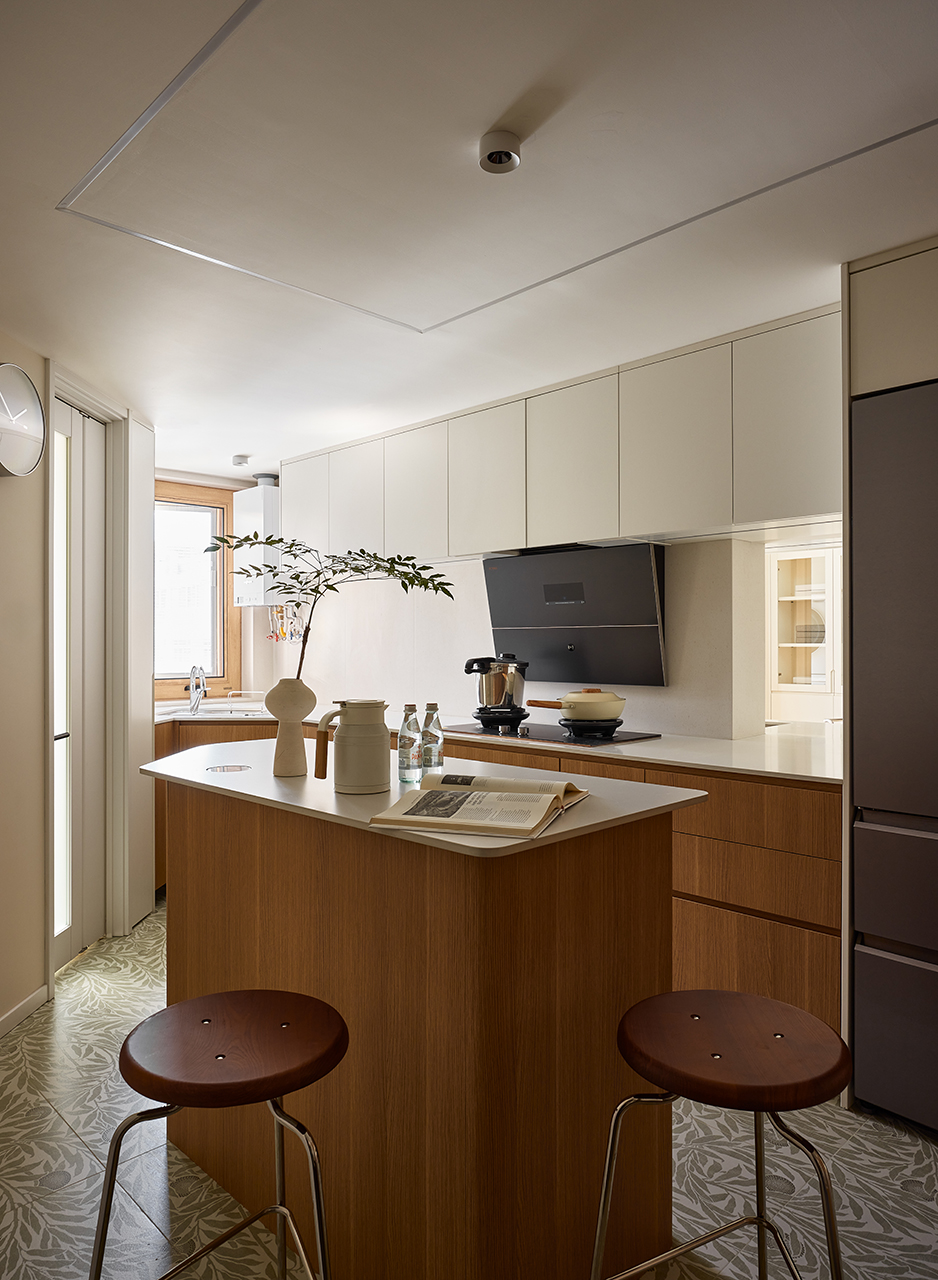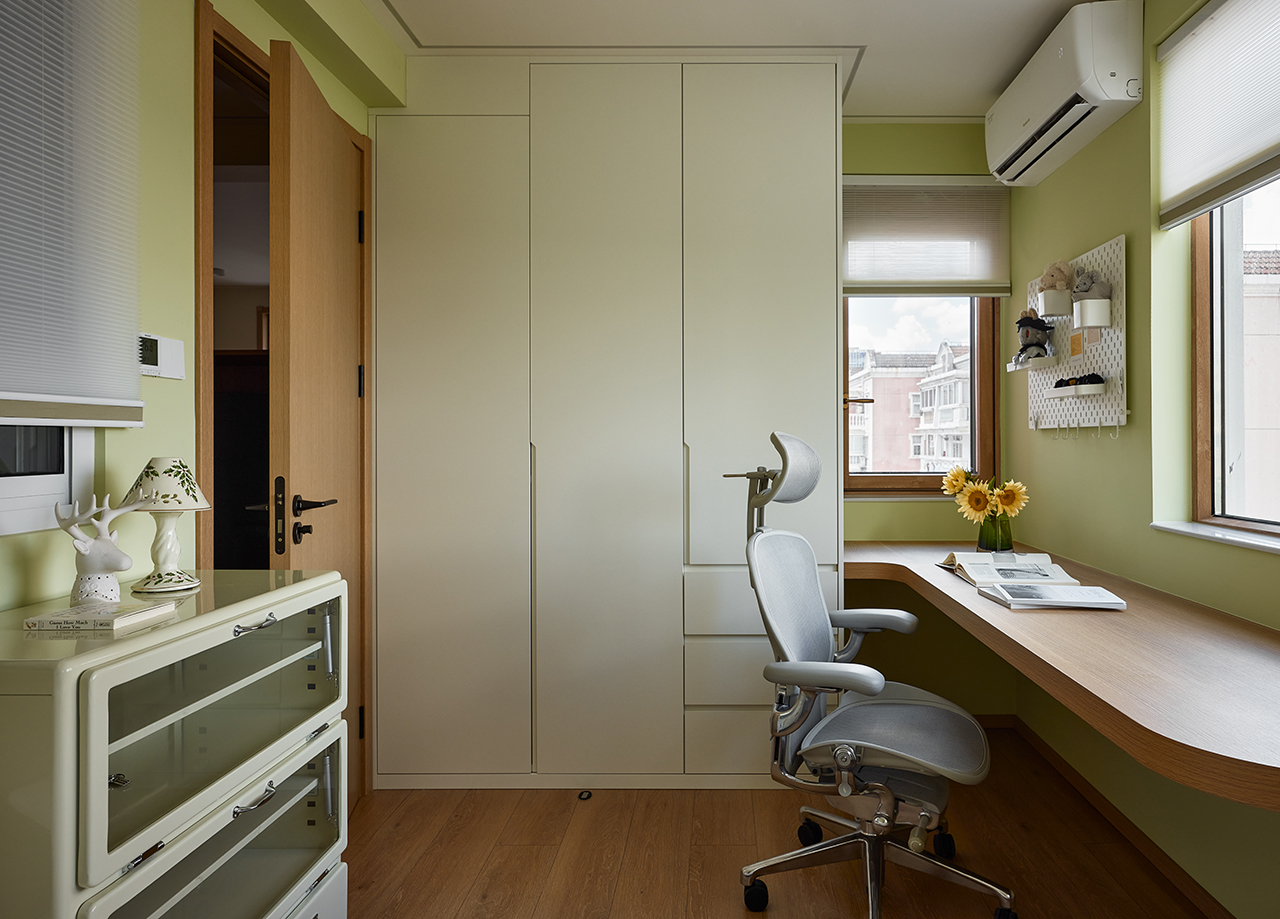 通过重新梳理狭长的一字型户型,巧妙利用异形空间,成功划分出独立的餐厅与洗衣阳台,极大地提升了空间利用率与功能性。厨房采用开放式设计,搭配个性化岛台与白色岩板,既温馨又不失清爽,与餐厅之间的窗洞设计更是增强了家人间的互动性。客厅作为家的情感纽带,通过半高电视柜的设计,巧妙连接餐厅,增加了空间的通透感与层次感。女儿房与主卧则分别营造了绿色小清新与宁静舒适的氛围,满足了不同家庭成员的需求。此外,卫生间实现干湿分离,提升了使用体验。整体而言,本次改造在保持空间充裕与收纳充足的基础上,通过细致入微的设计,创造了一个既实用又充满温情的家居环境。