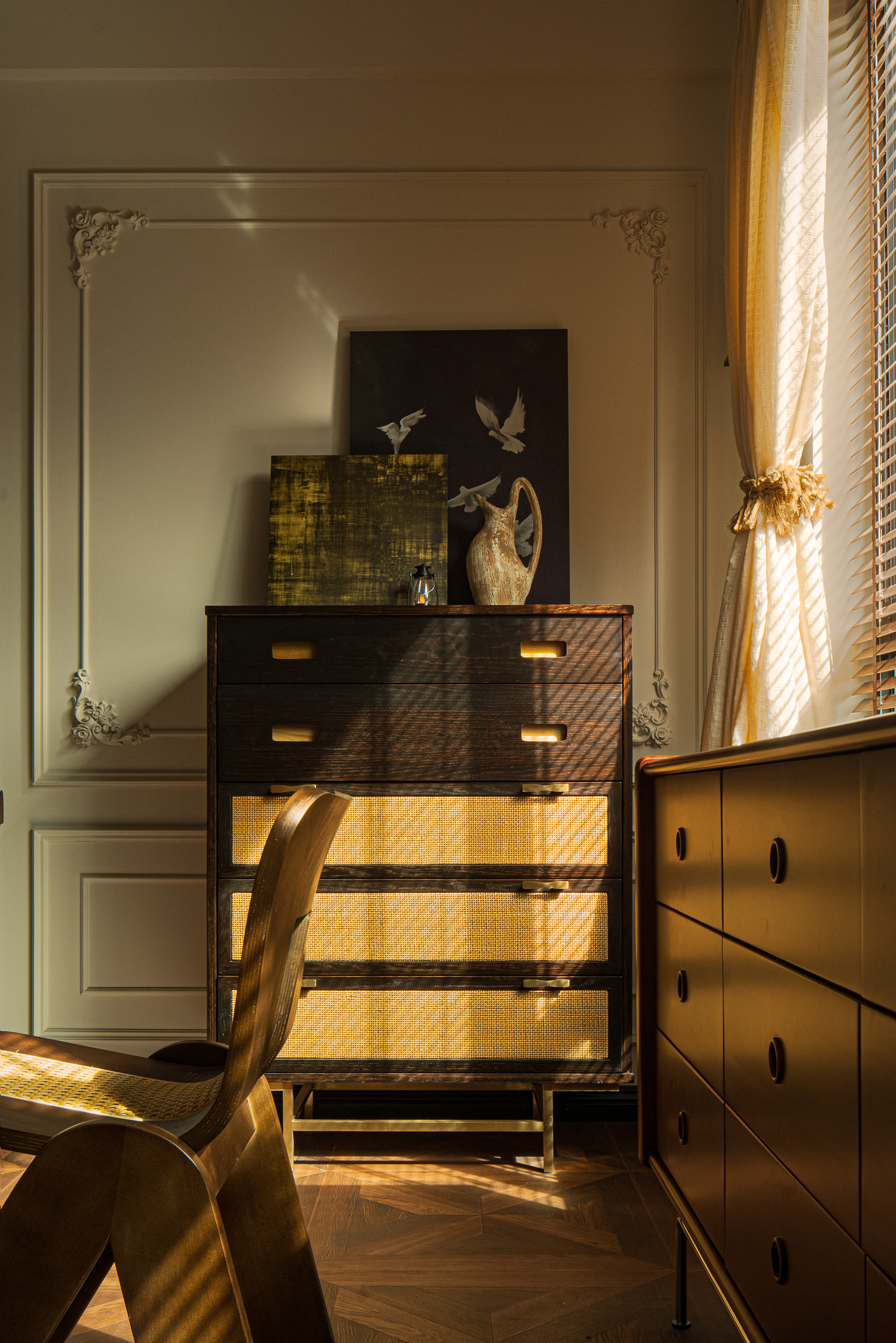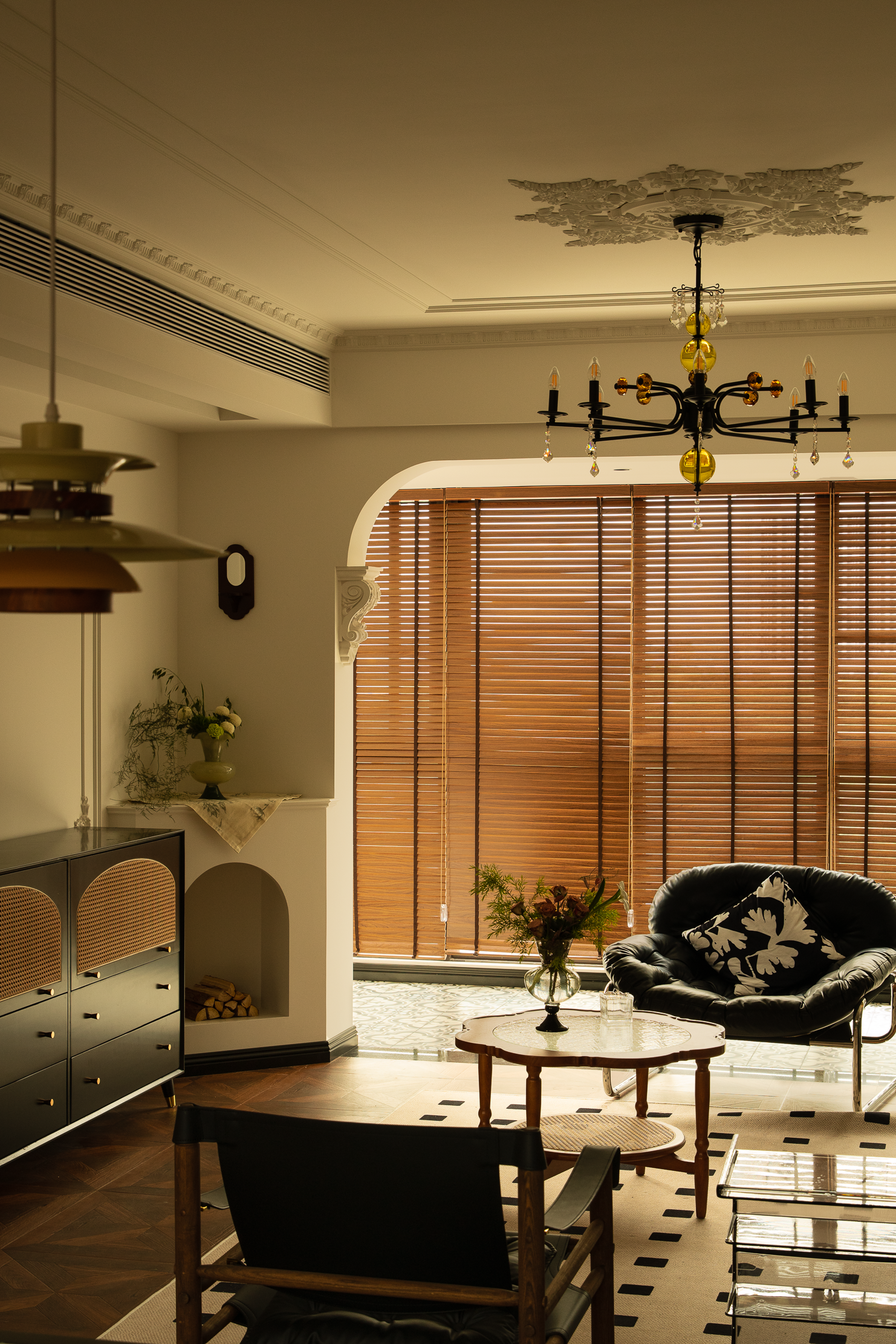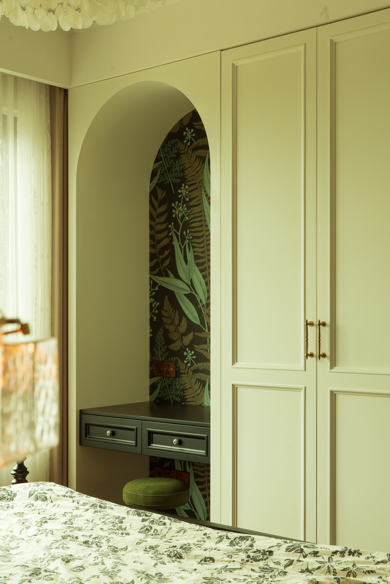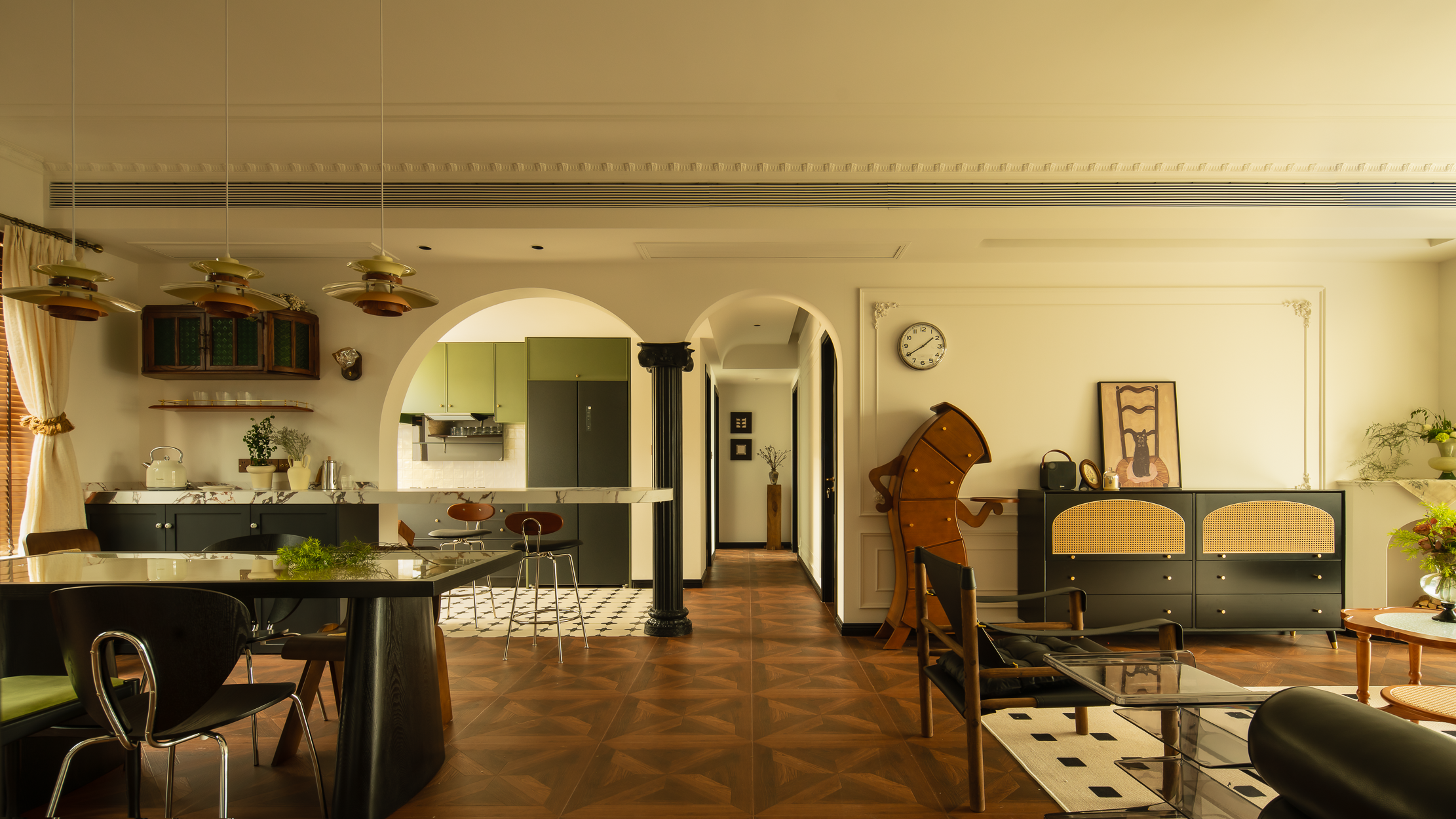 空间意境:本案风格上是采用的法式混搭中古和侘寂元素。硬装以轻法式为主,软装上搭配中古、侘寂、法式的些许元素,其中每个柜体的拉手都是按照不同区域单独搭配。