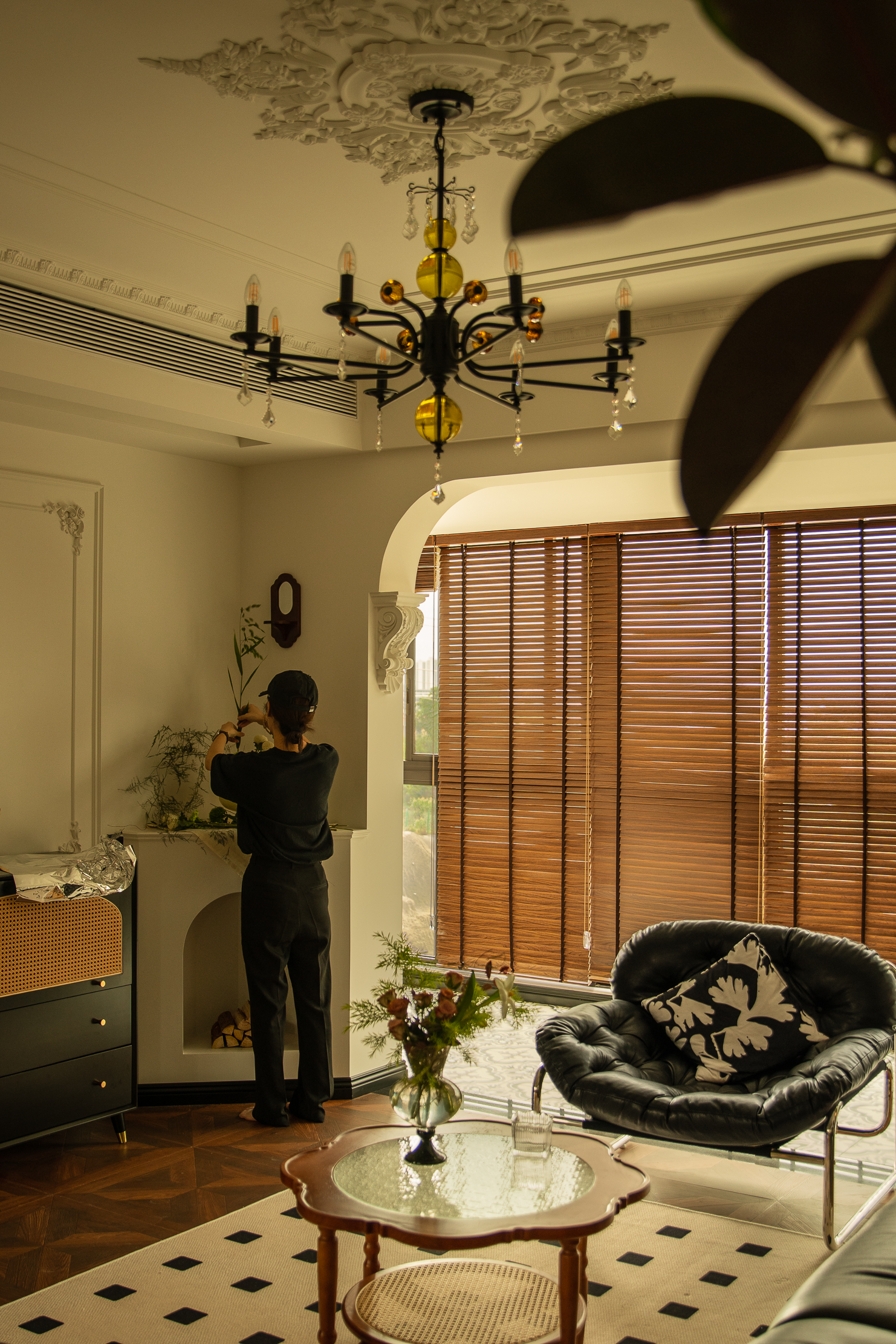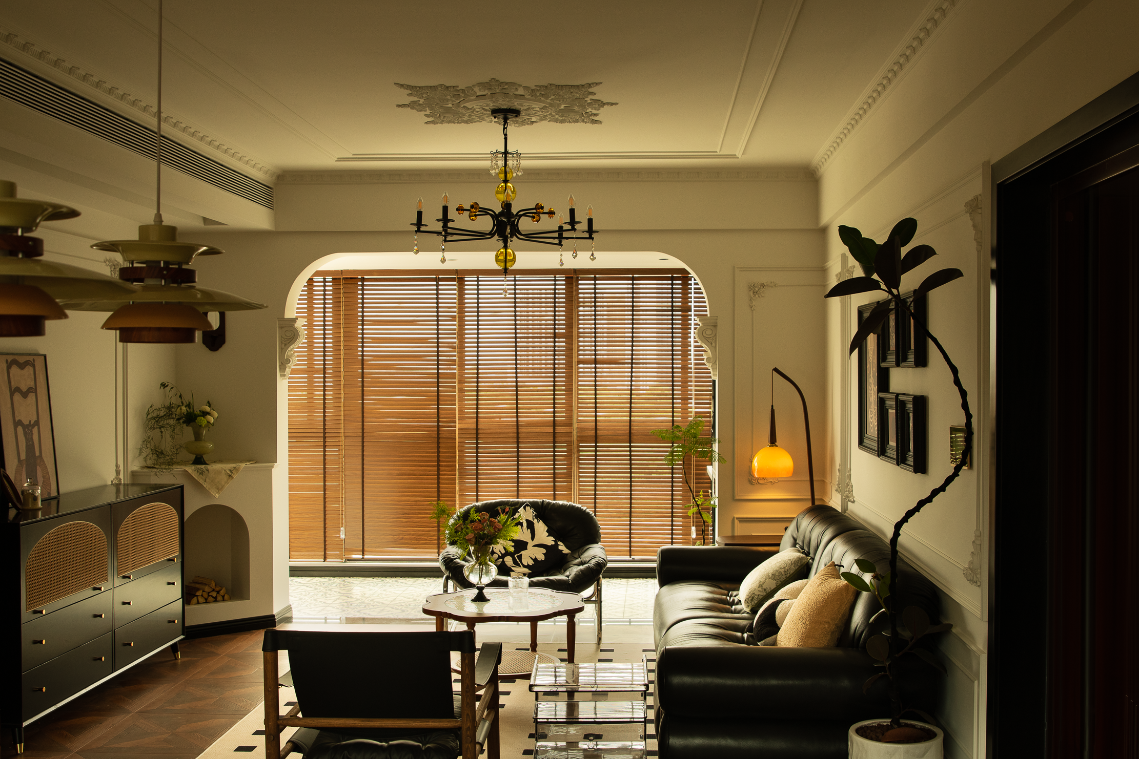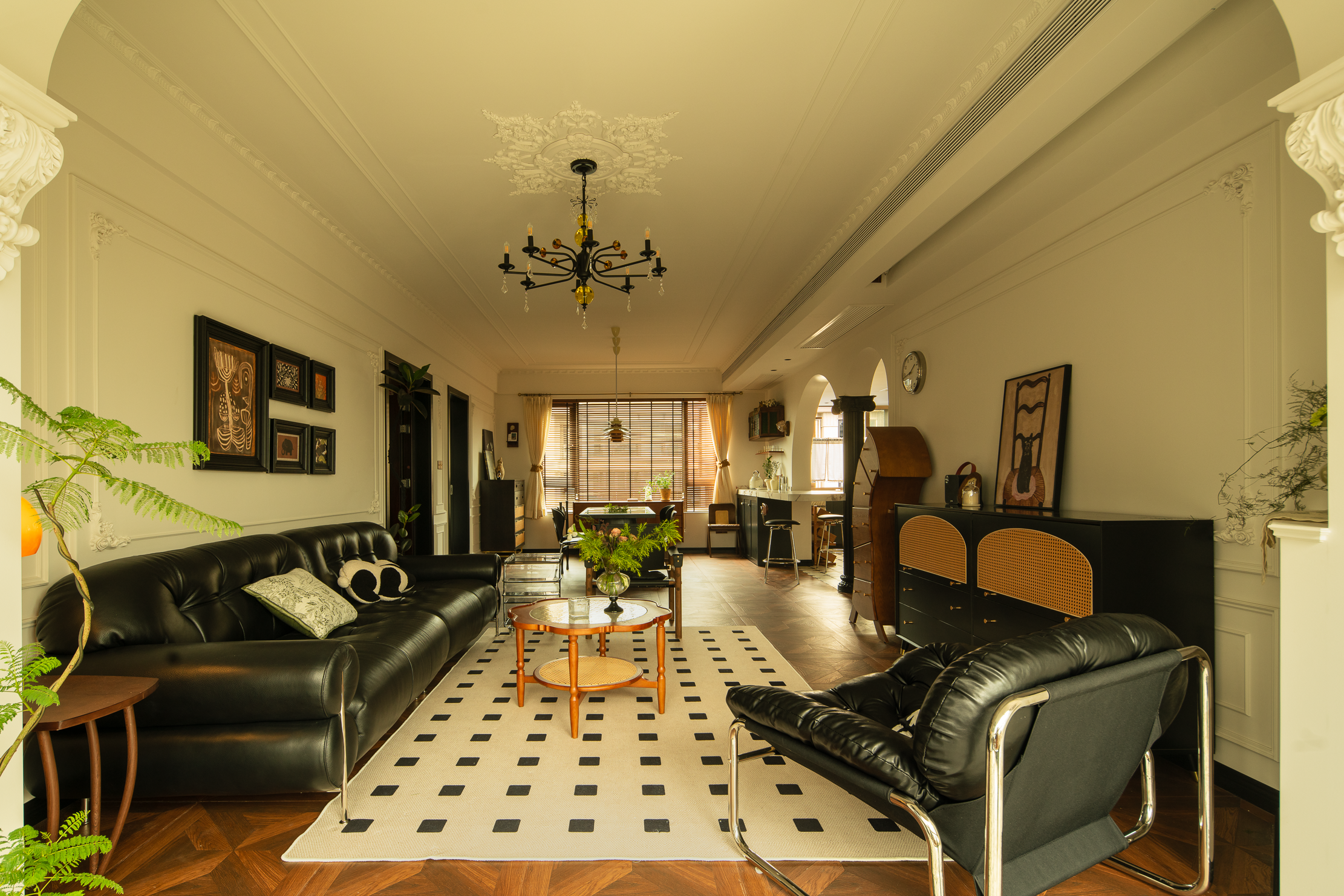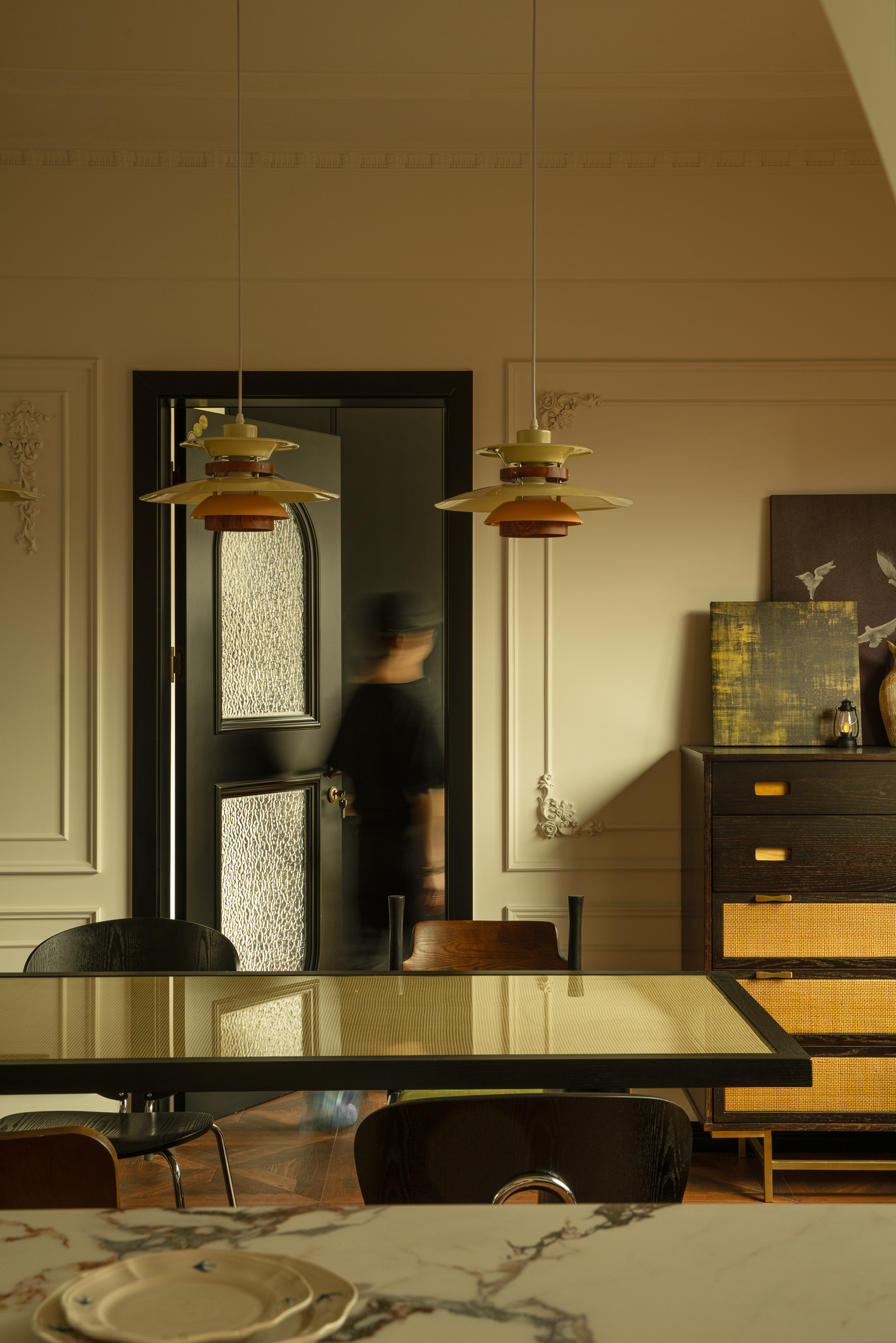 空间意境:本案风格上是采用的法式混搭中古和侘寂元素。硬装以轻法式为主,软装上搭配中古、侘寂、法式的些许元素,其中每个柜体的拉手都是按照不同区域单独搭配。