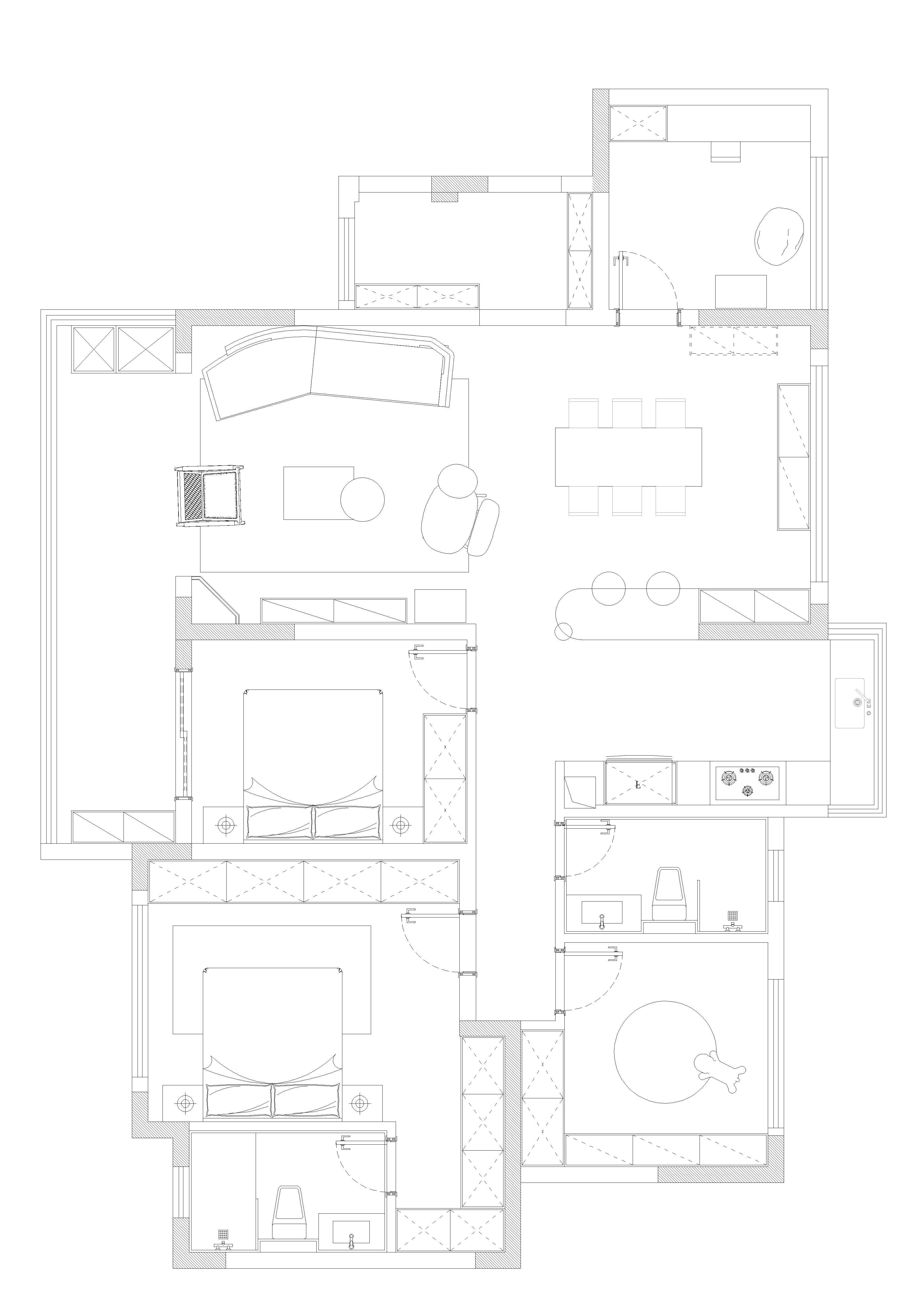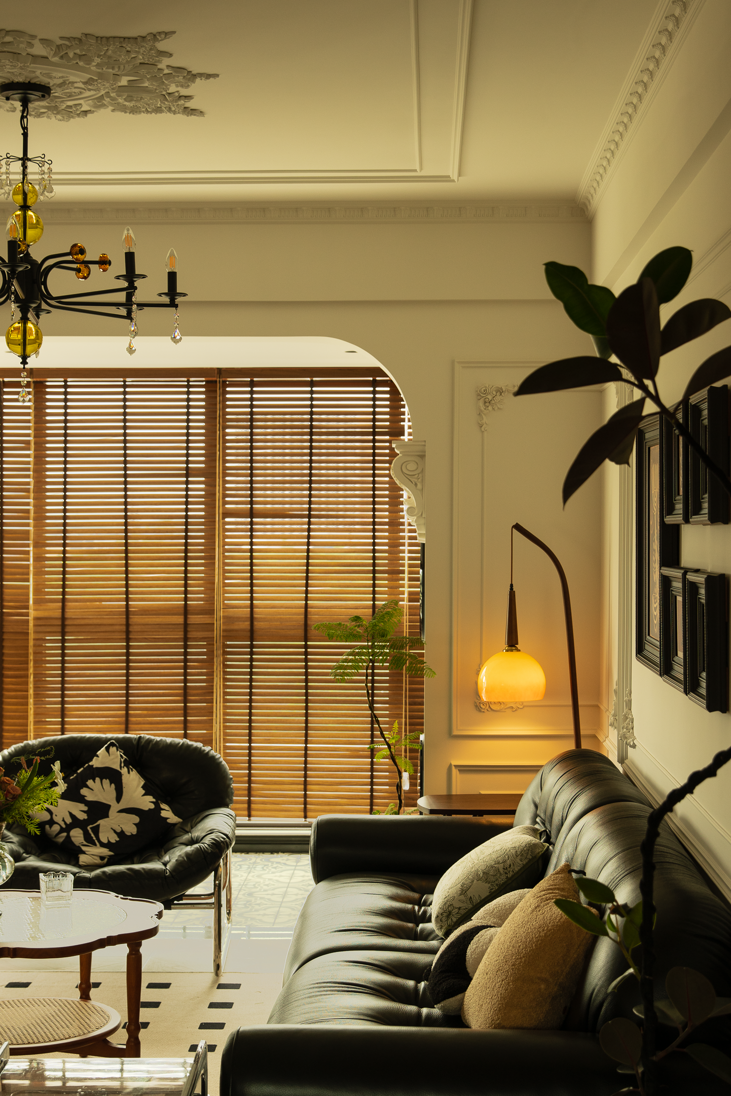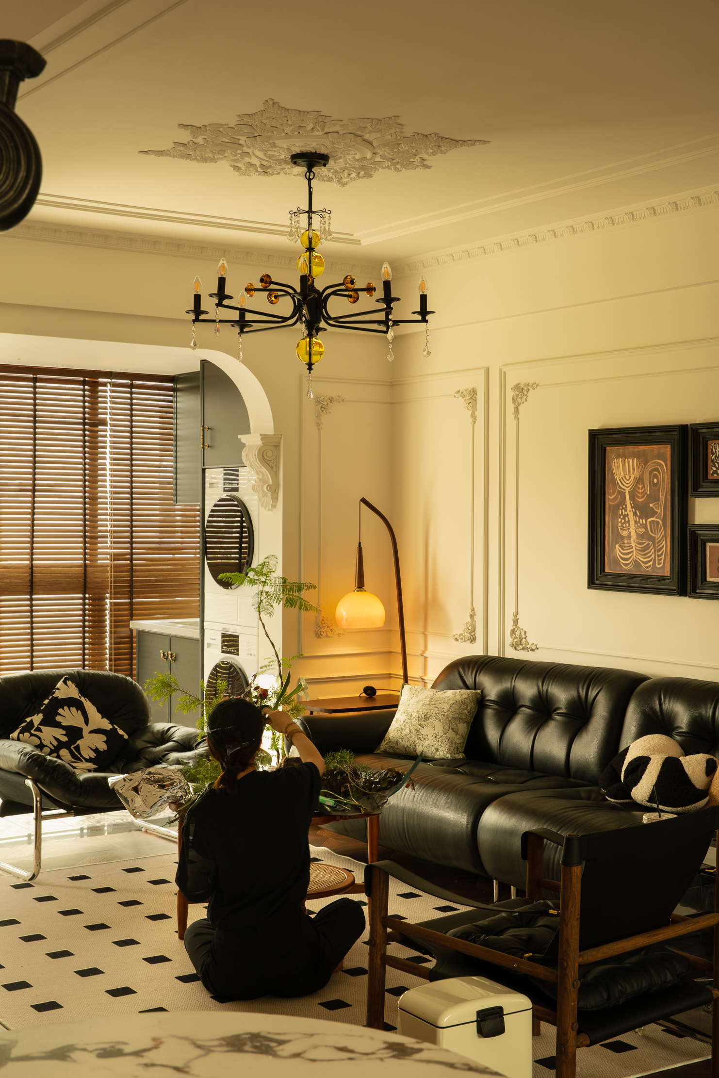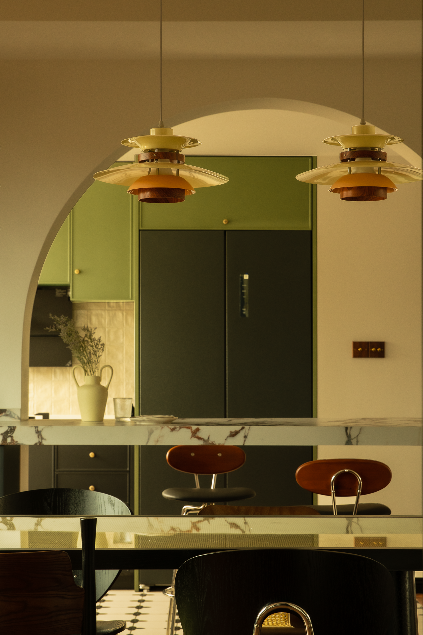 空间意境:本案风格上是采用的法式混搭中古和侘寂元素。硬装以轻法式为主,软装上搭配中古、侘寂、法式的些许元素,其中每个柜体的拉手都是按照不同区域单独搭配。