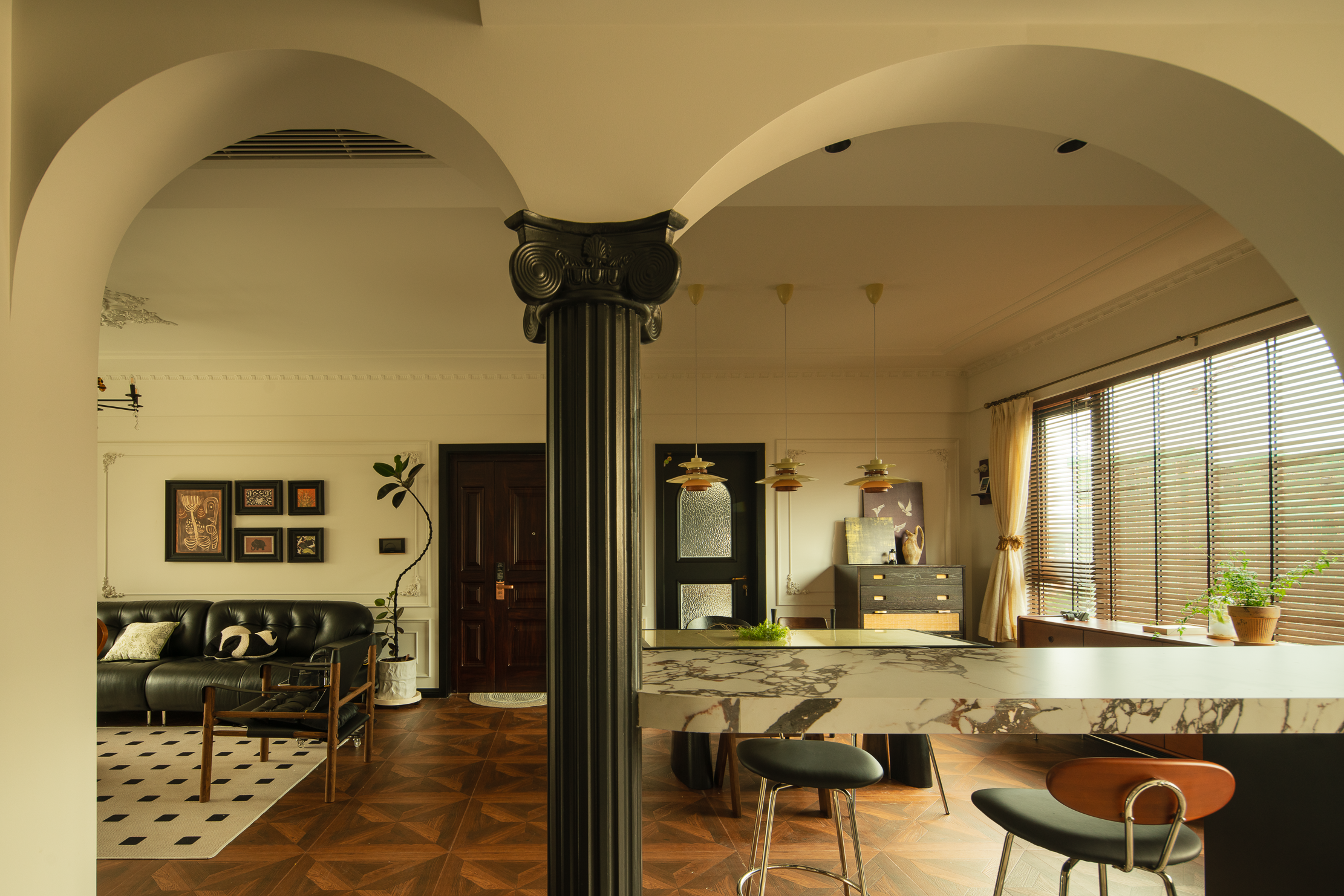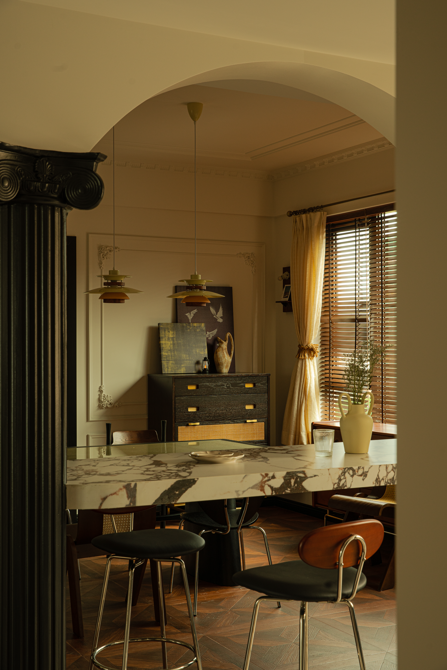 空间布局:采用开放式厨房,位于厨房和餐厅的交界处考虑了一个女业主很期望的餐边柜及吧台的功能。吧台用岩板倒圆弧形让空间变得更柔软一些,其中圆弧一端采用经典罗马柱作为支撑点。