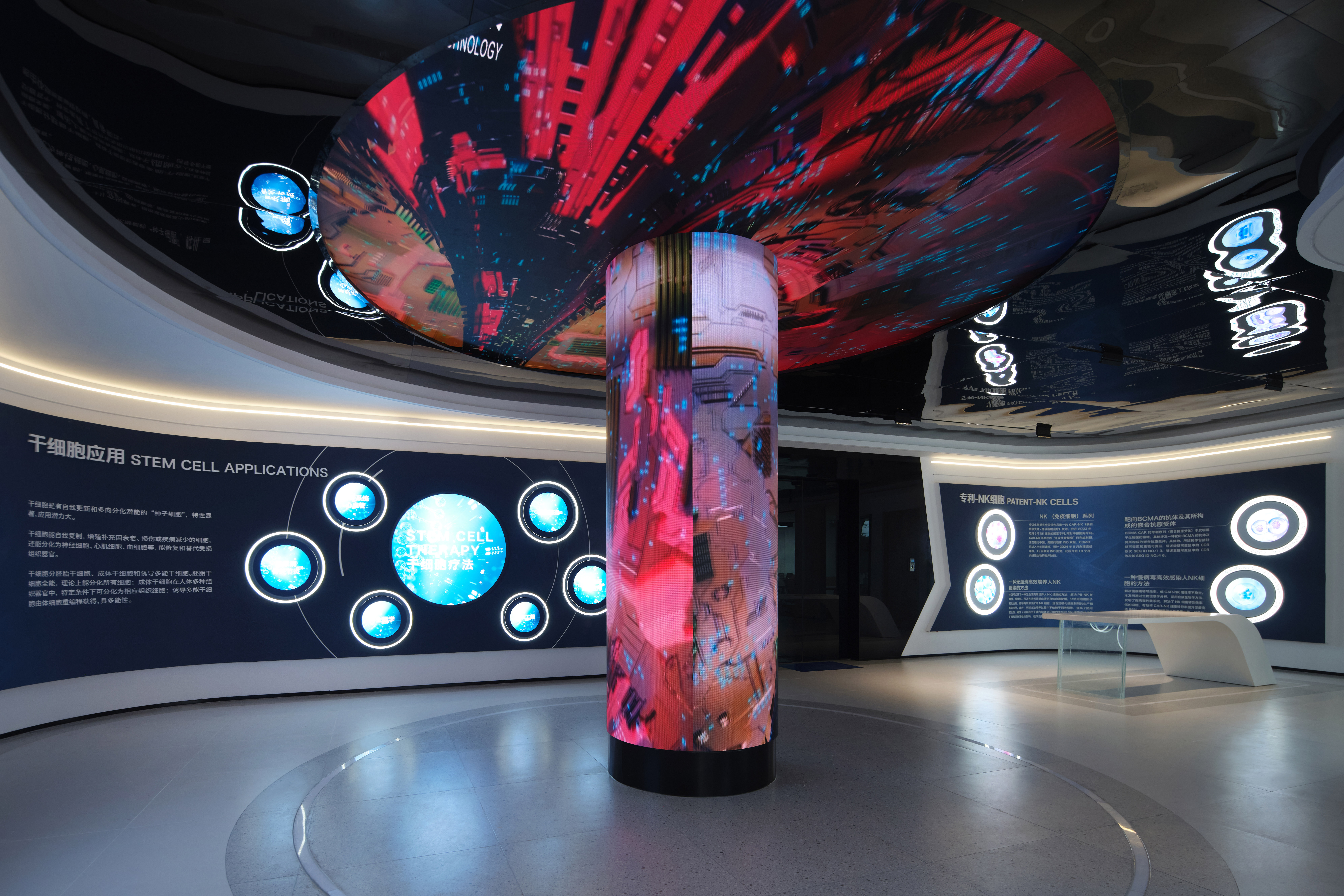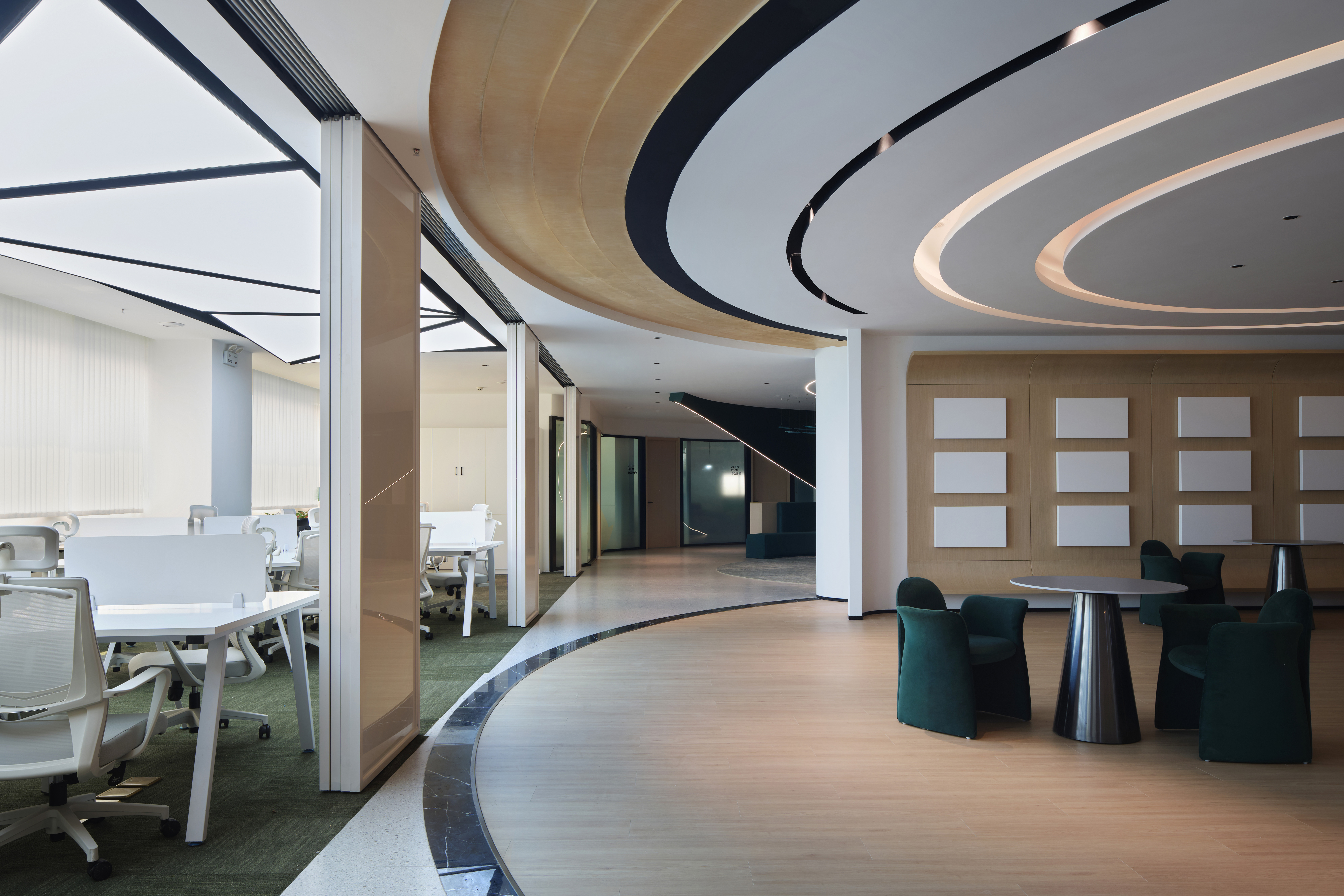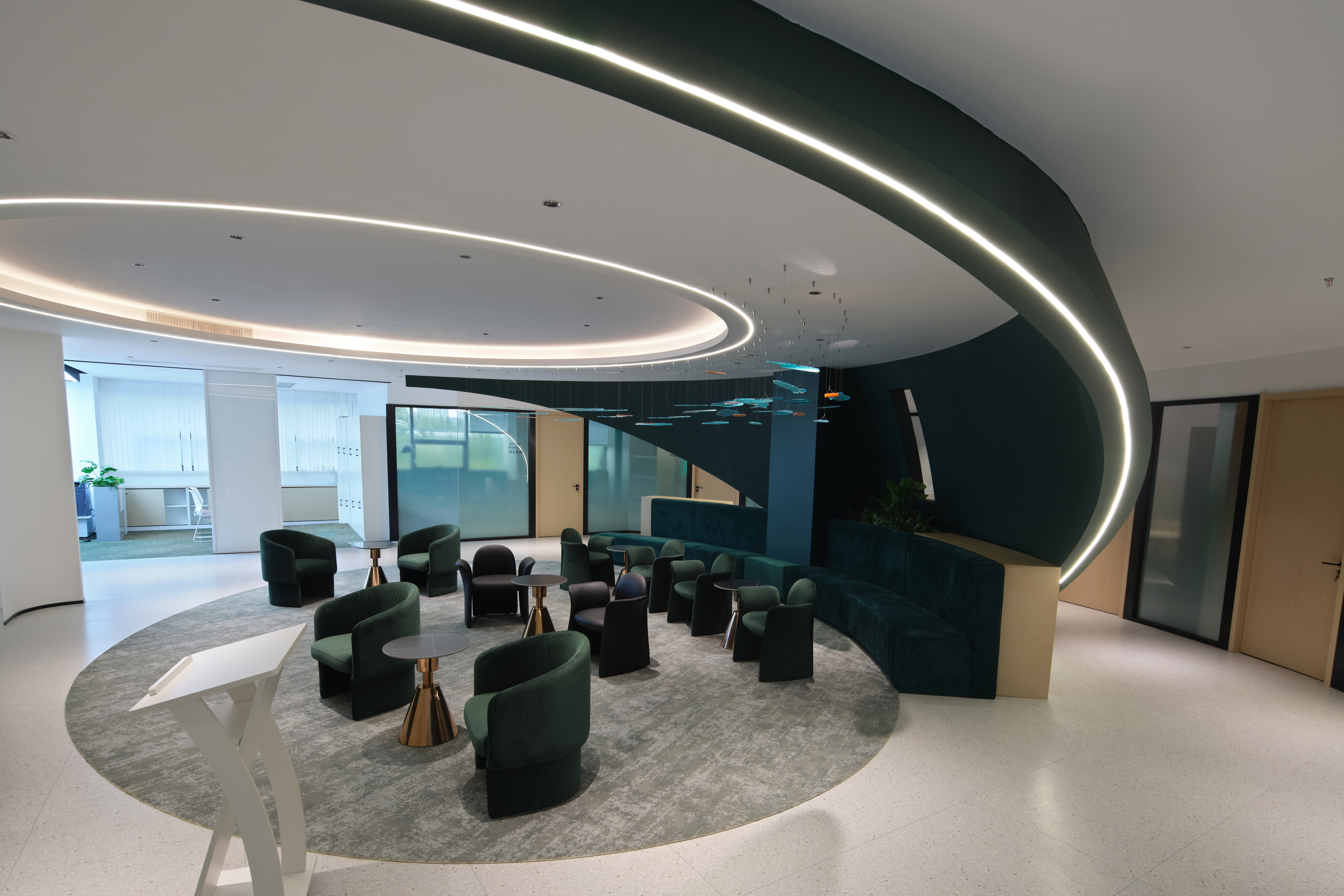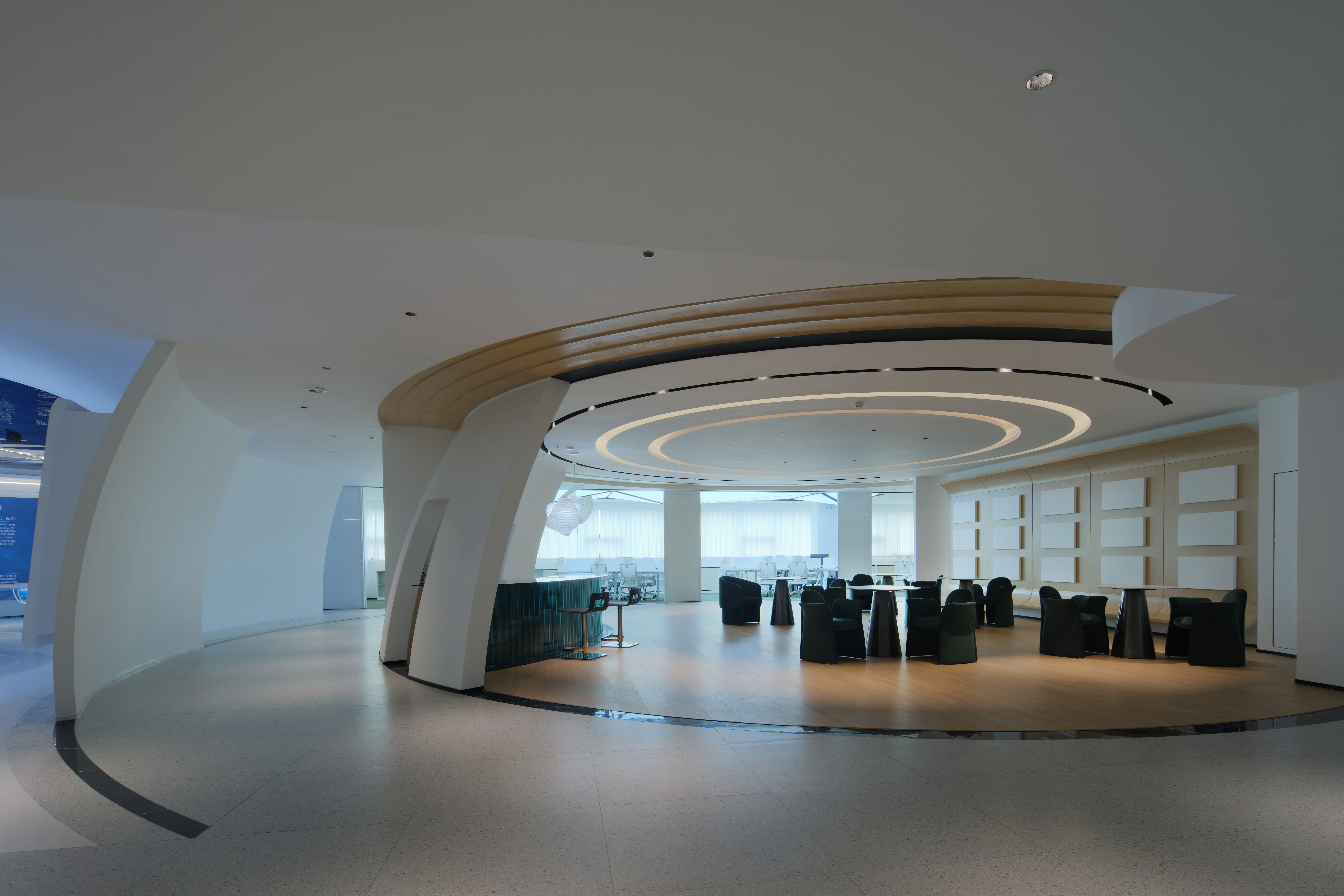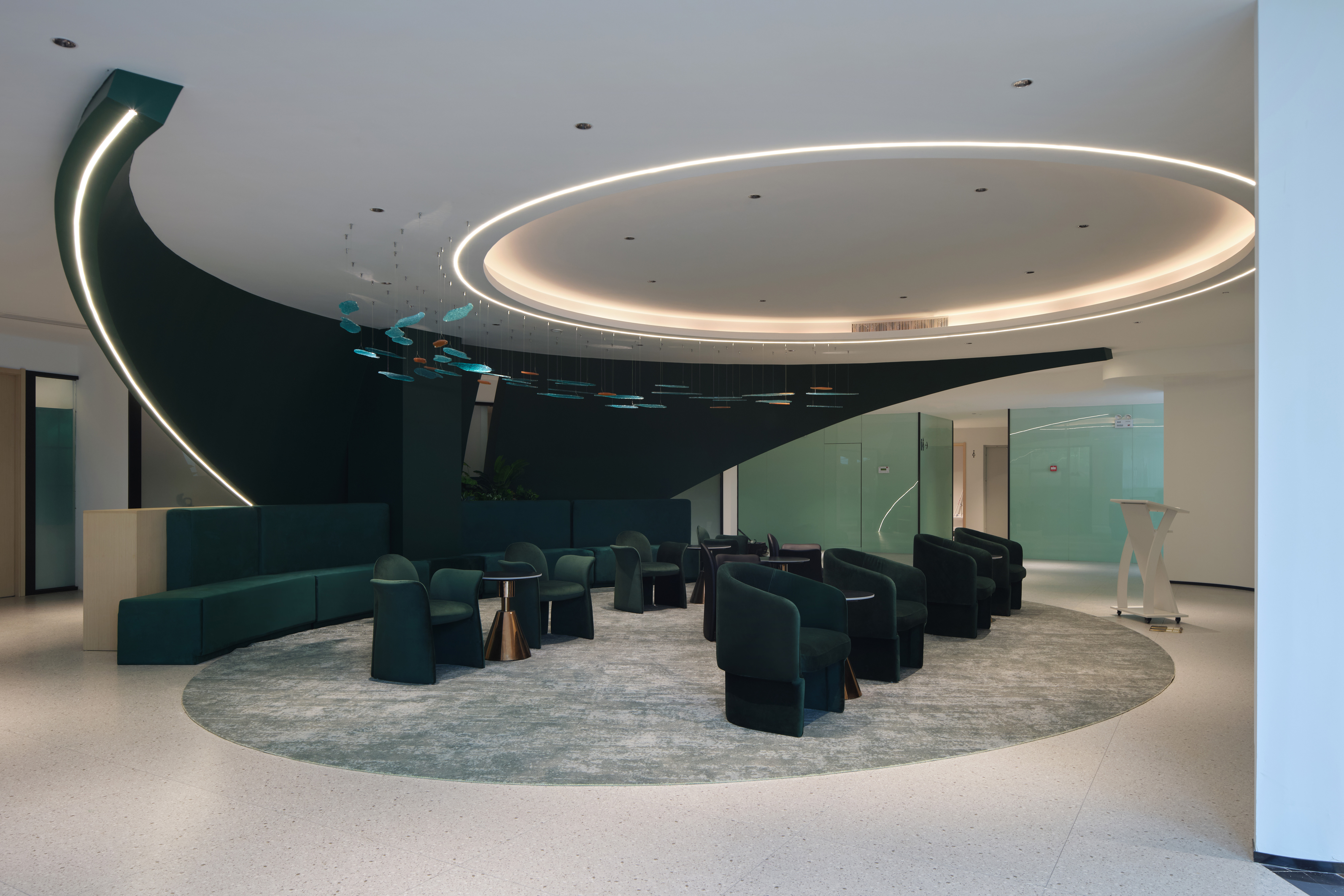 整个空间通过弧形墙面和流畅的设计线条,打破了传统的直线与刚性布局,创造出更加灵动、开放的氛围。这种弧形设计不仅提升了空间的流动性,也象征着细胞的生长和再生,体现了生命力和自然的流动感。