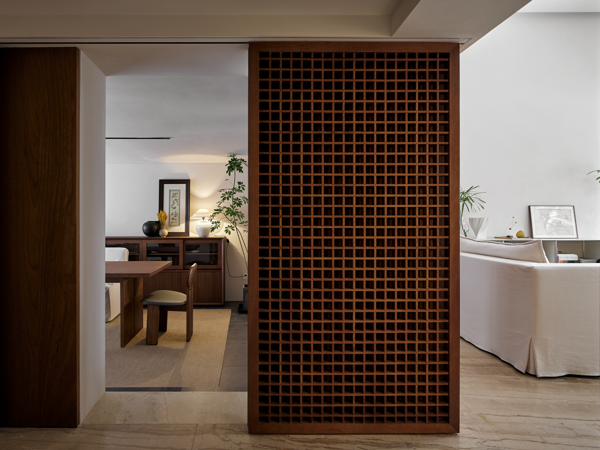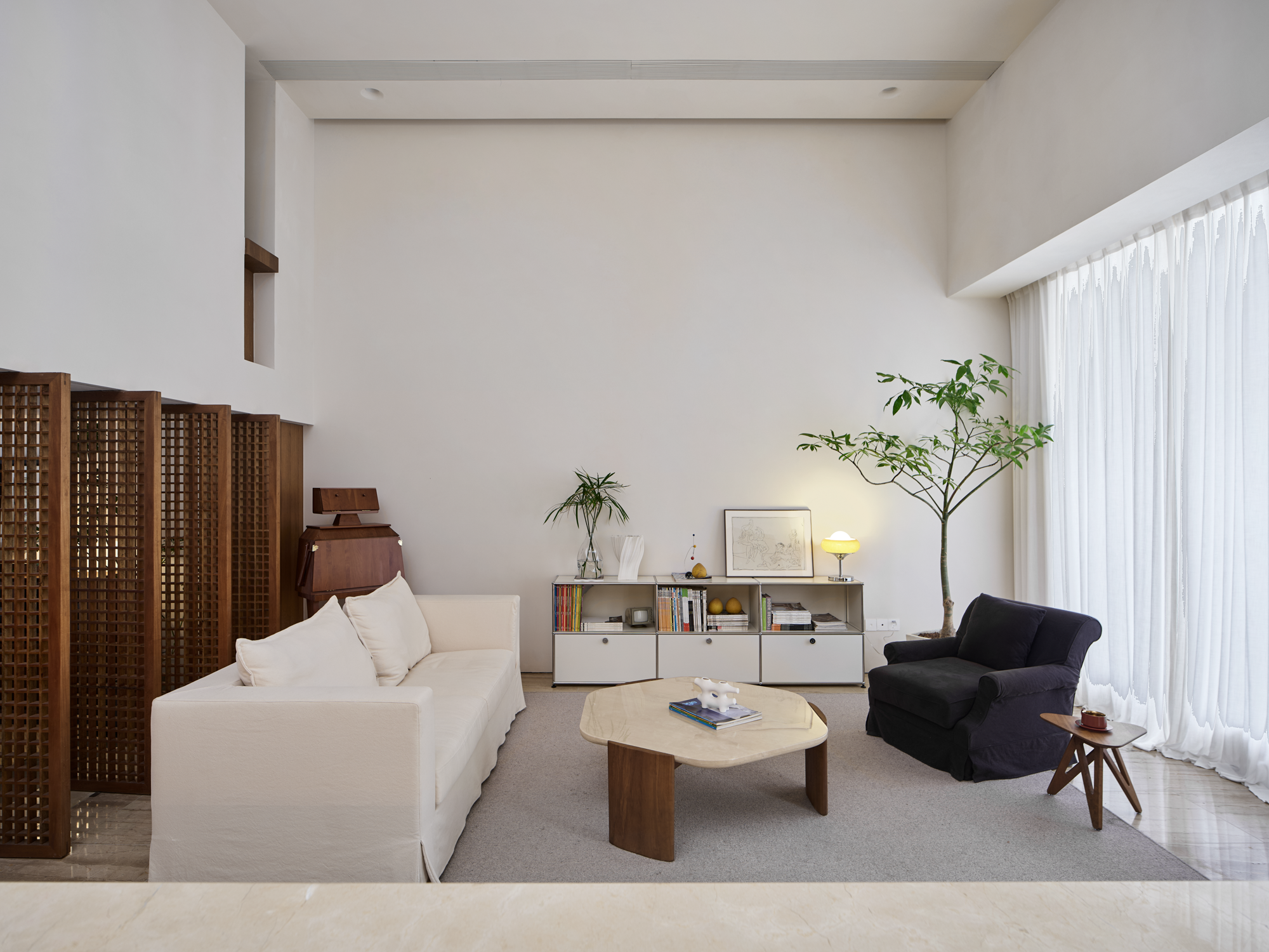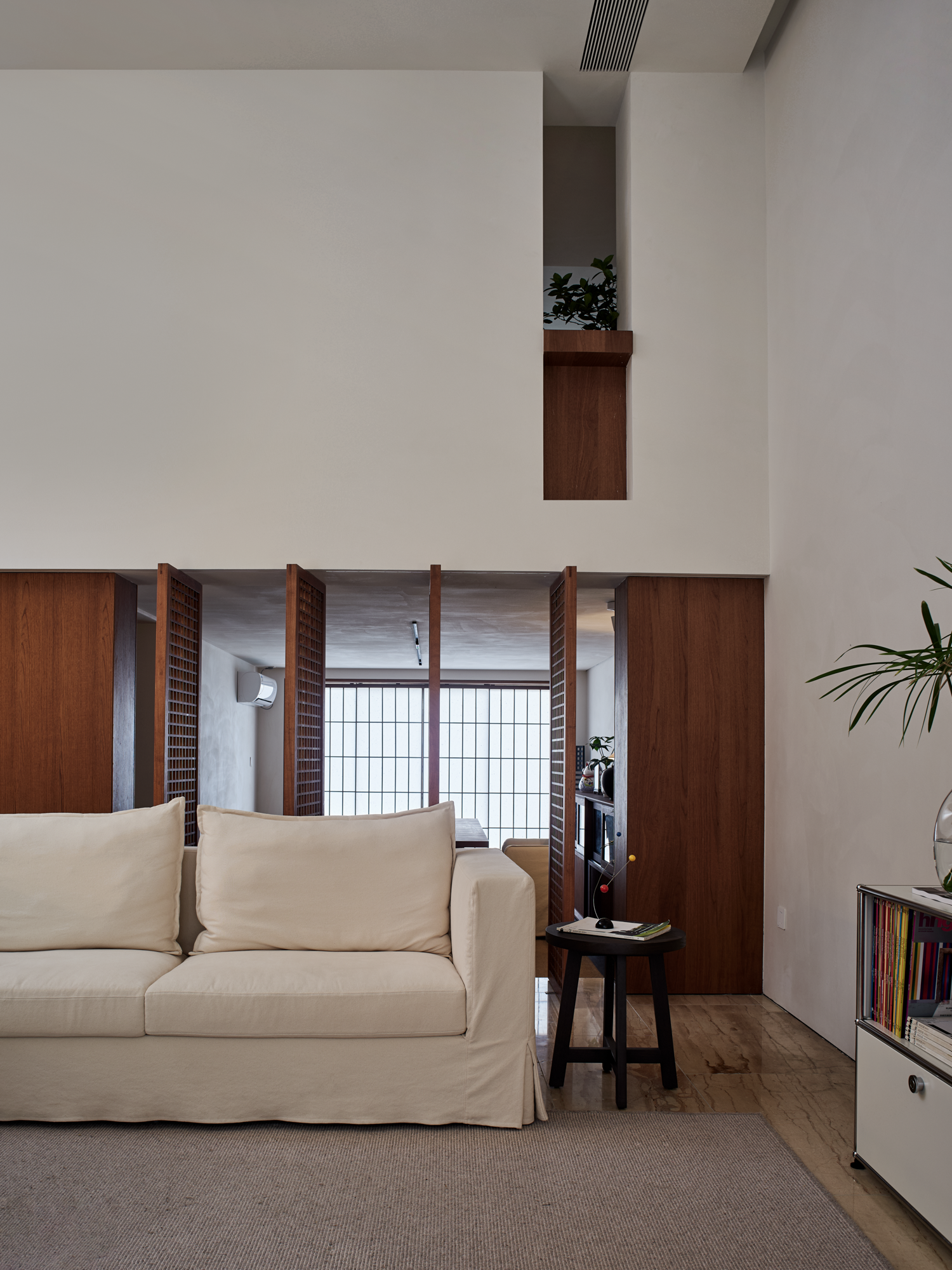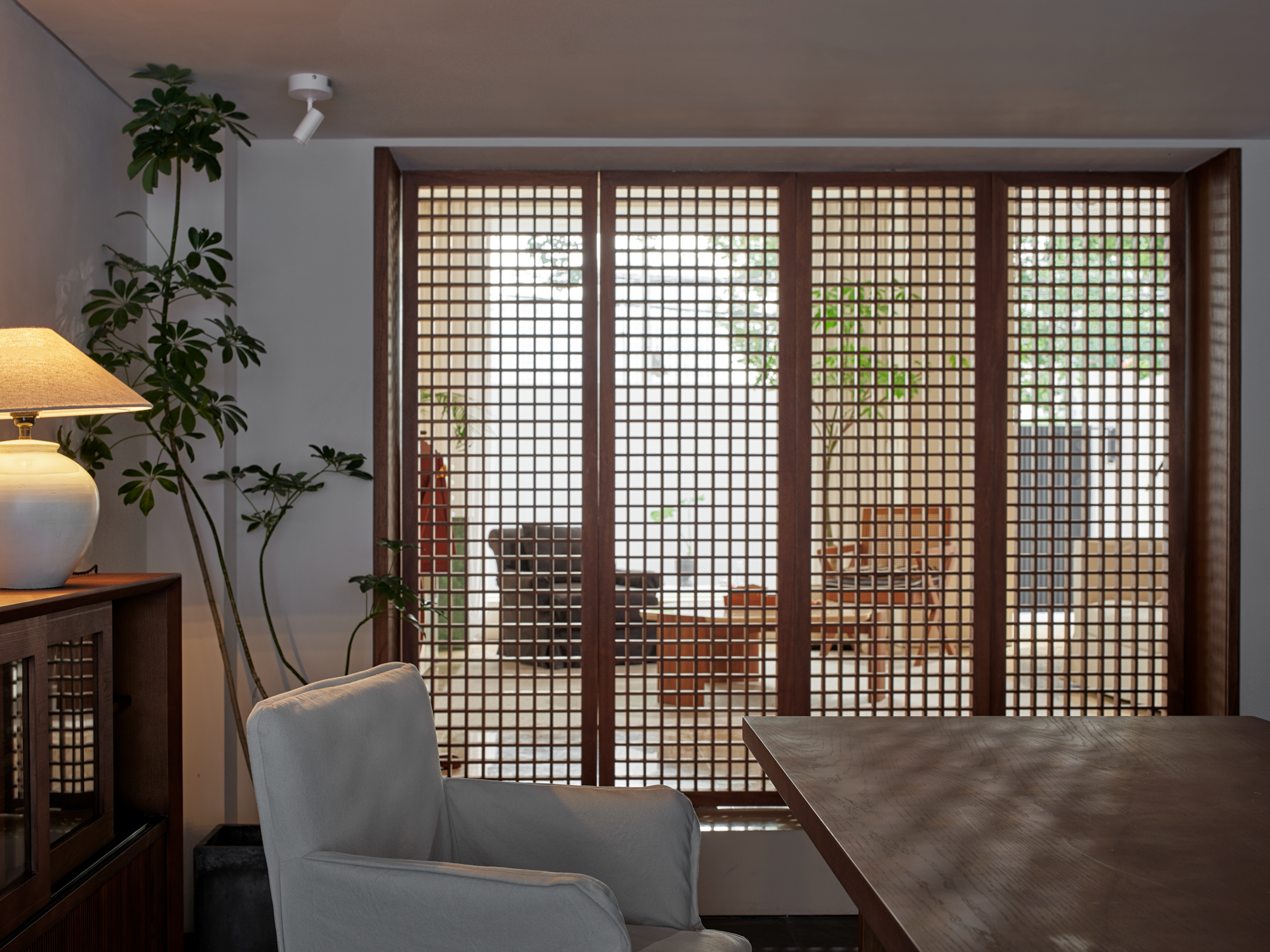 空间意境:本案的结构相对特殊且无法拆改的前提下,我们只能通过色彩、动线以及光线的处理去用力。从户外经过小门进入花园,到达一层的接待空间,从一层向下延伸为下沉式的品茗空间,我们在隔断上采用了镂空的格栅,无会客需求时可以完全敞开形成连贯宽敞的空间结构,在使用的时候也同样可以带来相对私密的状态,且不影响光线的摄入。