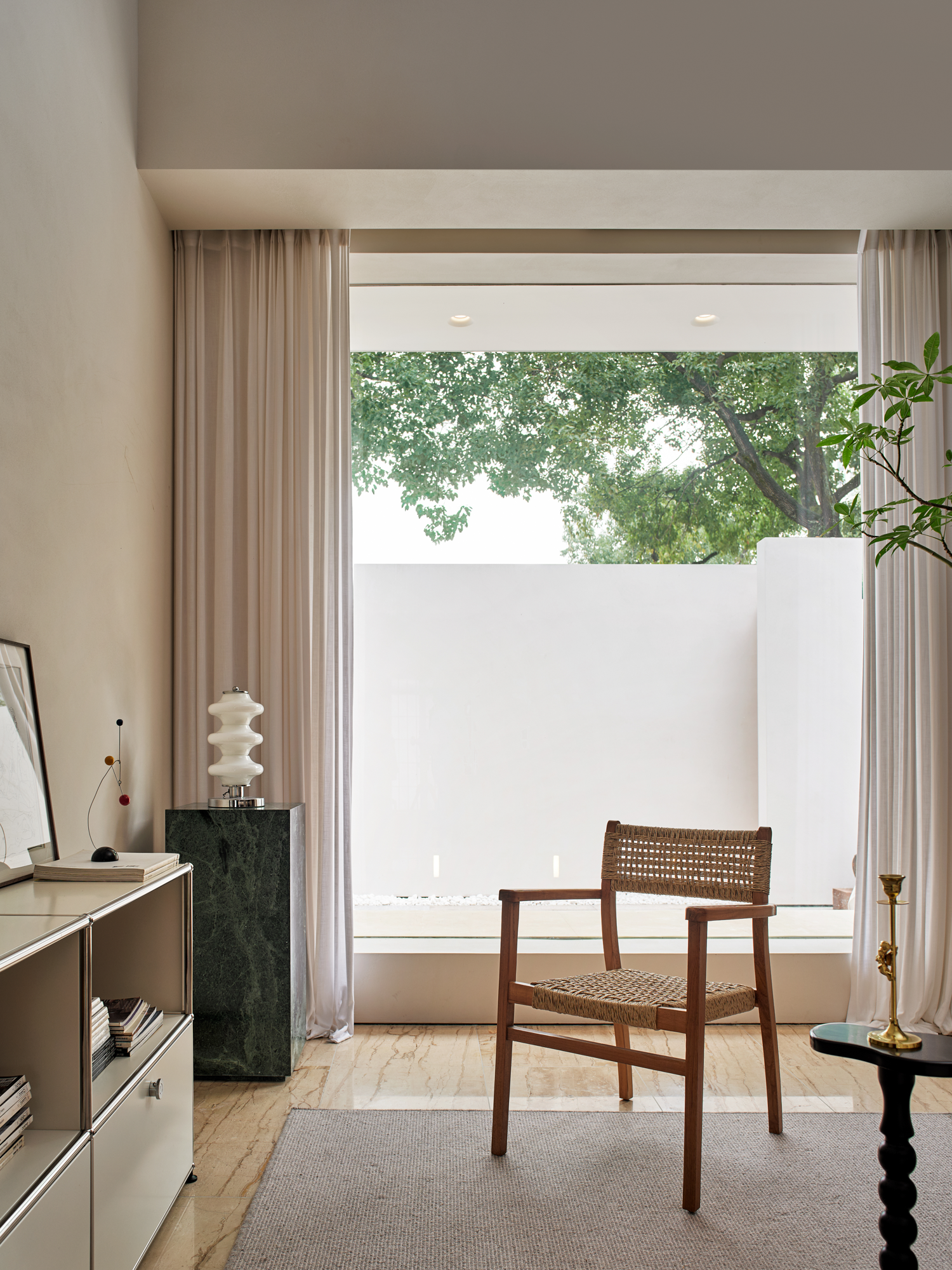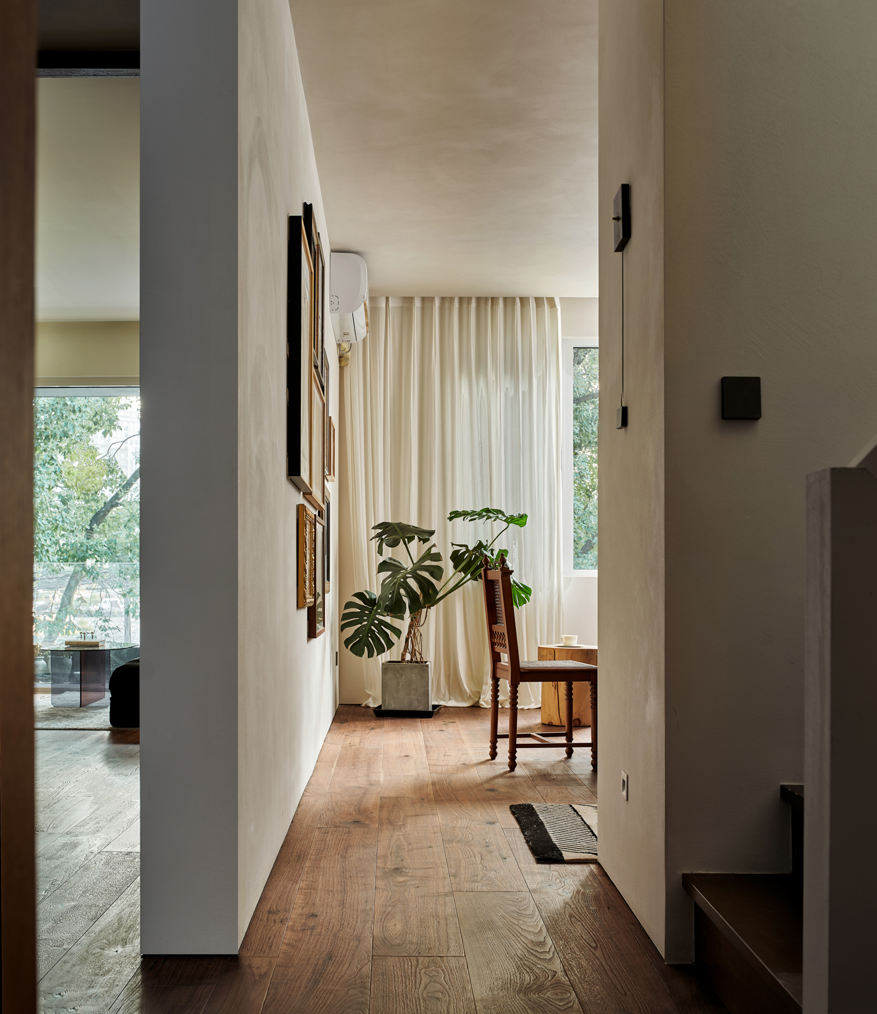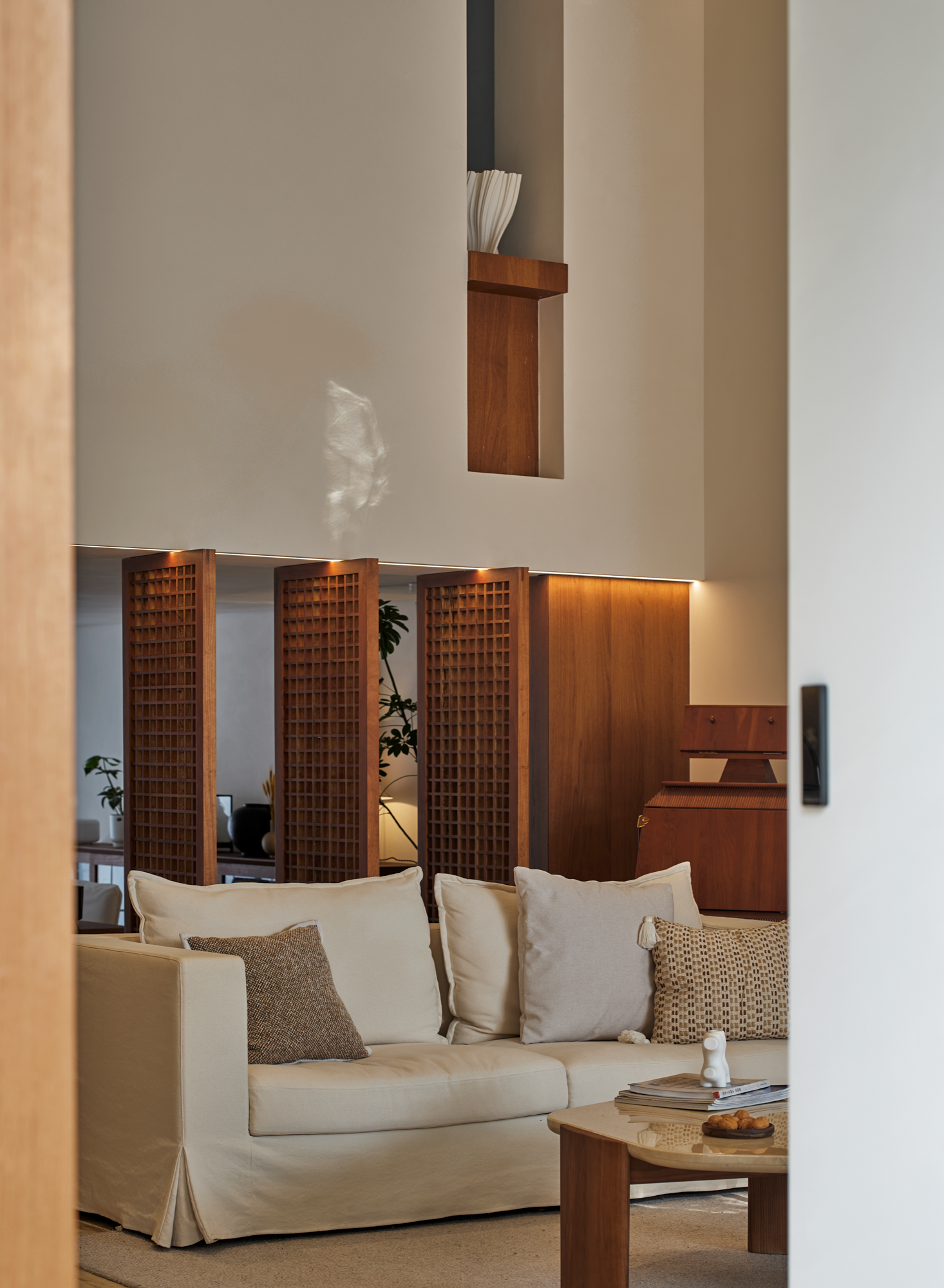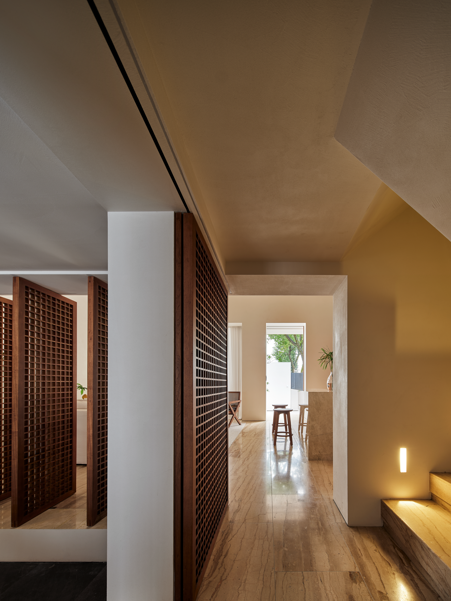 空间意境:本案的结构相对特殊且无法拆改的前提下,我们只能通过色彩、动线以及光线的处理去用力。从户外经过小门进入花园,到达一层的接待空间,从一层向下延伸为下沉式的品茗空间,我们在隔断上采用了镂空的格栅,无会客需求时可以完全敞开形成连贯宽敞的空间结构,在使用的时候也同样可以带来相对私密的状态,且不影响光线的摄入。