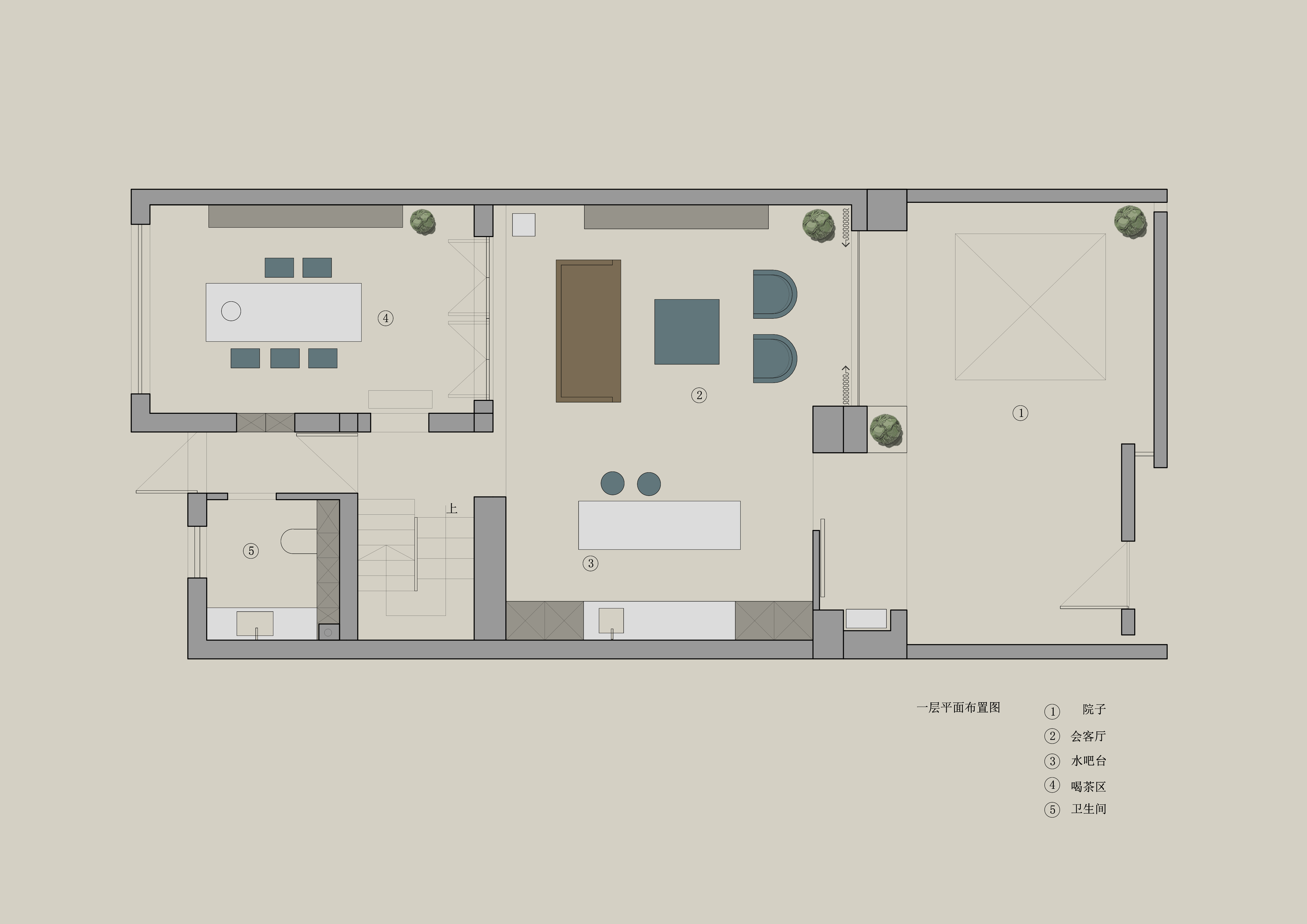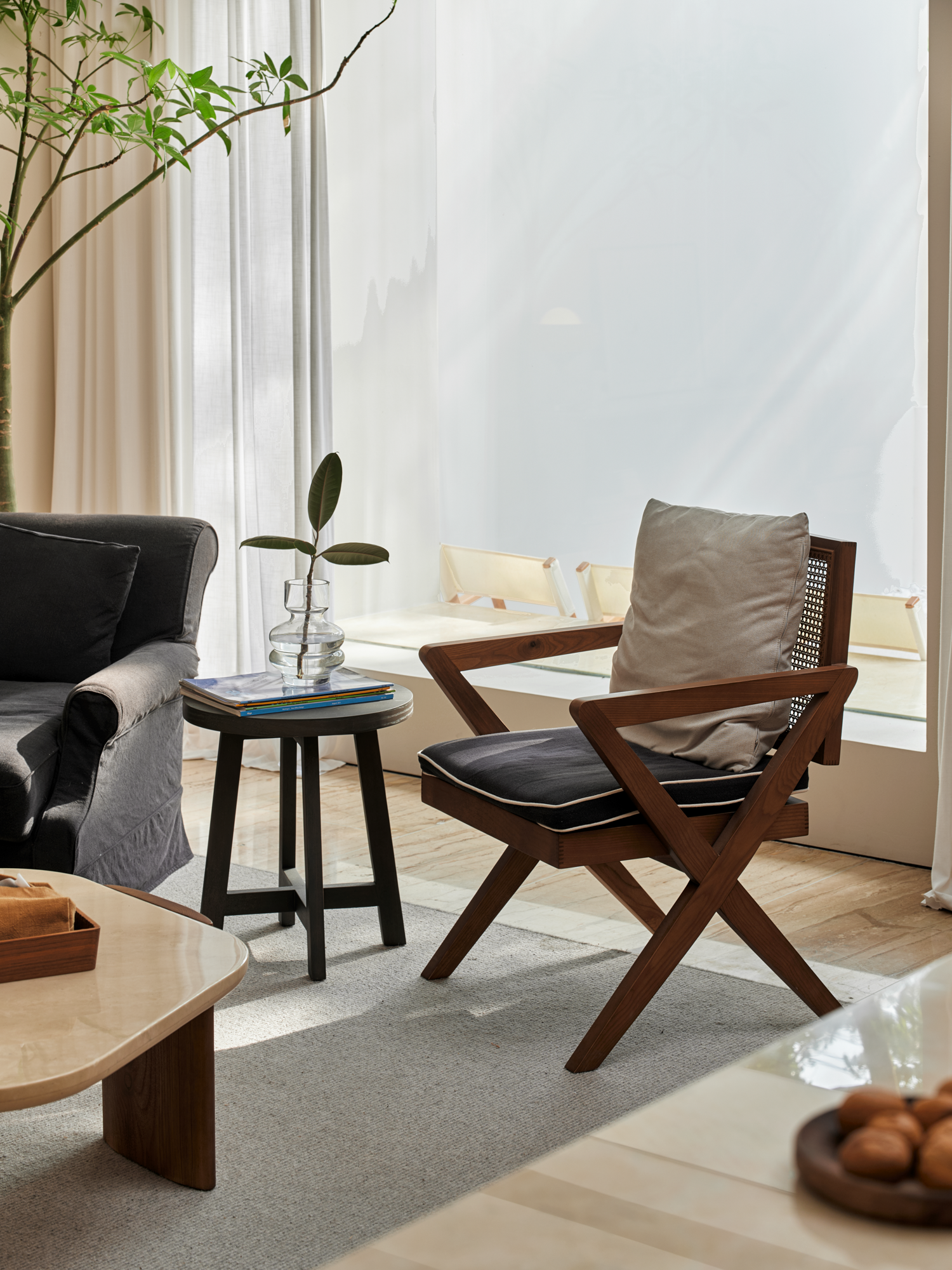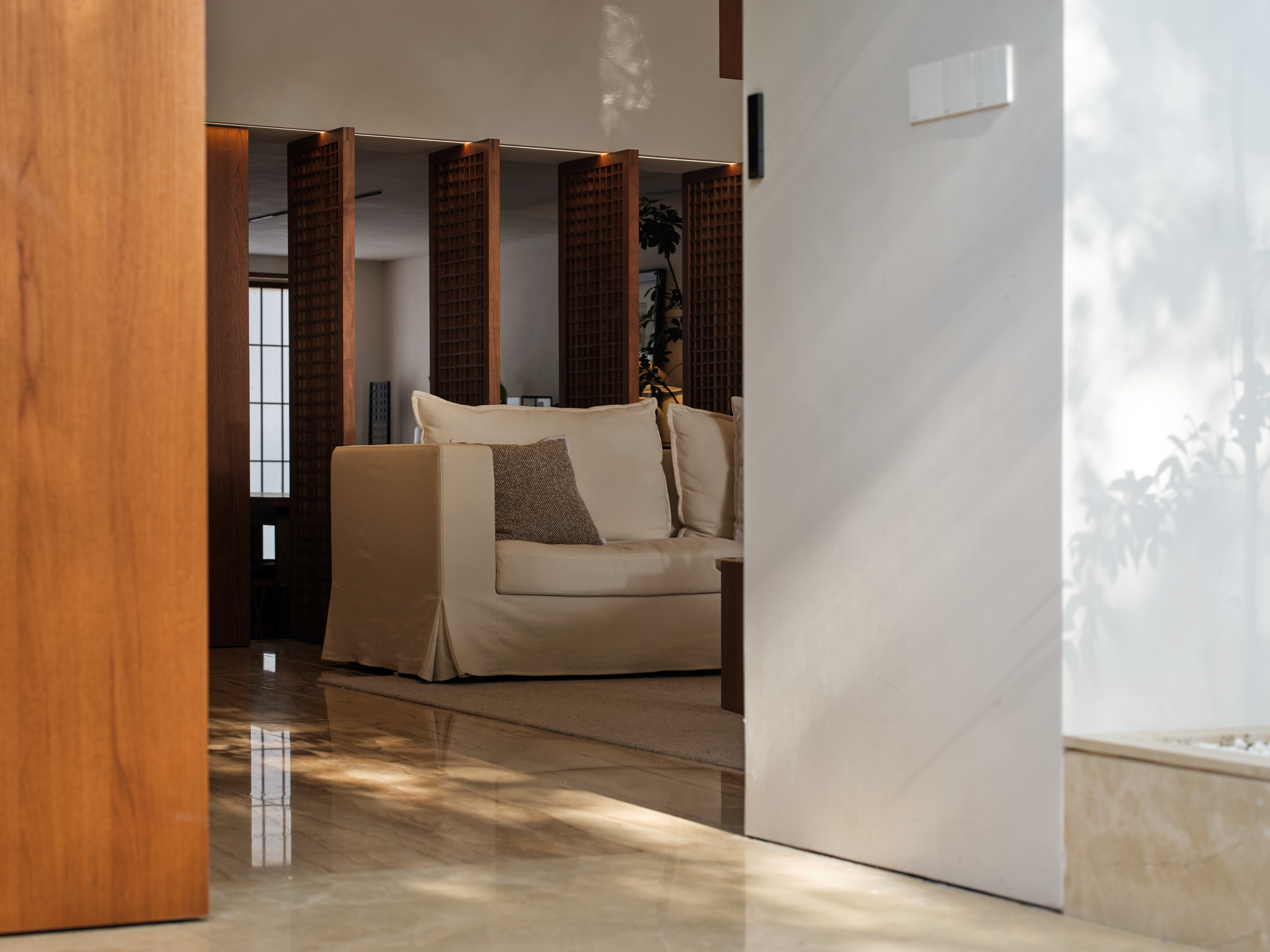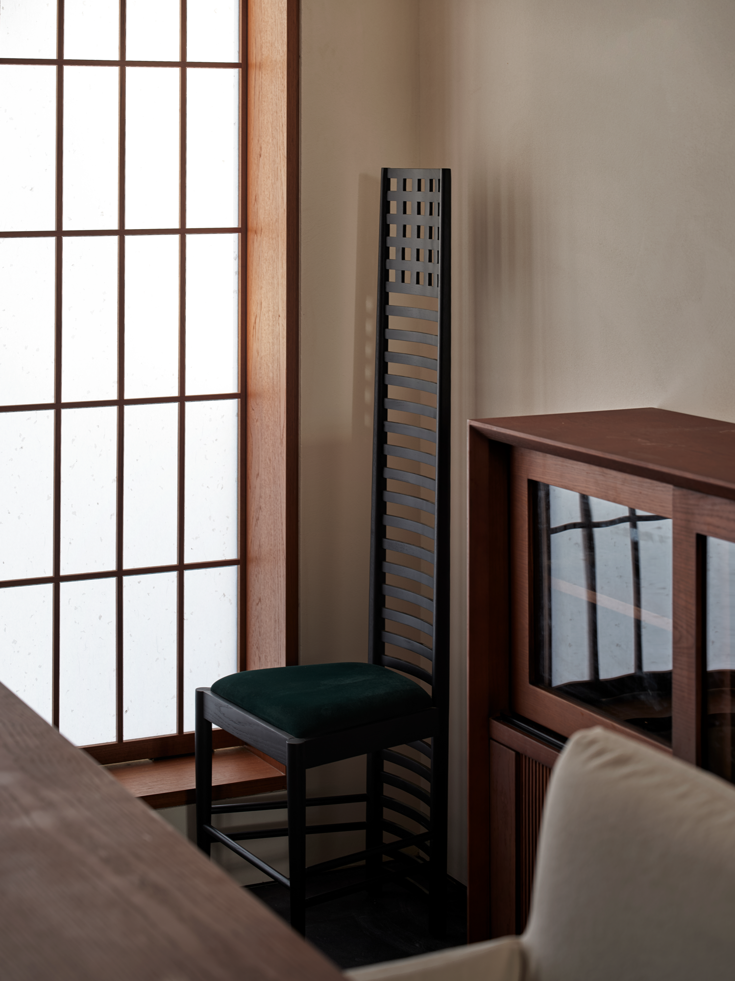 空间意境:本案的结构相对特殊且无法拆改的前提下,我们只能通过色彩、动线以及光线的处理去用力。从户外经过小门进入花园,到达一层的接待空间,从一层向下延伸为下沉式的品茗空间,我们在隔断上采用了镂空的格栅,无会客需求时可以完全敞开形成连贯宽敞的空间结构,在使用的时候也同样可以带来相对私密的状态,且不影响光线的摄入。