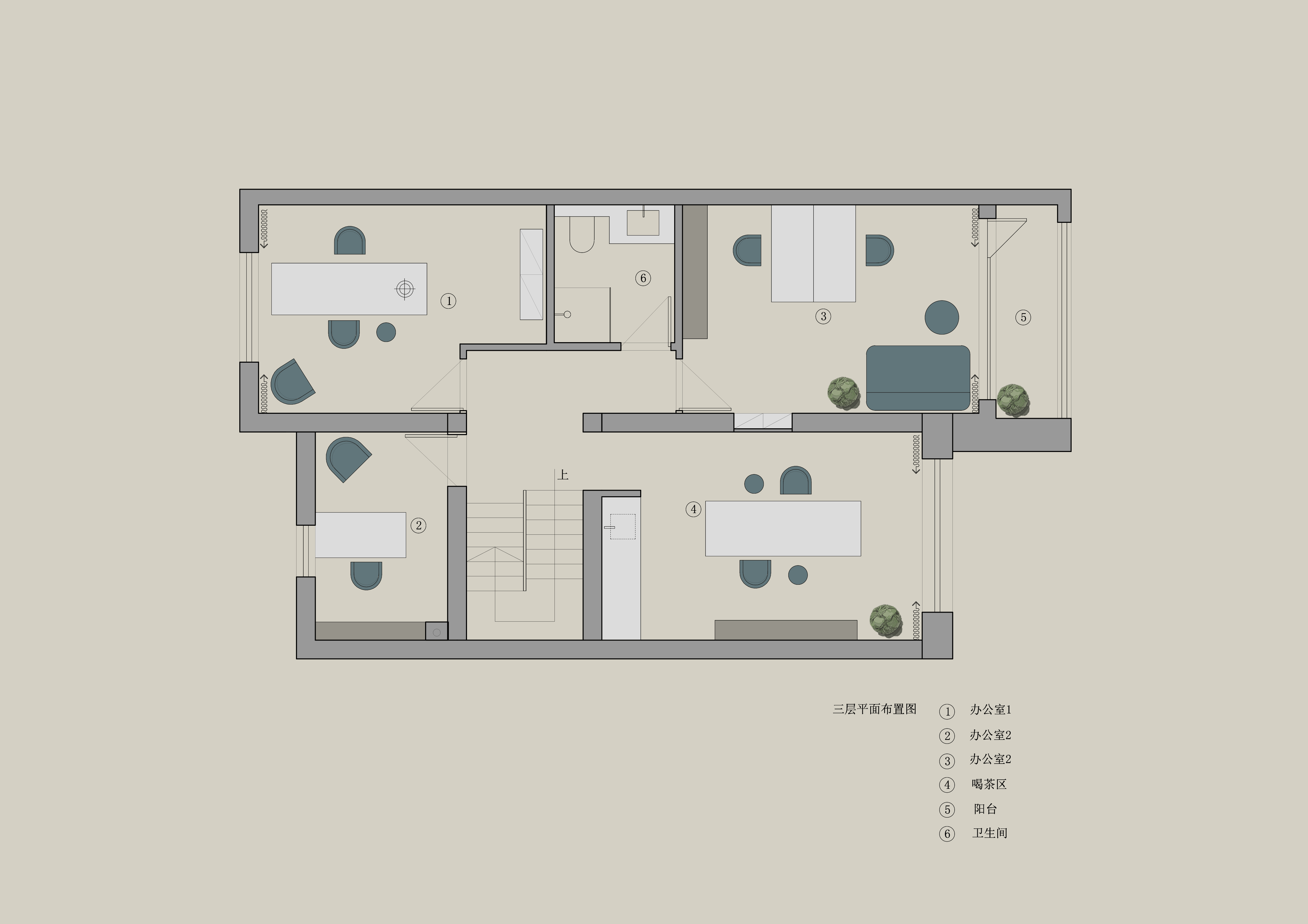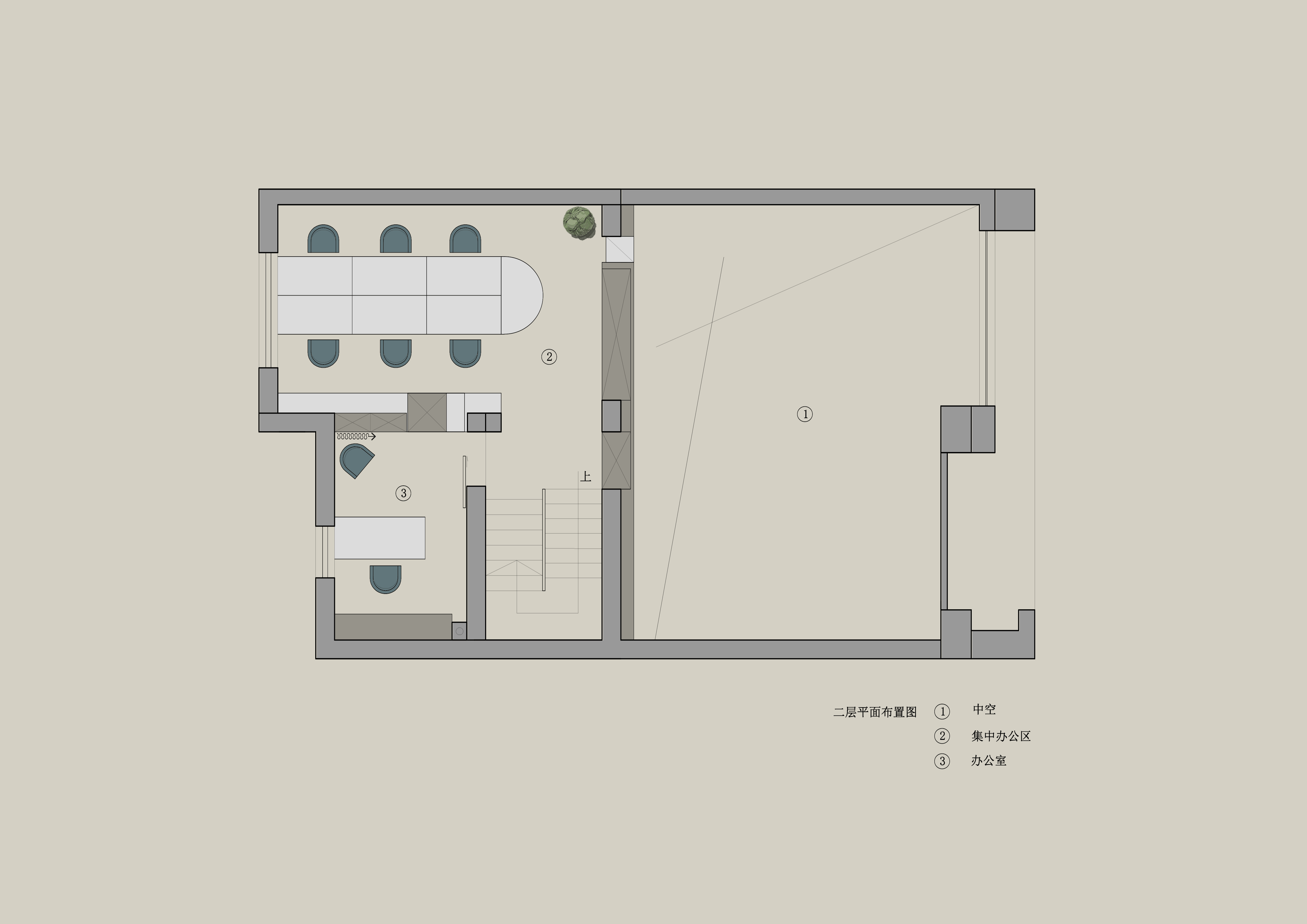 空间布局:向上半层为集体的办公空间,再往上,是三个相对独立的办公区与露台。对于空间整体方向的把握,我们希望通过大面积的窗引入自然阳光,通过软装配饰达到空间和谐闲适的氛围感,传递我们自身的价值观与审美趋向,同时化解办公空间的沉闷无聊