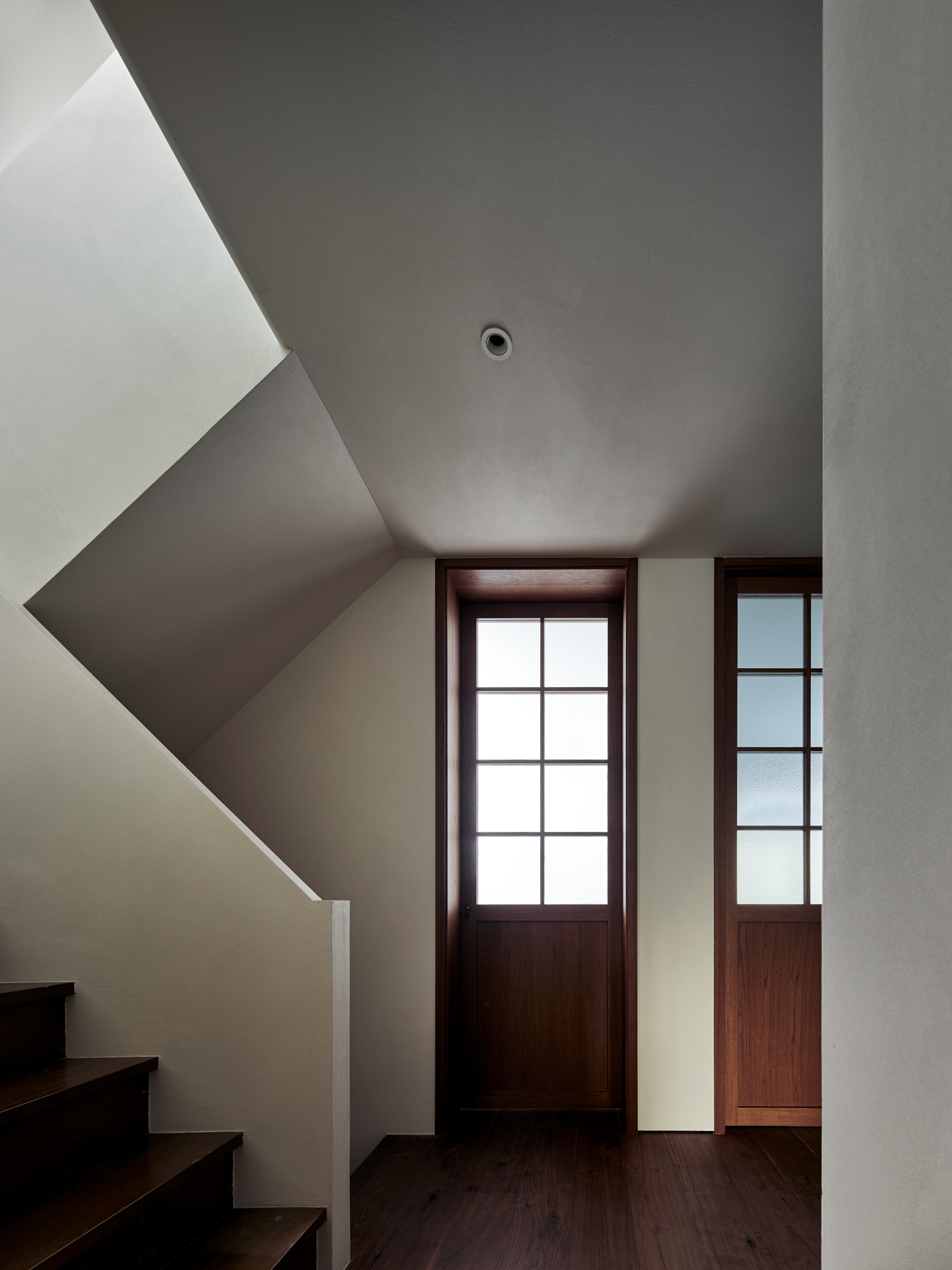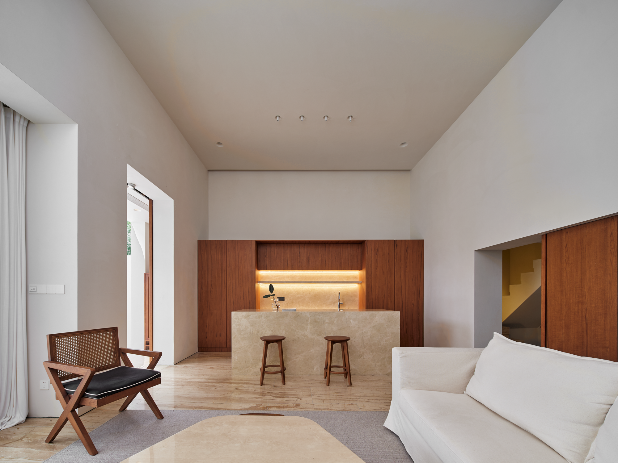 项目定位:项目位于老旧居民区,由老式独栋跃层改建而来,我们选择这块场地作为新的办公空间,由于项目本身非常老旧,但内部的梁柱结构无法拆改,所以我们在保留与重建中衡量取舍,最终呈现为一个拥有先锋几何外观的“沉积之所”,内里除了原始结构的保留以外,也同样保留了原始的,经历过十几年使用的大理石地面,墙面除细微处的调整以外,也大多保留了原始的状态,只通过表面艺术漆的处理,让其呈现崭新的空间感。