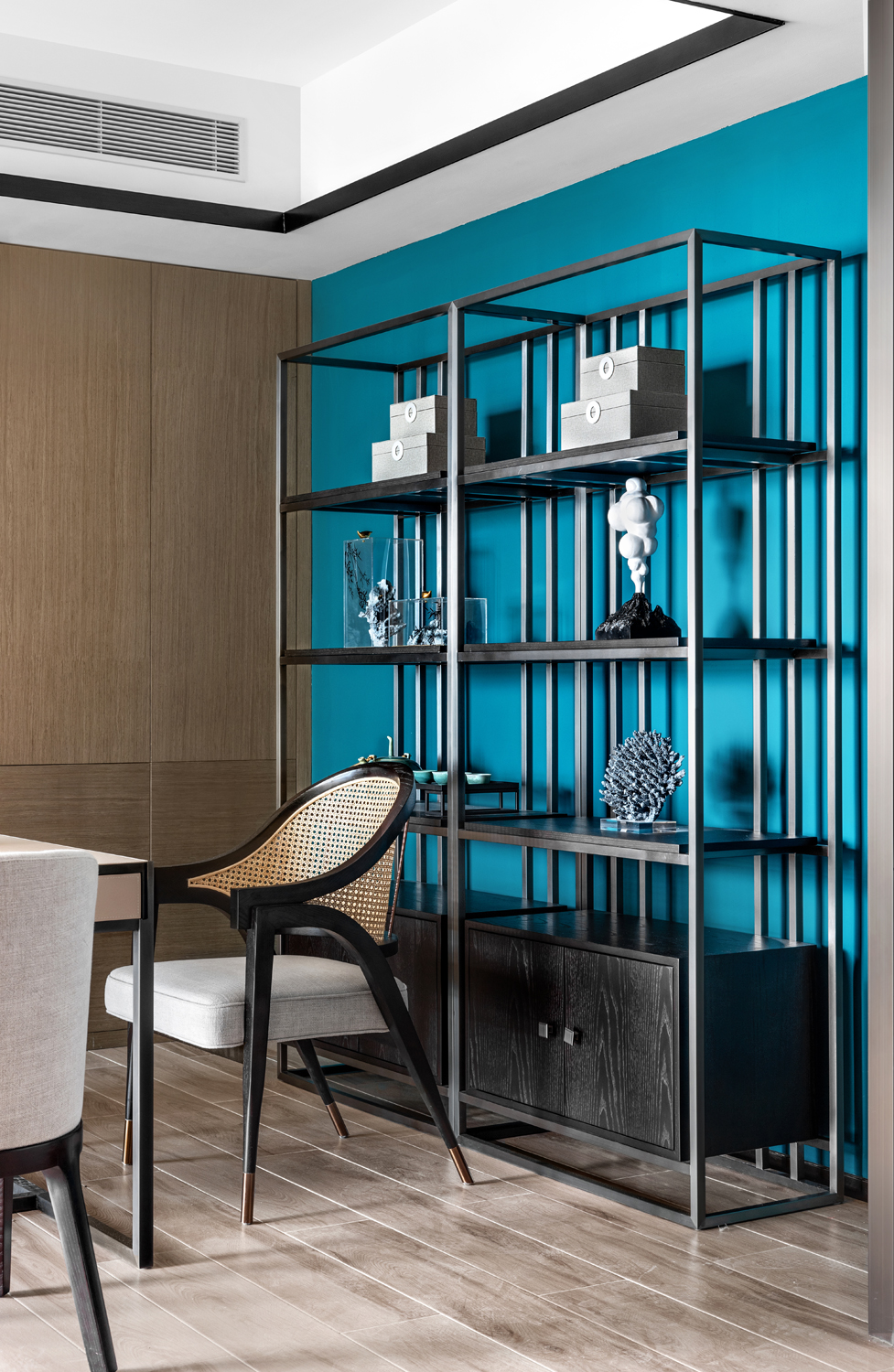 色彩与材料的精心搭配:以蓝色、白色为主色调,体现大海的纯净和宁静,同时在局部区域适当加入绿色植物和暖色调装饰元素,增加空间的活力和温馨感。在材料选择上,注重环保、耐用性,选用天然石材、木材、玻璃等材料,共享商务展示区设于酒店地下一层,集展示、销售公寓及共享茶歇功能于一体。面对建筑地形的限制,我们通过在中心天花板安装圆形软膜天花,以及布置绿色植物景观,有效提升了采光与通风。采用装配式建筑技术,我们设计了四个商务洽谈空间,每个空间均享有中央景观的视野,将室内外景观融为一体,减轻了地下空间的压抑感。