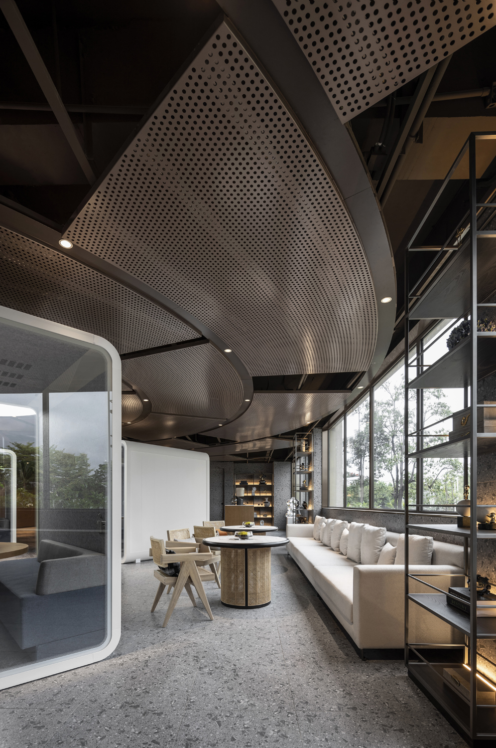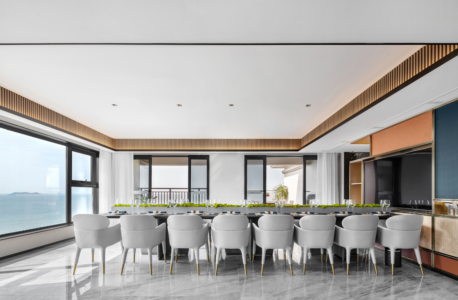 全景式海景引入:通过大面积落地窗和通透玻璃隔断,将海天一色的绝美海景毫无保留地引入室内各个功能区域,使办公、接待等活动与大海景观紧密相连,让使用者仿佛置身于自然之中,打破了传统办公空间与自然的隔离。