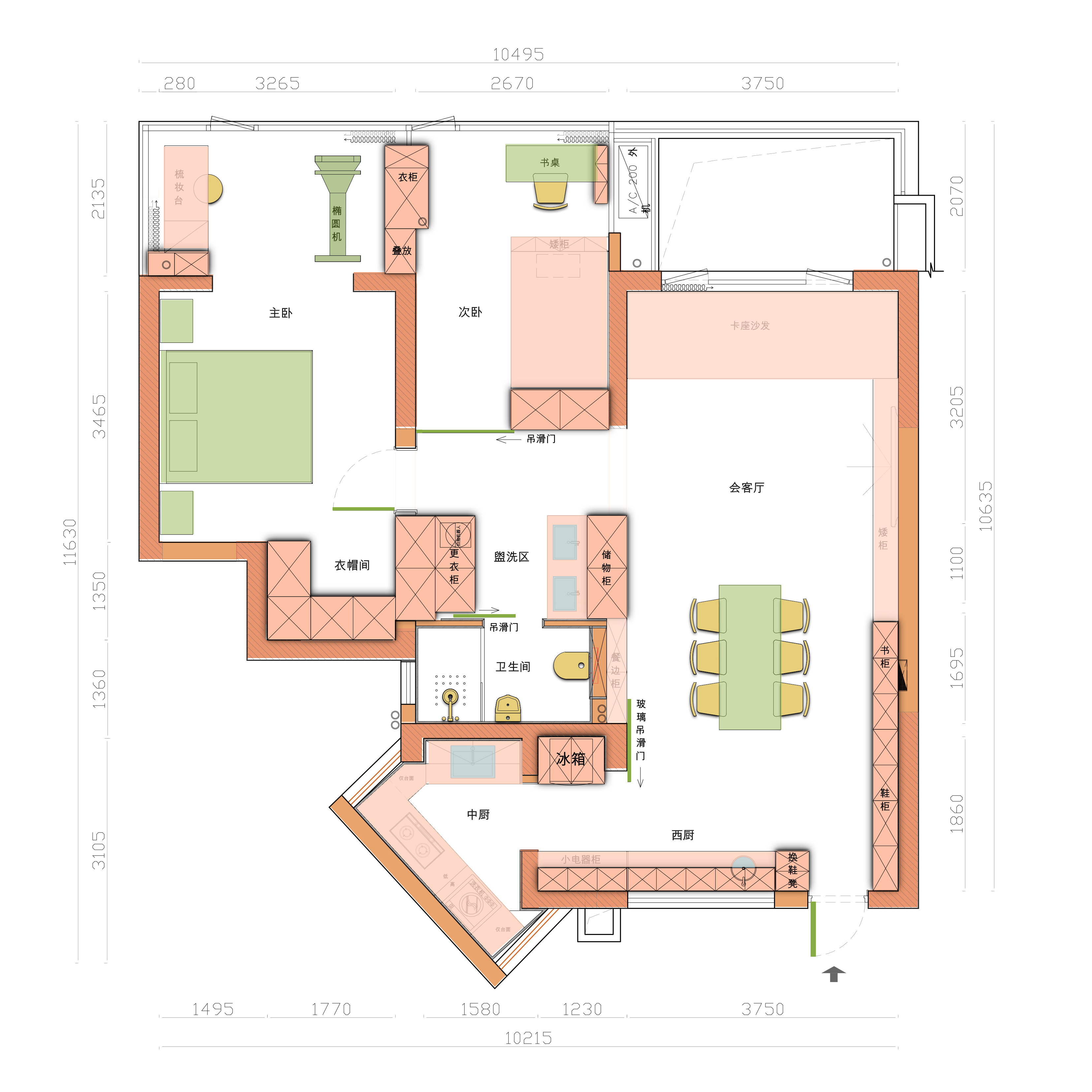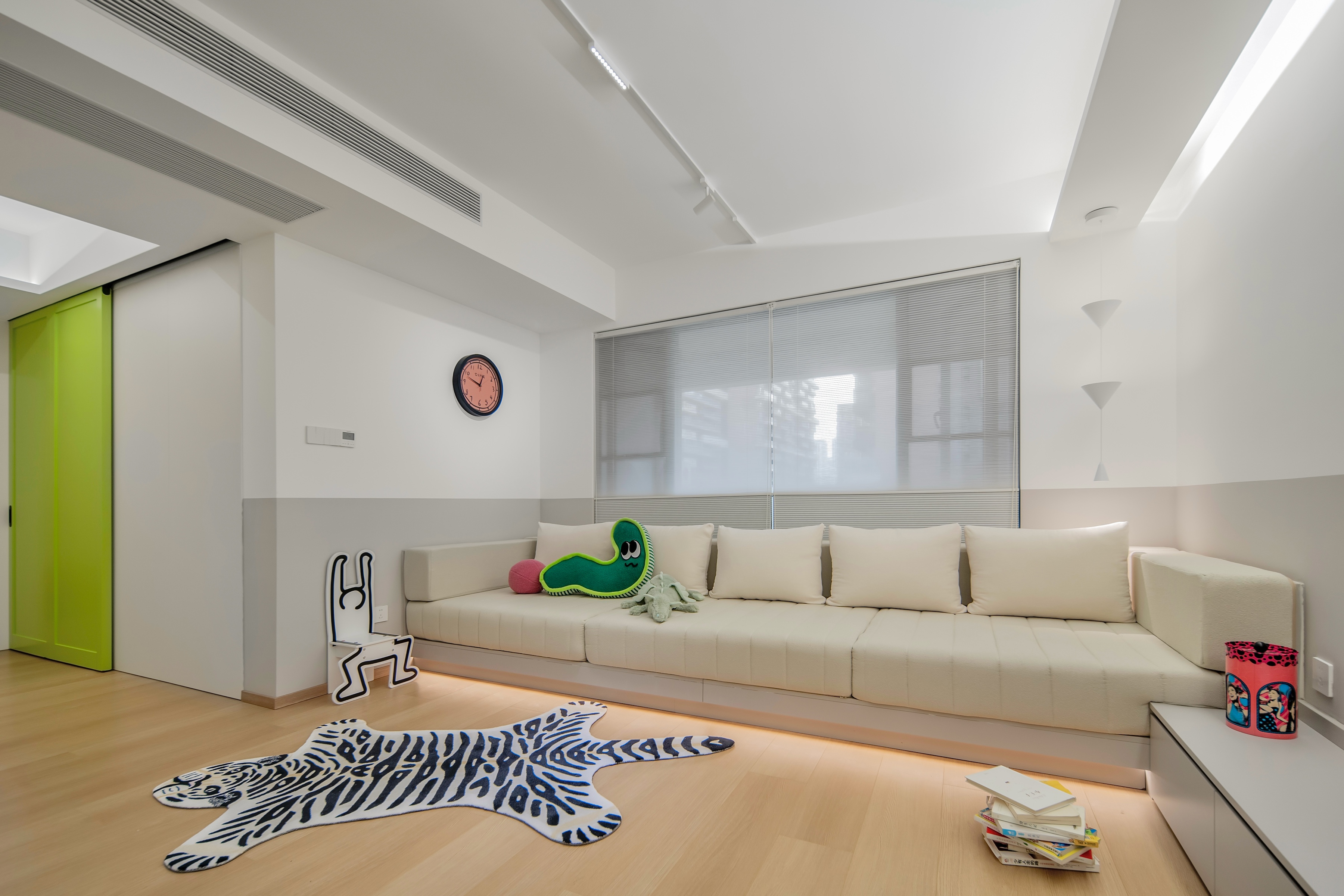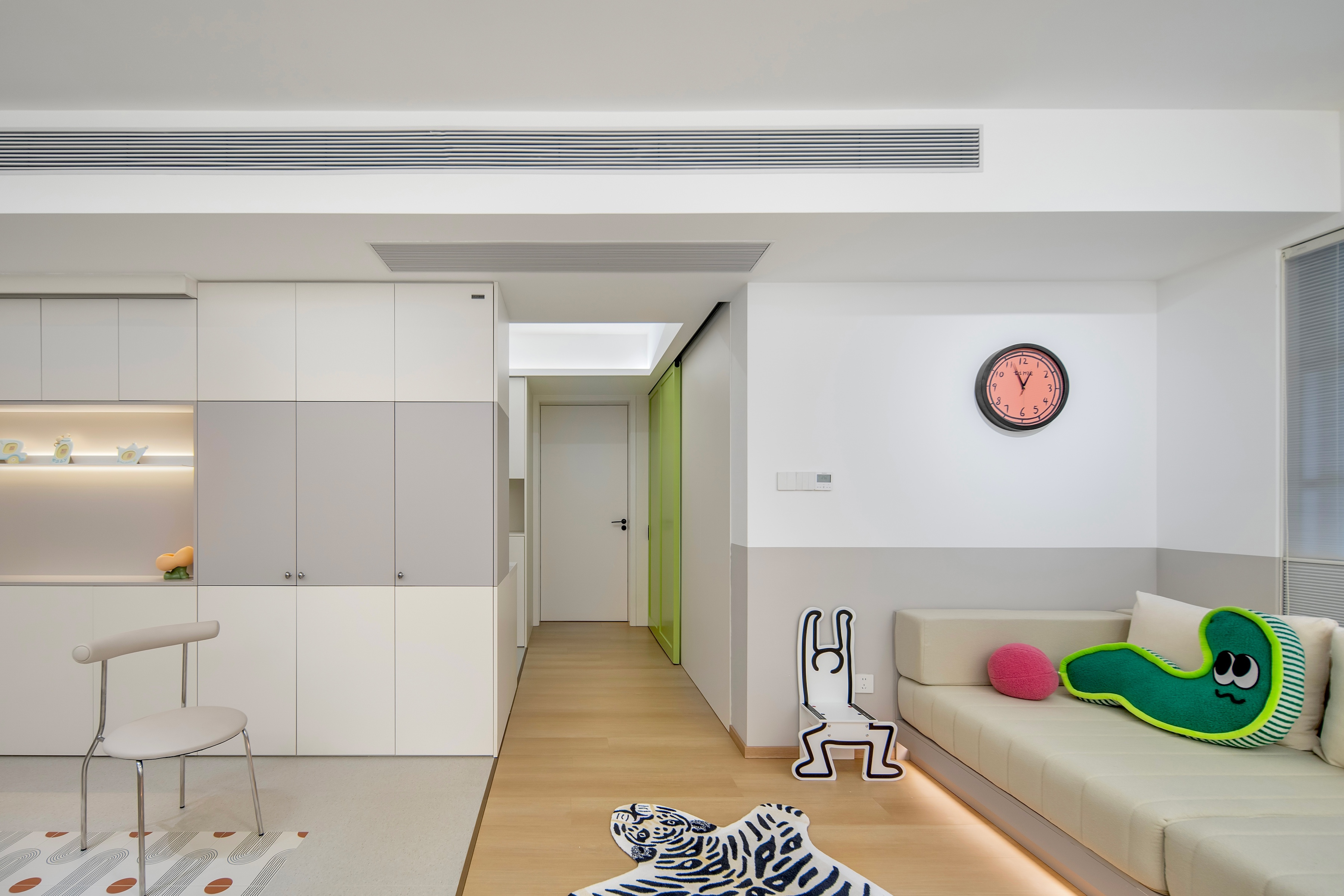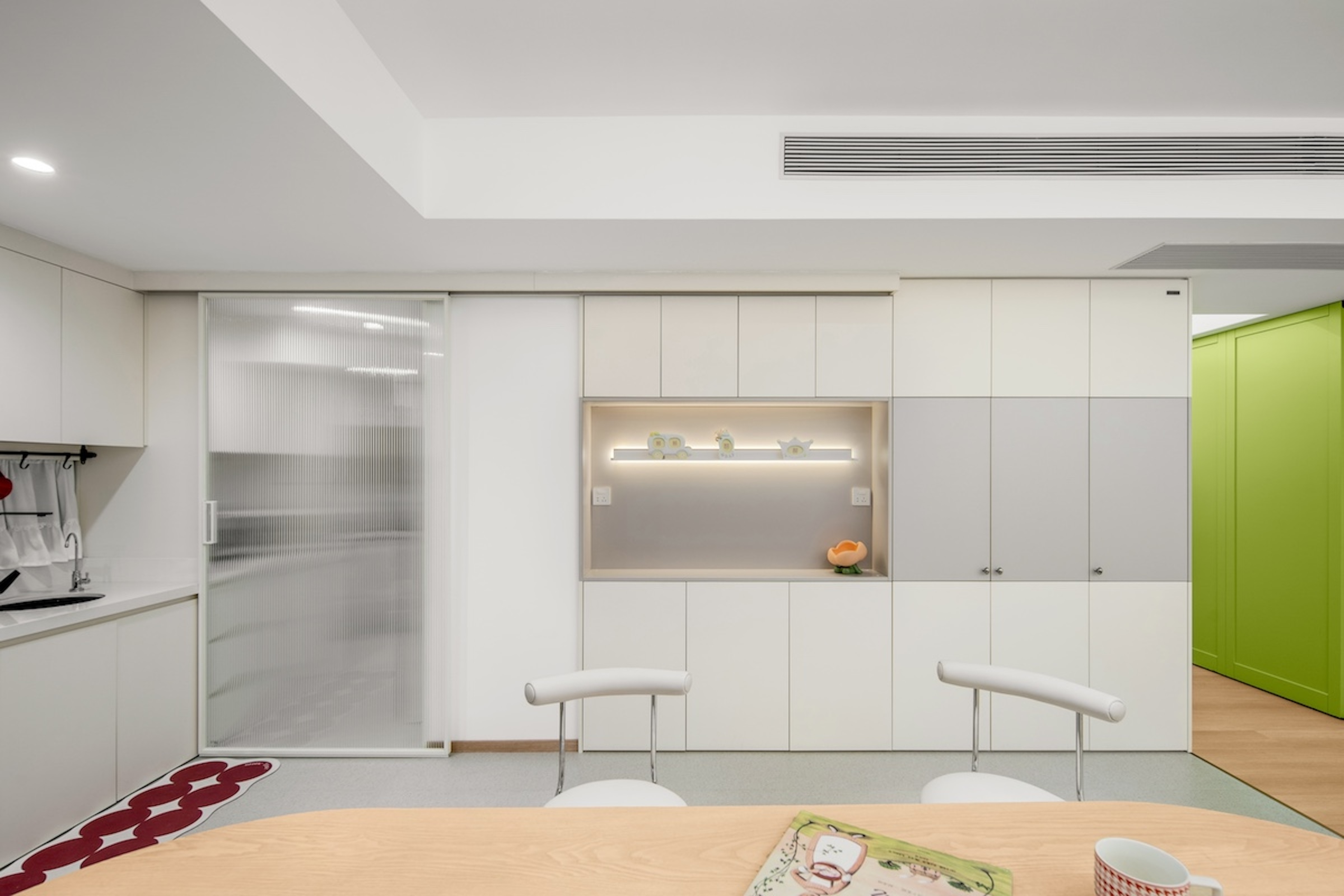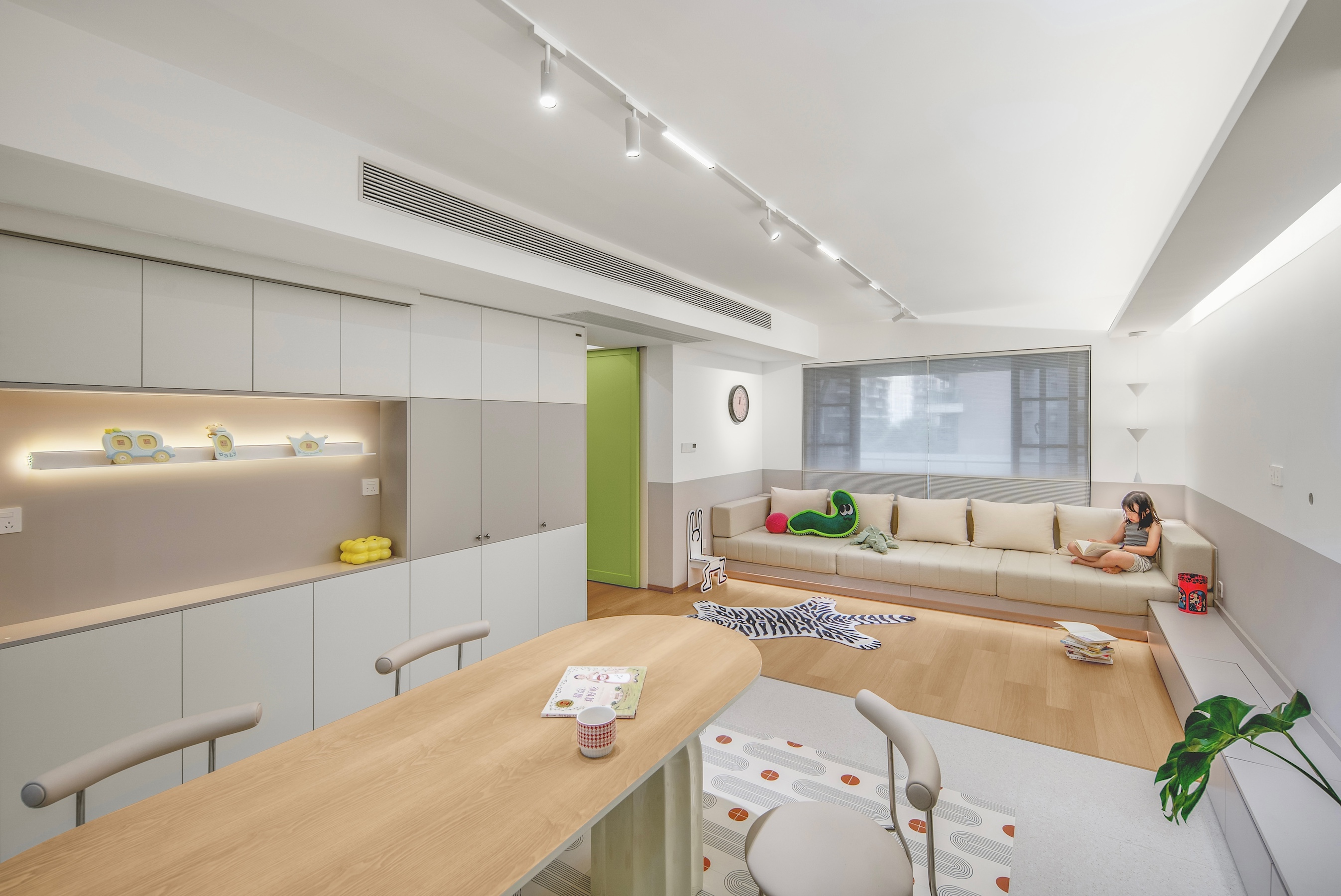 空间结构是基于热情好客的鱼儿妈妈的需求,而设定了以核心大餐桌为中岛的餐厅洄游动线;客厅有一排靠窗的定制超深卡座沙发,把家里更大的空间释放出来,让小朋友在有限的空间里获得最自由的活动区域。
