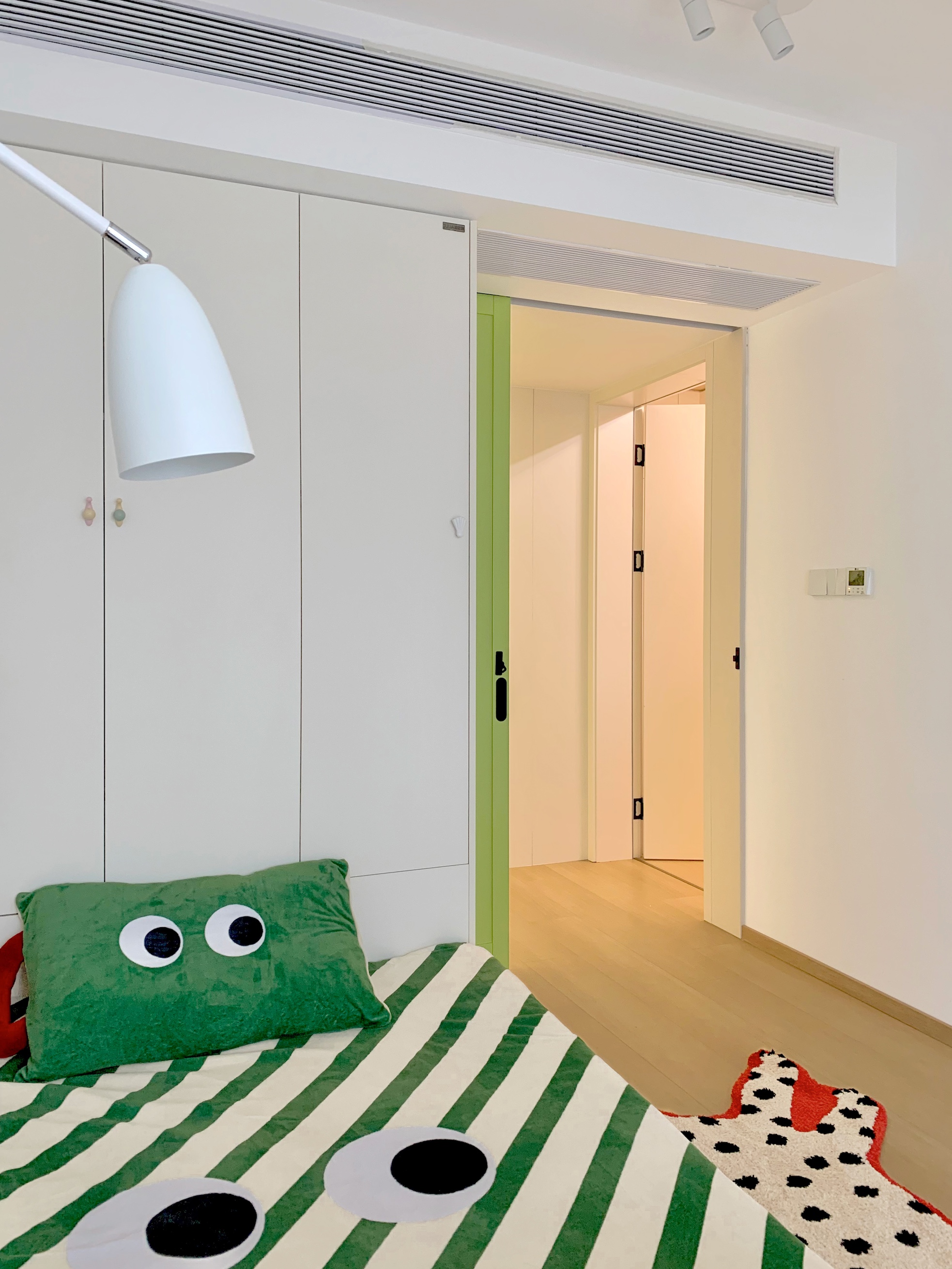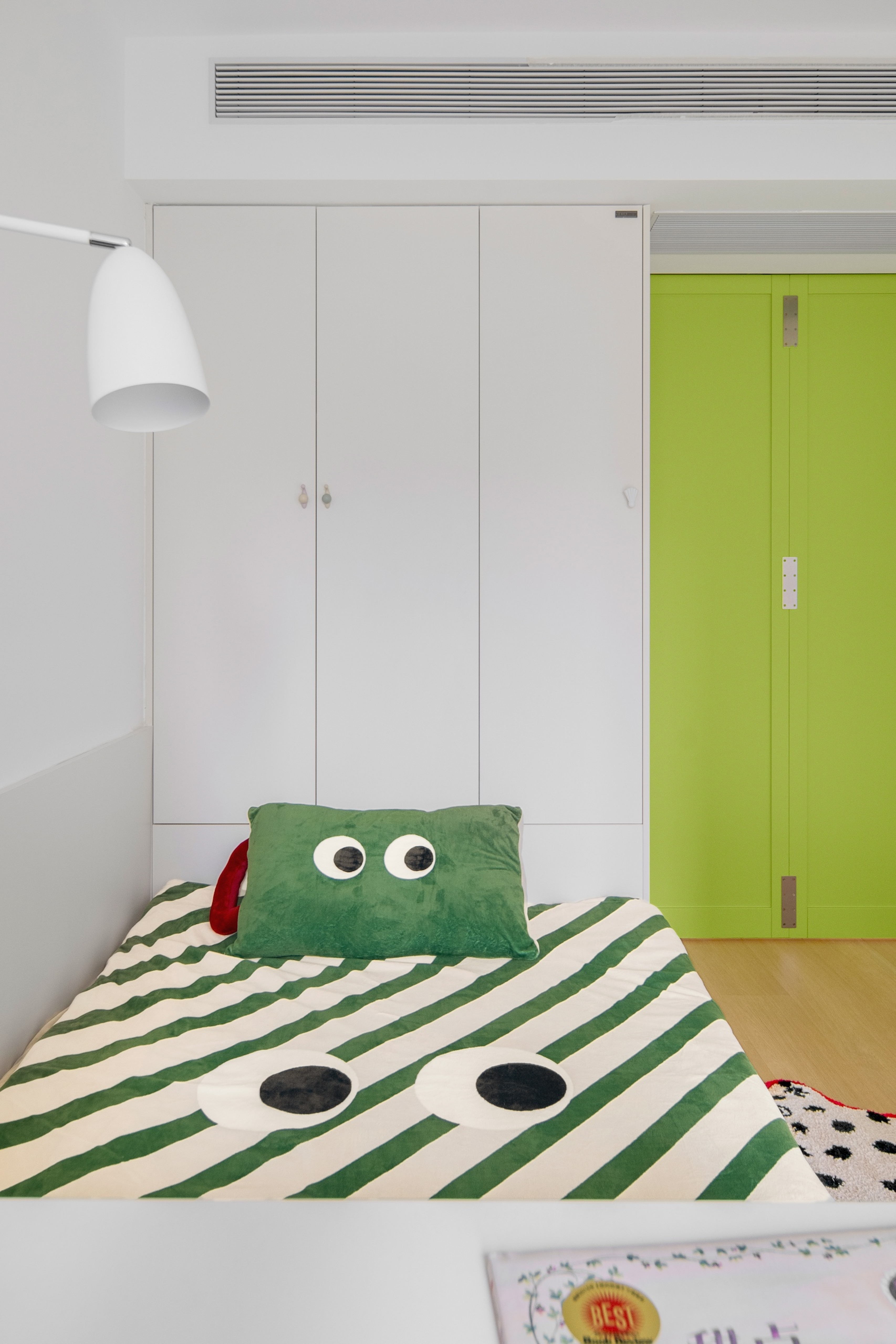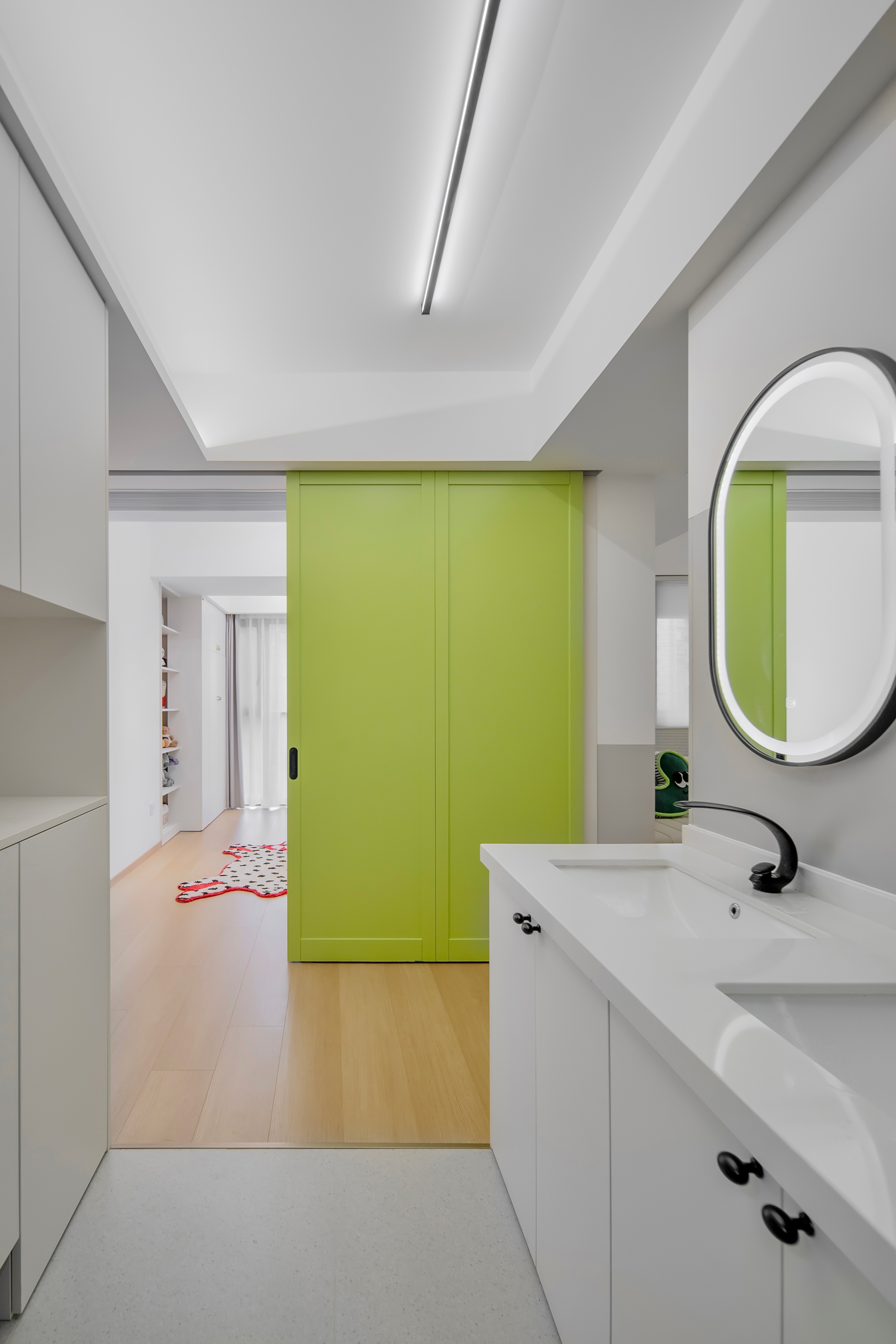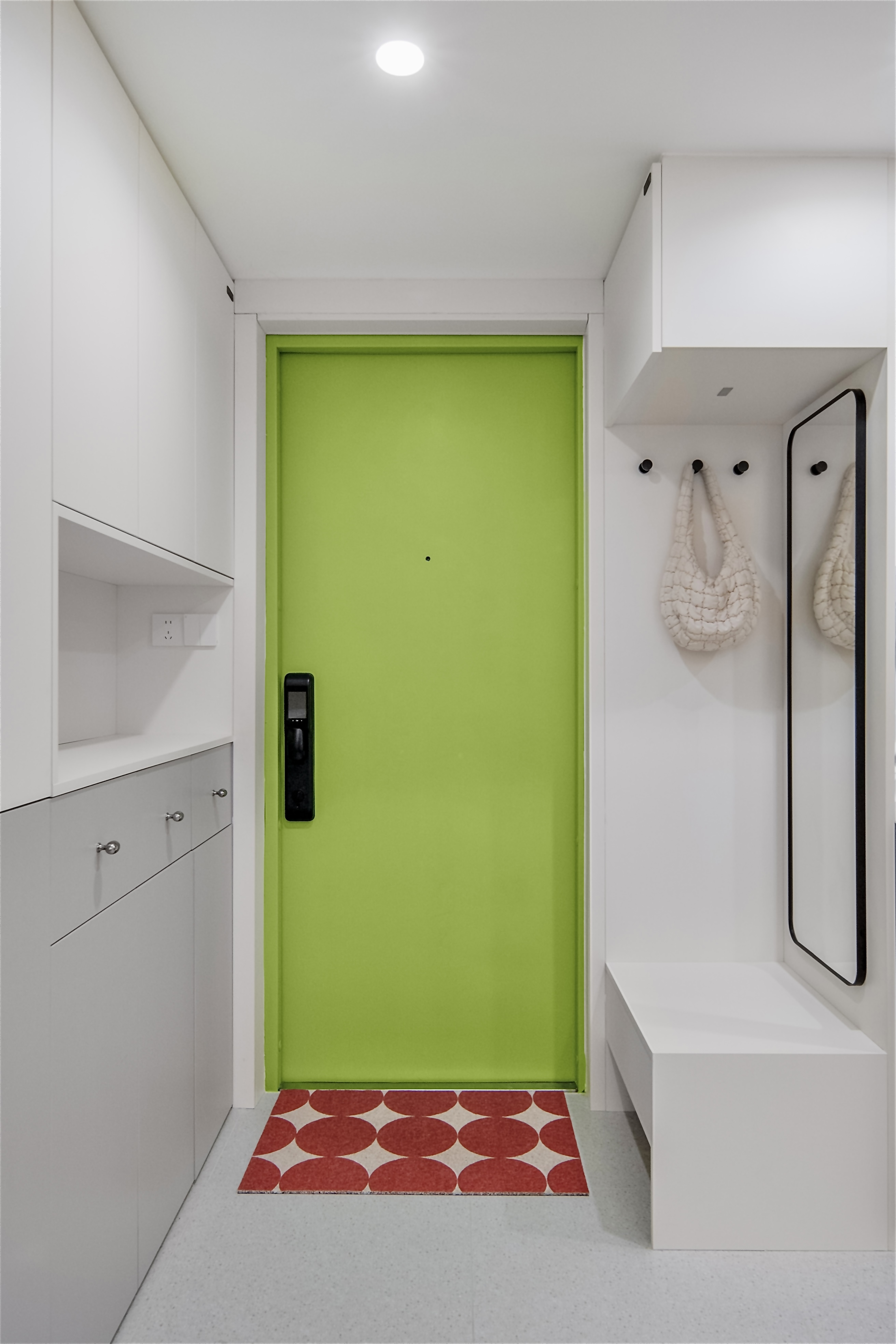 大胆且明亮的苹果绿门扇,是串联起家中每一个空间的主色调;辅以明度各不相同的橘色系墙砖、地砖、乳胶漆、布艺等等,让整个空间充满童趣。