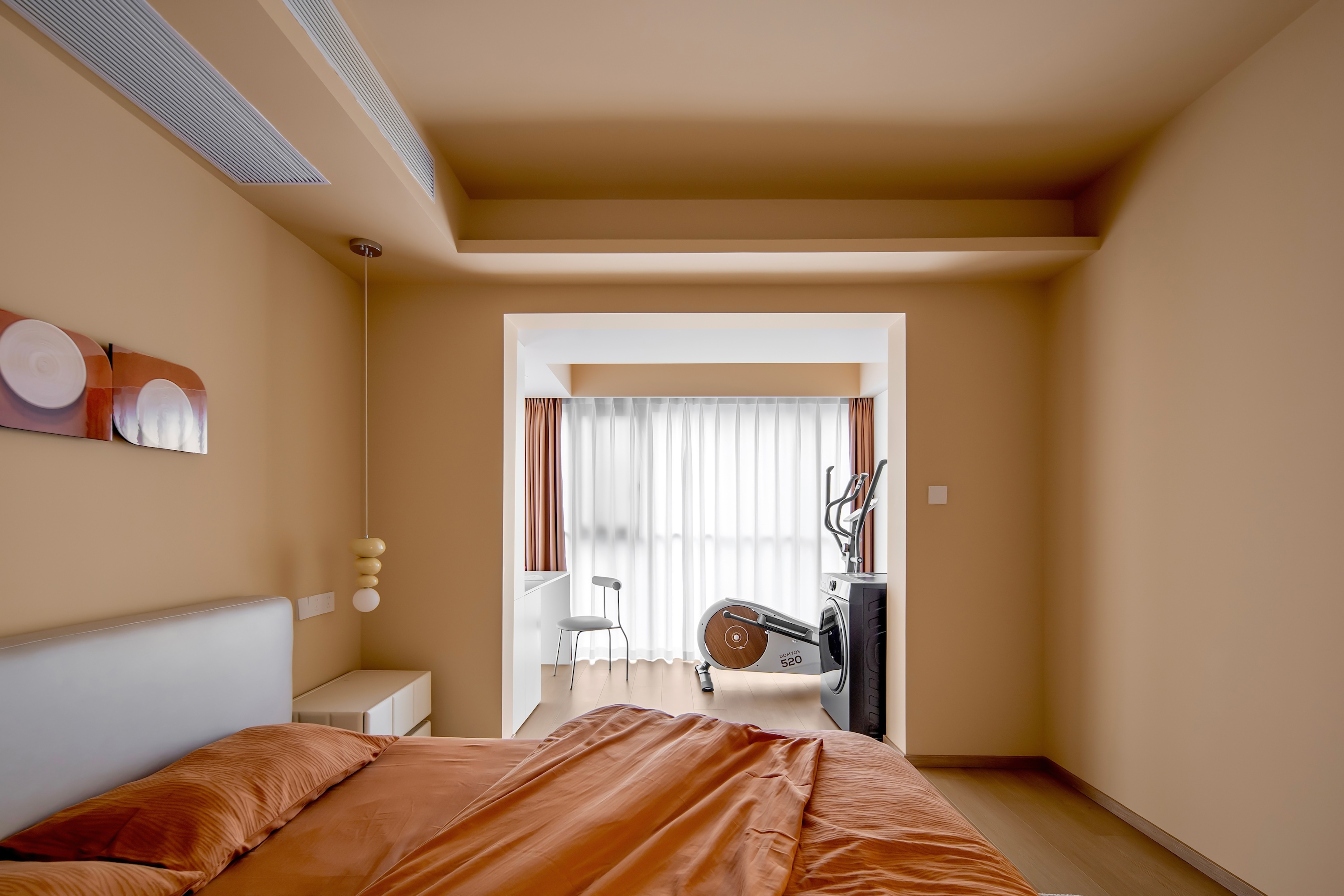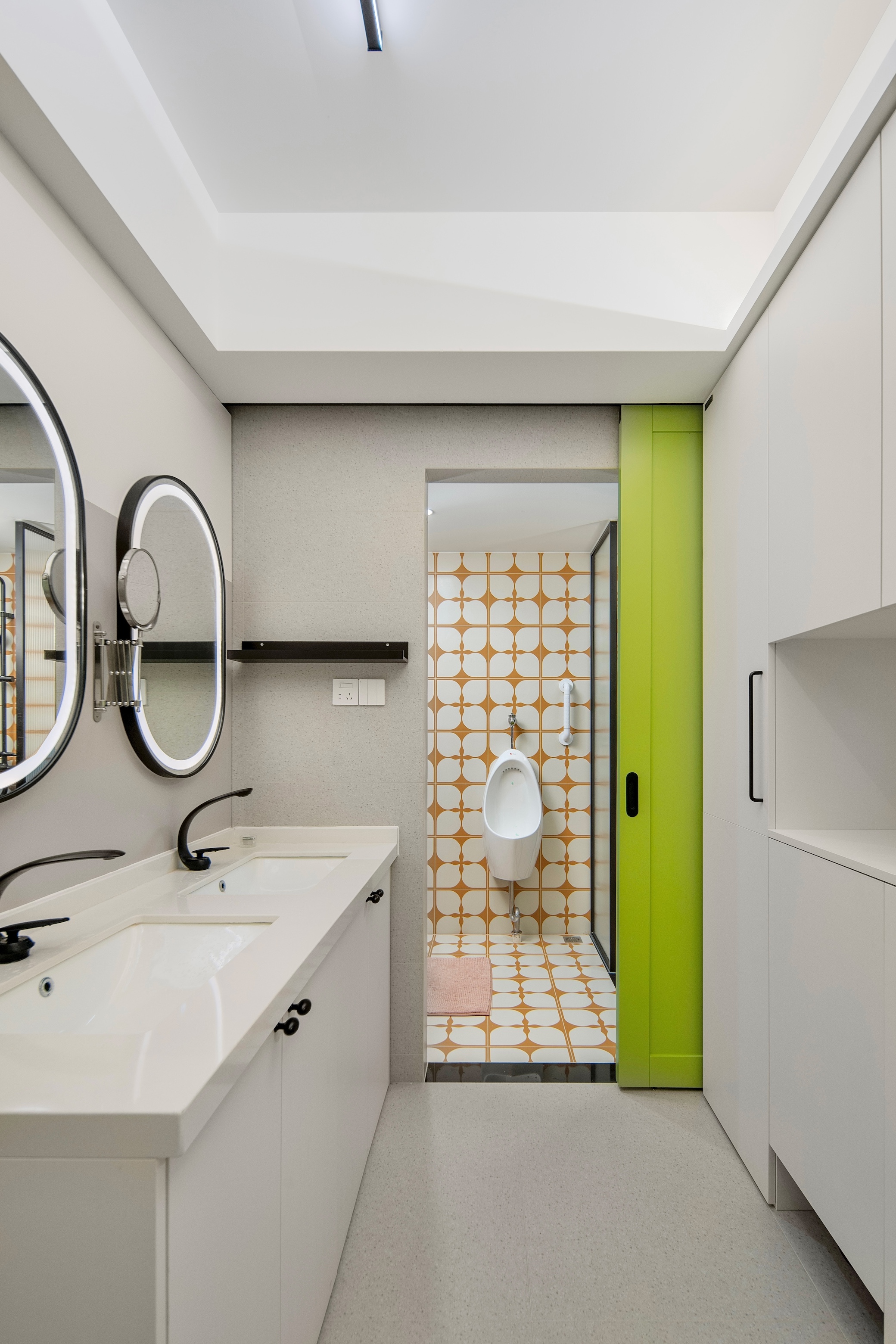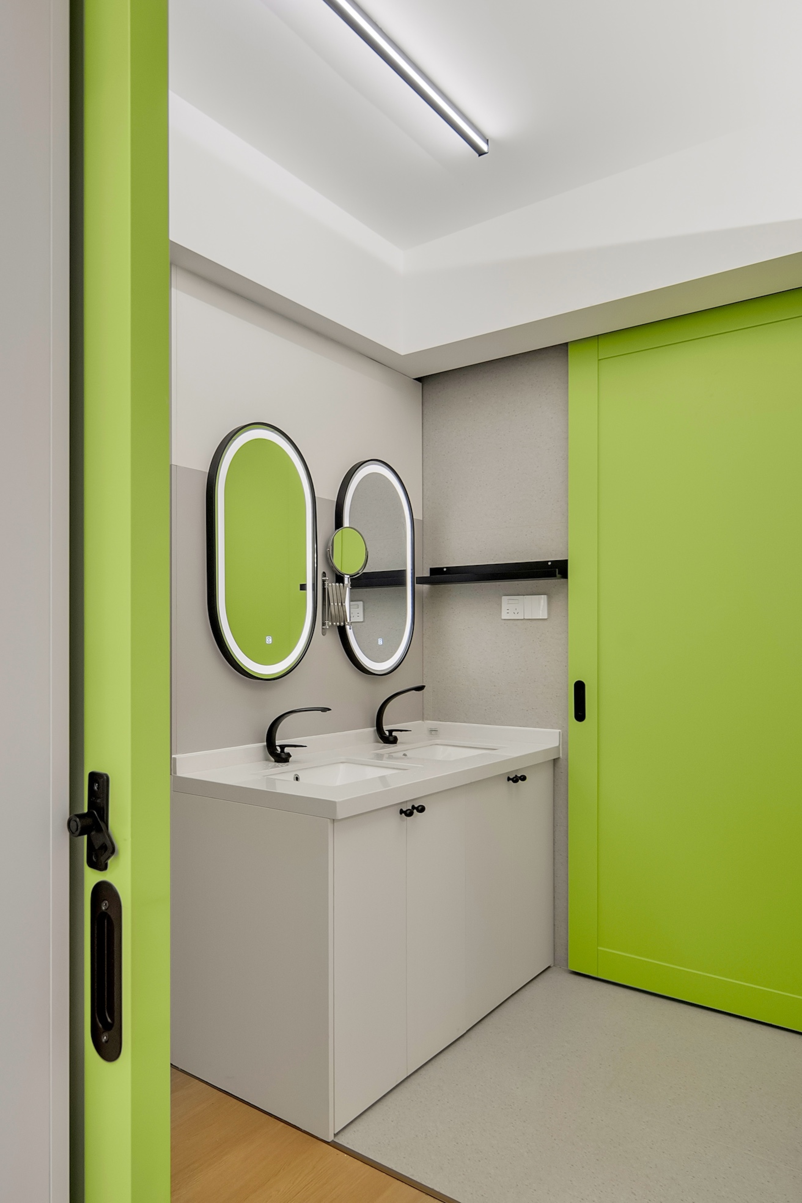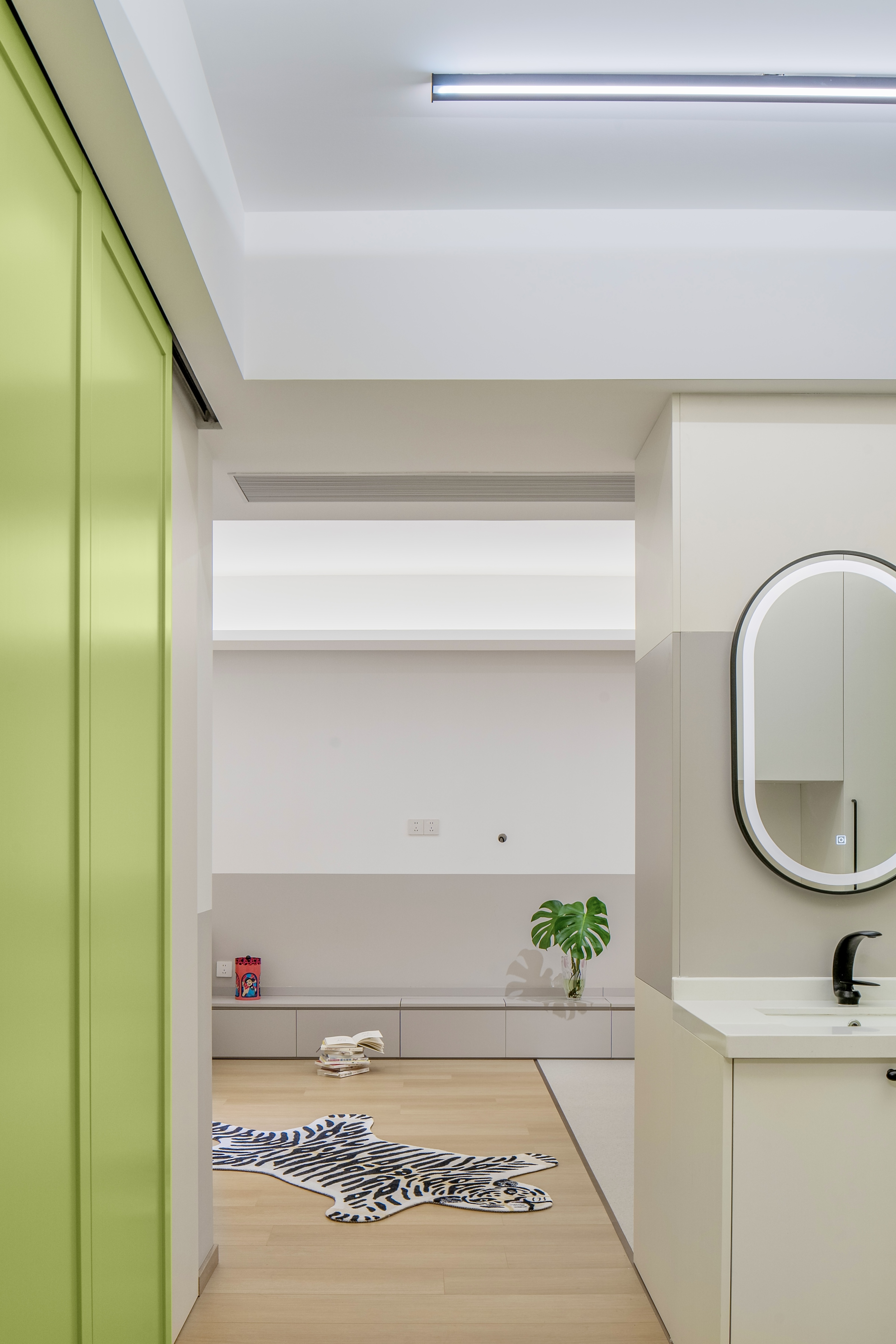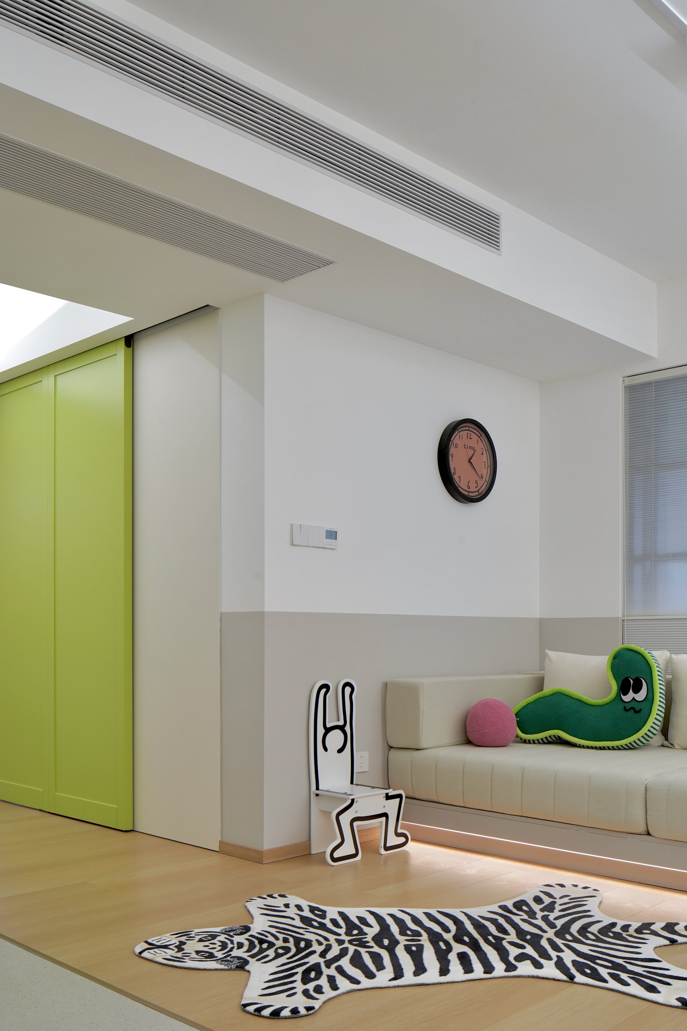 大胆且明亮的苹果绿门扇,是串联起家中每一个空间的主色调;辅以明度各不相同的橘色系墙砖、地砖、乳胶漆、布艺等等,让整个空间充满童趣。