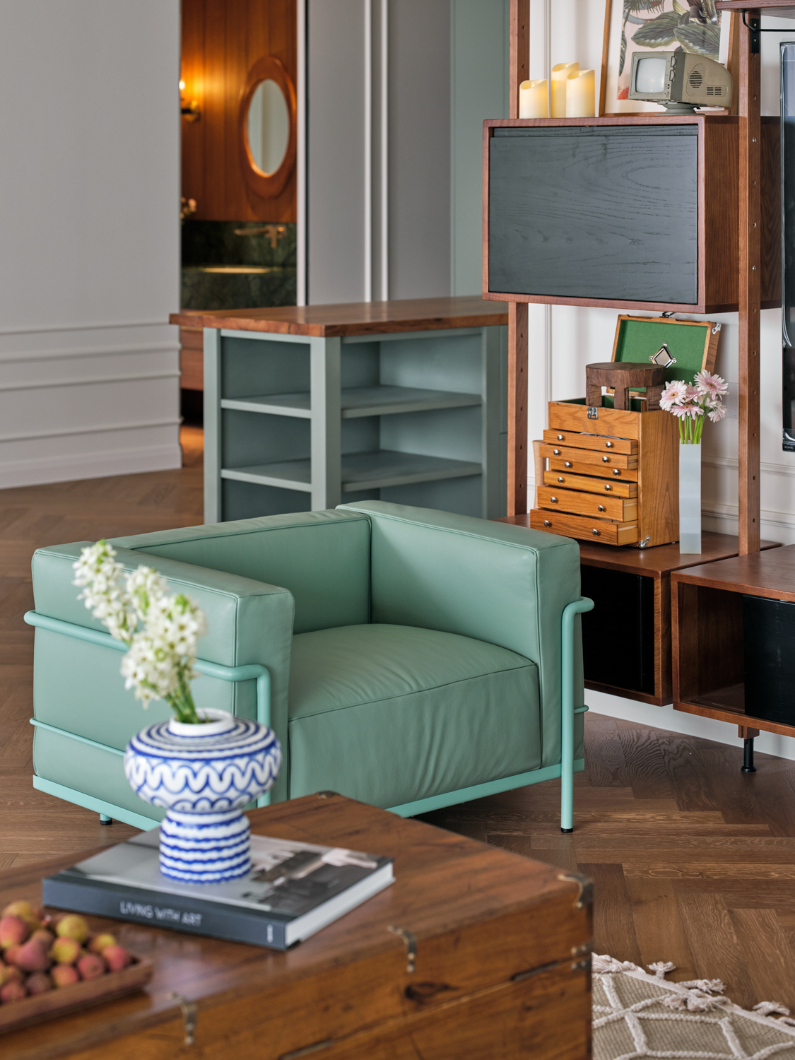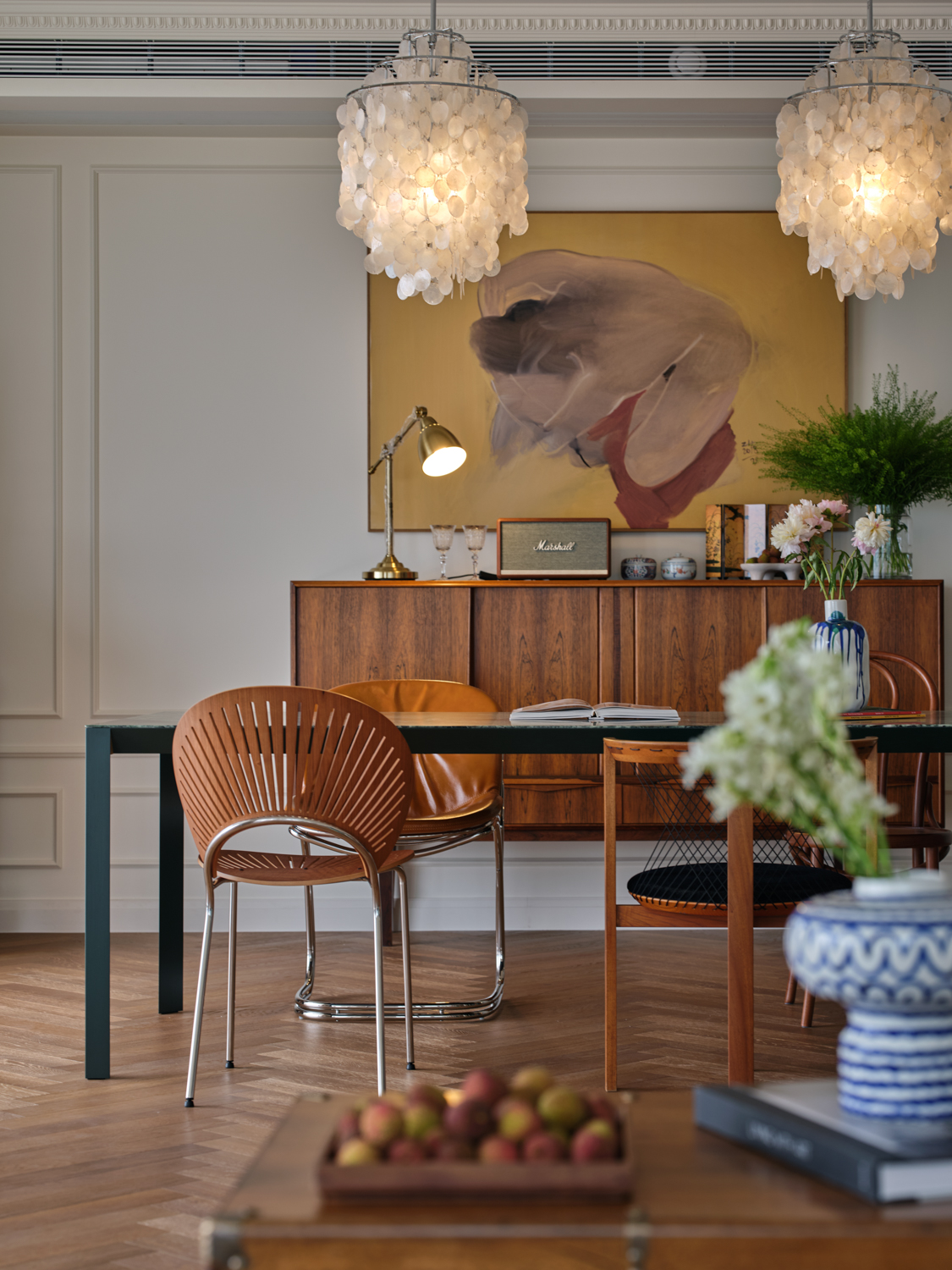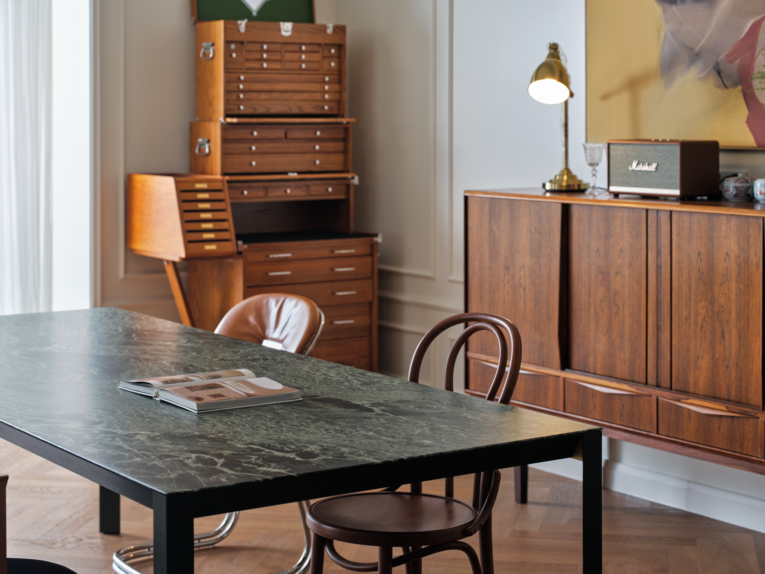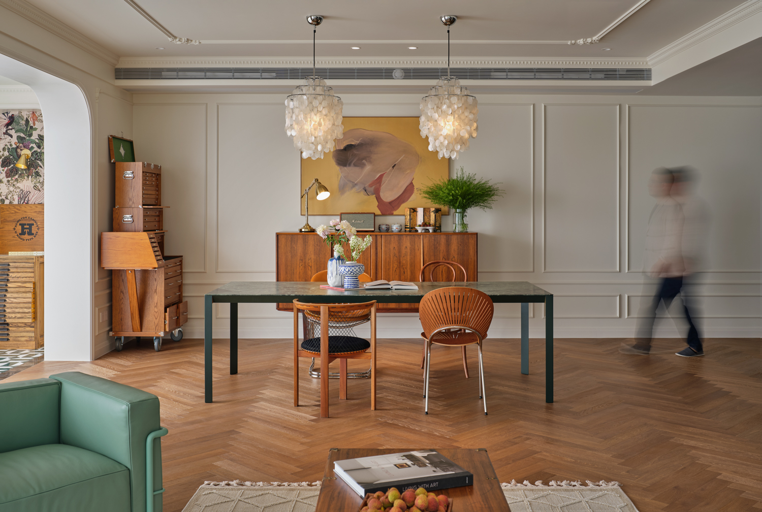空间的设计思维缘起于一张来自于Molteni&c的普拉达绿的大理石长桌,现被置于餐厅区域作餐桌使用。业主的“一见钟情”引发了设计师对整体风格与方向的思考。