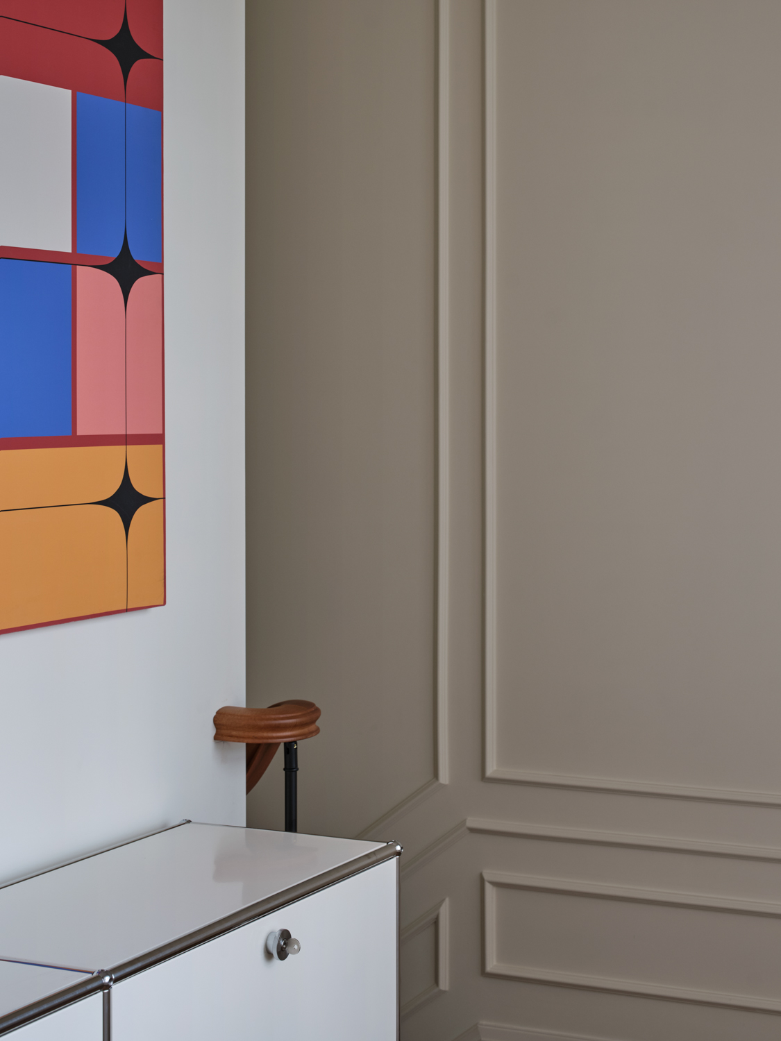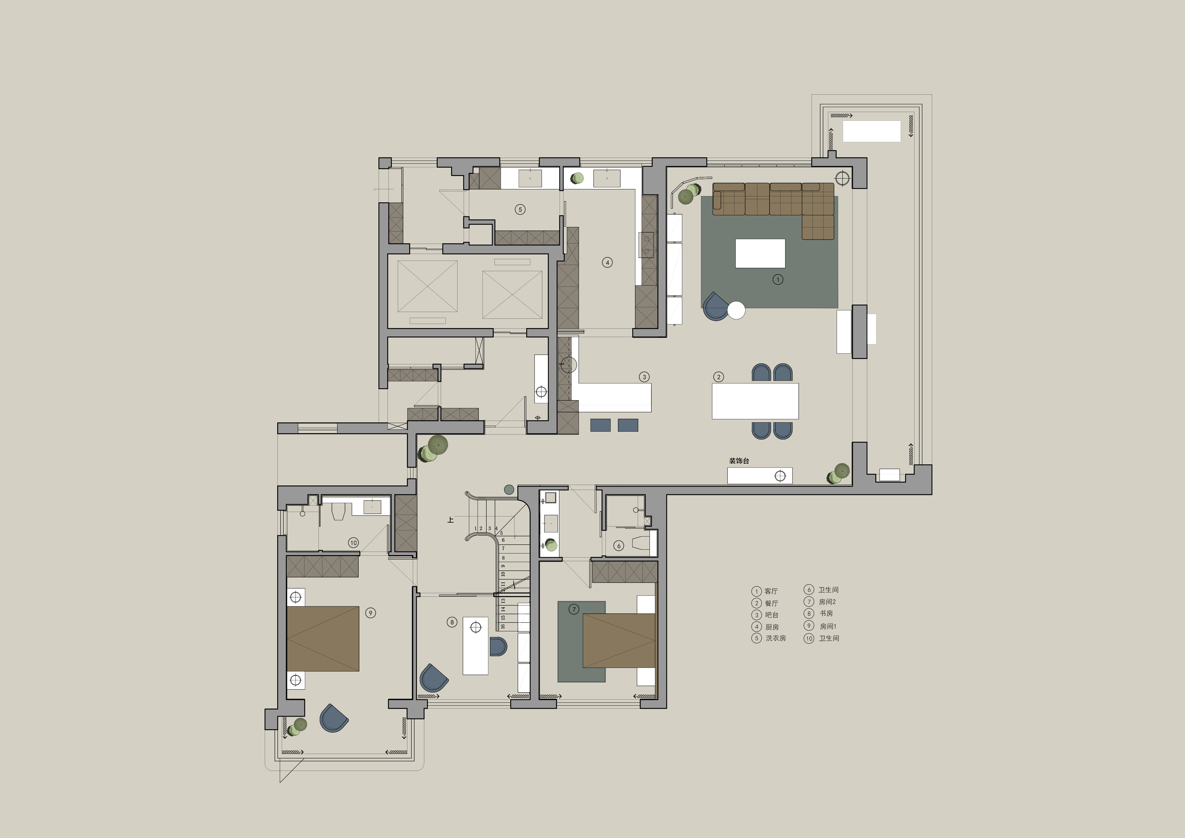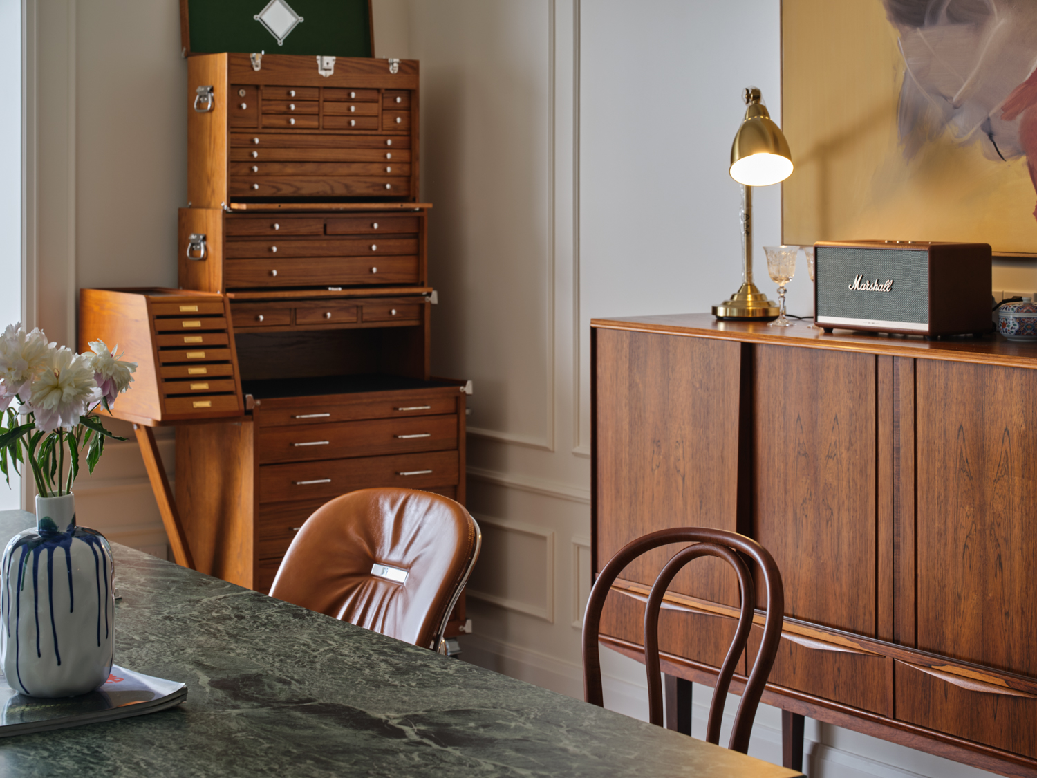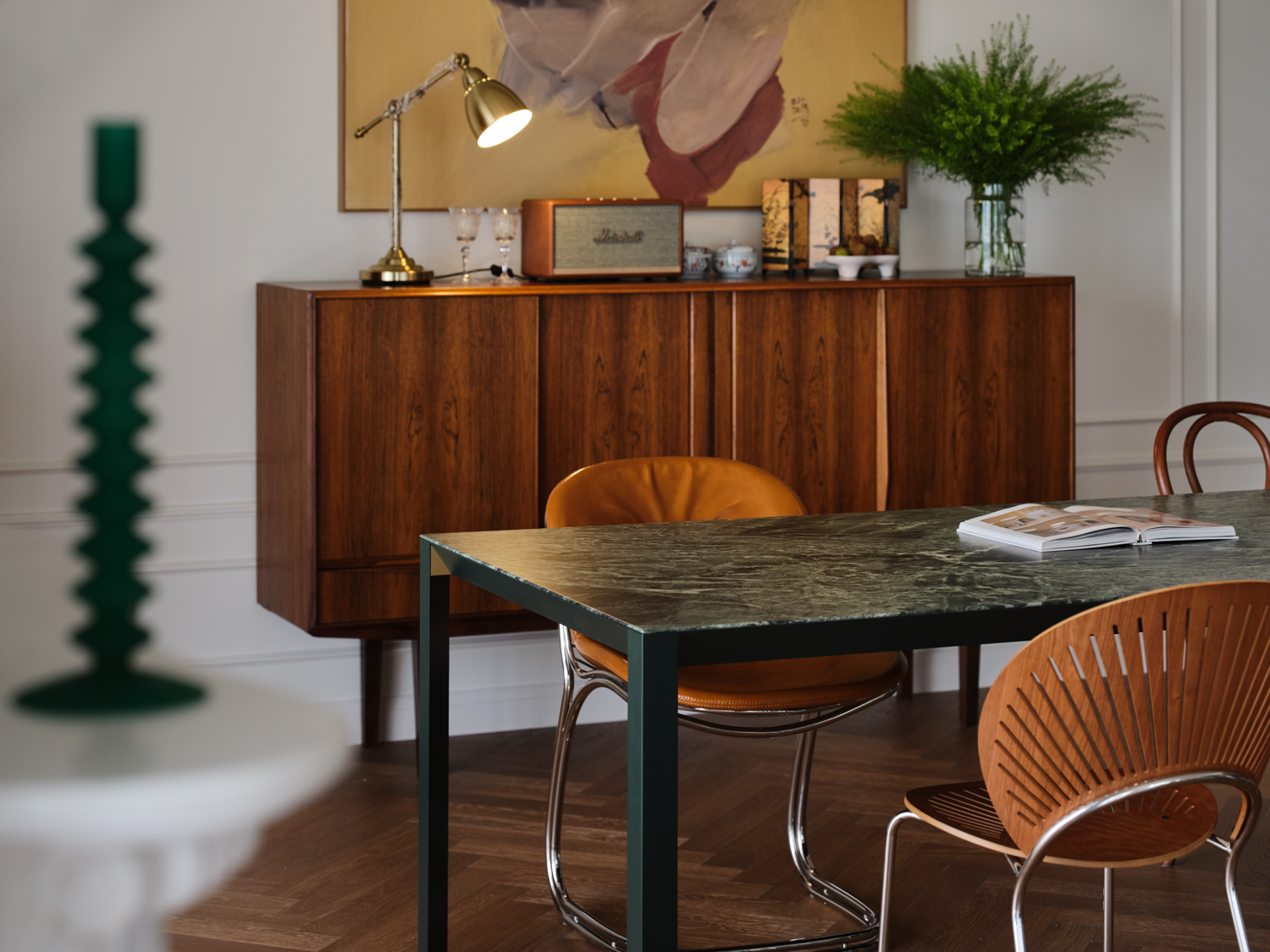 空间的设计思维缘起于一张来自于Molteni&c的普拉达绿的大理石长桌,现被置于餐厅区域作餐桌使用。业主的“一见钟情”引发了设计师对整体风格与方向的思考。