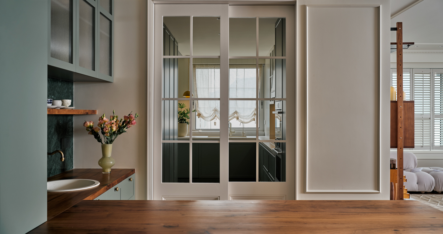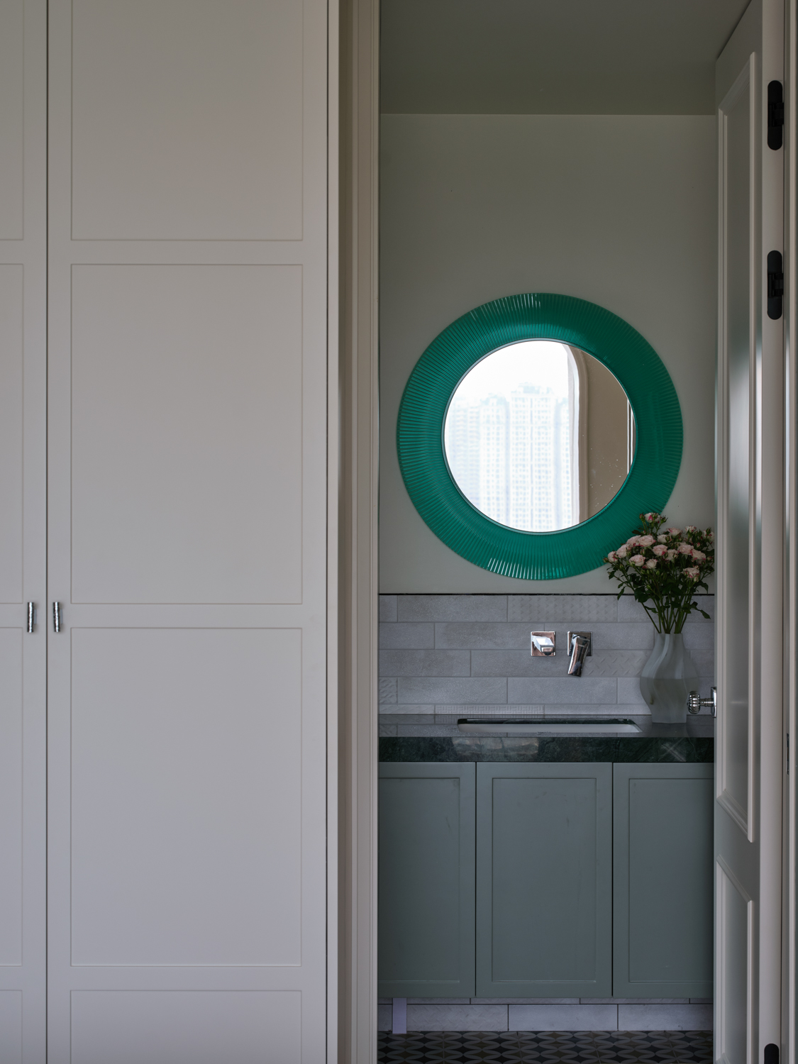 客厅采用大面积白色,提升整体明亮的调性,配合巨大落地窗,完成空间内与外无界的交互。餐厅区域则将更多的空间给予桃木色的柜体来满足储物功能,厨房迎合餐桌的绿色记忆点,向内延伸构境,如此一来,空间的明暗关系层次分明,趣味性也油然而生。