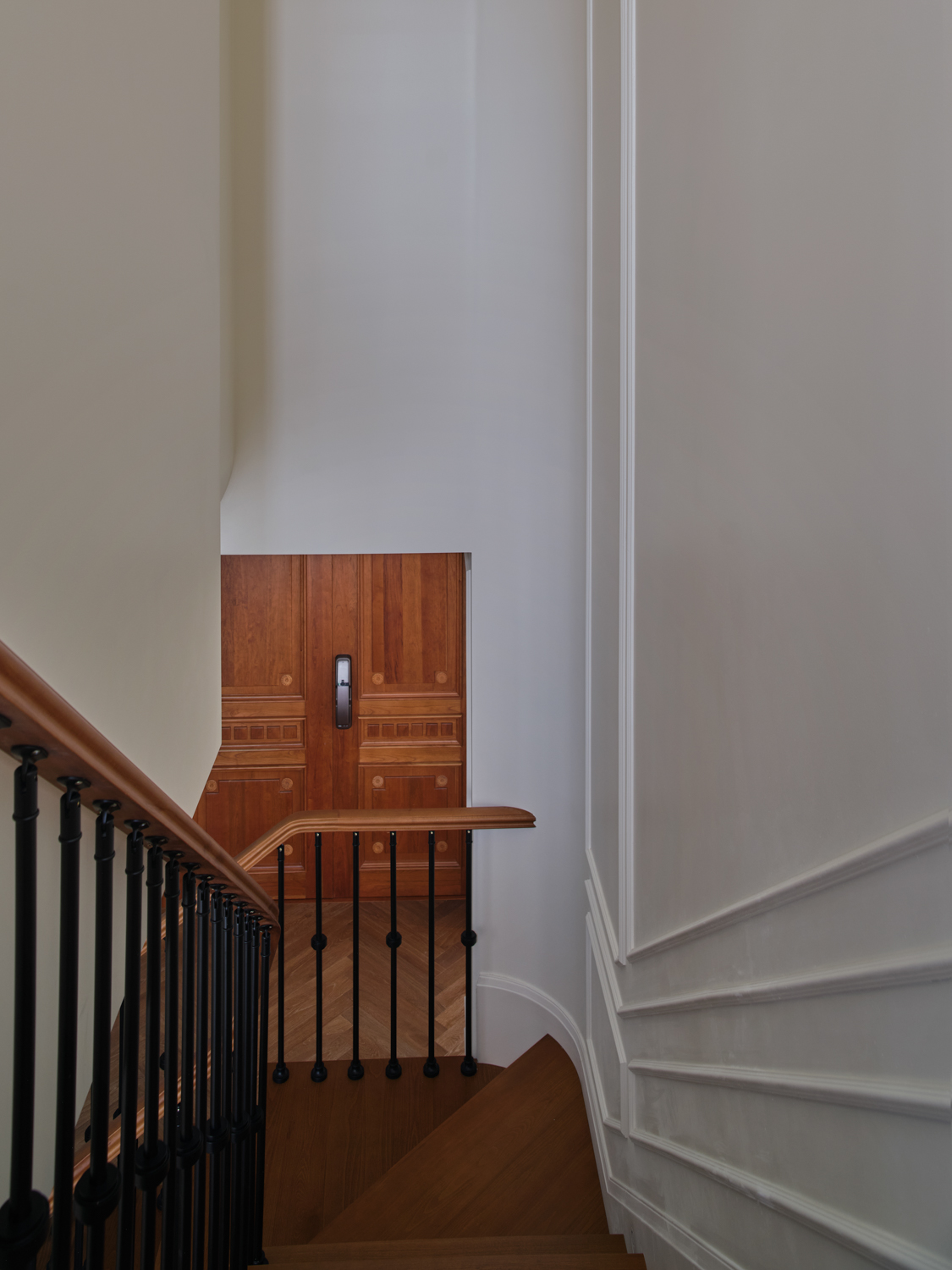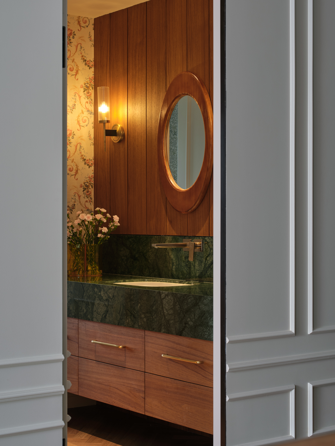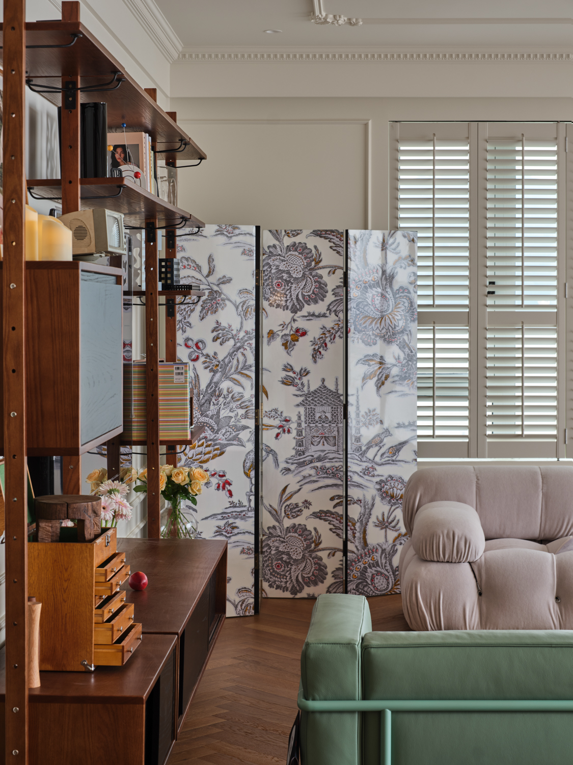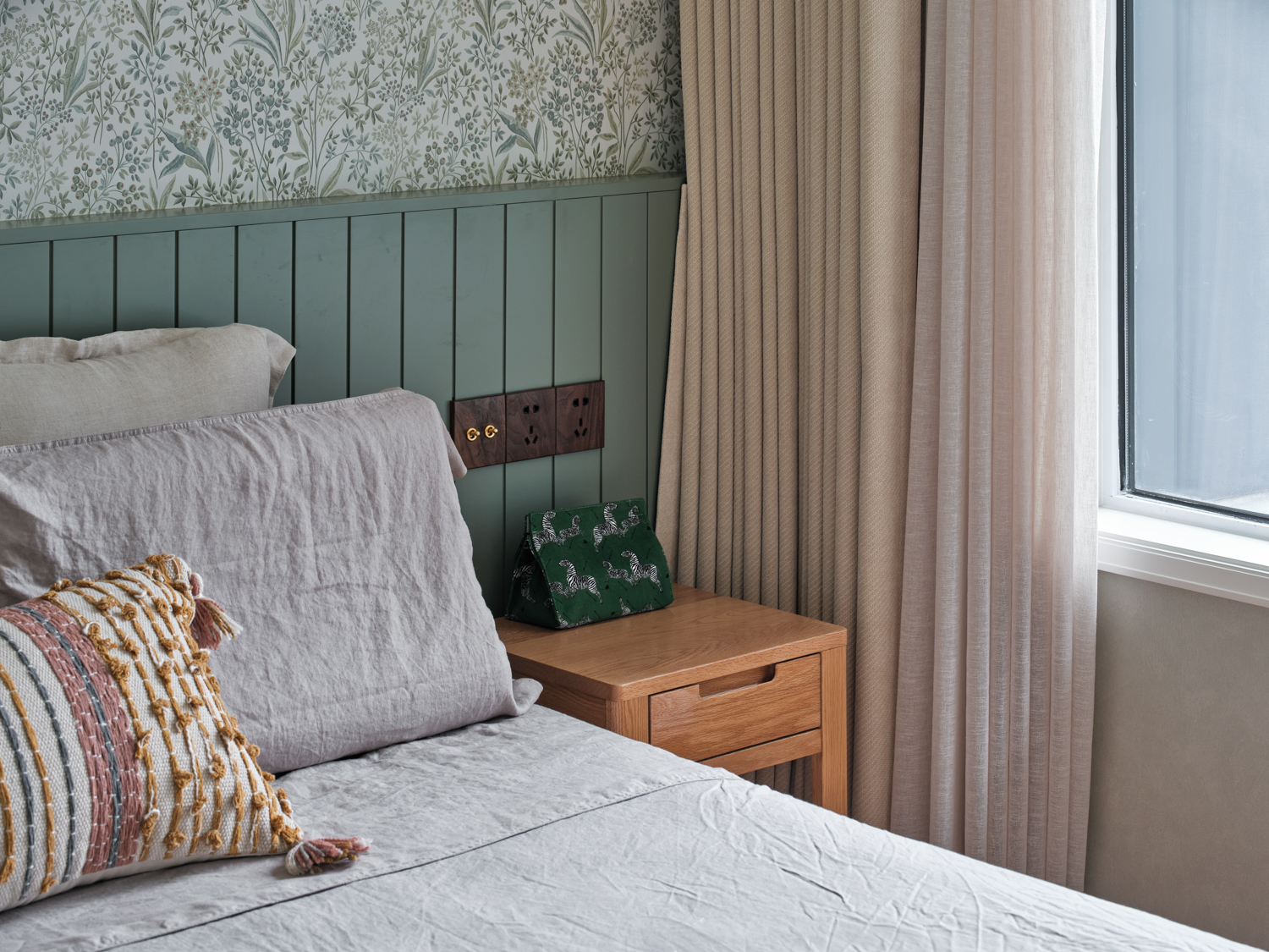 空间色彩由公区的明快,过渡至私密区域的柔和,碰撞的颜色并没有带来嘈杂的视觉感官,这是因为设计师深谙克制的艺术,除却作为重点的复古绿与桃木色以外,尽可能地留白,形成疏密相间,重心与辅助兼容的空间形态。