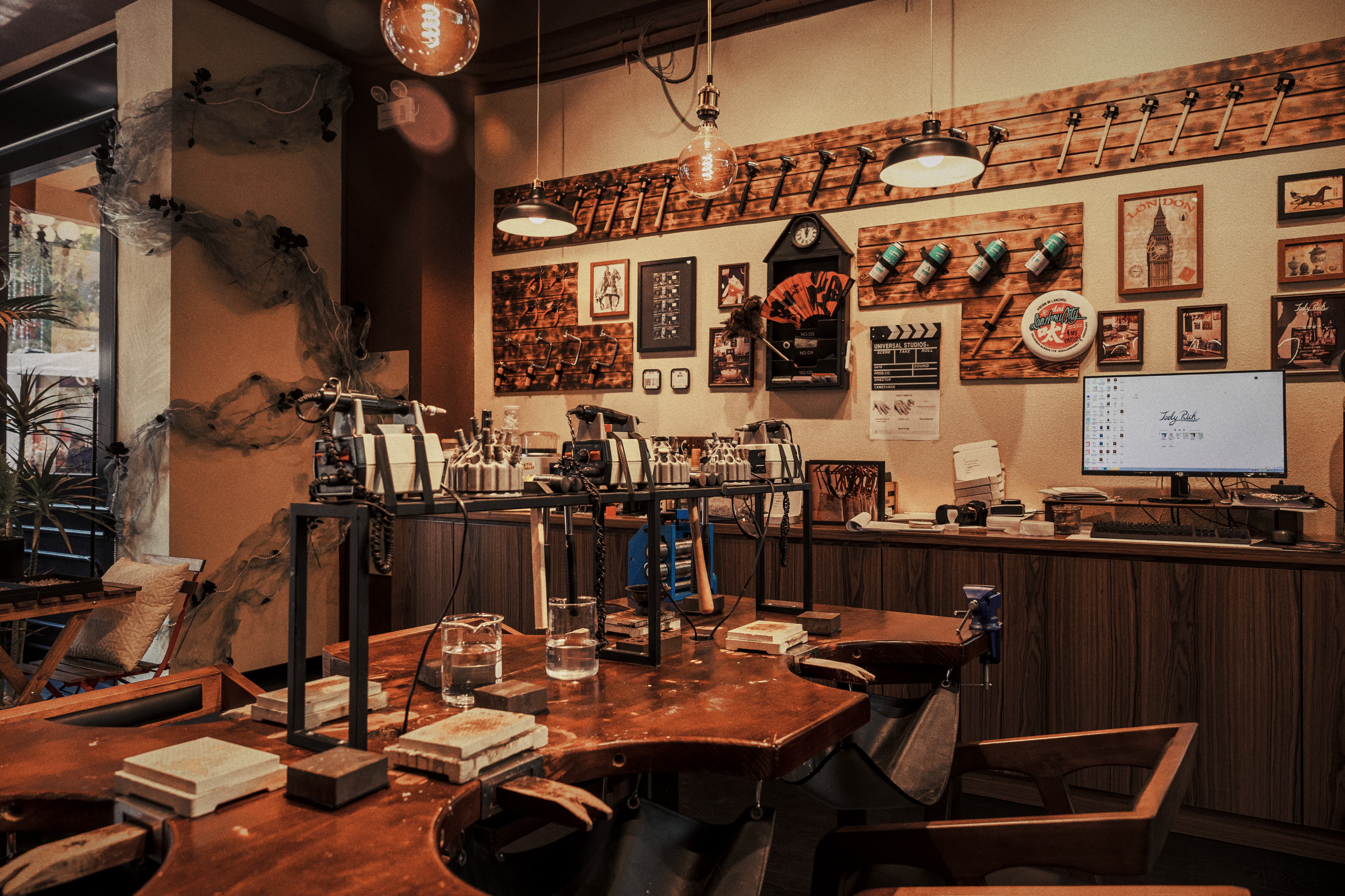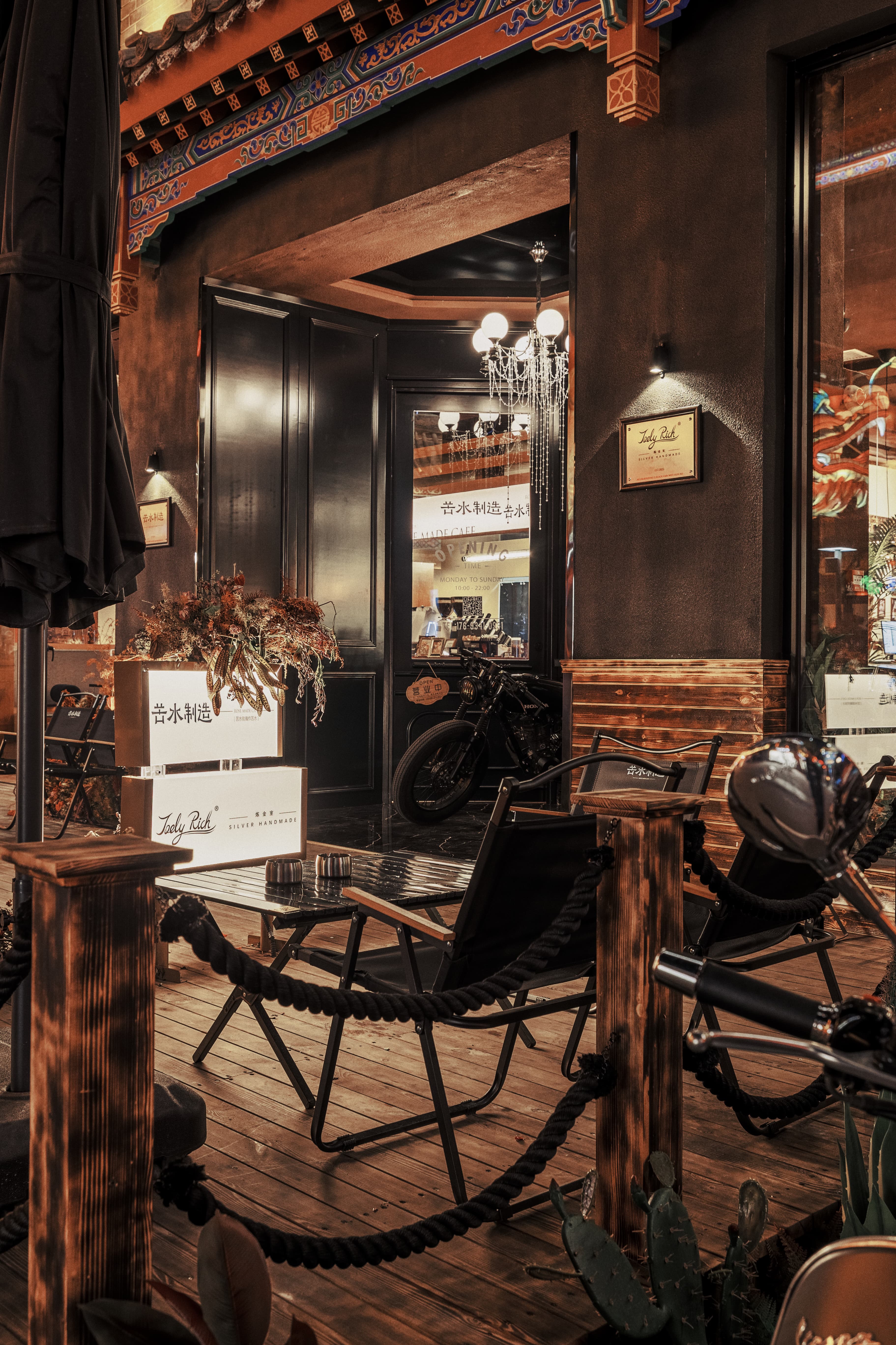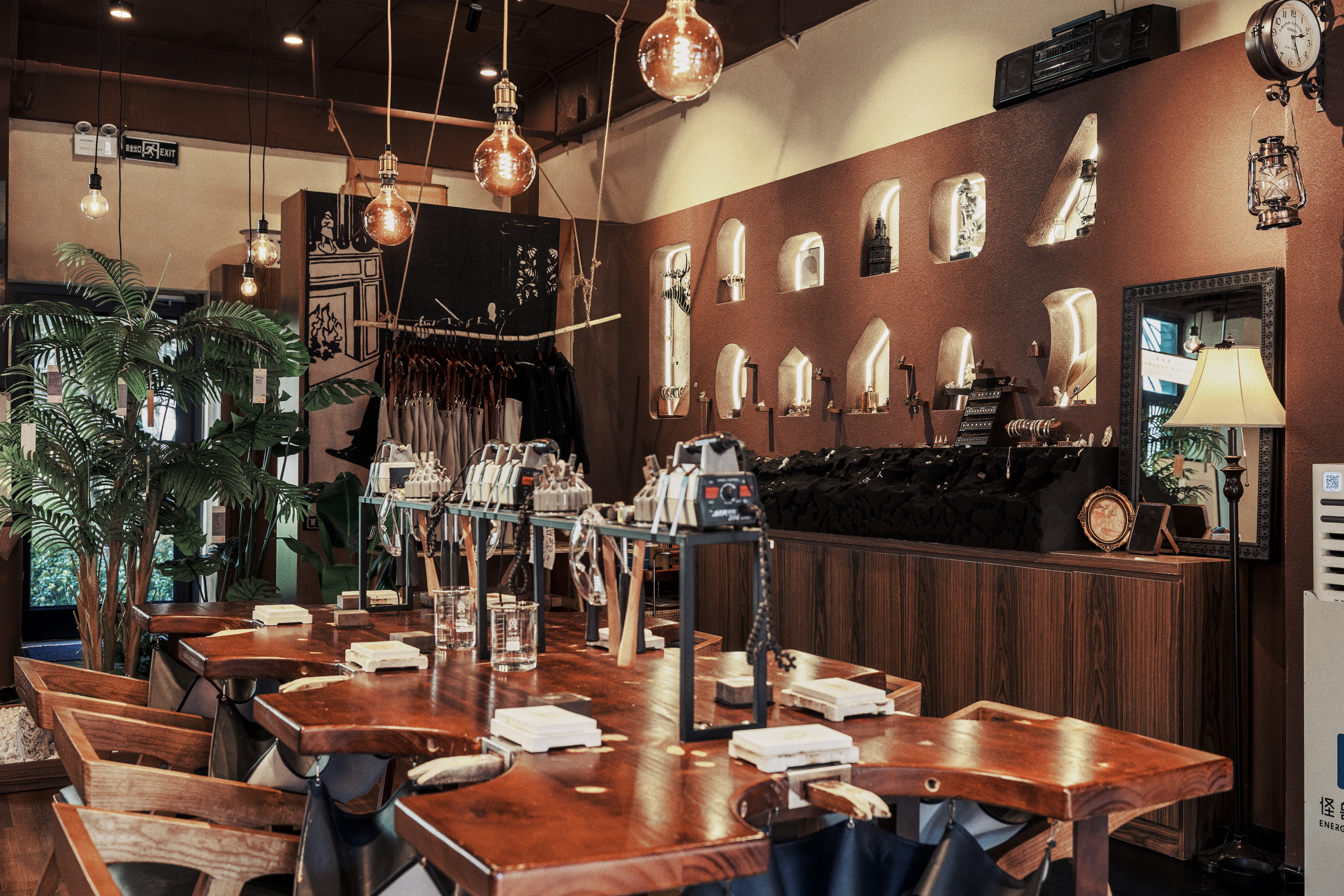 项目定位:银饰与咖啡店结合,设计内推门,巧妙的将黑色与胡桃木色结合穿插运用,增添了空间质感,呈现出经典与现代的融合感。黑色复古弧形造型玻璃门,搭配胡桃木色多种造型墙板,层次分明,凸显出独特的质感,进一步强调了复古风格。这些设计细节不仅提升了空间质感,还营造出一种浓厚的怀旧氛围,使踏入店内的顾客都能感受到独特的时光魅力。走进店内,迎面而来的咖啡香气与银饰的精巧光泽互相交织,营造出一种独特的氛围。每一件银饰品都经过匠心独运的设计与打磨,手工的浪漫,在于,你有权赋予它一切美好与浪漫。让你用自己的双手,来凝固时间与浪漫。复古风格,琳琅满目的工具与作品填满整个空间,在这样氛围下做出来的产品,一定很美好。