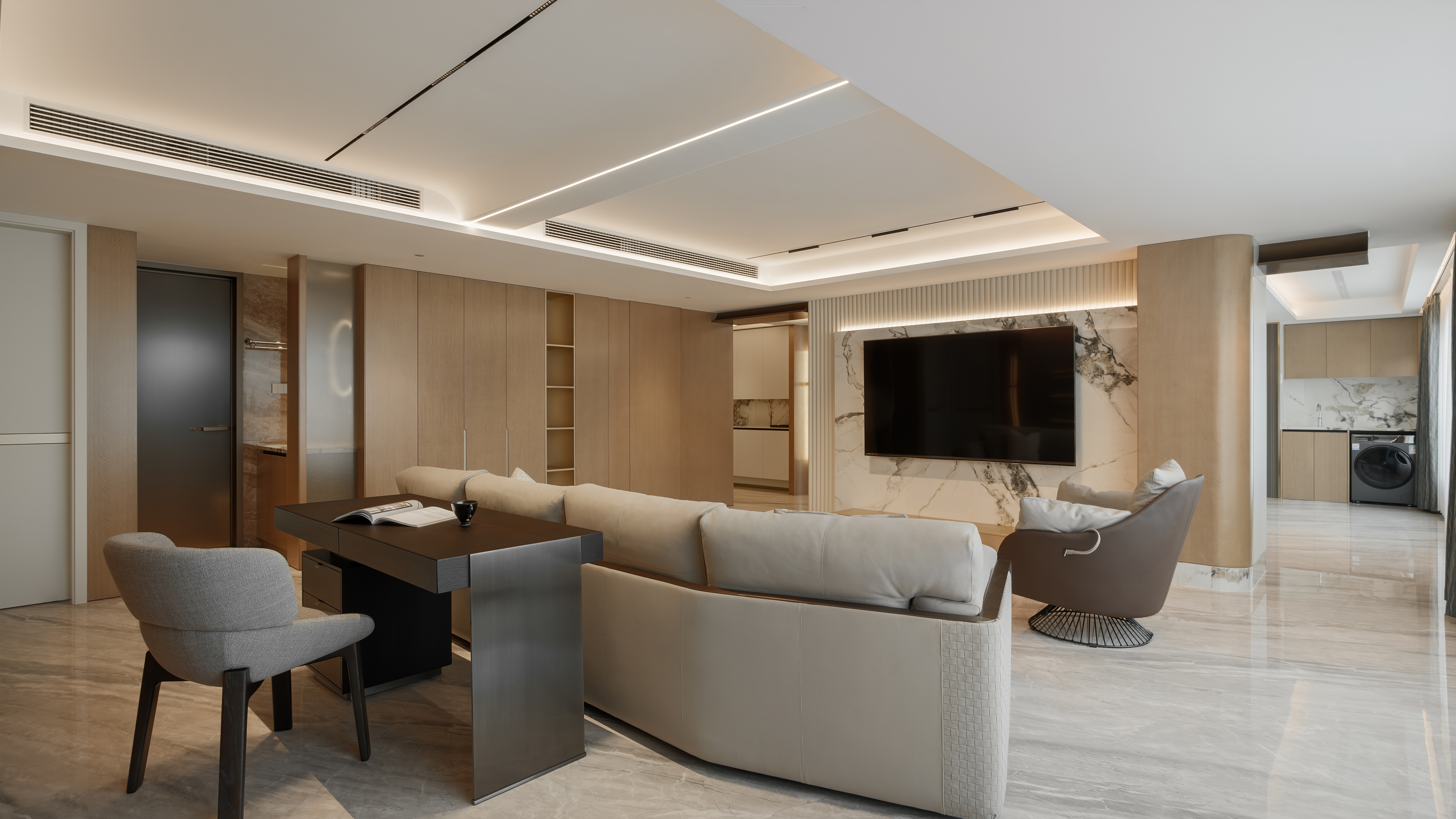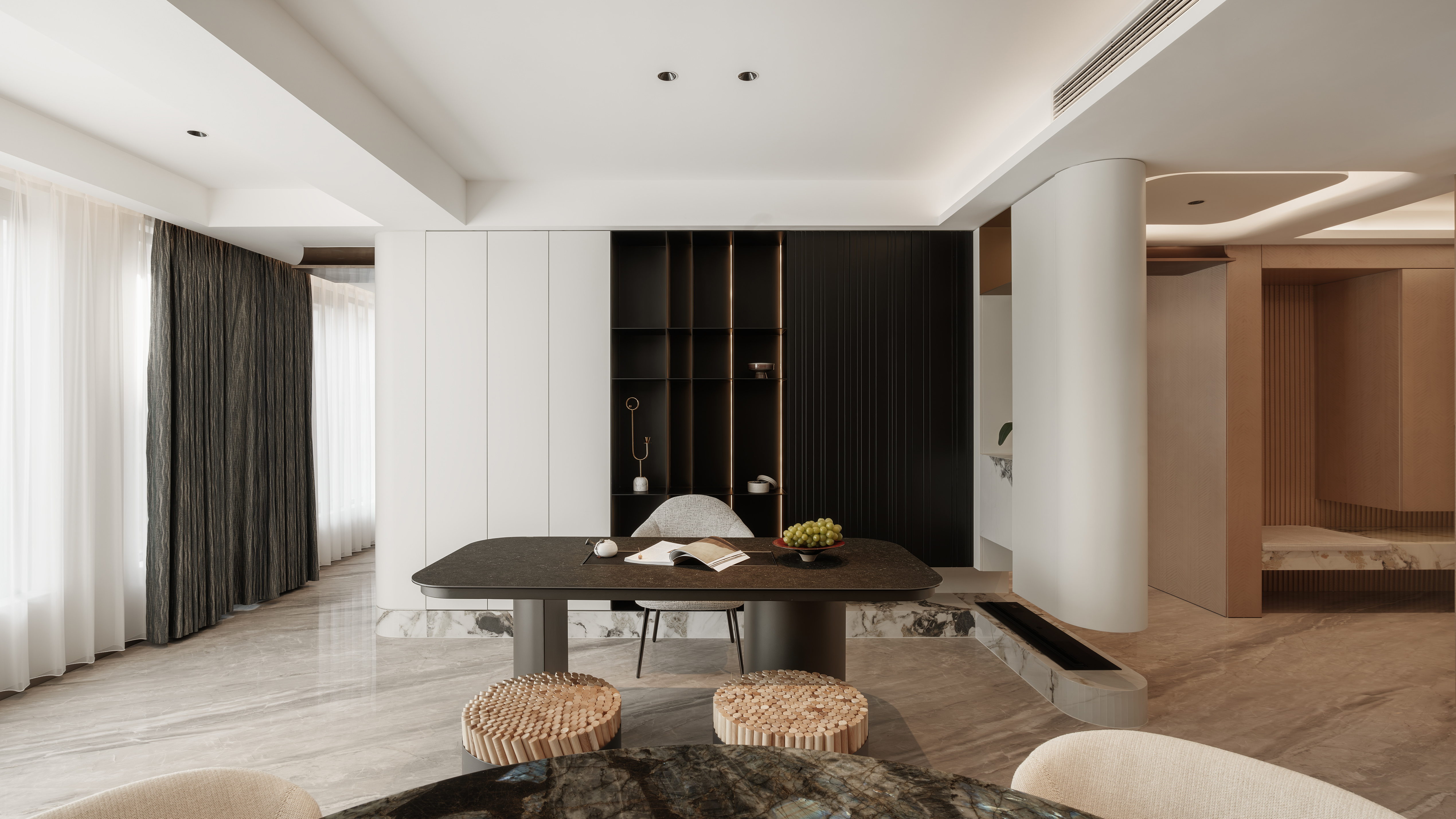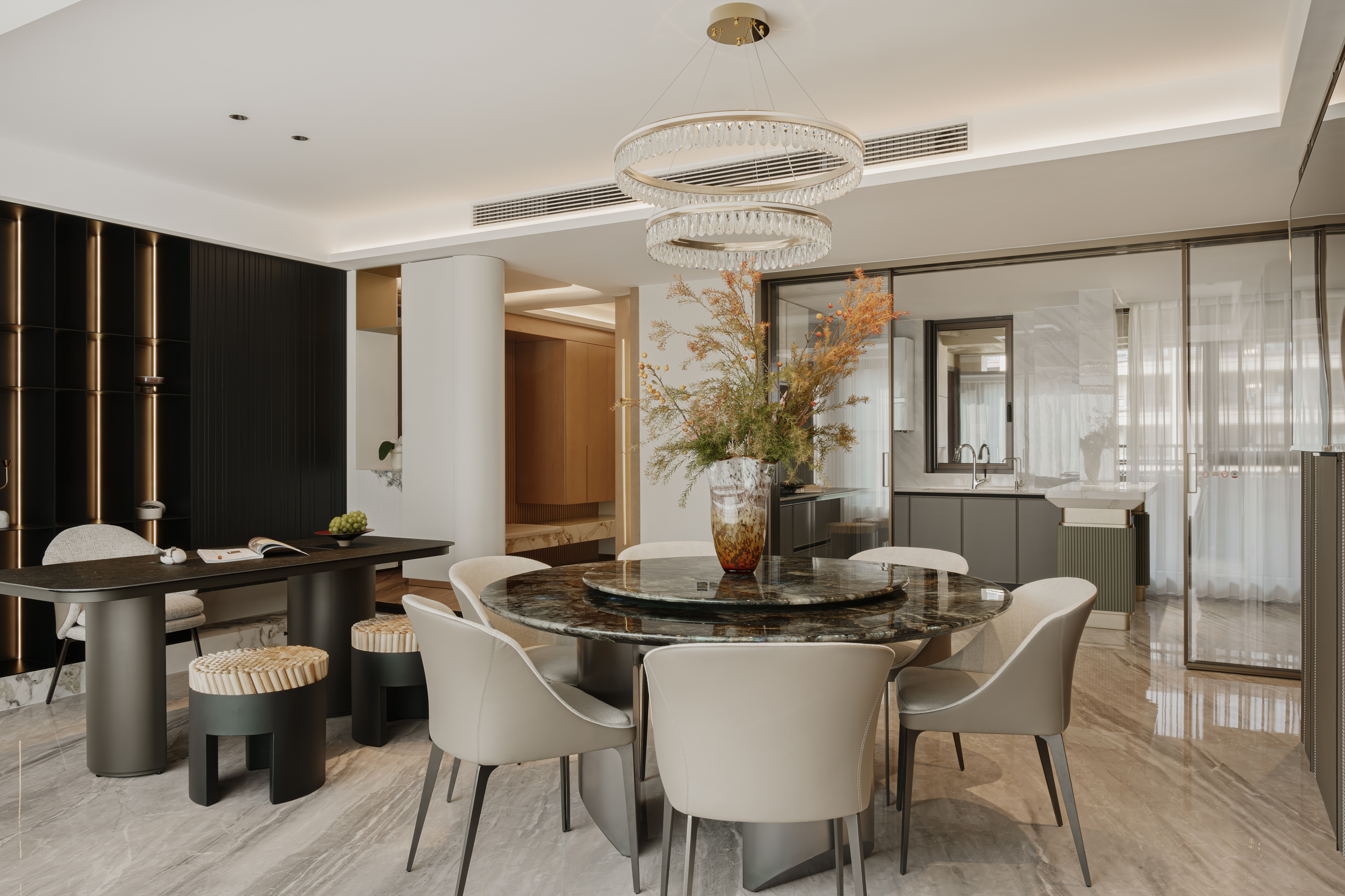 空间意境:大客厅跟餐厅茶室空间通过原有阳台之间连接在一起,达到围合整体空间的目的