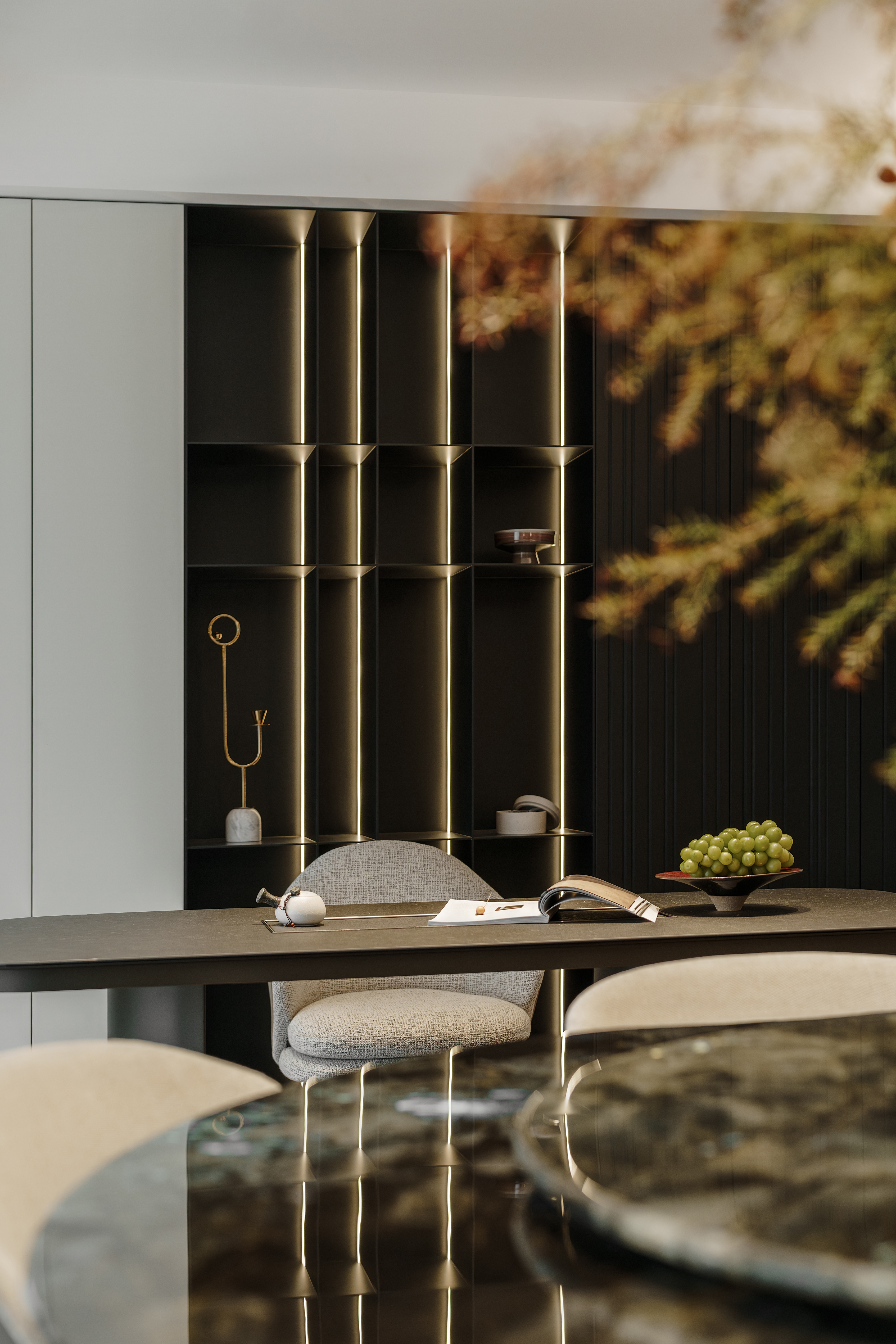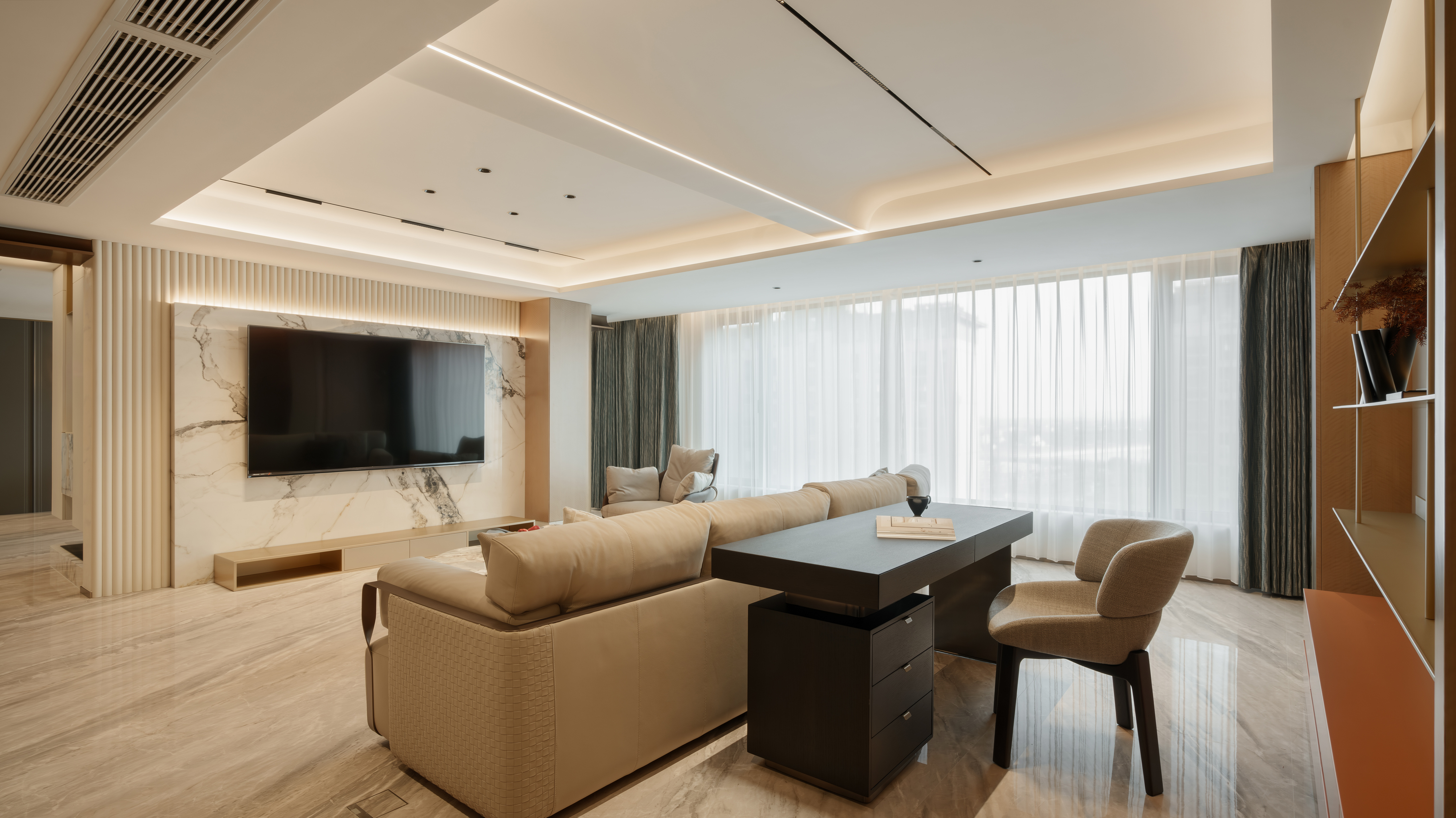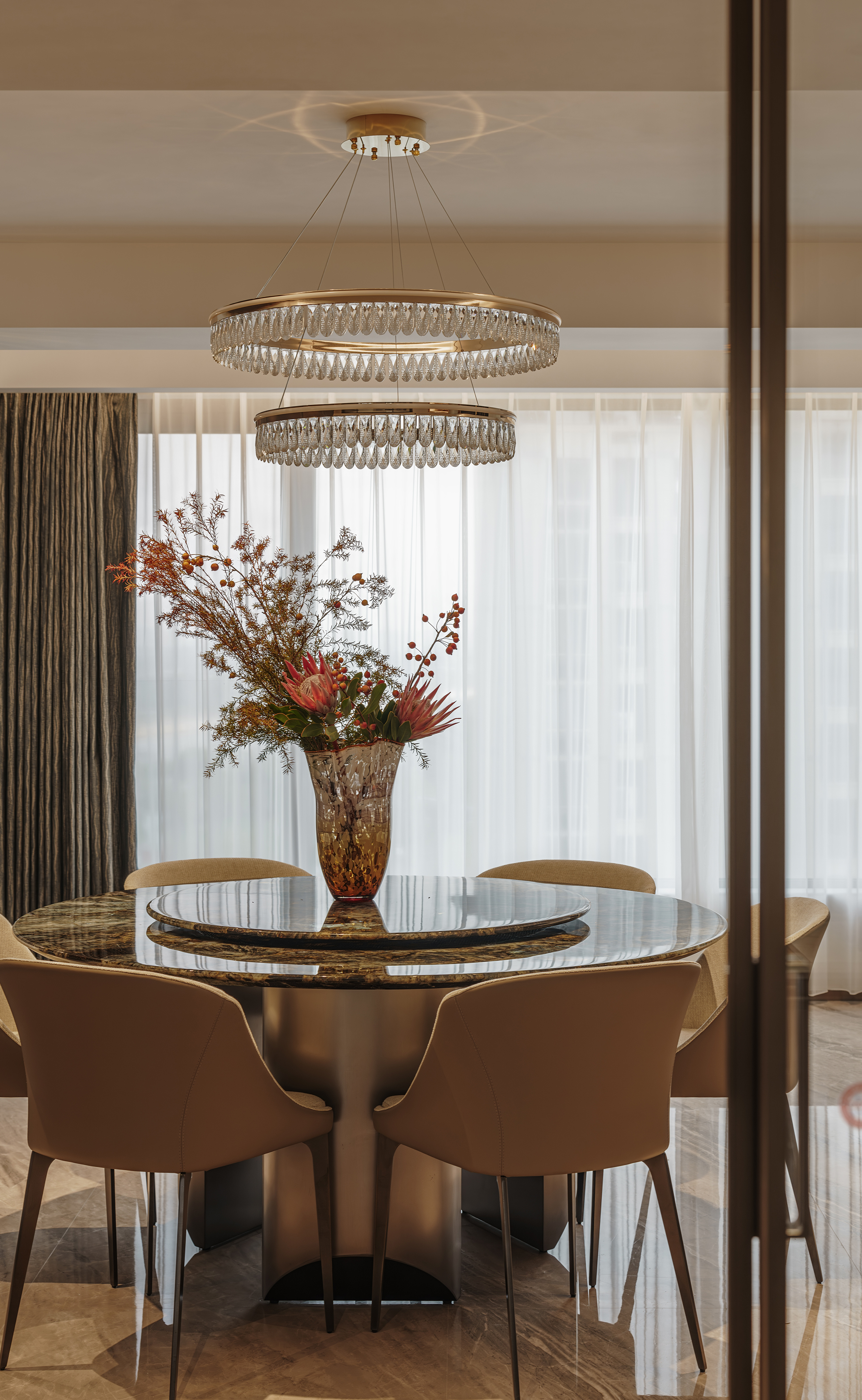 空间意境:大客厅跟餐厅茶室空间通过原有阳台之间连接在一起,达到围合整体空间的目的