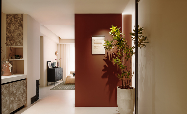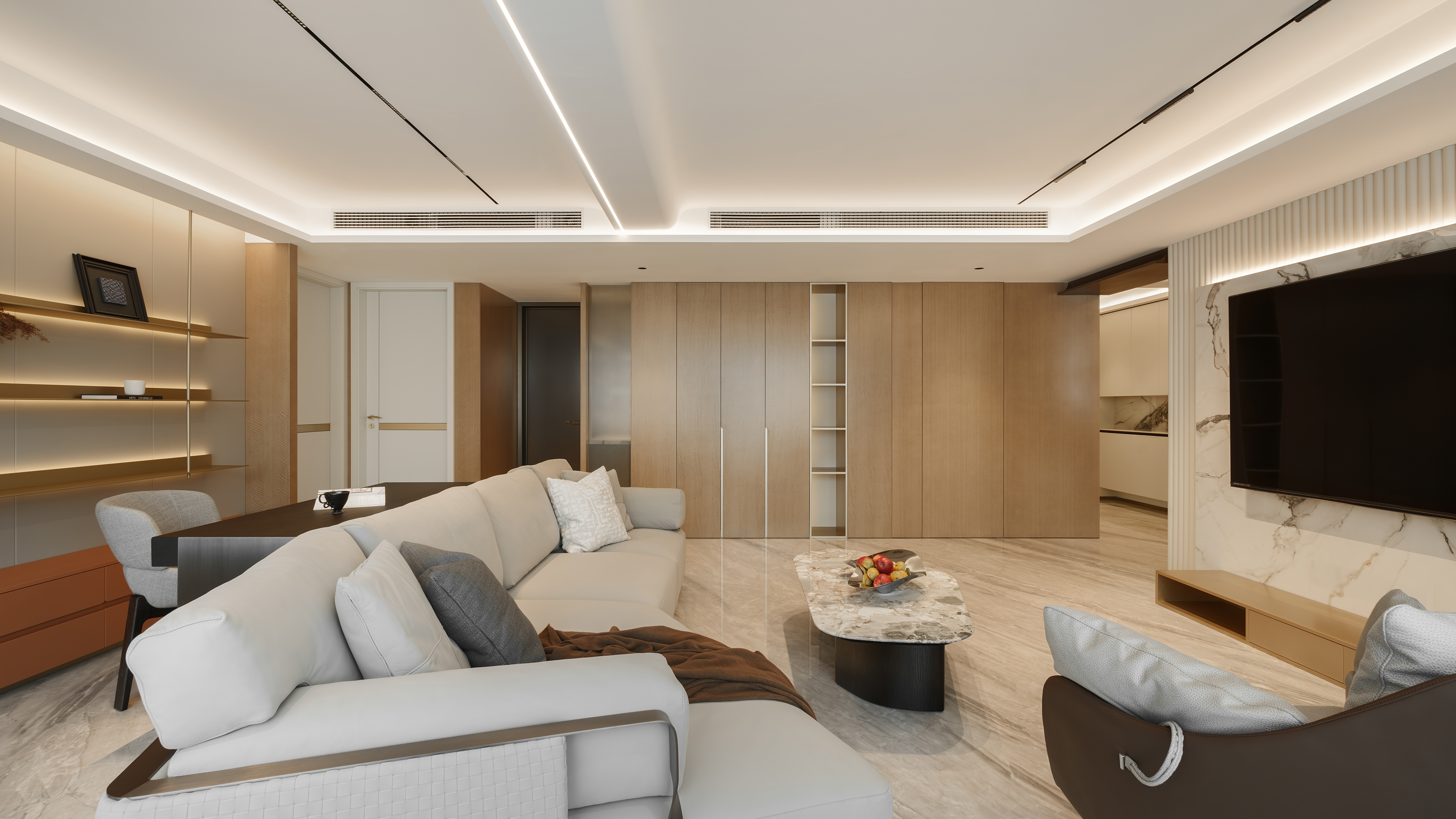 空间布局:两户打通,独立的玄关空间,大客厅跟独立餐厅茶室布局,阳台之间外机位优化后,得到环绕型的动线