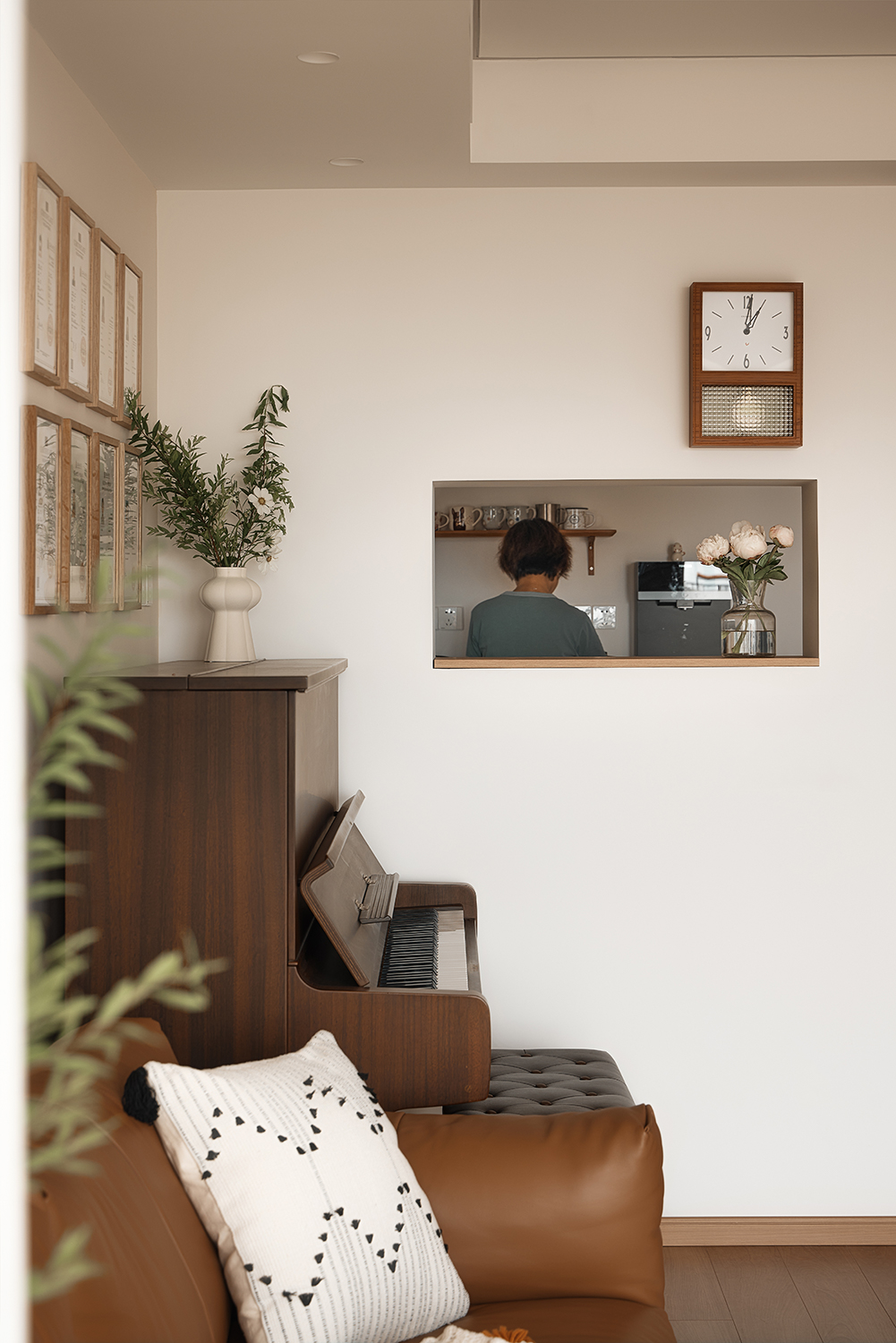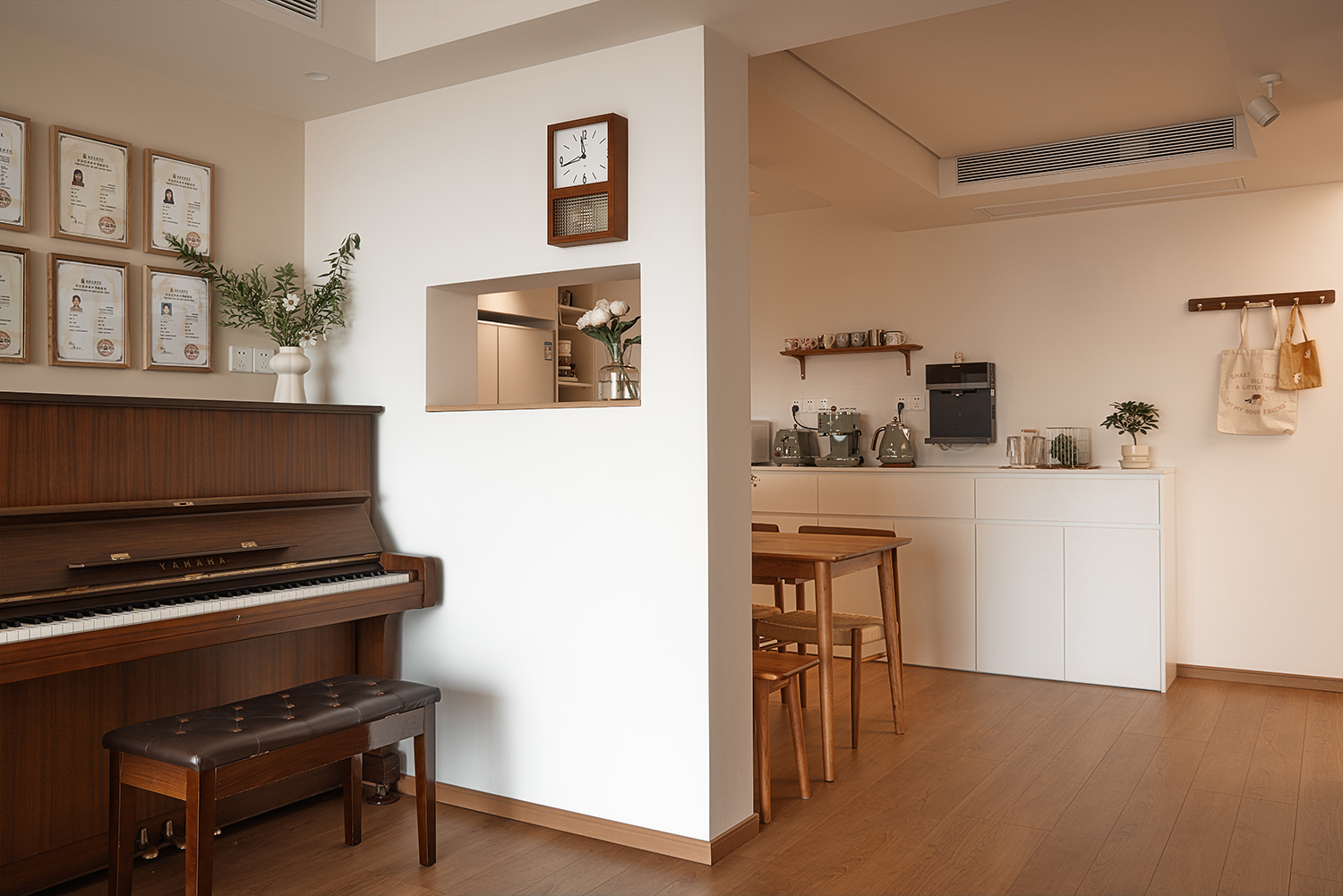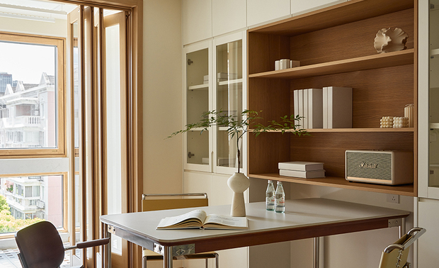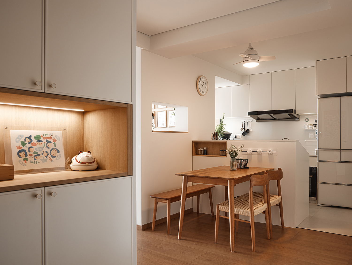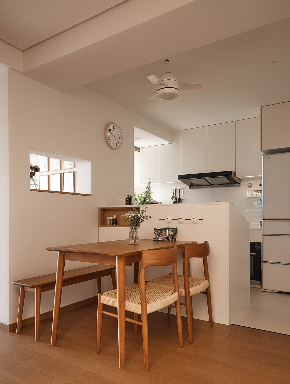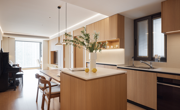 2厨房与餐厅的结合与改造:原厨房位于东侧,距离餐厅较远,设计师将其改至西侧,并采用开放式厨房布局,增强了家庭成员间的互动。同时,在客餐厅间的柱子上打造了一个窗洞,使厨房与餐厅之间的视线得以连通,增加了空间的通透性和趣味性。