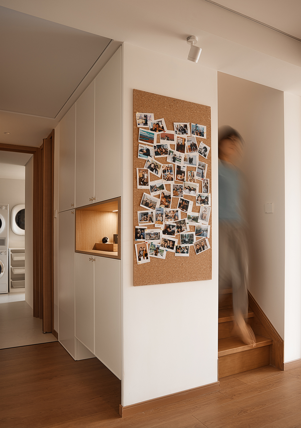 3多功能收纳空间的创新利用:设计师在空间中巧妙地设置了多个多功能收纳空间,如楼梯下方的玄关柜、一楼和二楼的卫生间及洗浴区的收纳柜、临时收纳间等,这些空间不仅满足了家庭成员的收纳需求,还提高了空间的利用率和整洁度。