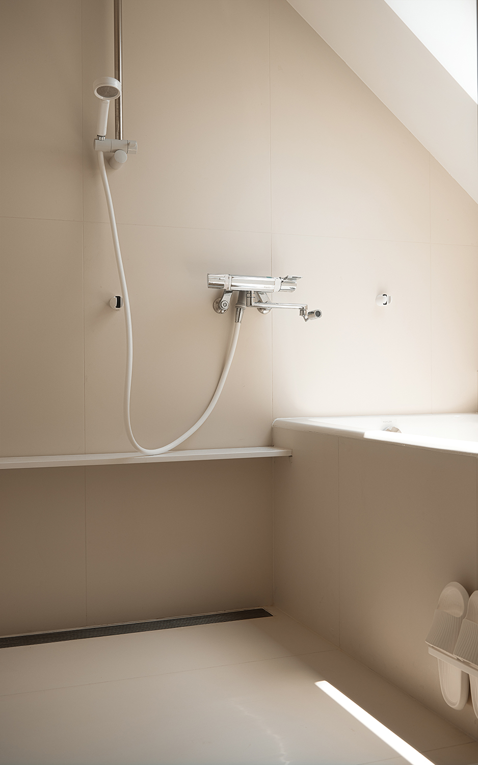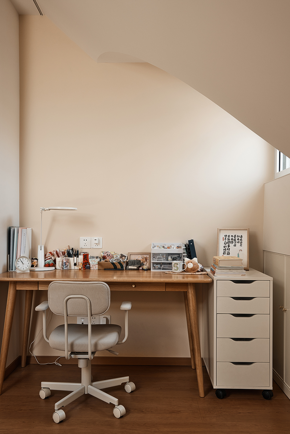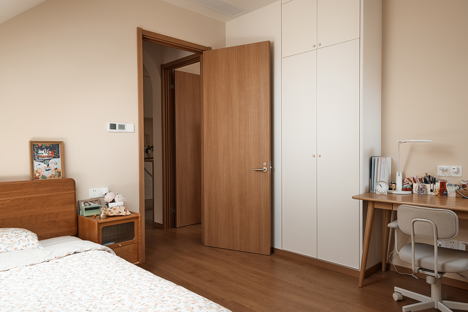 项目定位:本次设计立意在于打造一个既满足四口之家当前生活需求,又兼顾未来成长变化,同时兼顾美观与实用性的理想家居环境。通过优化空间布局,创造出流畅的洄游动线,提升了家居生活的便捷性和舒适度。设计注重细节,如独立玄关的设置满足了特殊时期的消杀需求,而开放式厨房与餐厅的结合则增强了家庭成员间的互动。在卧室和卫浴设计中,充分考虑了公平性和私密性,确保两个女儿拥有相同大小的房间和个性化的空间。同时,利用斜屋面夹角等空间,创造出额外的储物空间,满足了家庭物品的收纳需求。整体设计以奶油色涂料、原木色和白色为主色调,营造出温馨、舒适、放松的家居氛围,让一家人在忙碌的生活中也能找到属于自己的宁静角落。