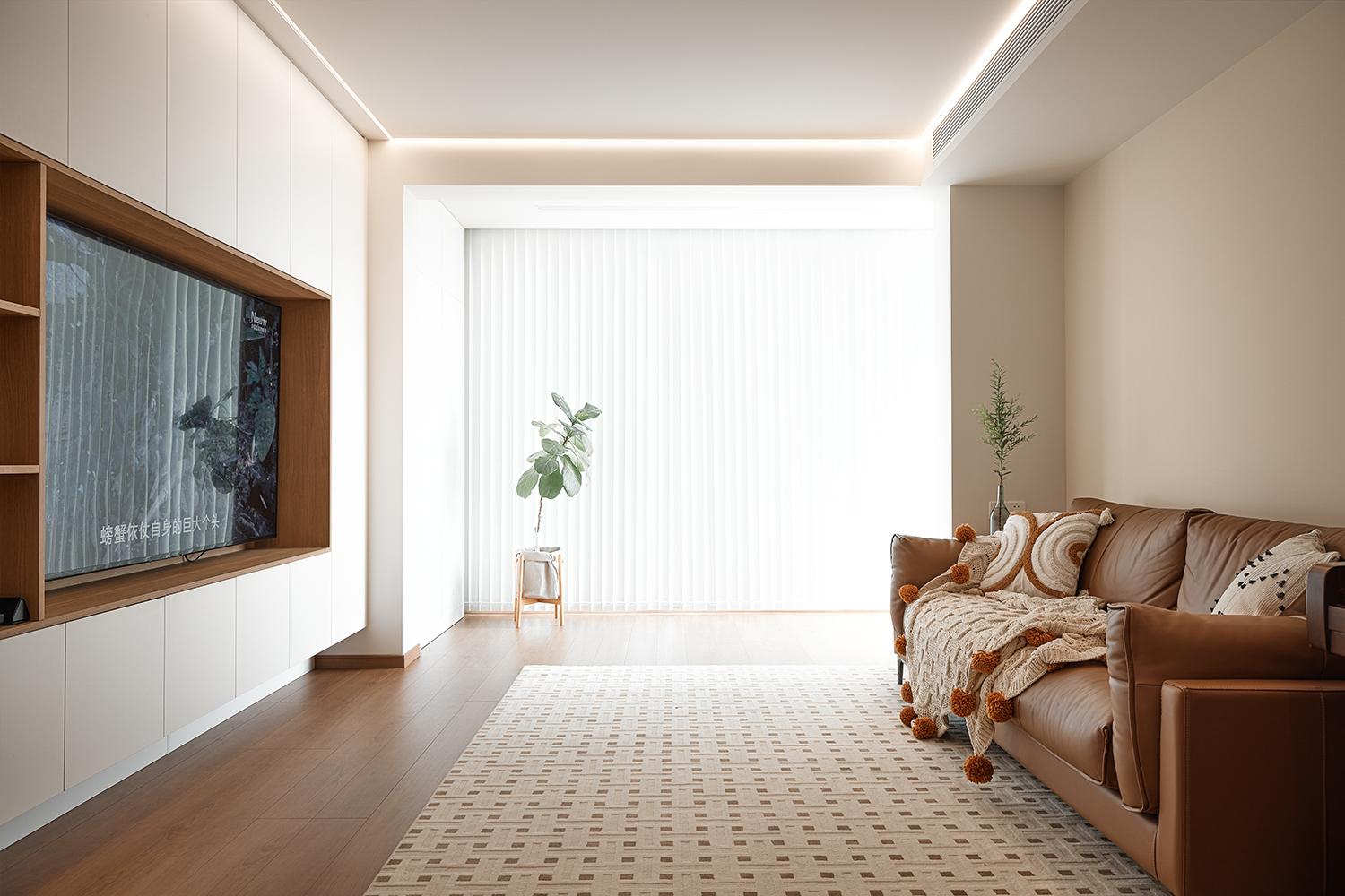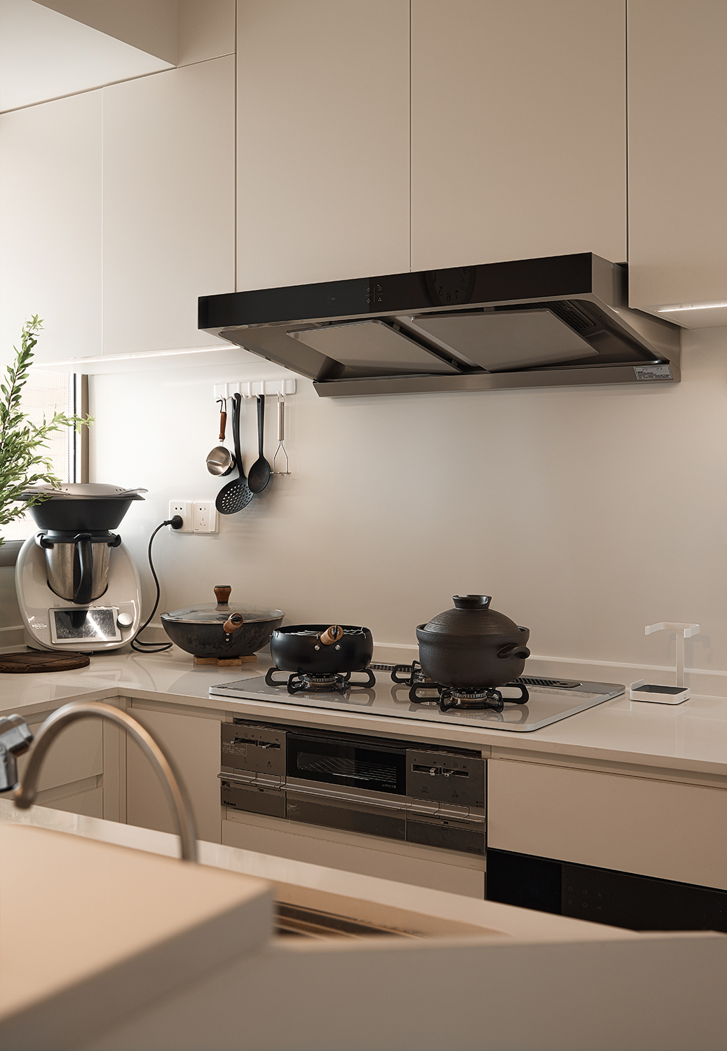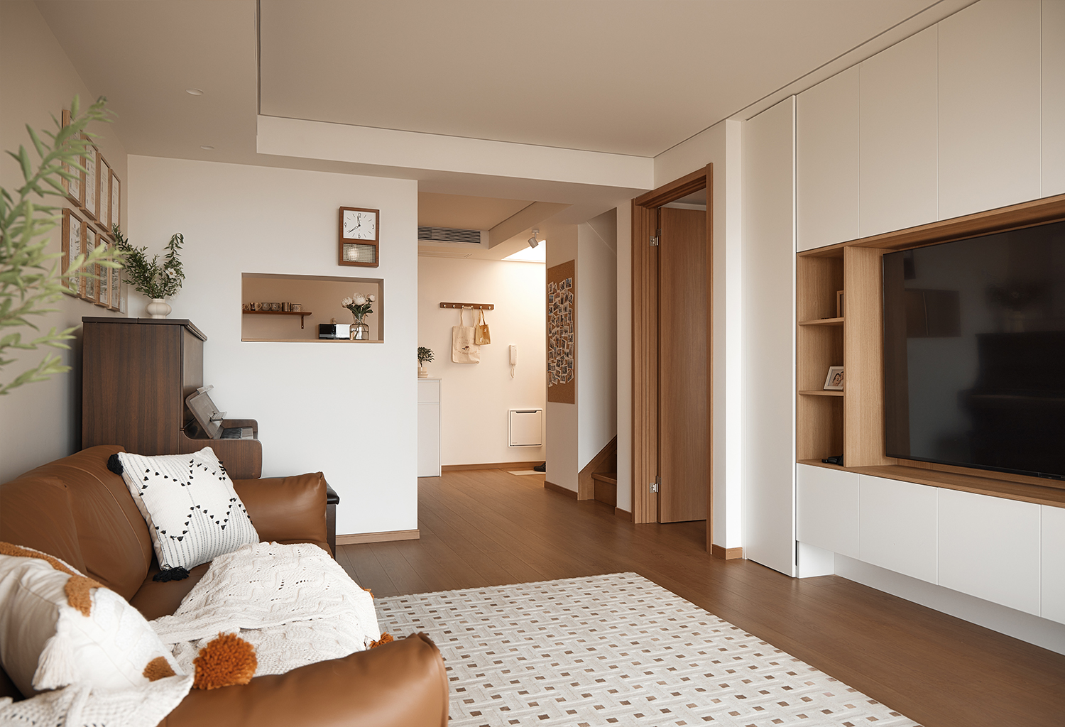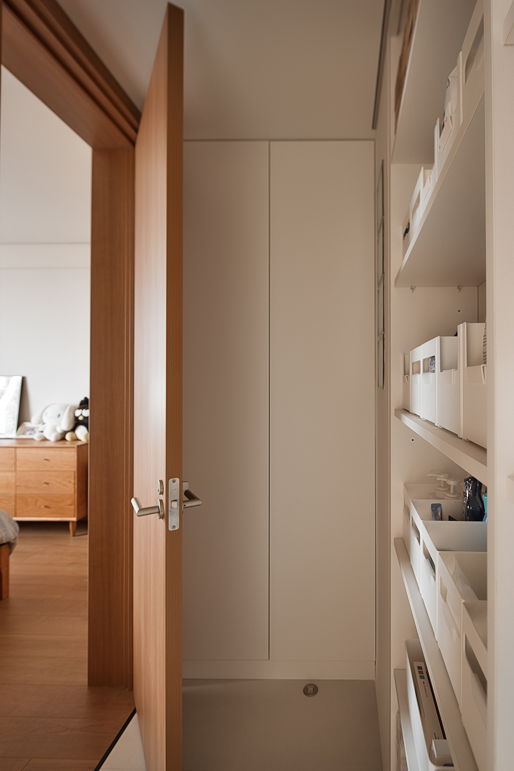 设计选材:选材方面注重实用与美观的结合。厨房墙面采用了整面耐污板,不仅易于清洁,还能利用磁性吸附厨具配件,非常适合厨房高油污的环境。卫生间则选用了三协门和骊住折叠门,前者轻薄防水不占空间,后者隔音效果好且风格搭配整体。浴室地面做下沉处理,并选用防滑材料。客厅与卧室墙面使用奶油色涂料,搭配原木色和白色的柜子和地板,营造出慵懒放松的氛围。此外,还选用了垂直帘、嵌入式晾衣架、蒸烤一体灶、直饮水机等多种实用家居产品,以及小火柴的手工珠光砖等装饰性材料,提升了空间的实用性和美观性。