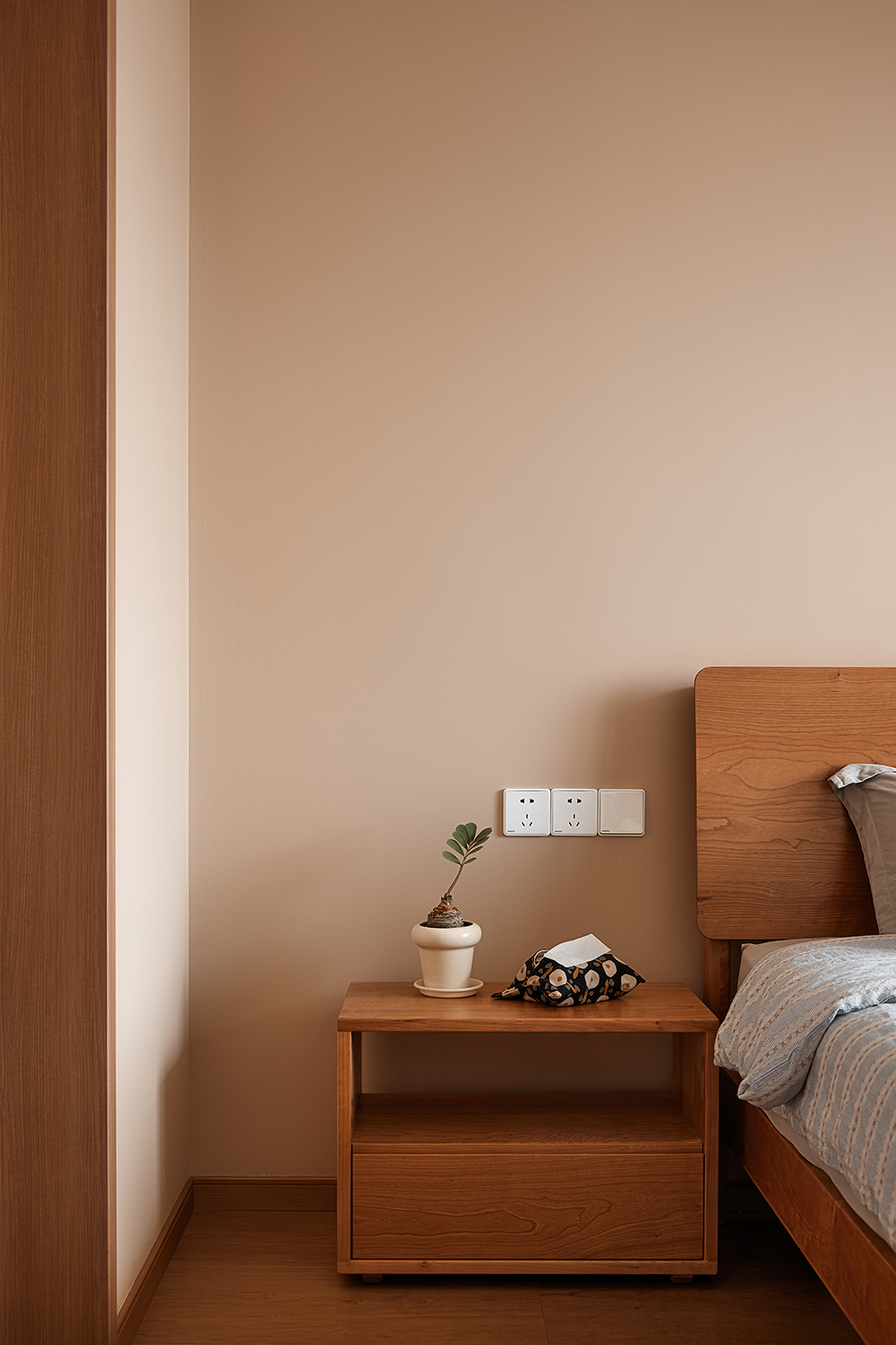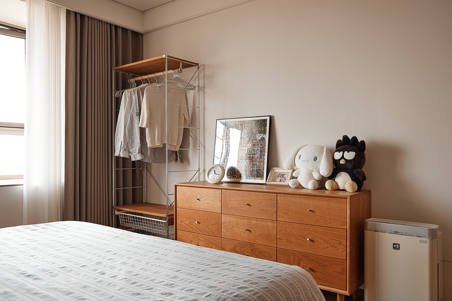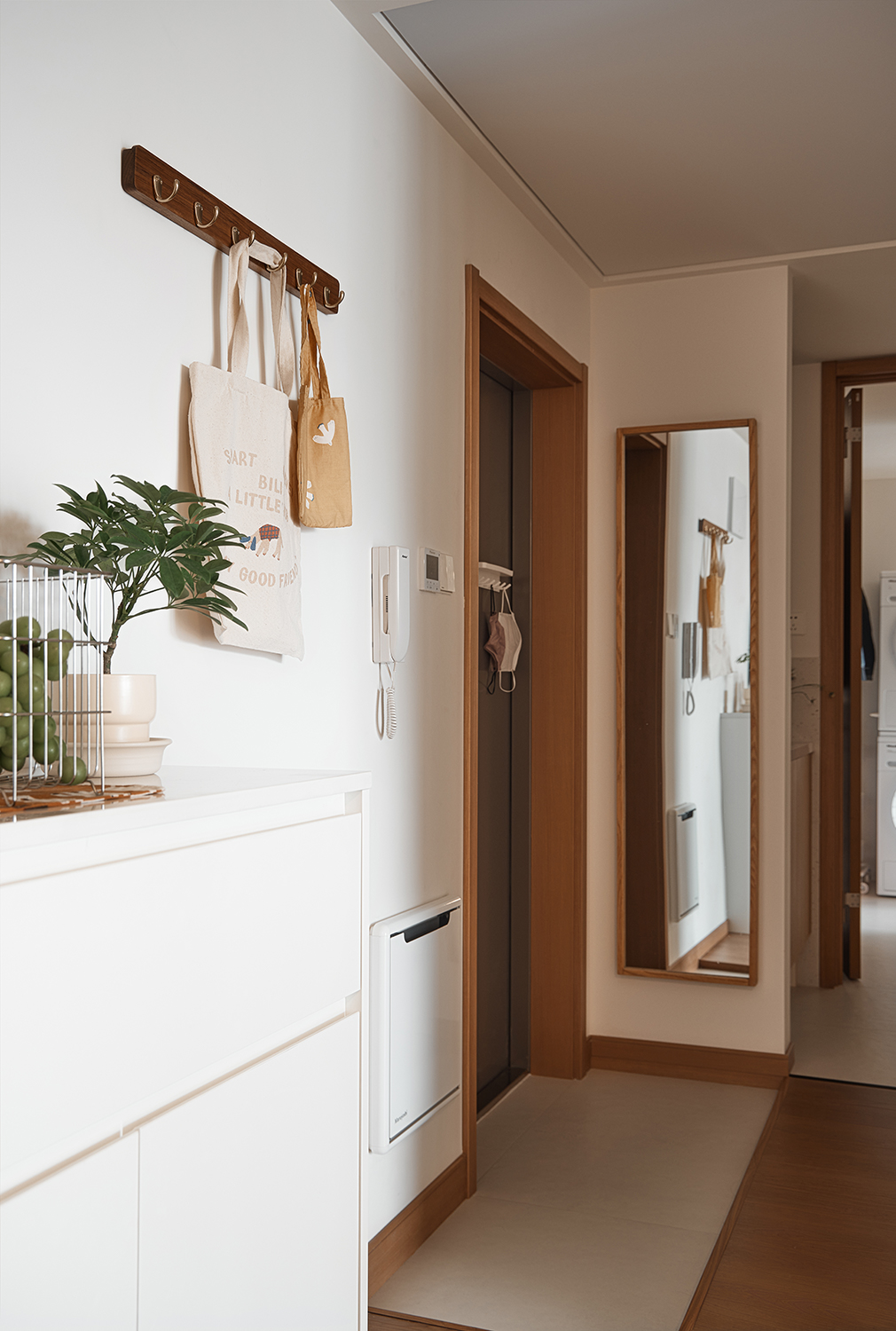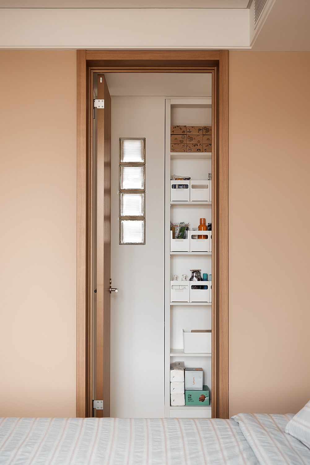 设计选材:选材方面注重实用与美观的结合。厨房墙面采用了整面耐污板,不仅易于清洁,还能利用磁性吸附厨具配件,非常适合厨房高油污的环境。卫生间则选用了三协门和骊住折叠门,前者轻薄防水不占空间,后者隔音效果好且风格搭配整体。浴室地面做下沉处理,并选用防滑材料。客厅与卧室墙面使用奶油色涂料,搭配原木色和白色的柜子和地板,营造出慵懒放松的氛围。此外,还选用了垂直帘、嵌入式晾衣架、蒸烤一体灶、直饮水机等多种实用家居产品,以及小火柴的手工珠光砖等装饰性材料,提升了空间的实用性和美观性。