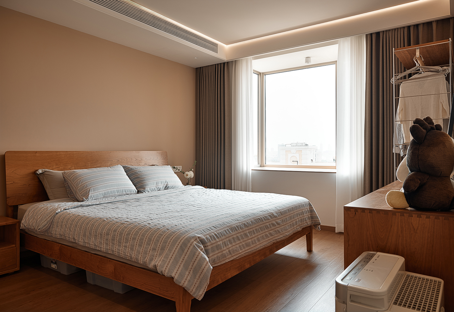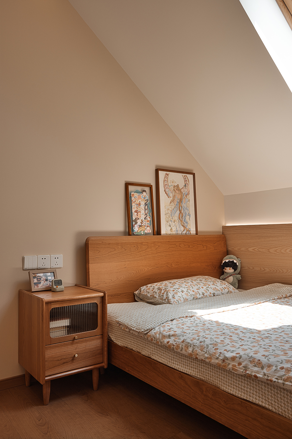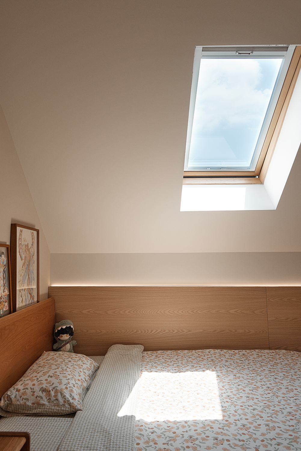 空间意境:在环境风格上的创新点主要体现在以下几个方面:首先,利用顶楼复式的独特优势,通过精心设计的洄游动线,巧妙地将各个功能区连通,既保证了空间的私密性,又增强了便利性。奶油色涂料、原木色与白色柜子和地板的搭配,以及焦糖色沙发,营造出一种慵懒放松的氛围,让家成为一家人休闲放松的理想场所。其次,在细节处理上,采用了嵌入式晾衣架、耐污板墙面、磁吸配件等创新设计,既满足了实际需求,又提升了空间的整洁度和美观度。此外,还巧妙地利用楼梯下方空间打造玄关柜,以及将阳台窗户改为大扇固定落地窗,引入更多自然光,让室内更加明亮通透。最后,在二楼的设计中,特别注重了公平性和个性化需求的平衡,通过相同的家具、床品和天窗设计,满足了姐妹俩对于平等空间的渴望,同时又在床头小摆件等细节上体现出她们的不同喜好,让整个家既和谐又充满个性。