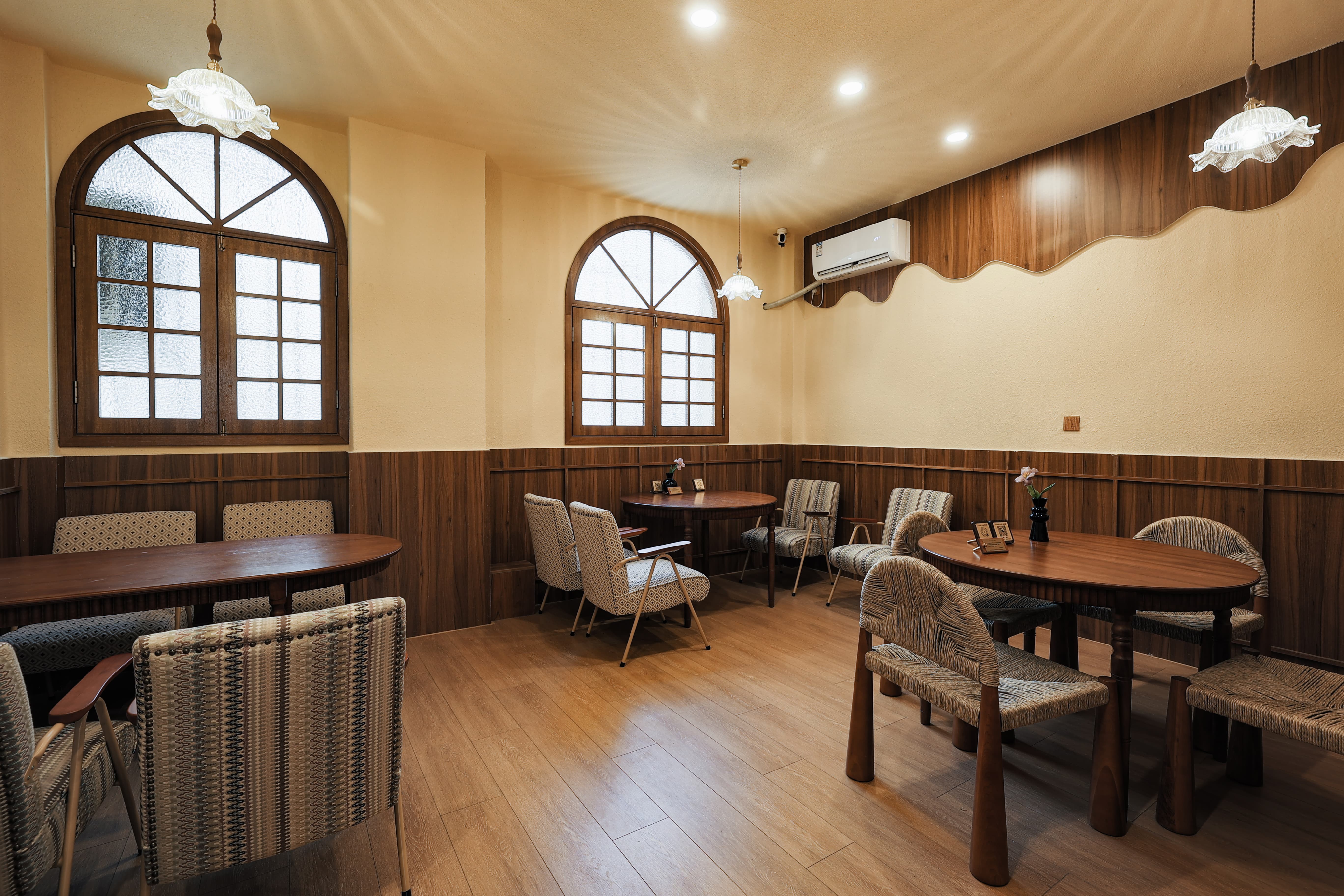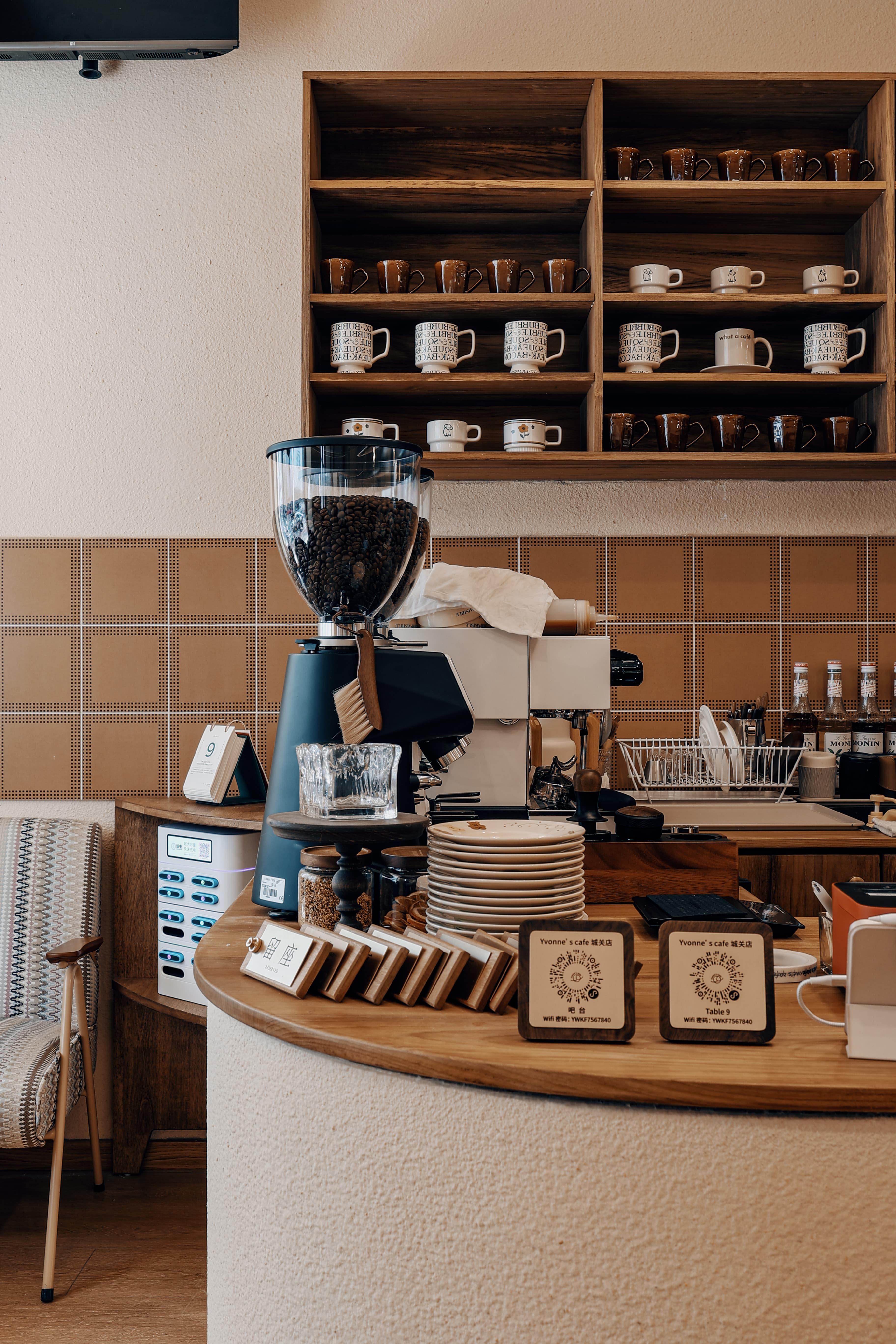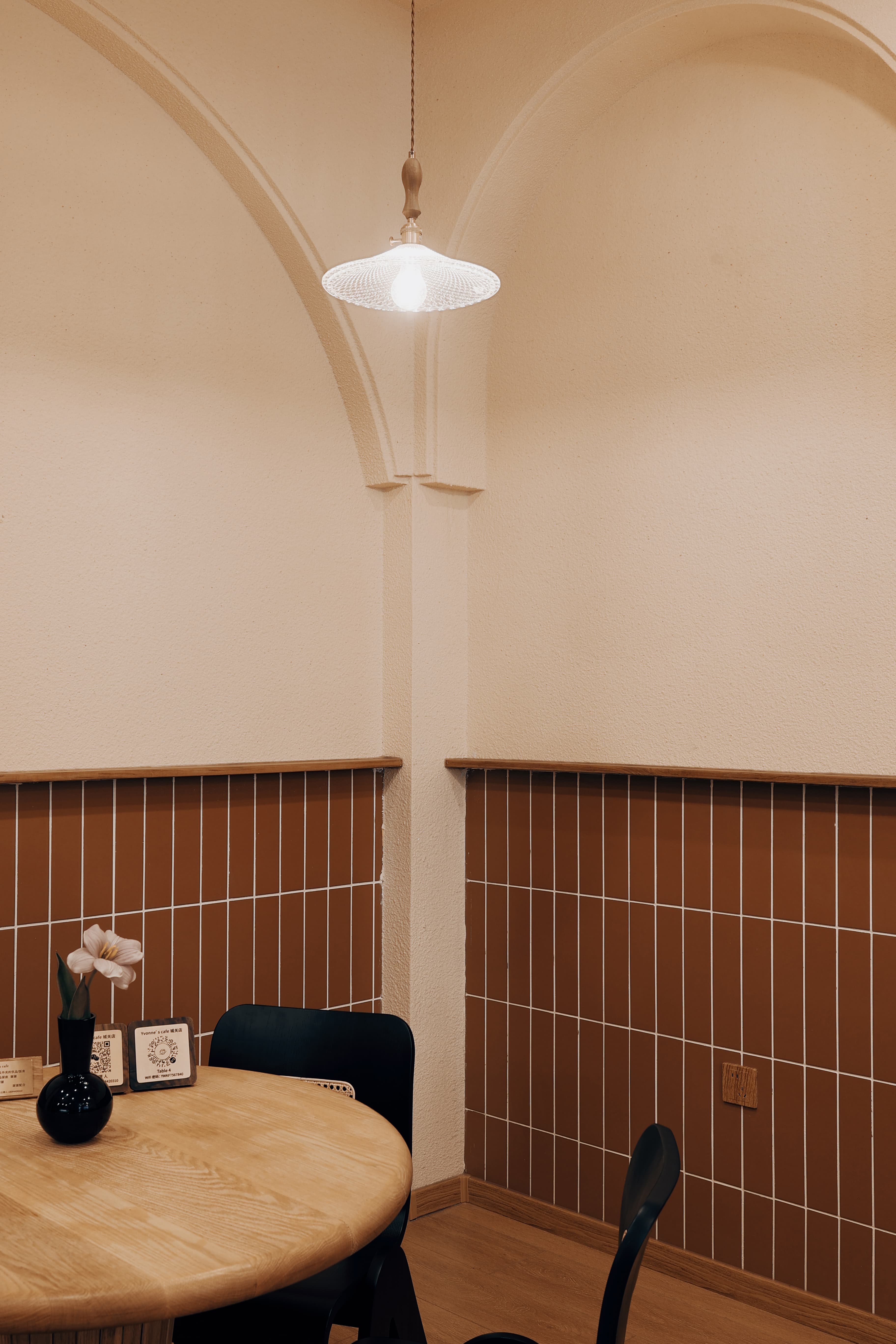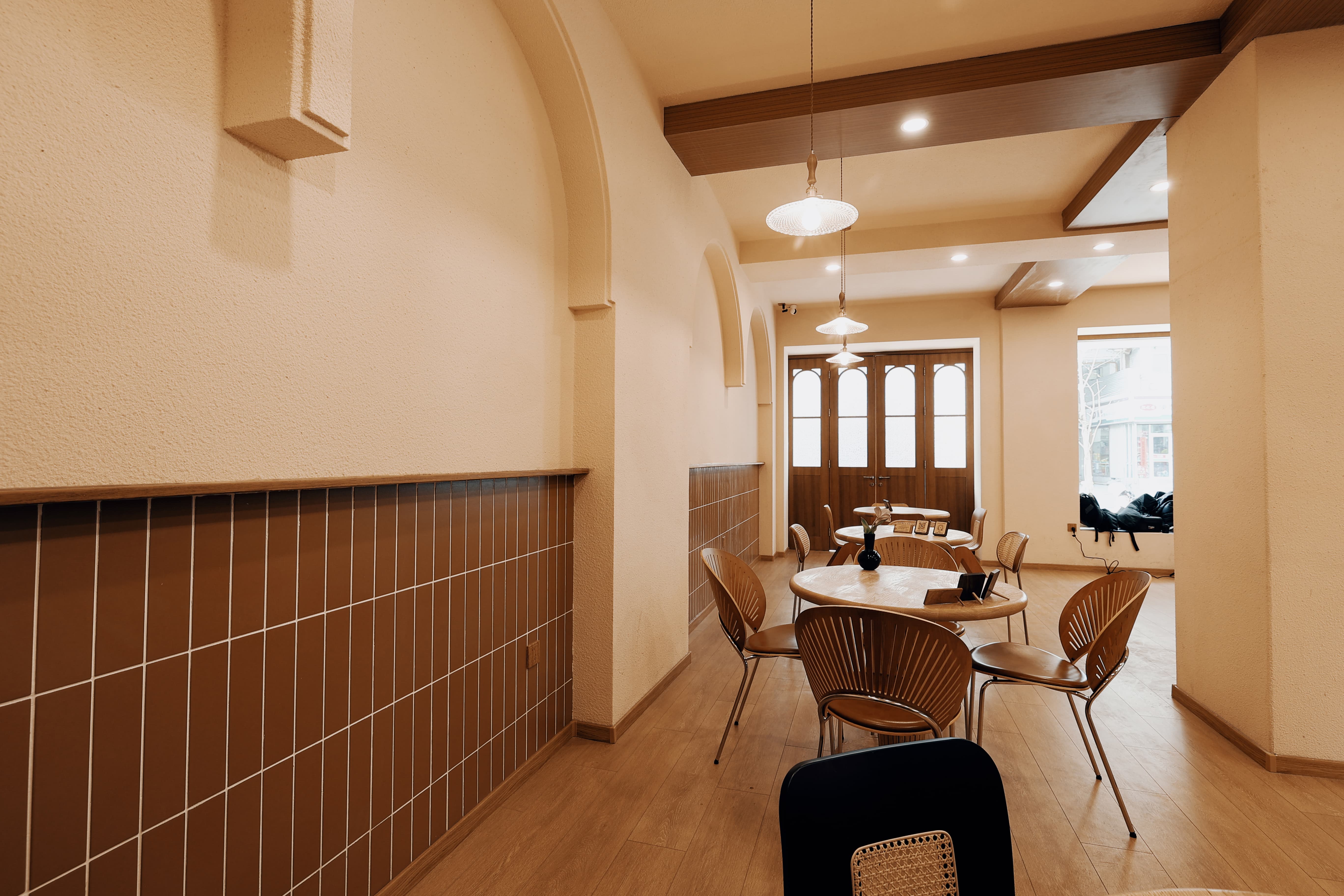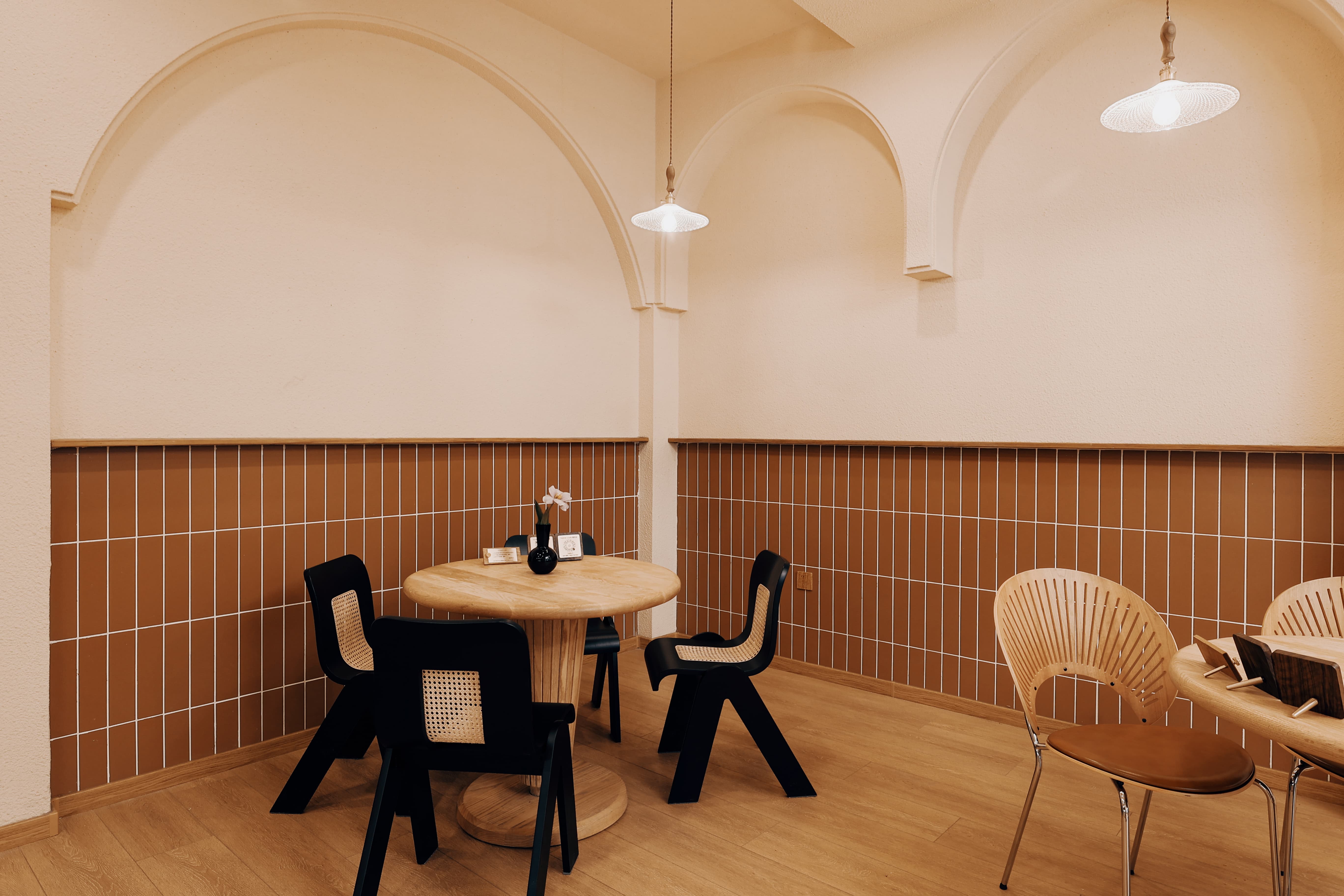 吧台 Bar ●吧台沿用原木本身特有的质感来呈现,营造空间氛围。● 对咖啡操作台进行了合理的尺寸规划,方便咖啡师逐一介绍单品咖啡豆的品种、产地与烘焙程度;●墙面铺设花砖,打破原本木讷的背景,具有复古质感的小砖画龙点睛,同时易于打理水渍,兼顾美观与实用性。●地面小砖与木地板拼接,形成弧形结构感,呼应半墙小砖的视觉点缀,增加空间的视觉流动性。●融合中古质感浓郁的软装部分,使整个吧台视觉层次更加丰富,令人耳目一新。