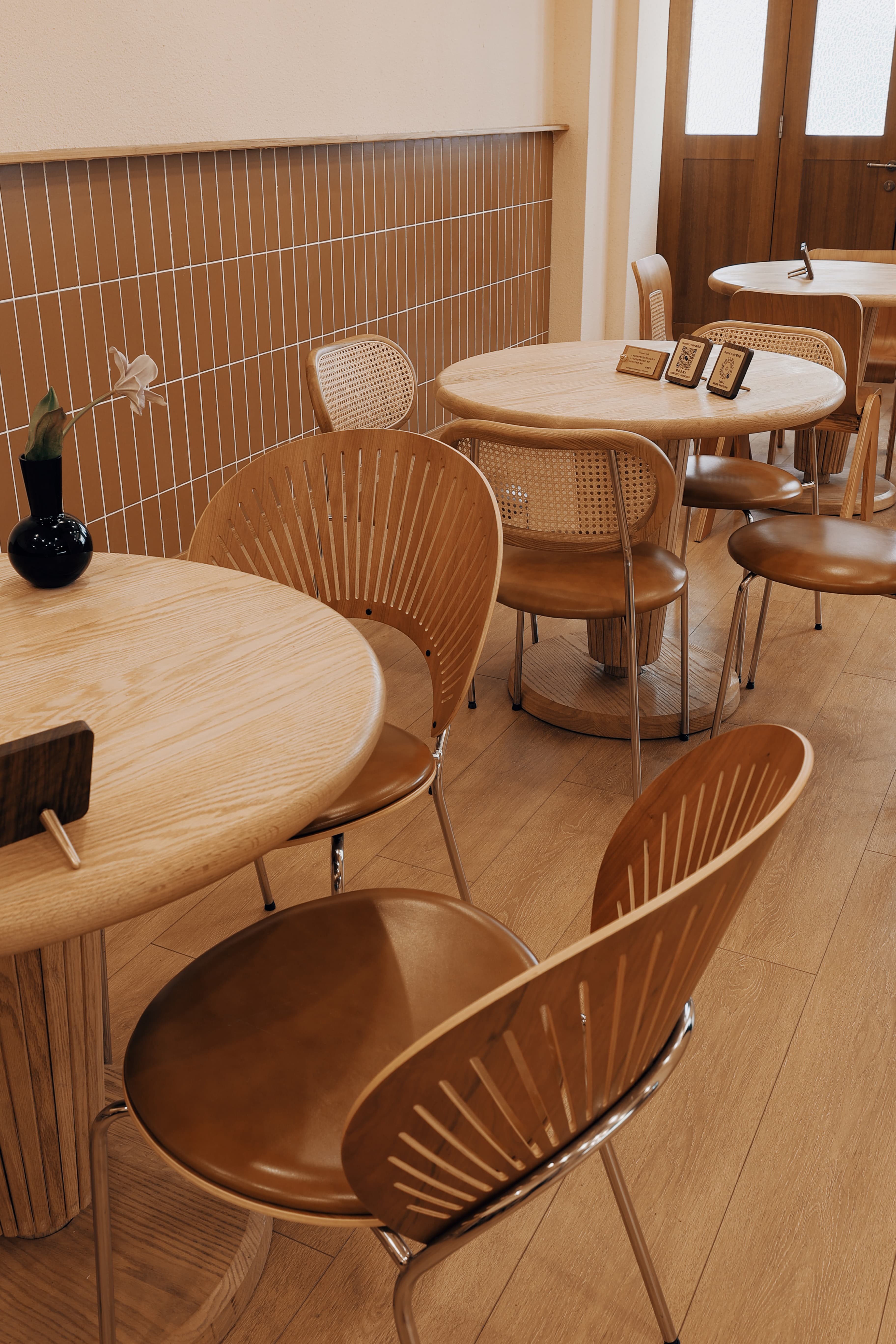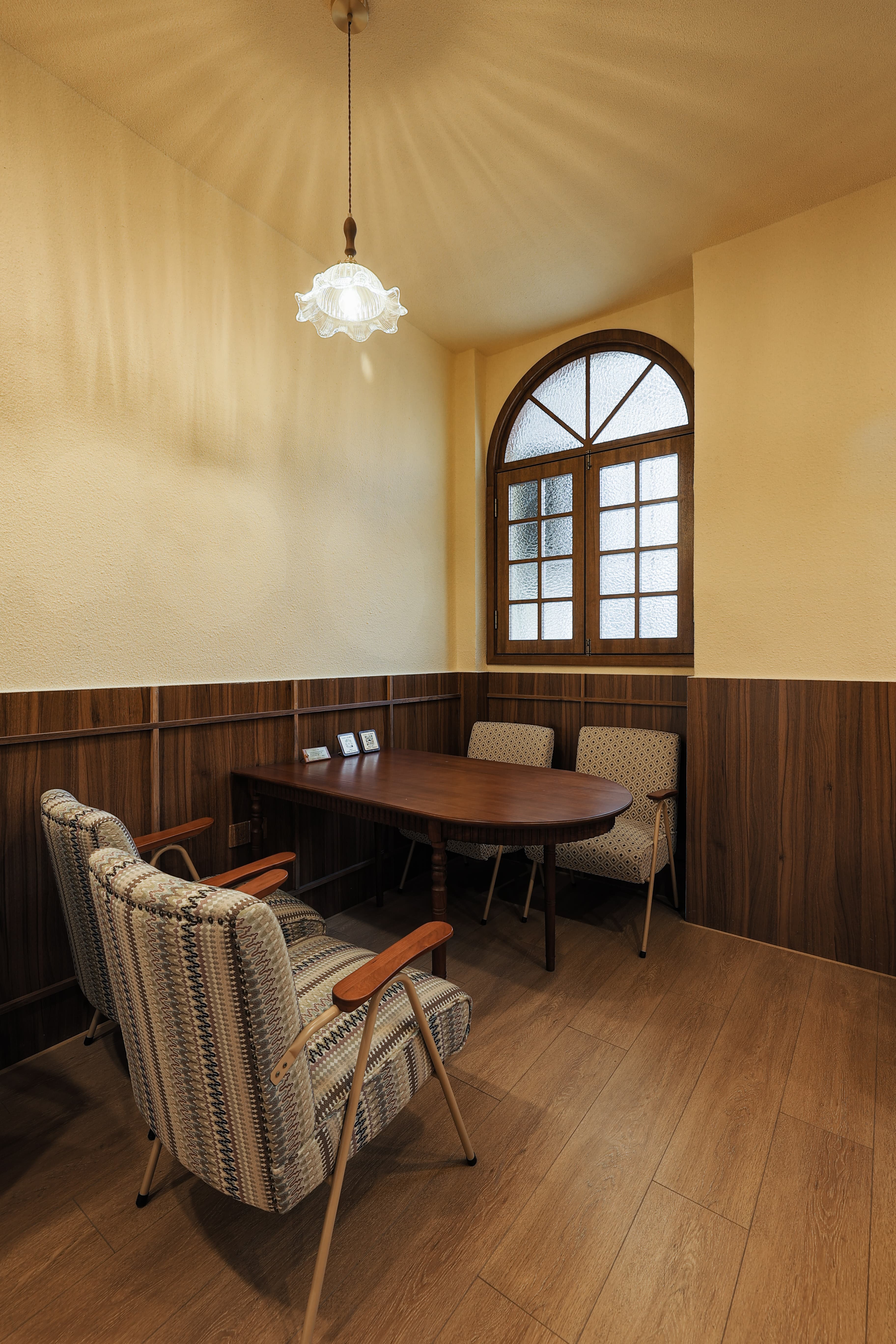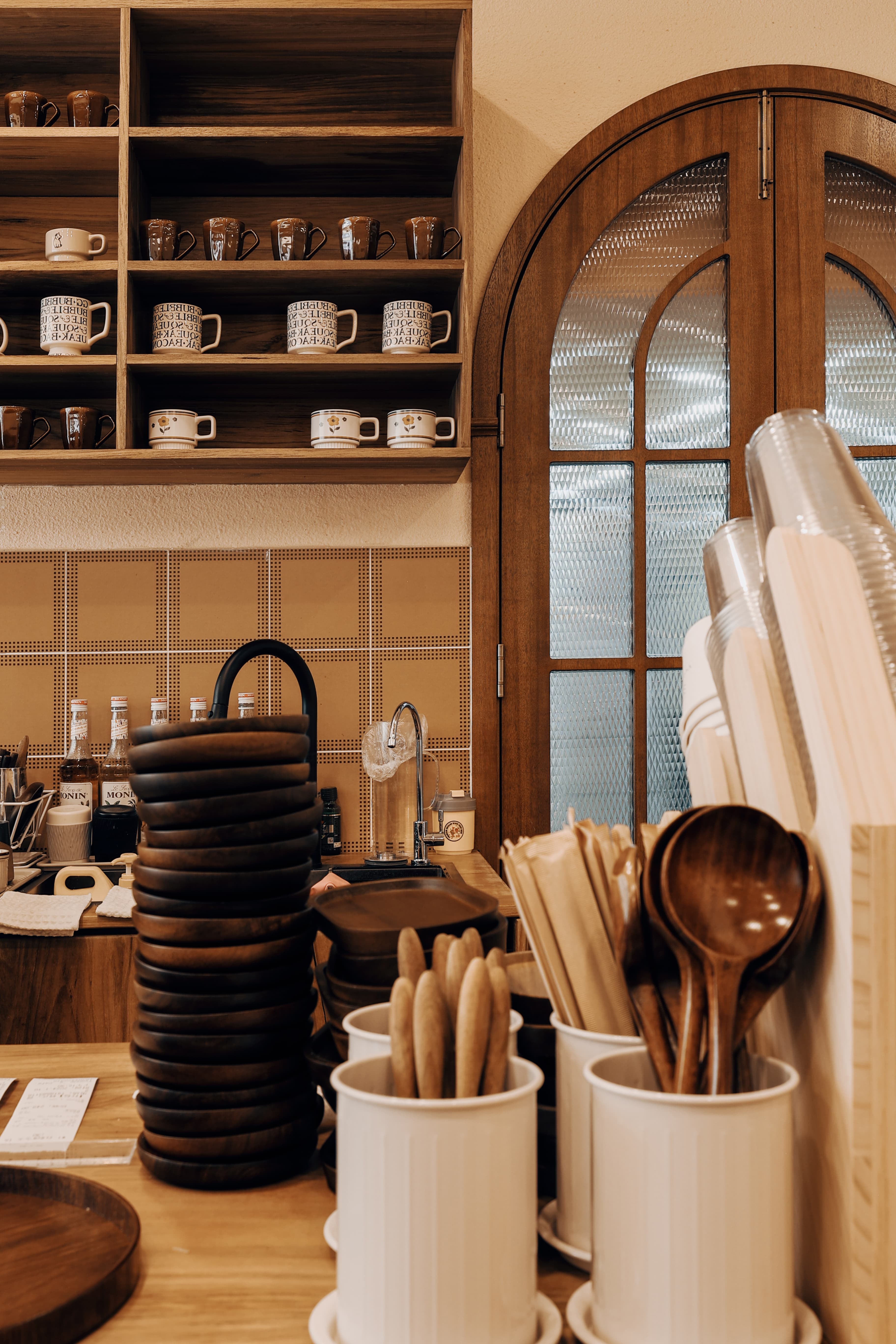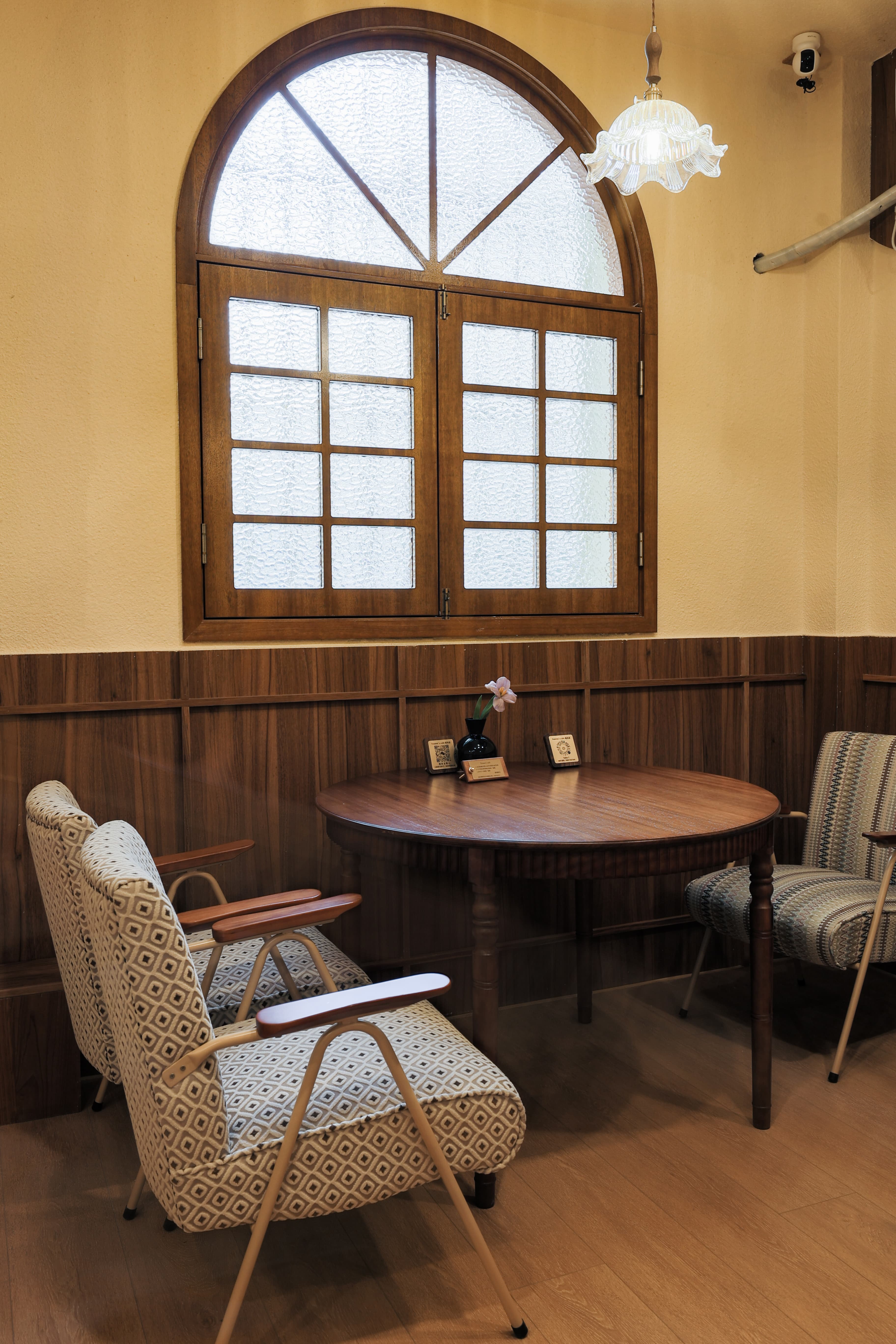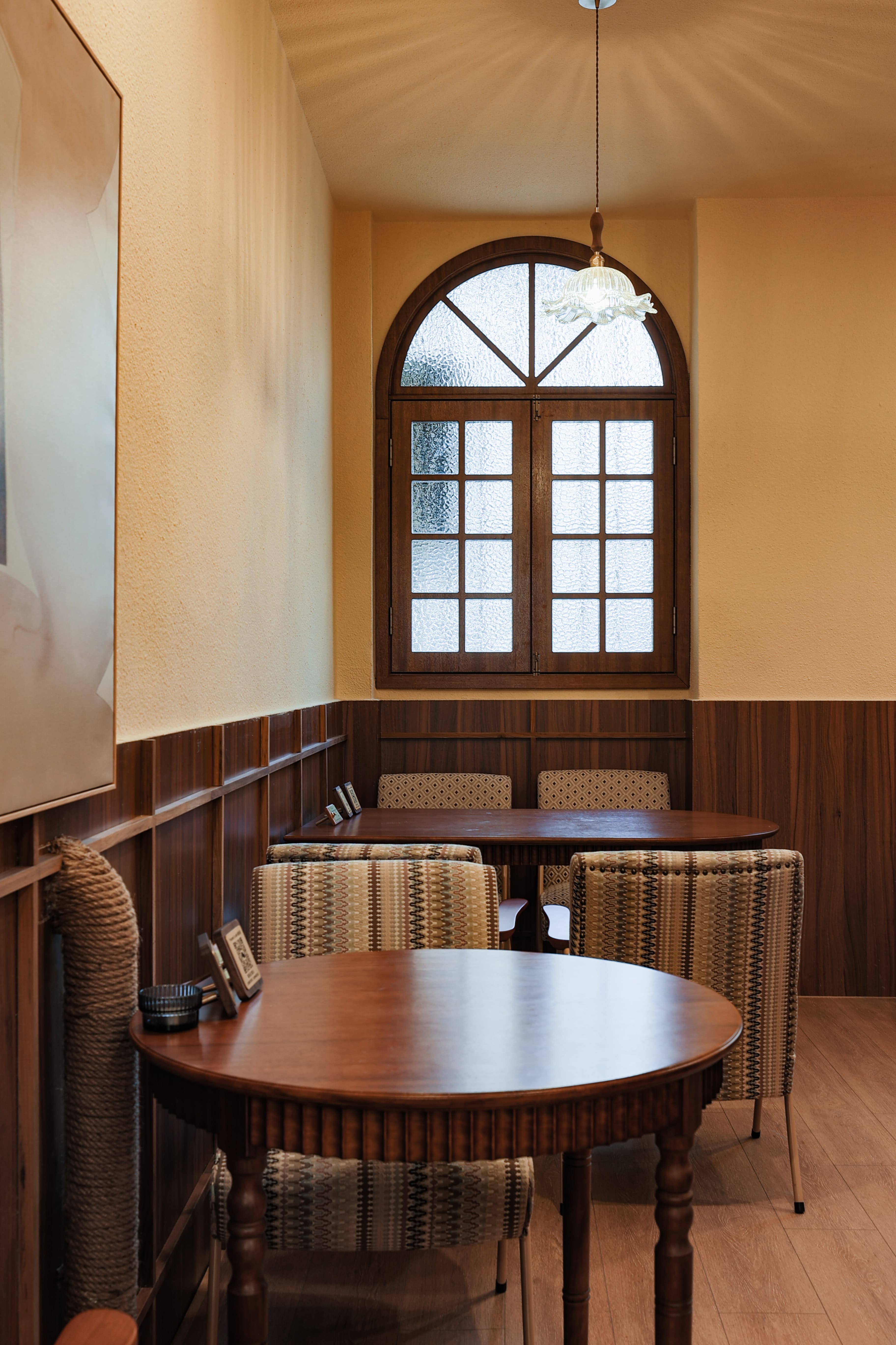 吧台 Bar ●吧台沿用原木本身特有的质感来呈现,营造空间氛围。● 对咖啡操作台进行了合理的尺寸规划,方便咖啡师逐一介绍单品咖啡豆的品种、产地与烘焙程度;●墙面铺设花砖,打破原本木讷的背景,具有复古质感的小砖画龙点睛,同时易于打理水渍,兼顾美观与实用性。●地面小砖与木地板拼接,形成弧形结构感,呼应半墙小砖的视觉点缀,增加空间的视觉流动性。●融合中古质感浓郁的软装部分,使整个吧台视觉层次更加丰富,令人耳目一新。