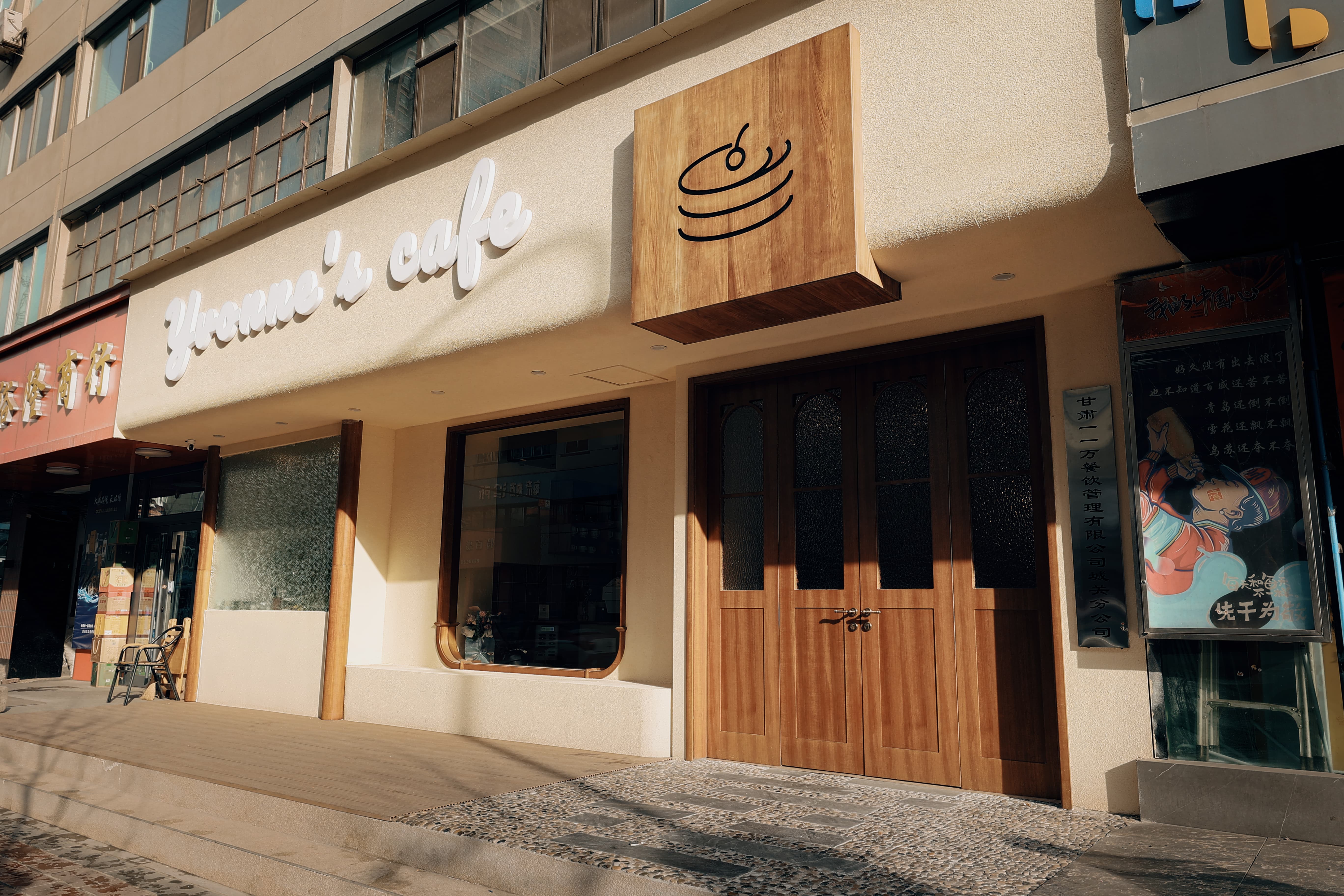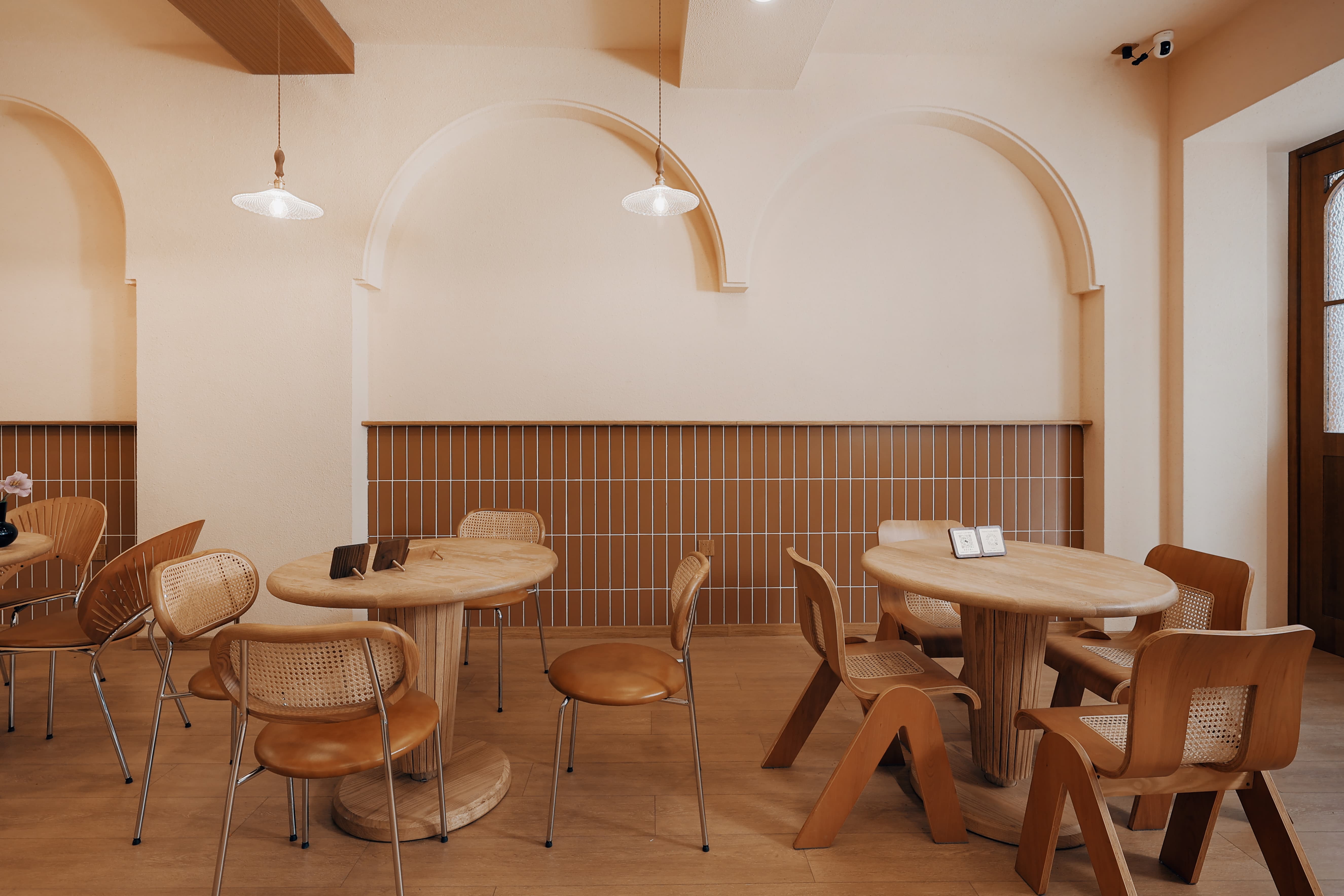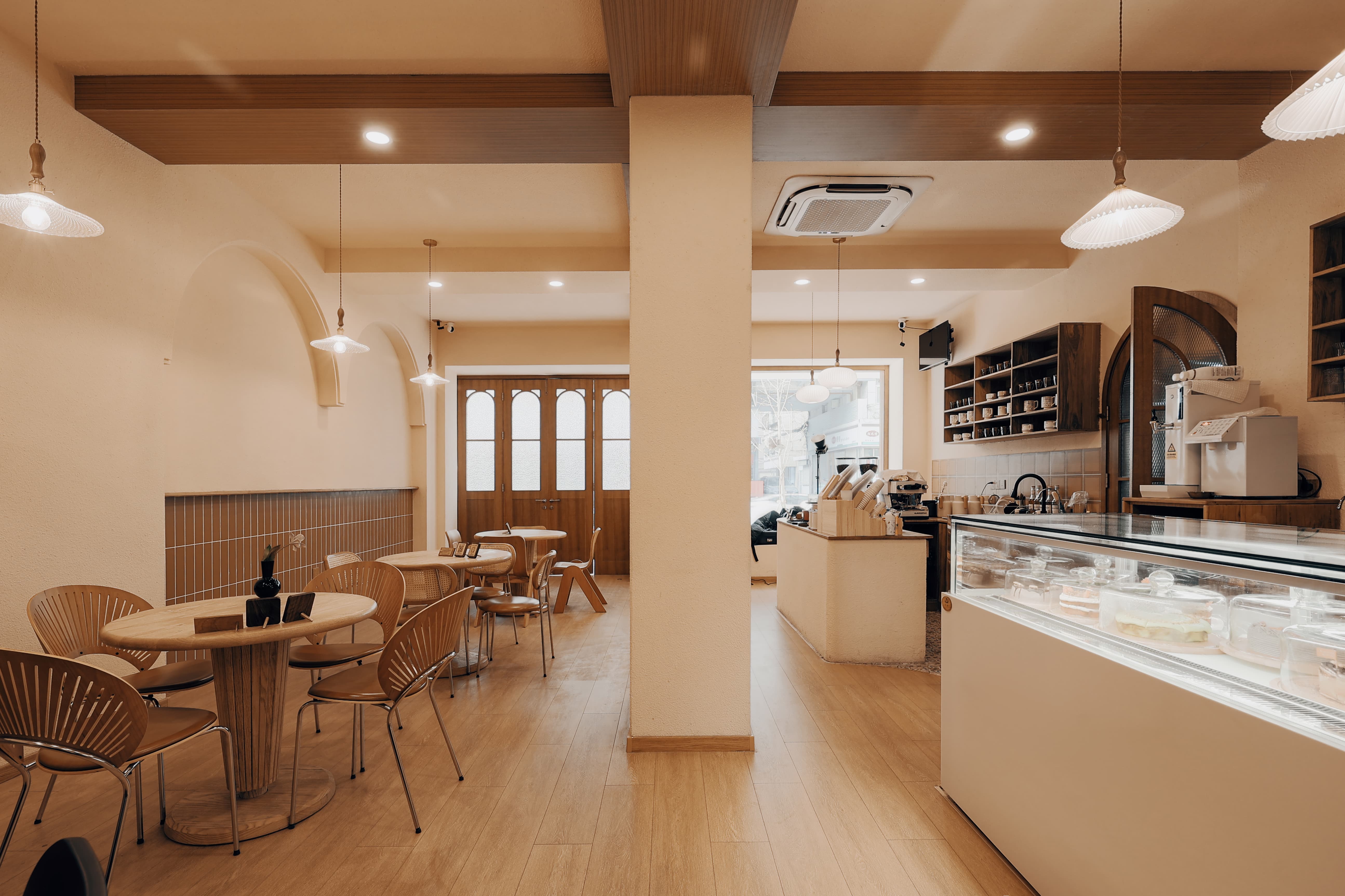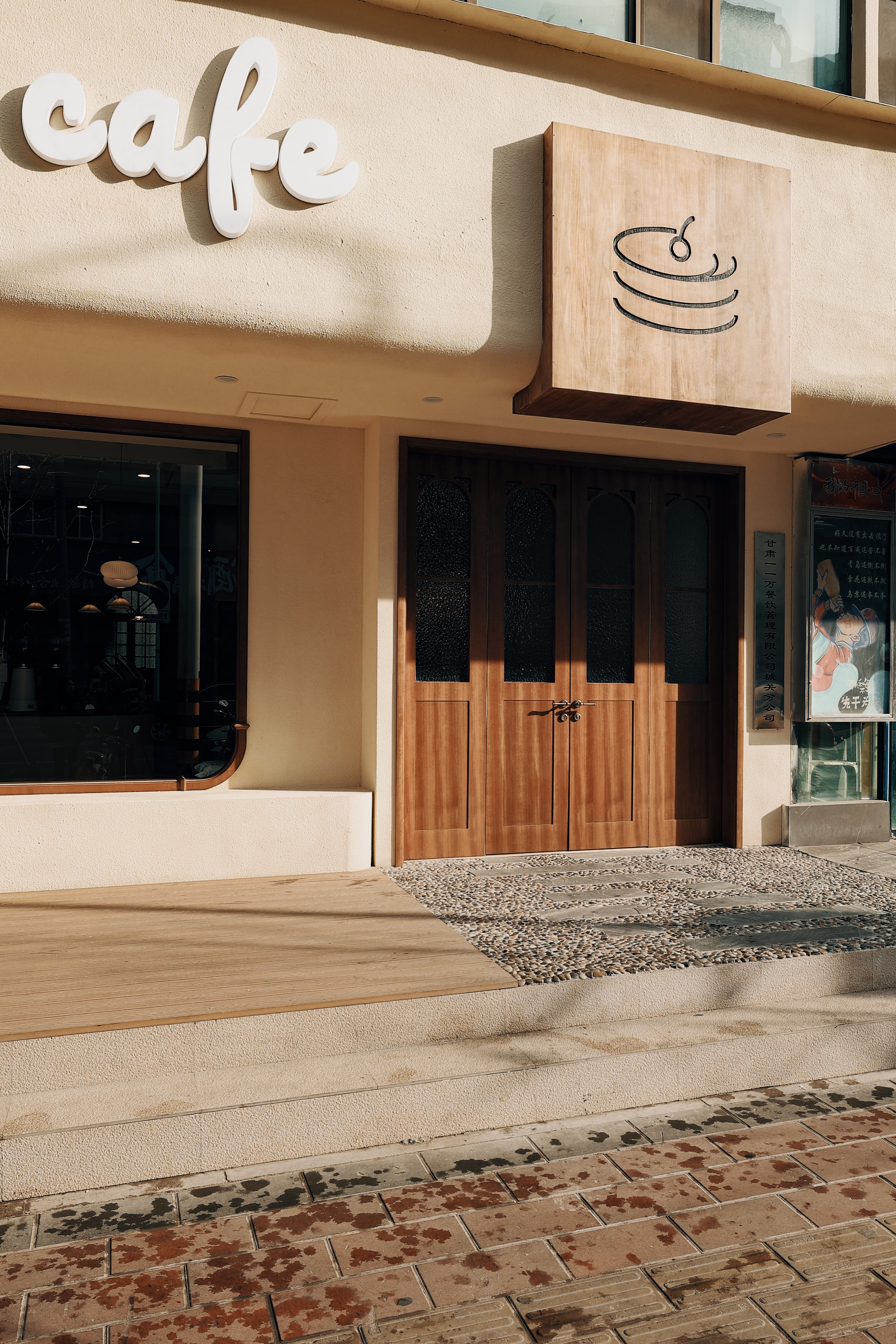 门头 Decorative Doors ● 门头设计与品牌调性相契合,使空间内外营造出整体且统一的氛围。 ● 视觉上使用大面积留白,以漆面的肌理感凸显店名,主次分明。 ● 运用弧形元素进行衔接,使整体感观不锐利,贯穿柔和的视觉感受; ● 富有质感的木质边框+玻璃窗连接店铺内外,让室内空间更明亮通透的同时,增加了空间的呼吸感。隔着玻璃窗,咖啡的香气与店内的温馨一同溢出,引人注目。