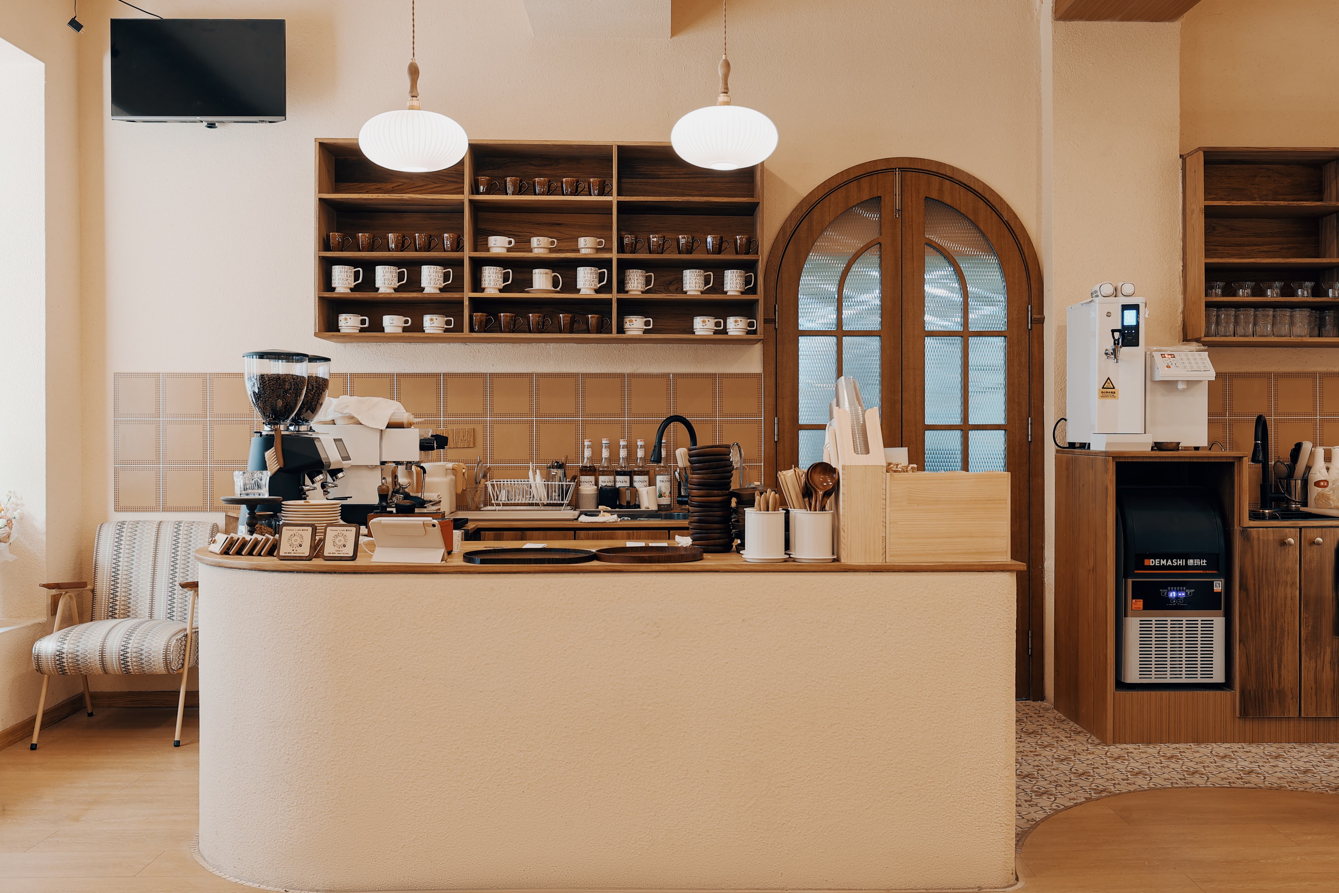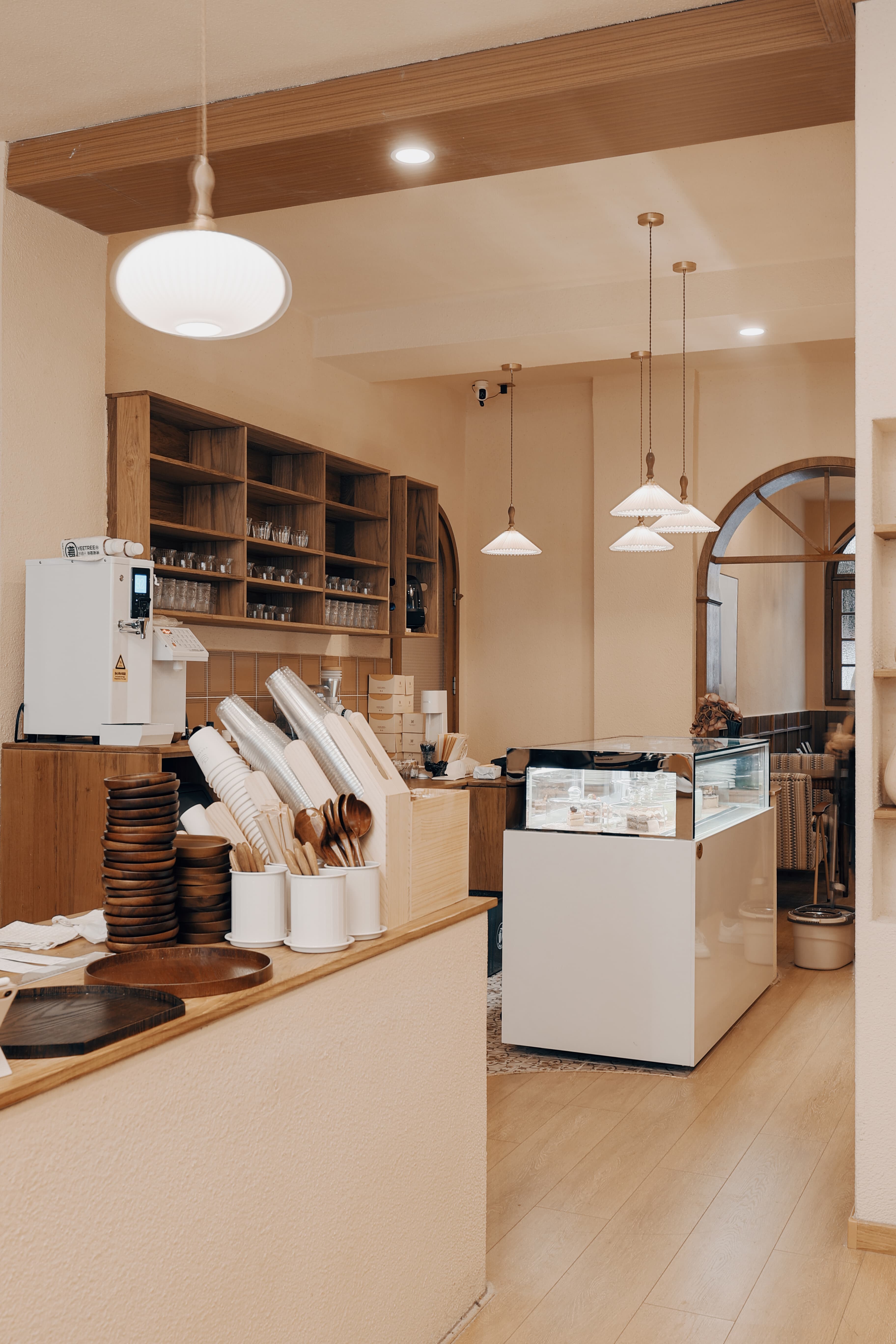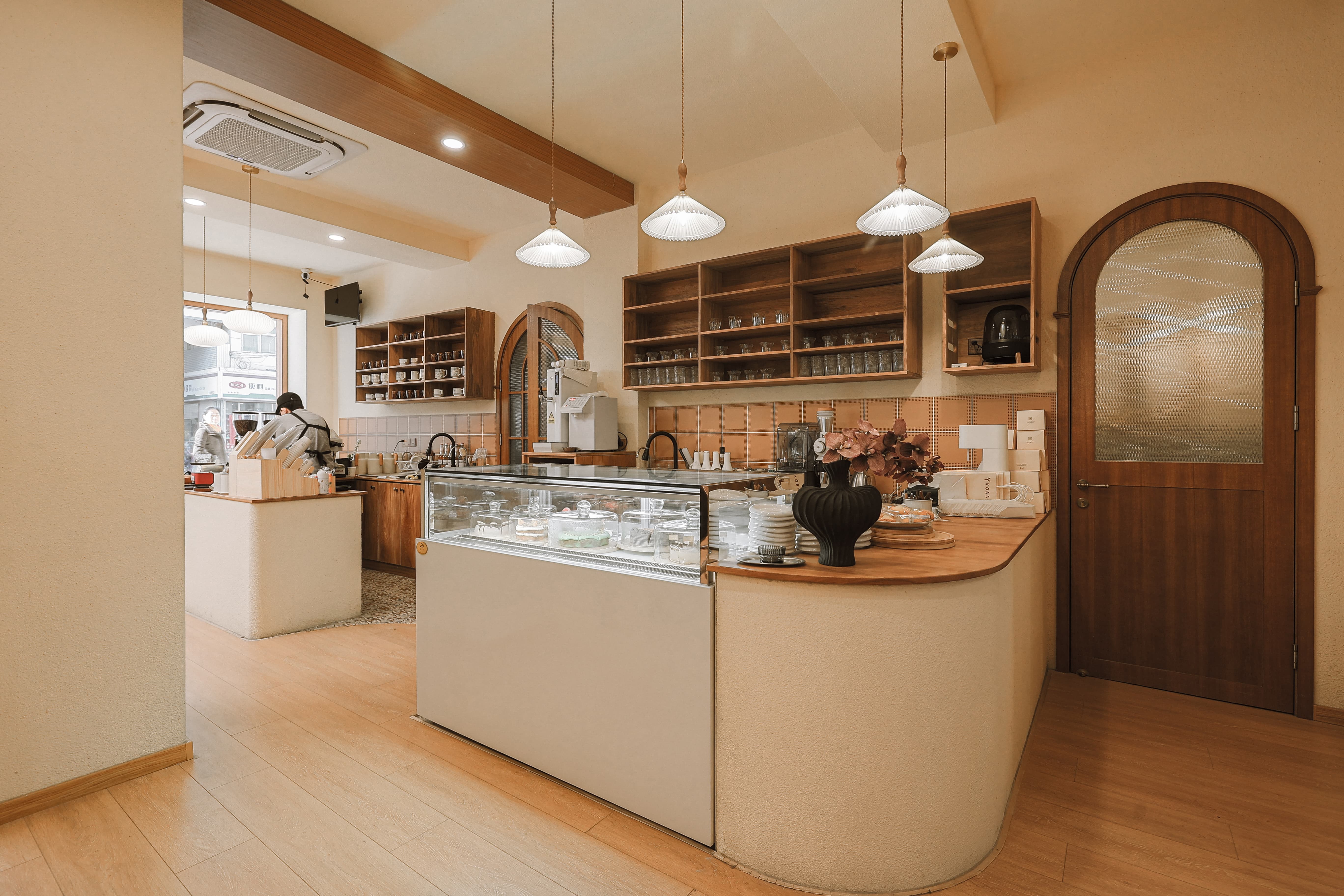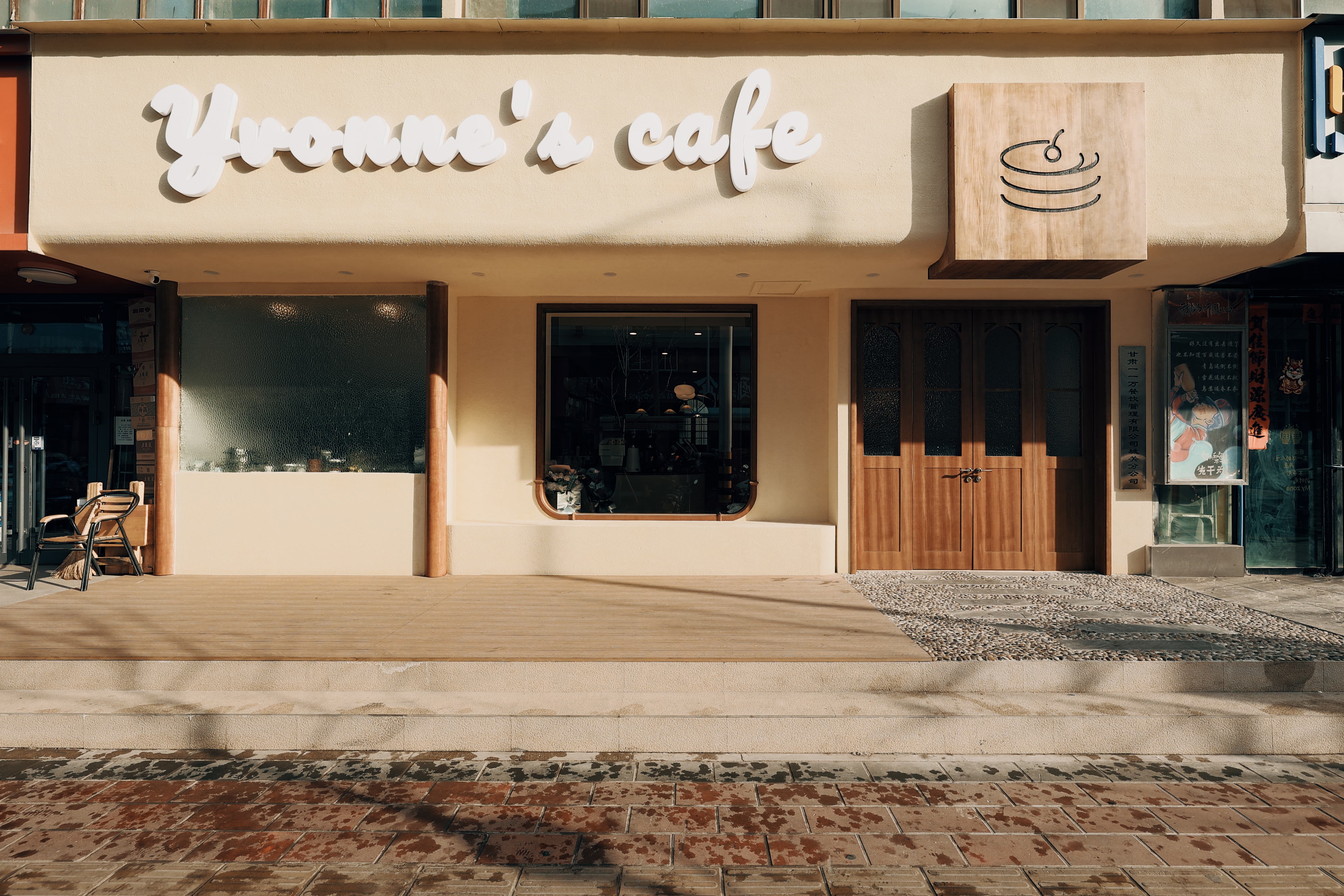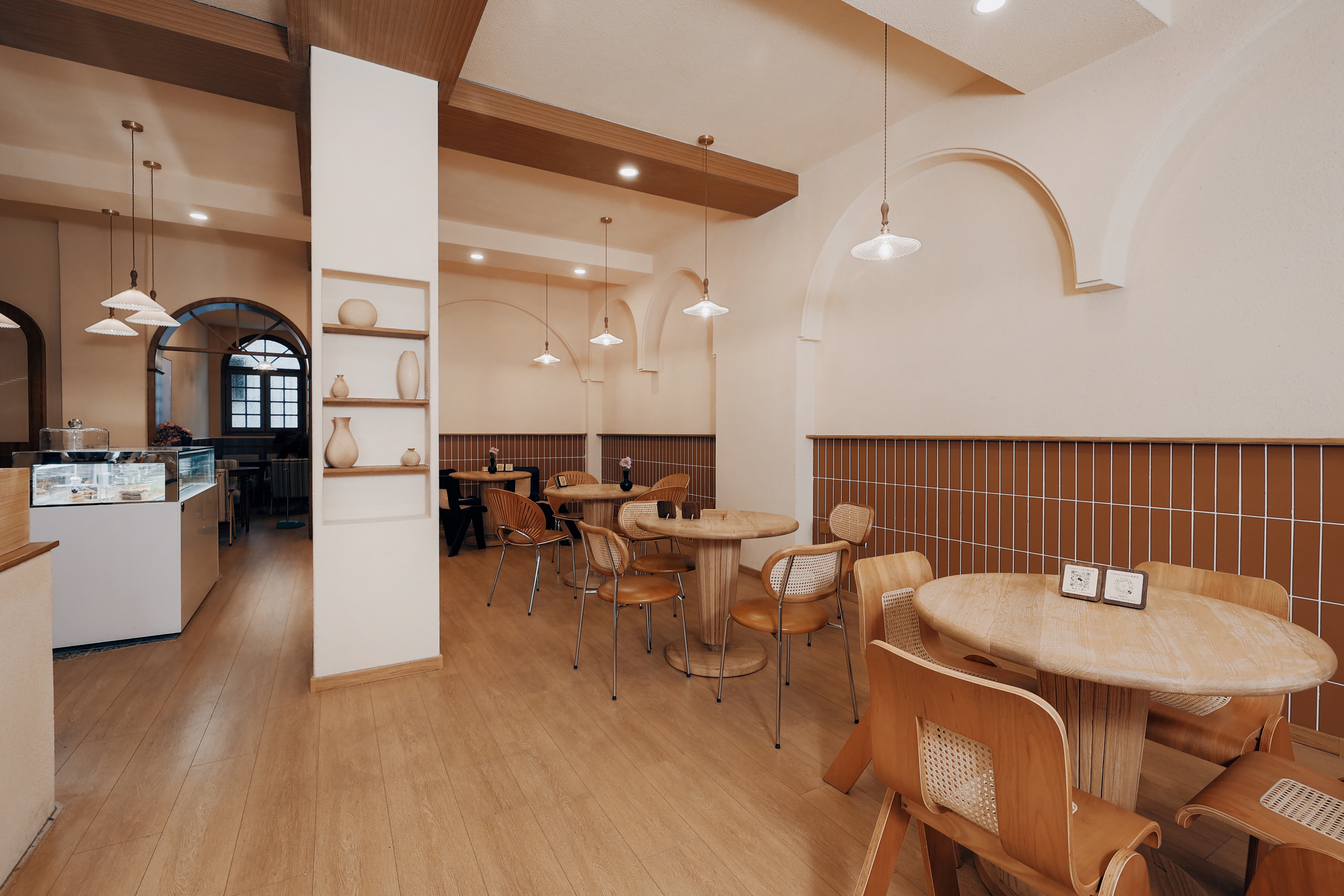 门头 Decorative Doors ● 门头设计与品牌调性相契合,使空间内外营造出整体且统一的氛围。 ● 视觉上使用大面积留白,以漆面的肌理感凸显店名,主次分明。 ● 运用弧形元素进行衔接,使整体感观不锐利,贯穿柔和的视觉感受; ● 富有质感的木质边框+玻璃窗连接店铺内外,让室内空间更明亮通透的同时,增加了空间的呼吸感。隔着玻璃窗,咖啡的香气与店内的温馨一同溢出,引人注目。
