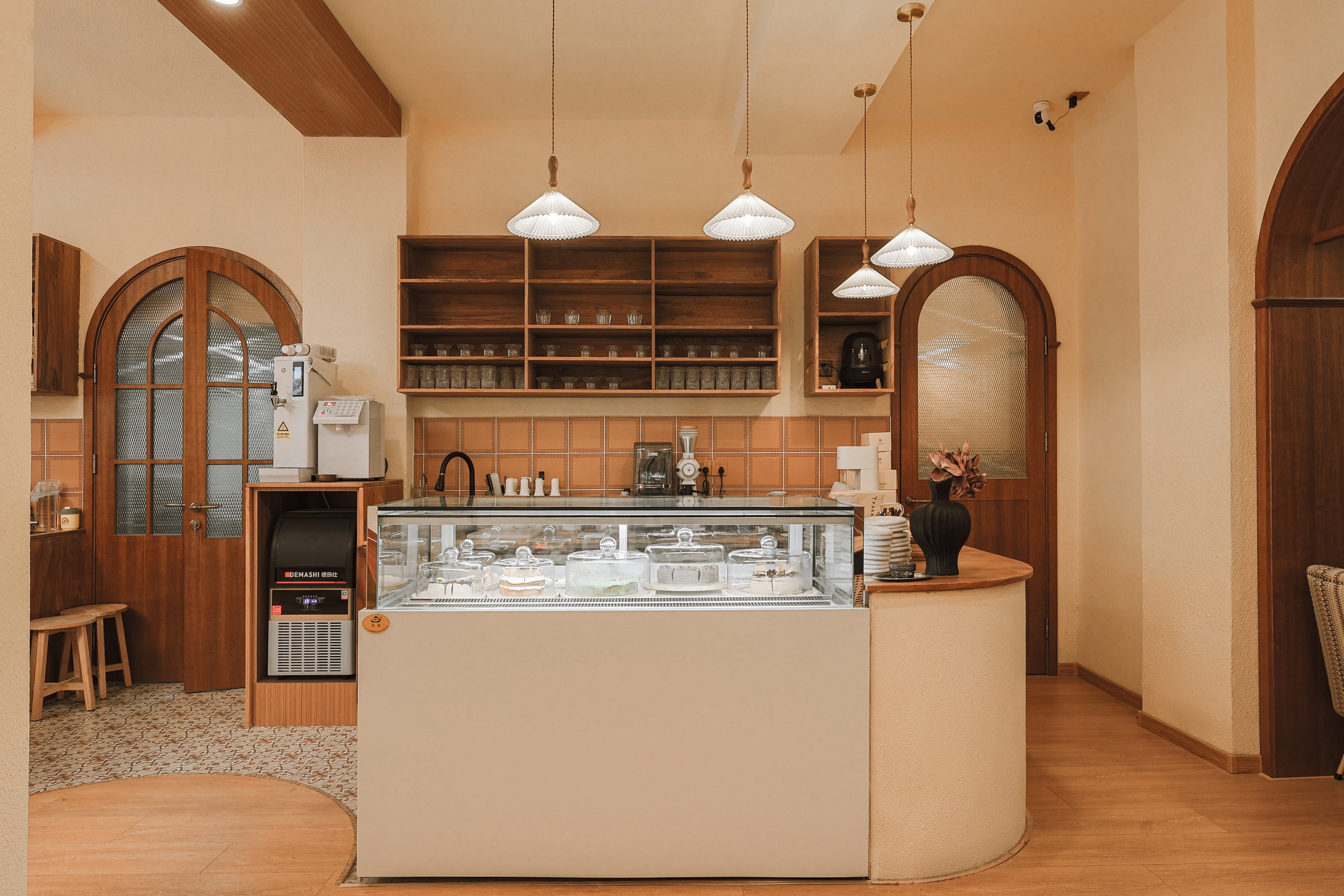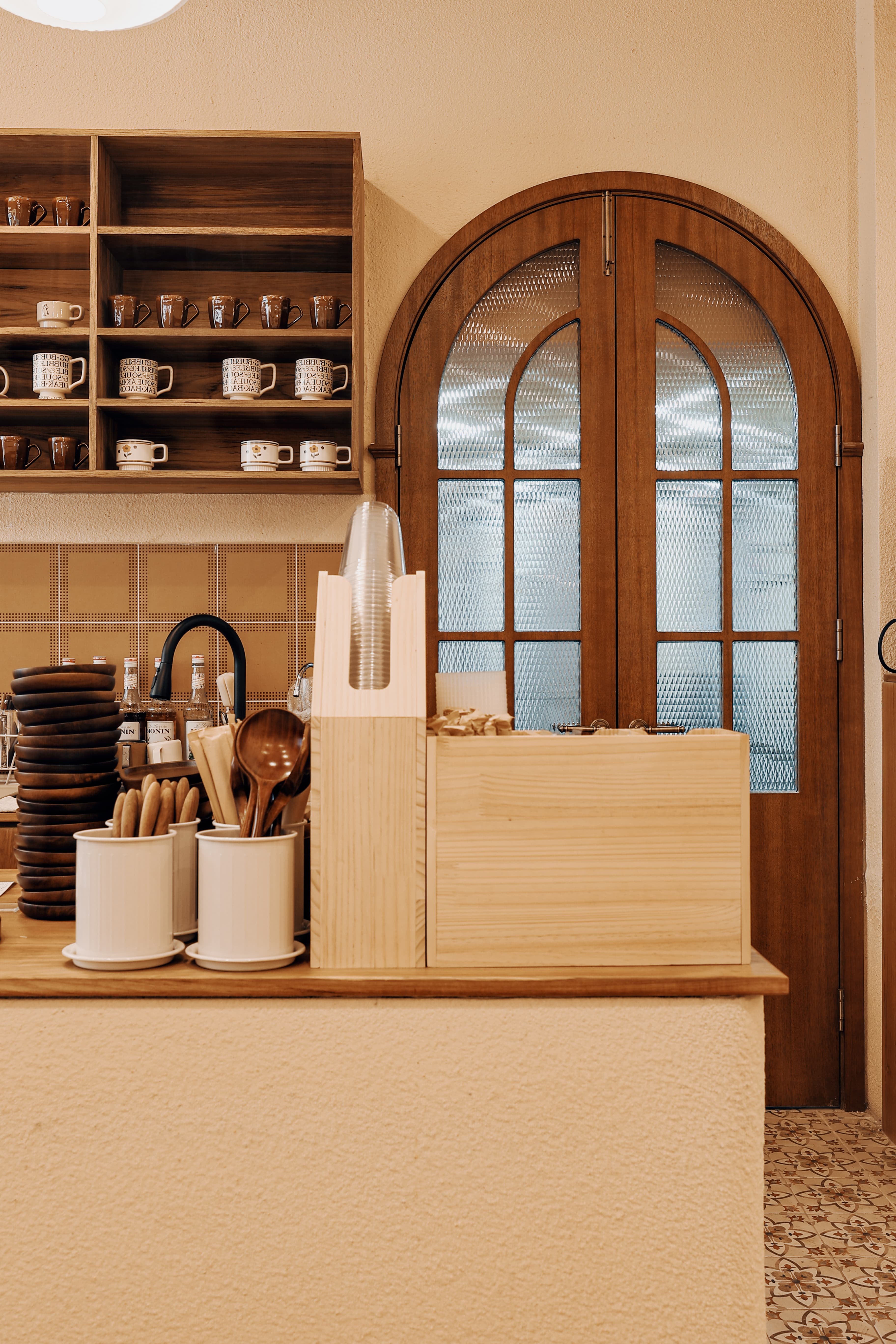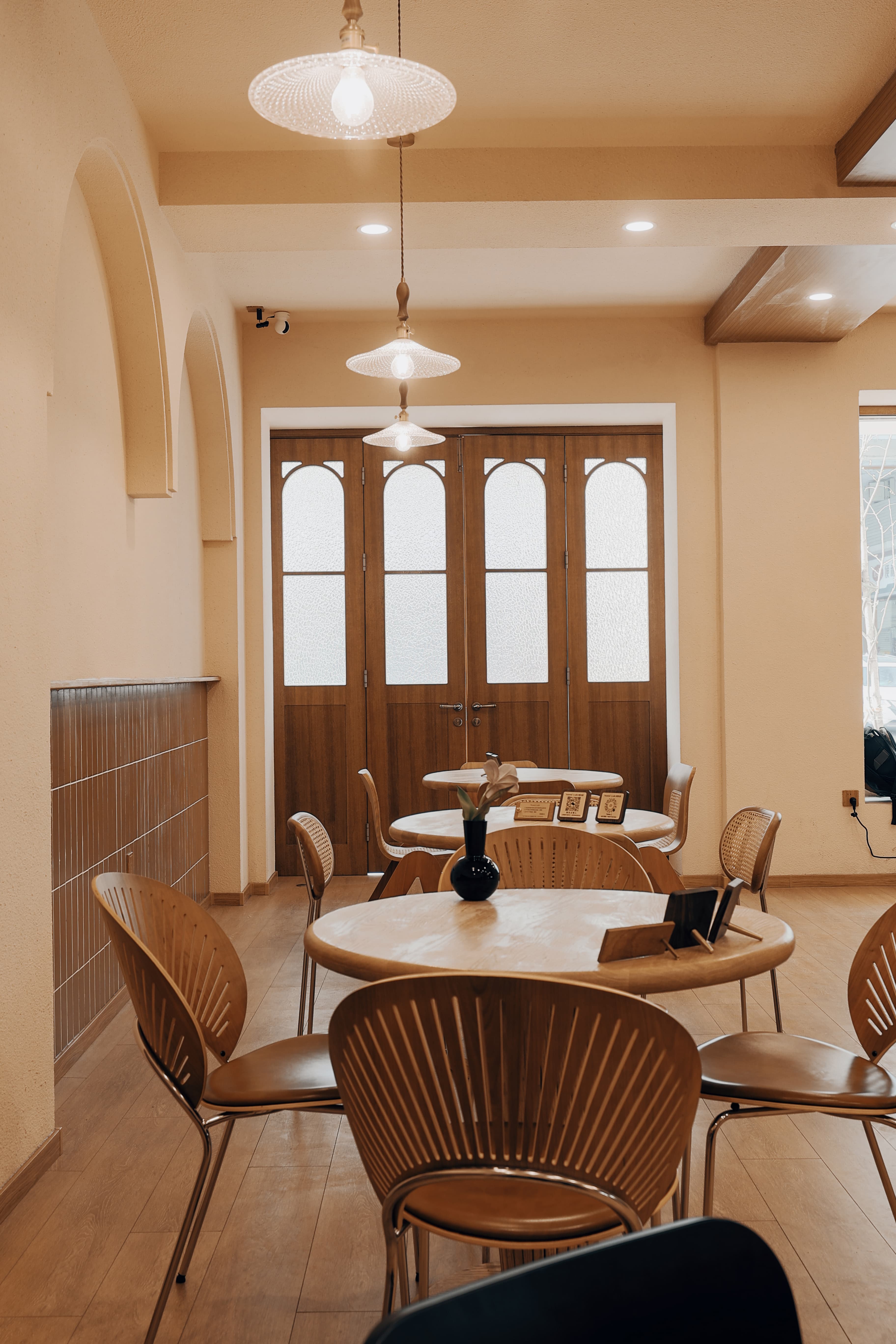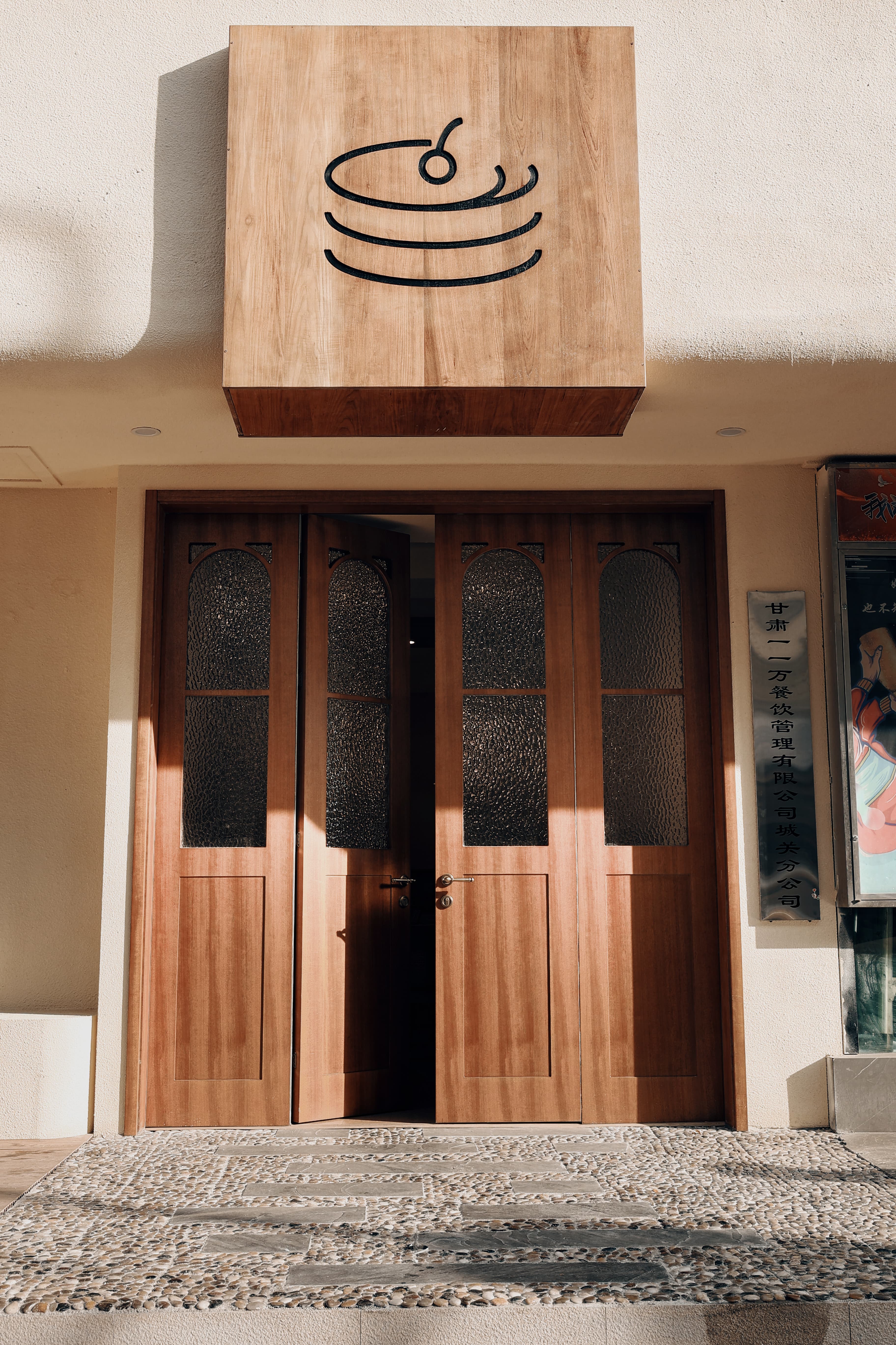 门头 Decorative Doors ● 门头设计与品牌调性相契合,使空间内外营造出整体且统一的氛围。 ● 视觉上使用大面积留白,以漆面的肌理感凸显店名,主次分明。 ● 运用弧形元素进行衔接,使整体感观不锐利,贯穿柔和的视觉感受; ● 富有质感的木质边框+玻璃窗连接店铺内外,让室内空间更明亮通透的同时,增加了空间的呼吸感。隔着玻璃窗,咖啡的香气与店内的温馨一同溢出,引人注目。