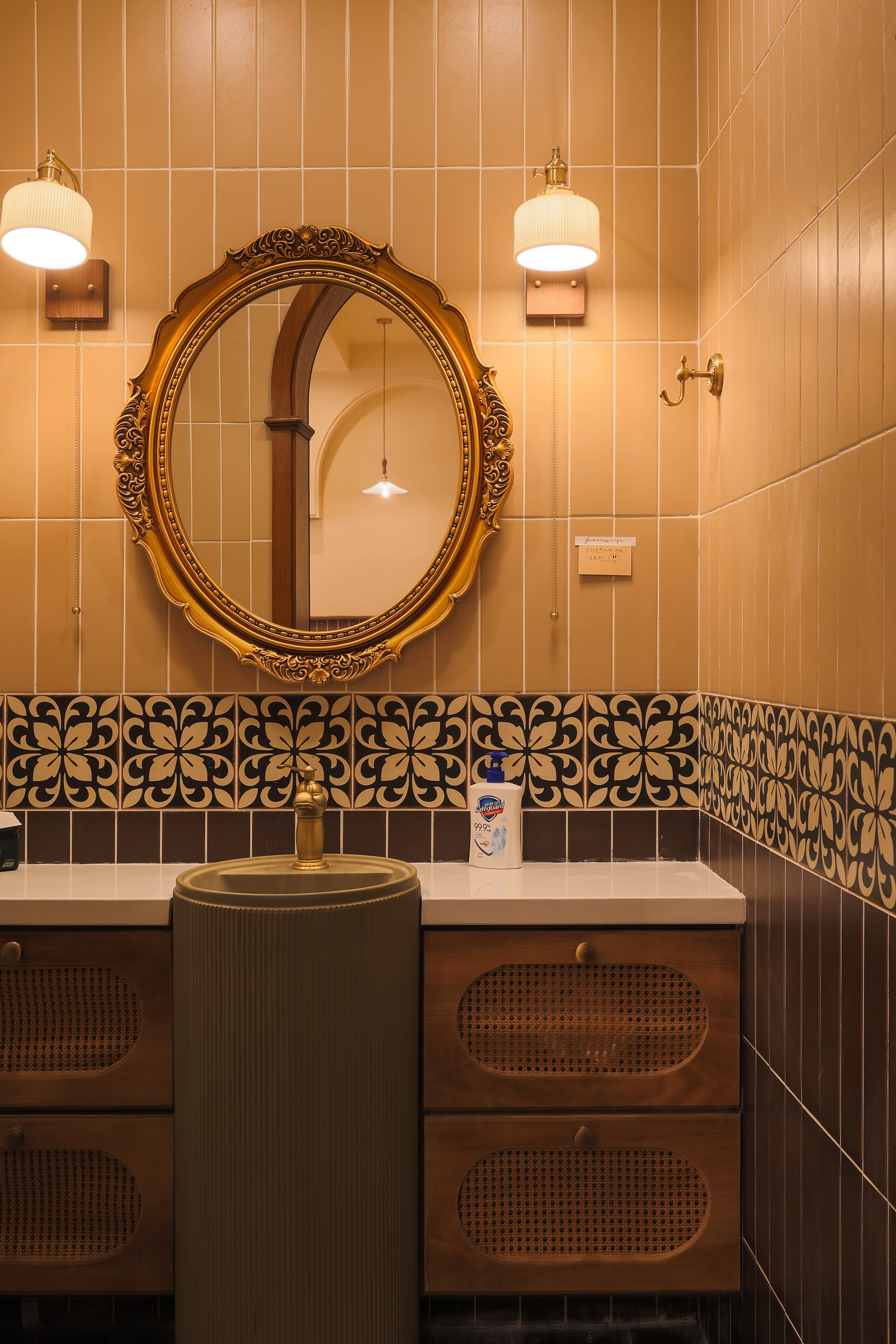 卫生间Bathroom●复古花纹与美拉德色系墙砖结合,强调了复古风格的浓郁感,搭配铜色金属感,仿佛置身电影画面中;●浴室柜组合立柱洗手台,柜门采用藤编设计,充满中古韵味,清新又不失淳朴自然,使洗手间弥漫复古气息。