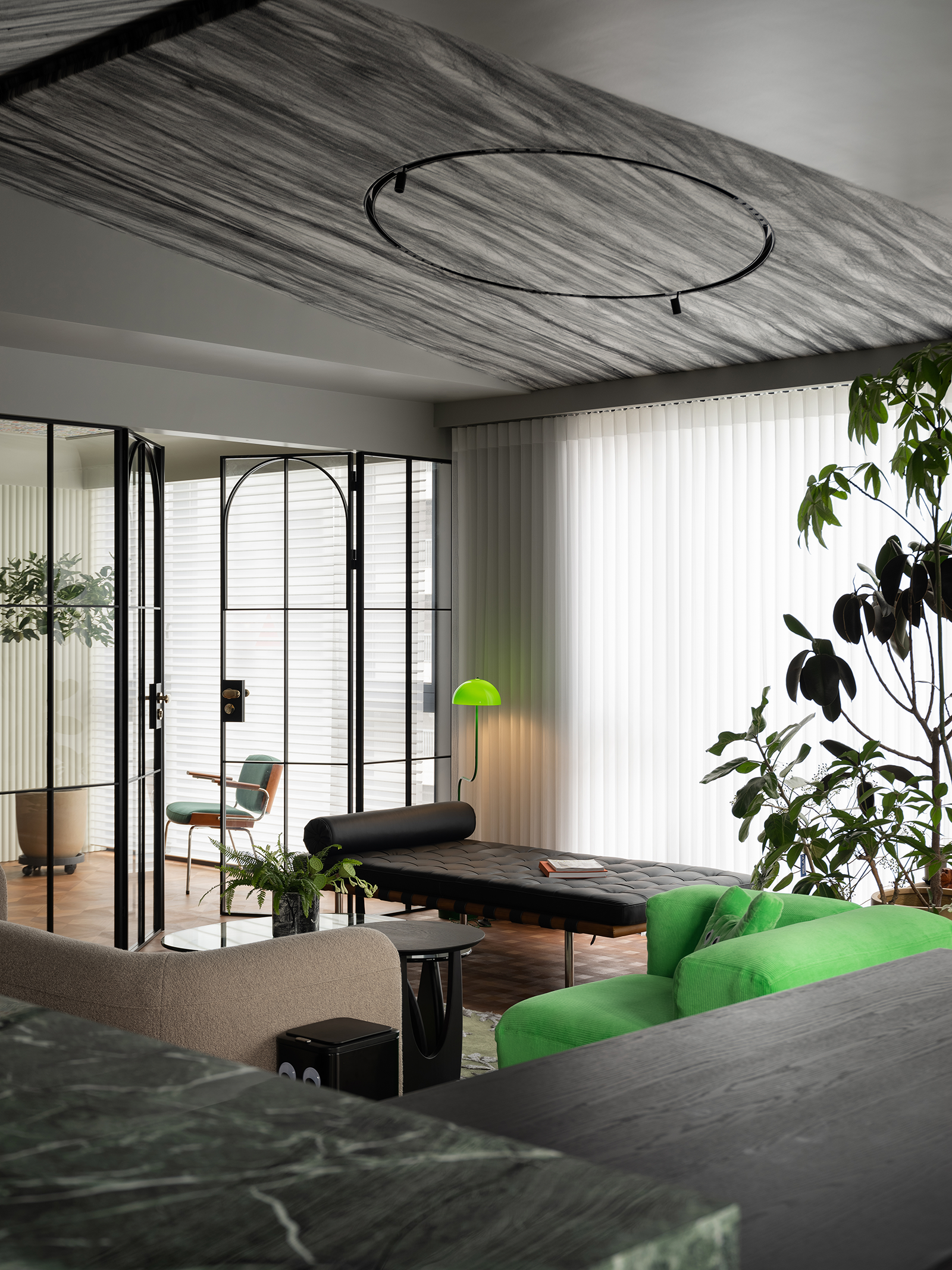 入户的深色背景简单清晰,进入主空间后,醒目的绿色沙发,令人耳目一新。